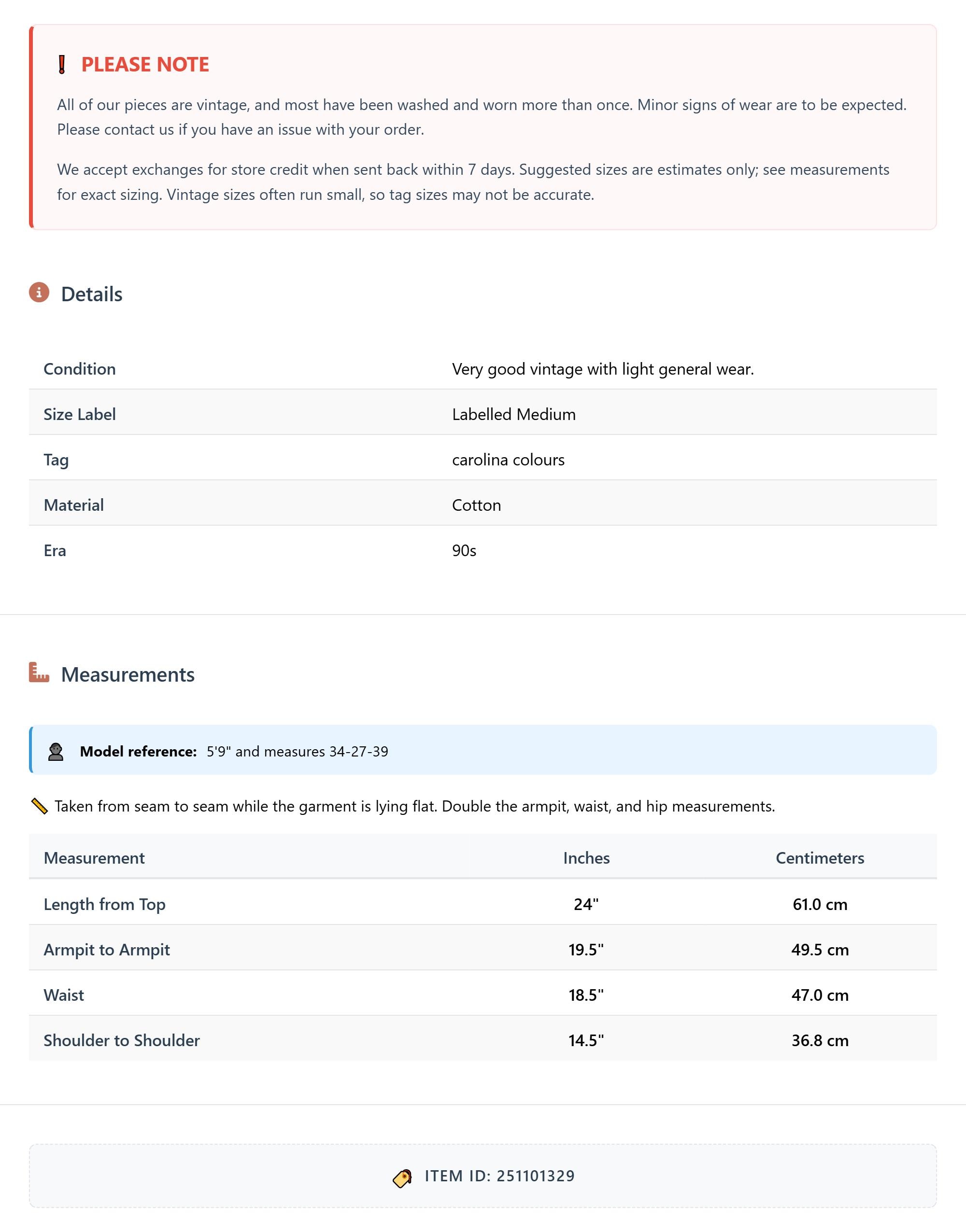 All of our pieces are vintage, and most have been washed and worn more than once. Minor signs of wear are to be expected. Please contact us if you have an issue with your order. We accept exchanges for store credit when sent back within 7 days.