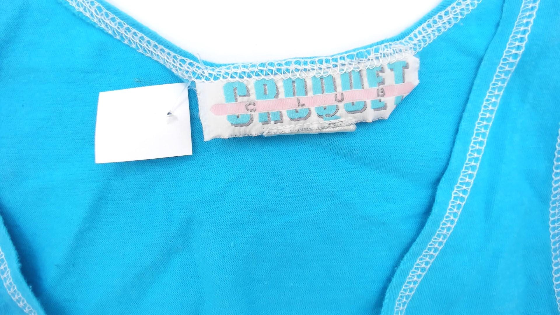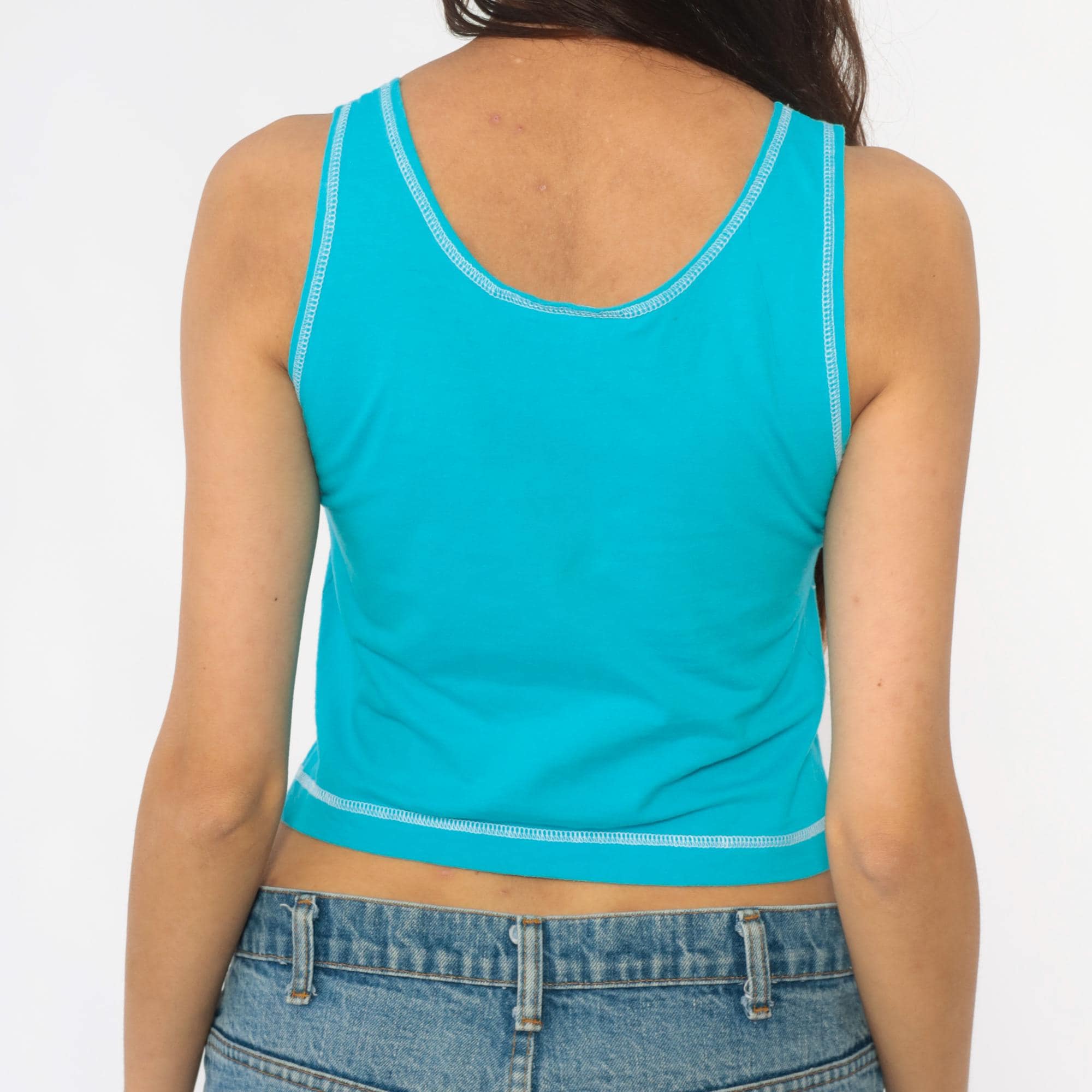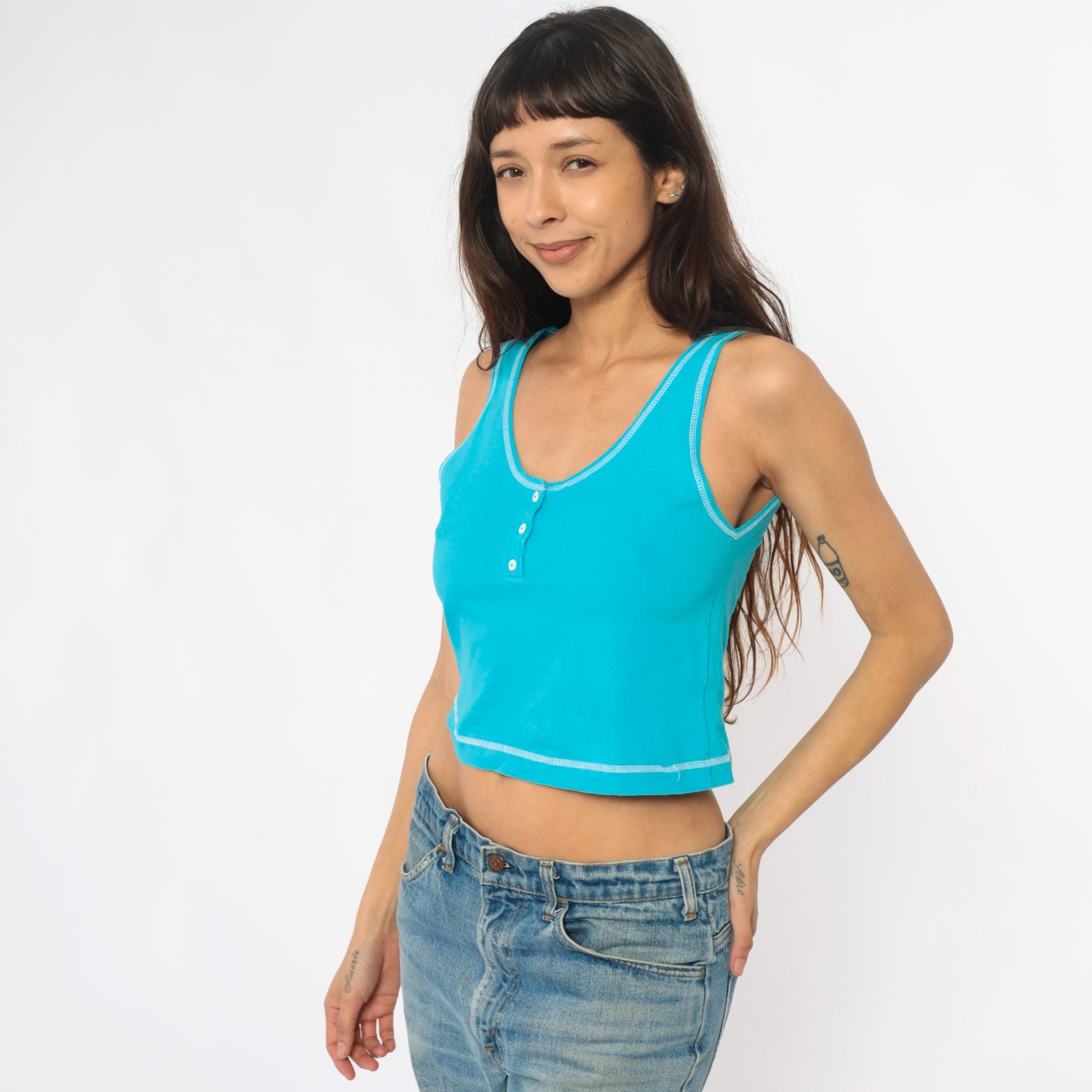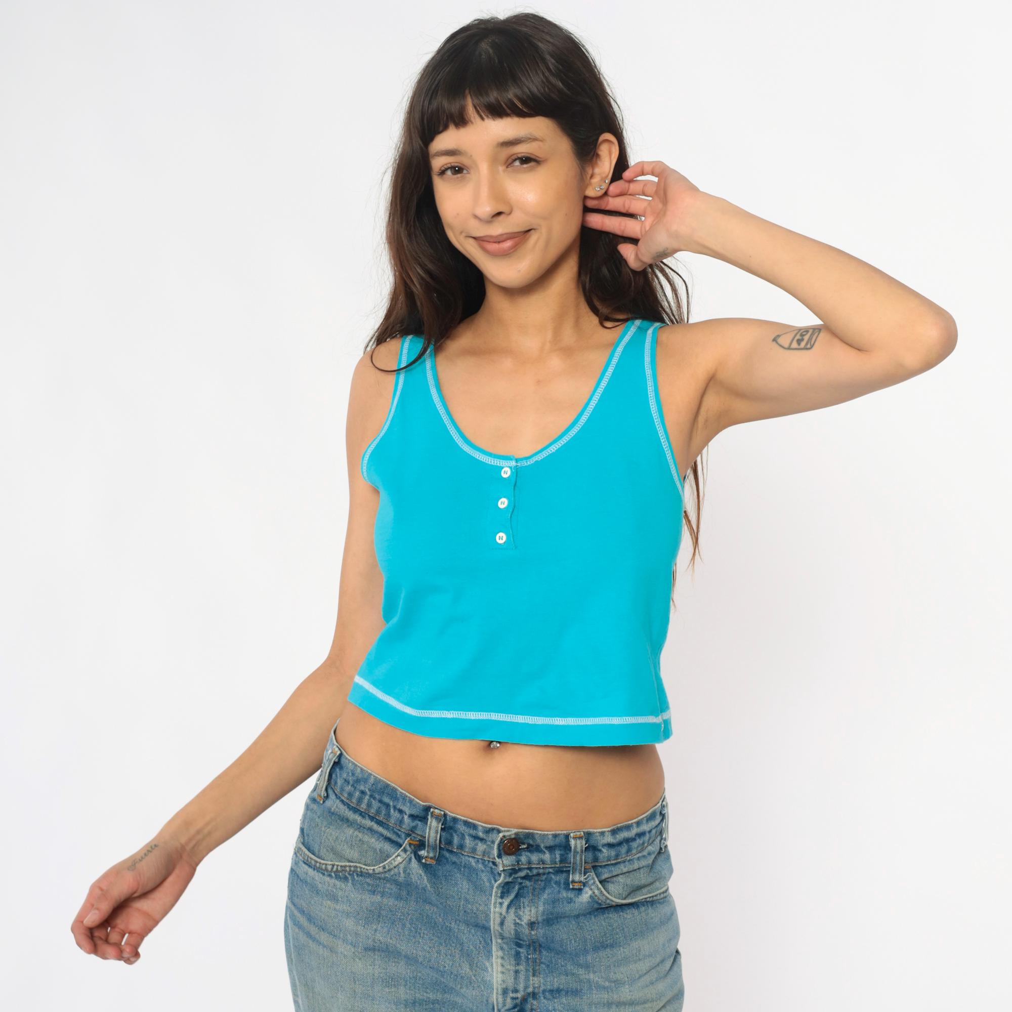90s turquoise cropped tank top from croquet club with racerback straps and white contrast stitching along neckline, straps, armholes, and hem. Three-button henley front with white buttons and scoop neckline.