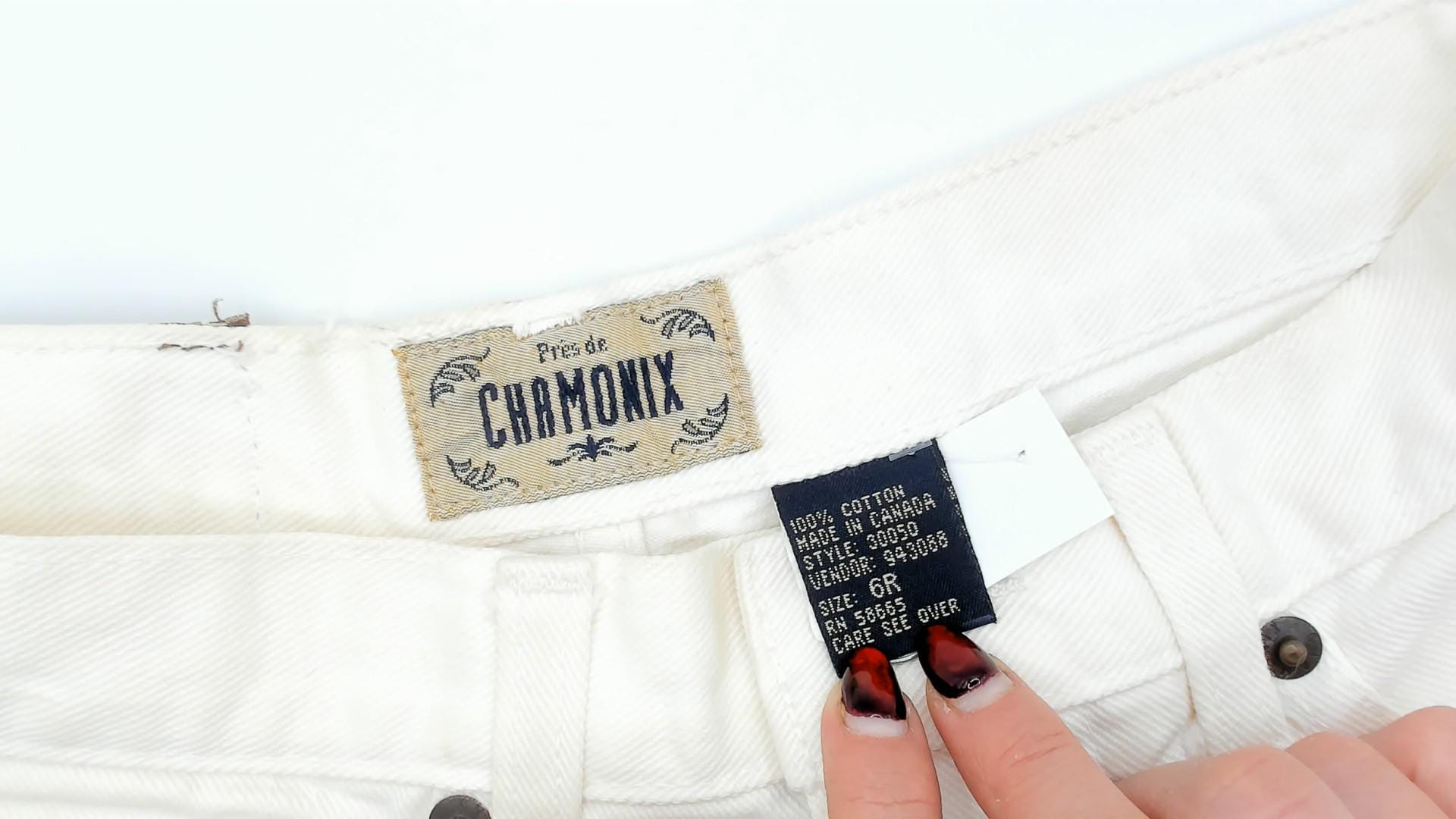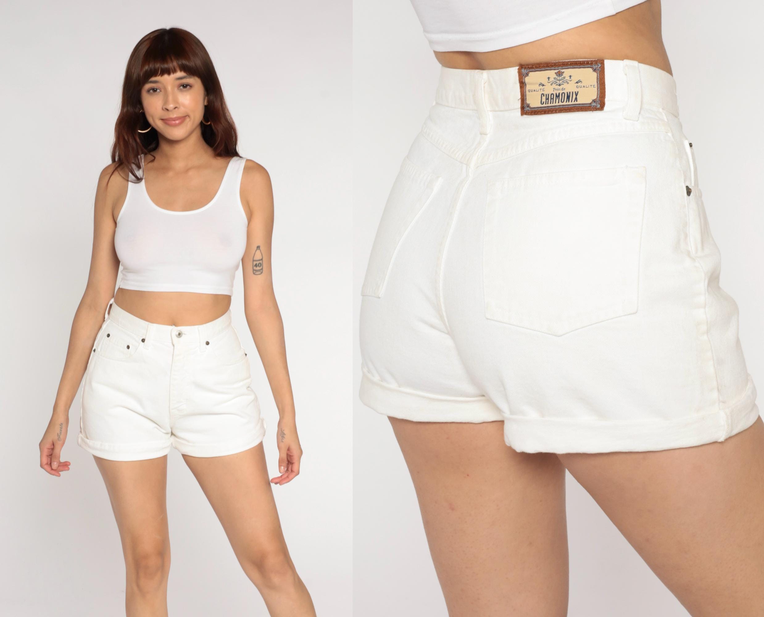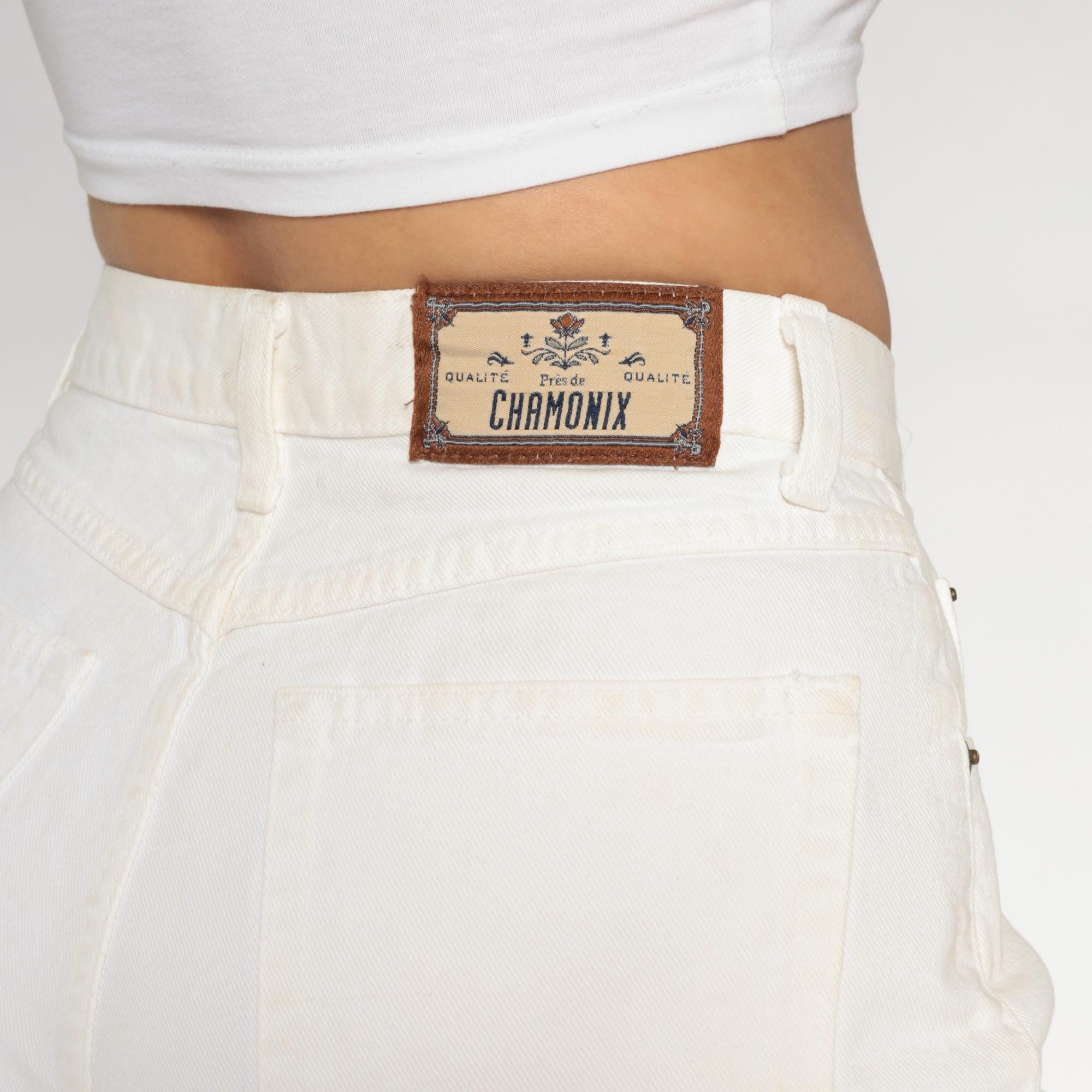 90s white denim shorts from Chamonix with high-waisted fit and rolled cuffs. Five-pocket styling with button fly closure, metal rivets, and brown leather logo patch at back waistband.