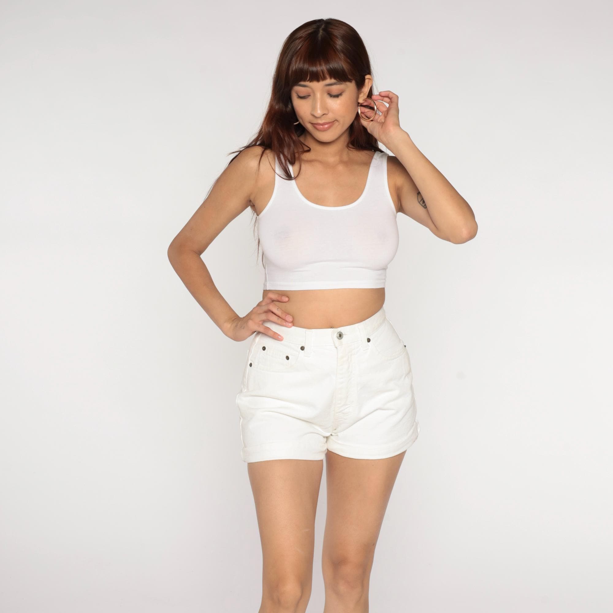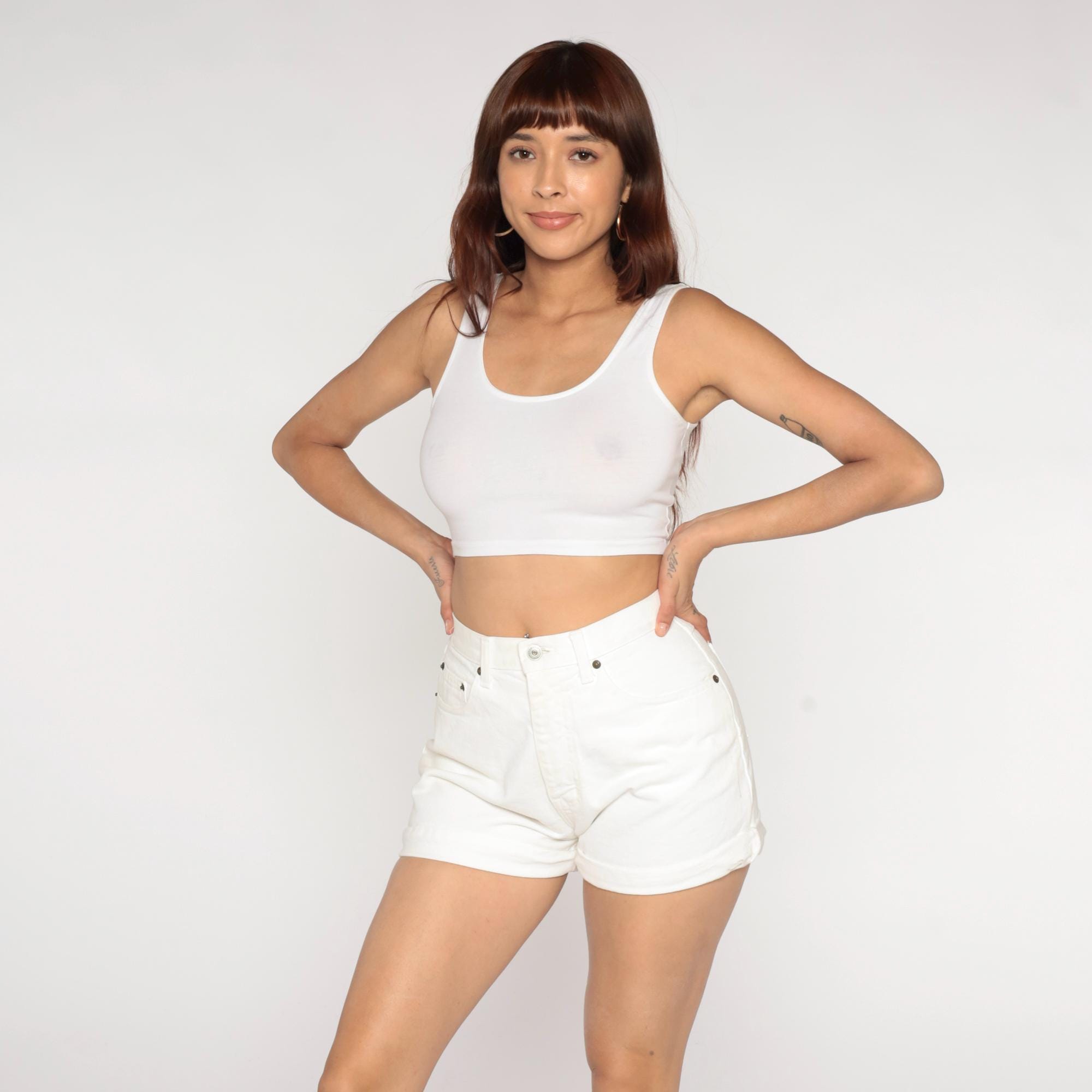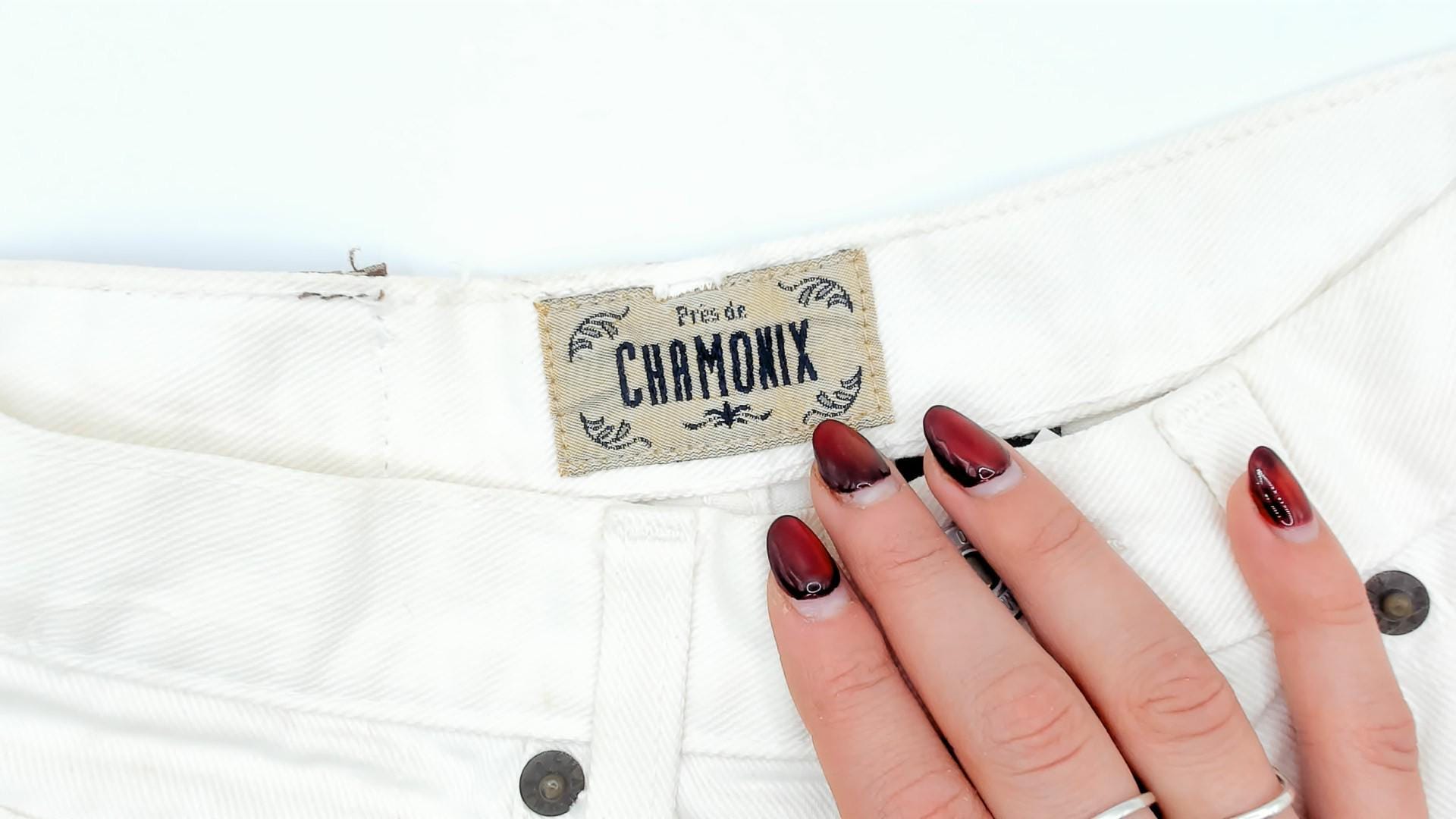 90s white denim shorts from Chamonix with high-waisted fit and rolled cuffs. Five-pocket styling with button fly closure, metal rivets, and brown leather logo patch at back waistband.