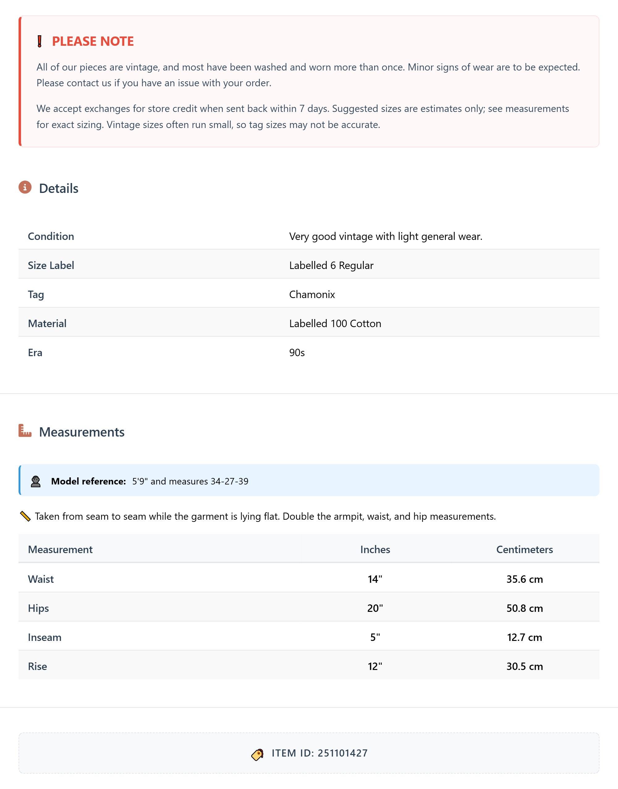 Vintage denim was usually made without any stretch, unlike modern jeans. Check the measurements to ensure proper fit, and remember to give yourself a little wiggle room in the waist and hips, depending on your preferred fit.