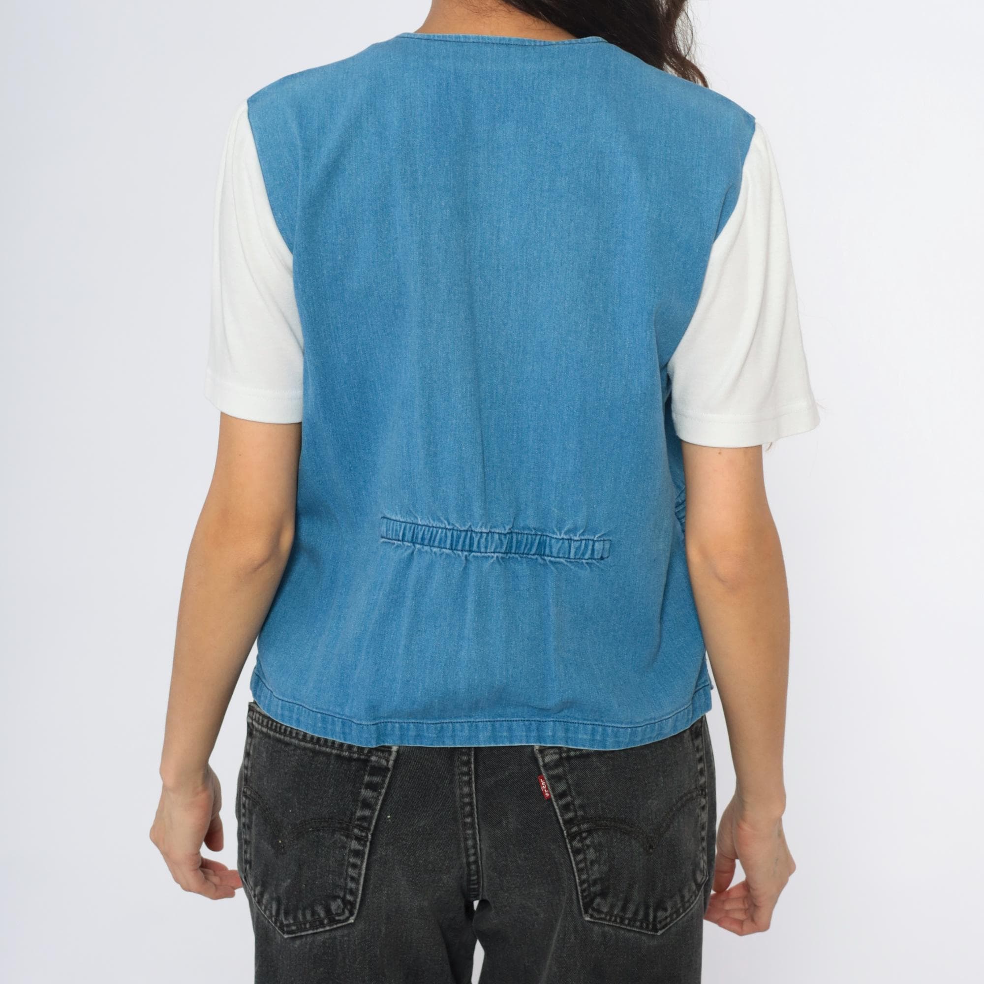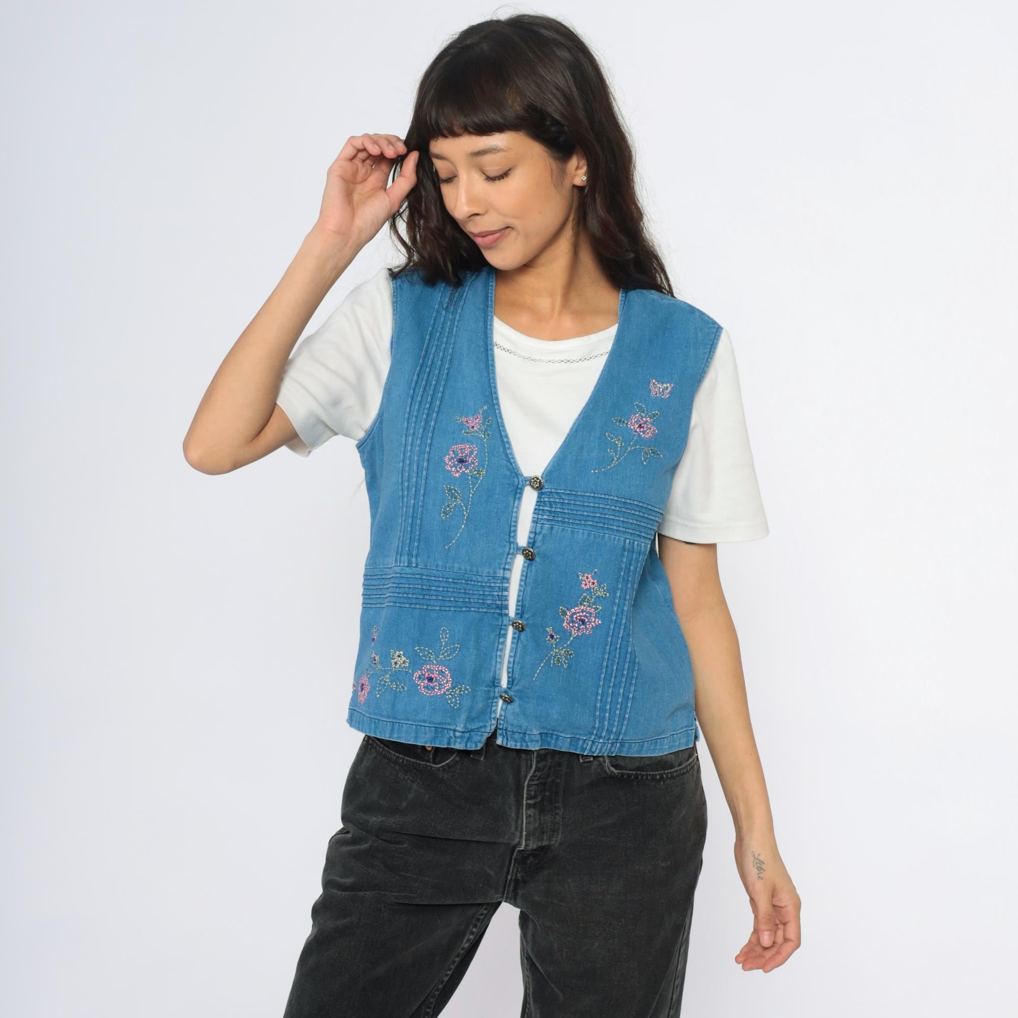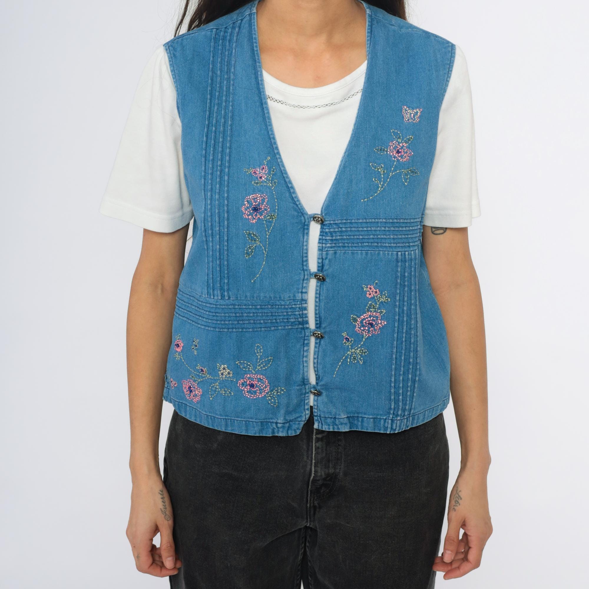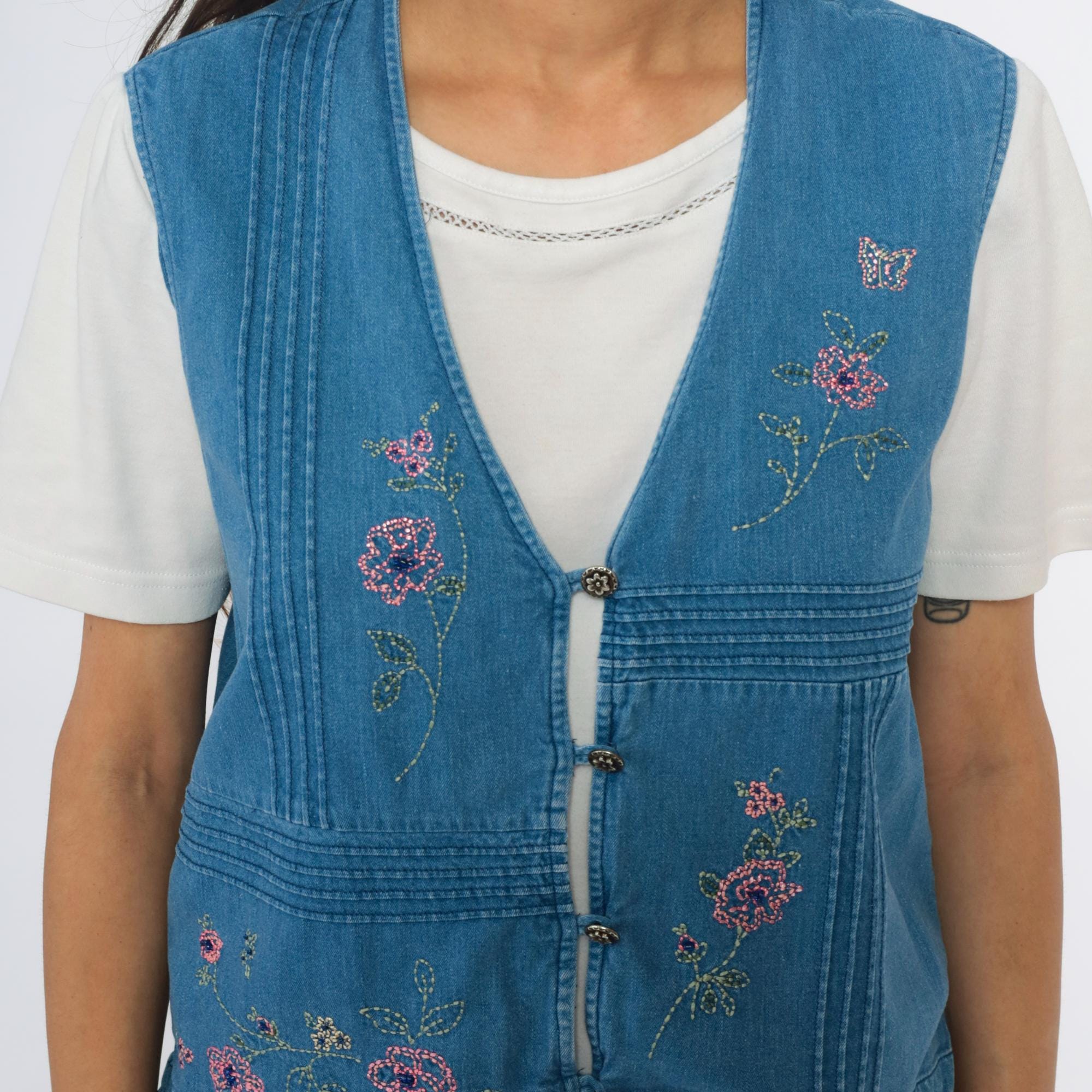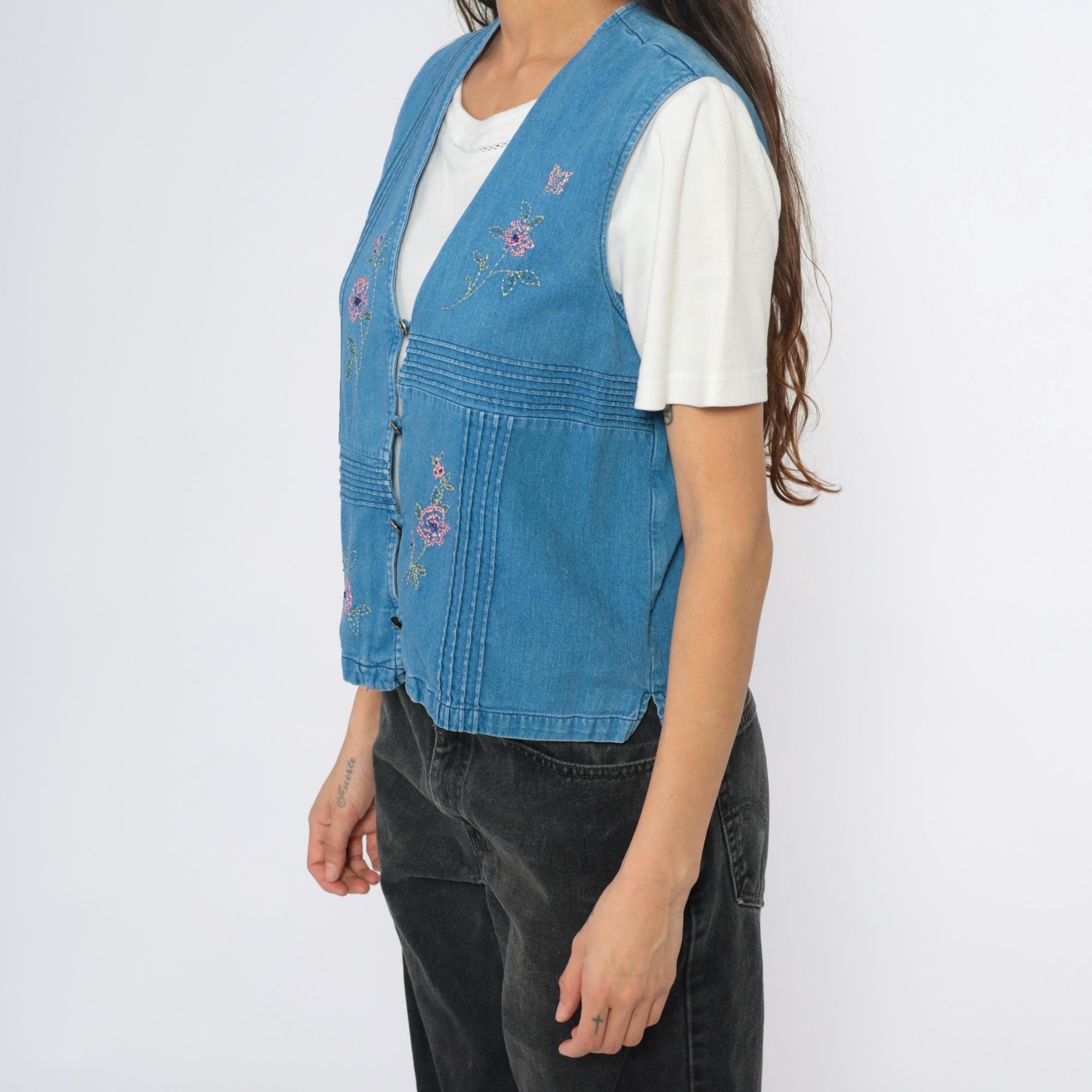 90s blue denim vest with embroidered and beaded floral design throughout, pink and multicolor flowers with green leaves and stems, small butterfly accent. V-neck with button front closure, pin-tuck detailing creating linear texture across fabric.