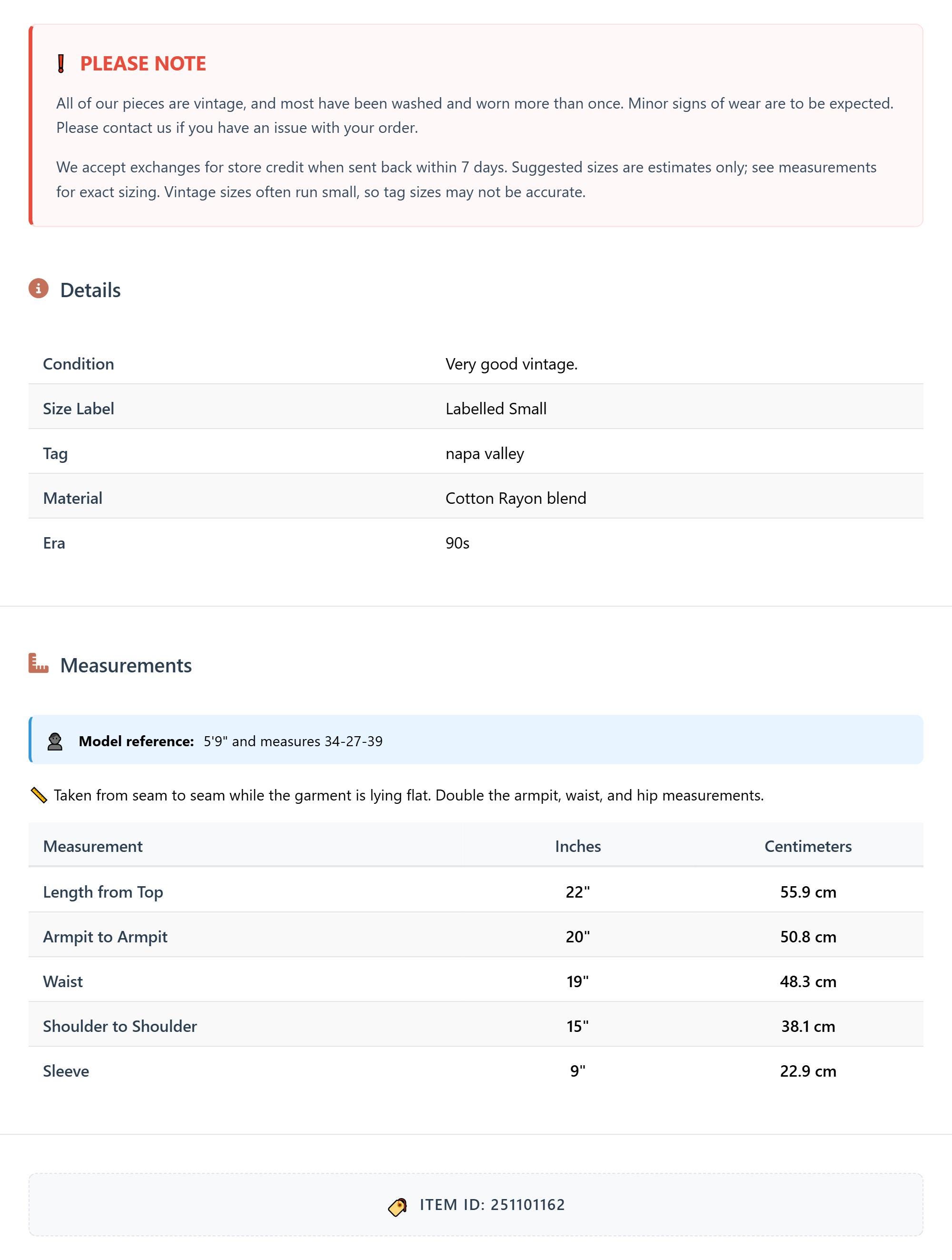 All of our pieces are vintage, and most have been washed and worn more than once. Minor signs of wear are to be expected. Please contact us if you have an issue with your order. We accept exchanges for store credit when sent back within 7 days.
