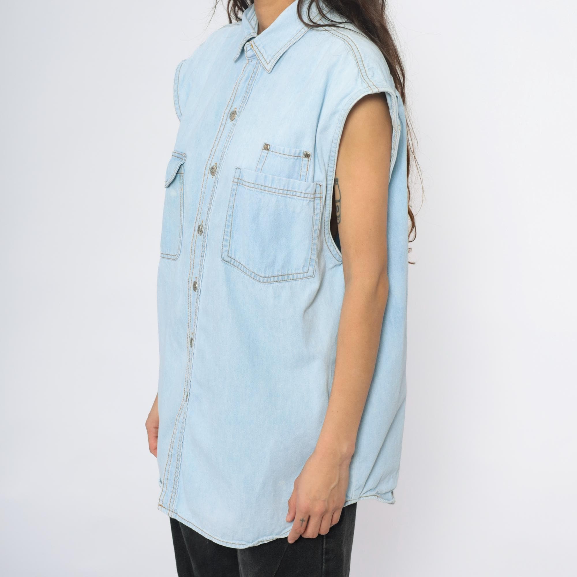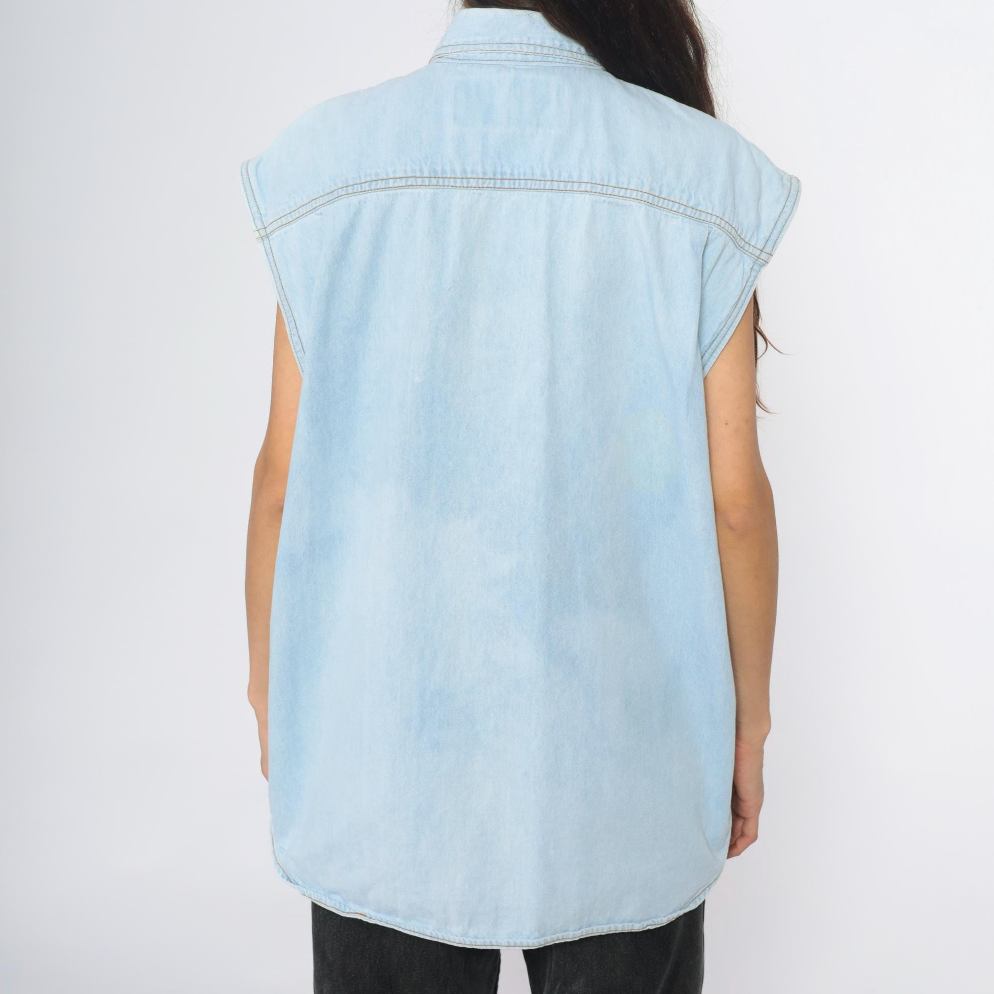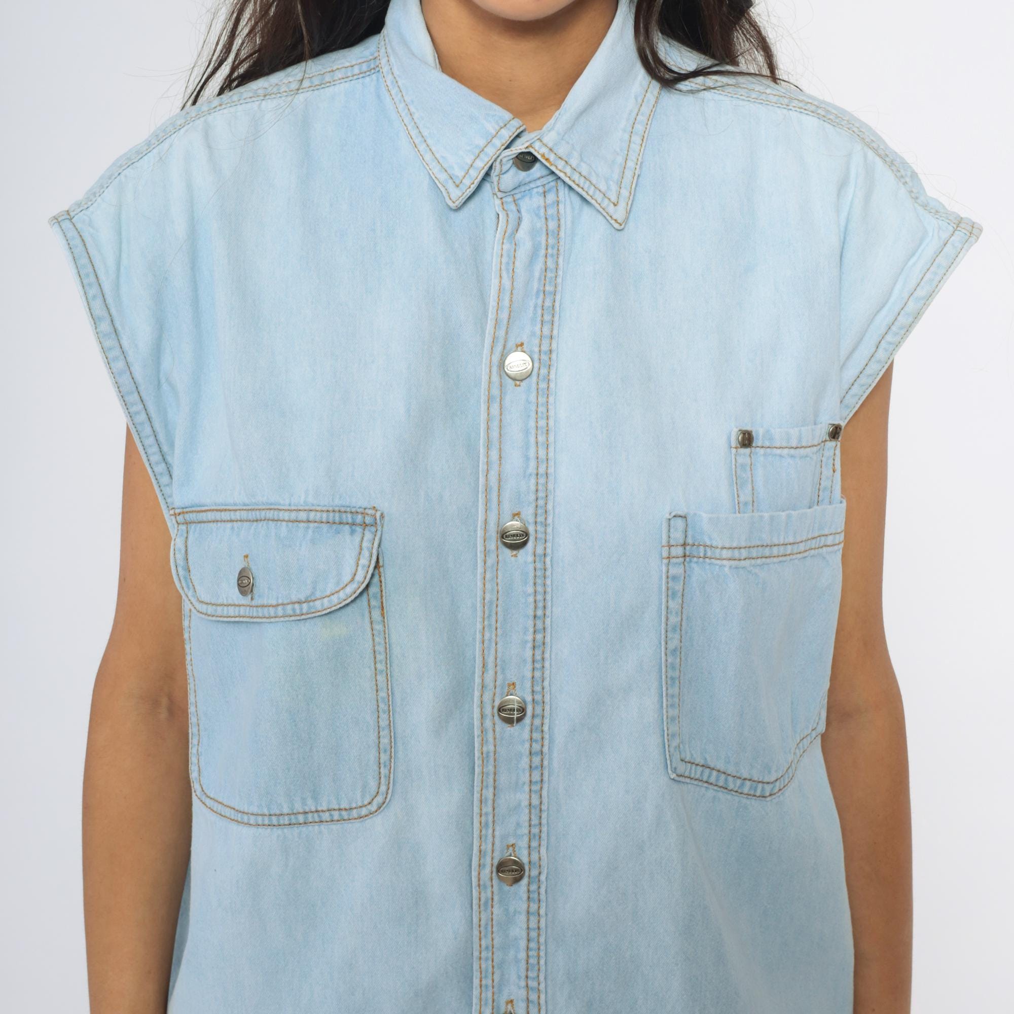 90s light blue denim sleeveless shirt with pointed collar and button front closure. Two chest pockets, one with flap and snap closure, contrast topstitching throughout, rolled armhole edges.