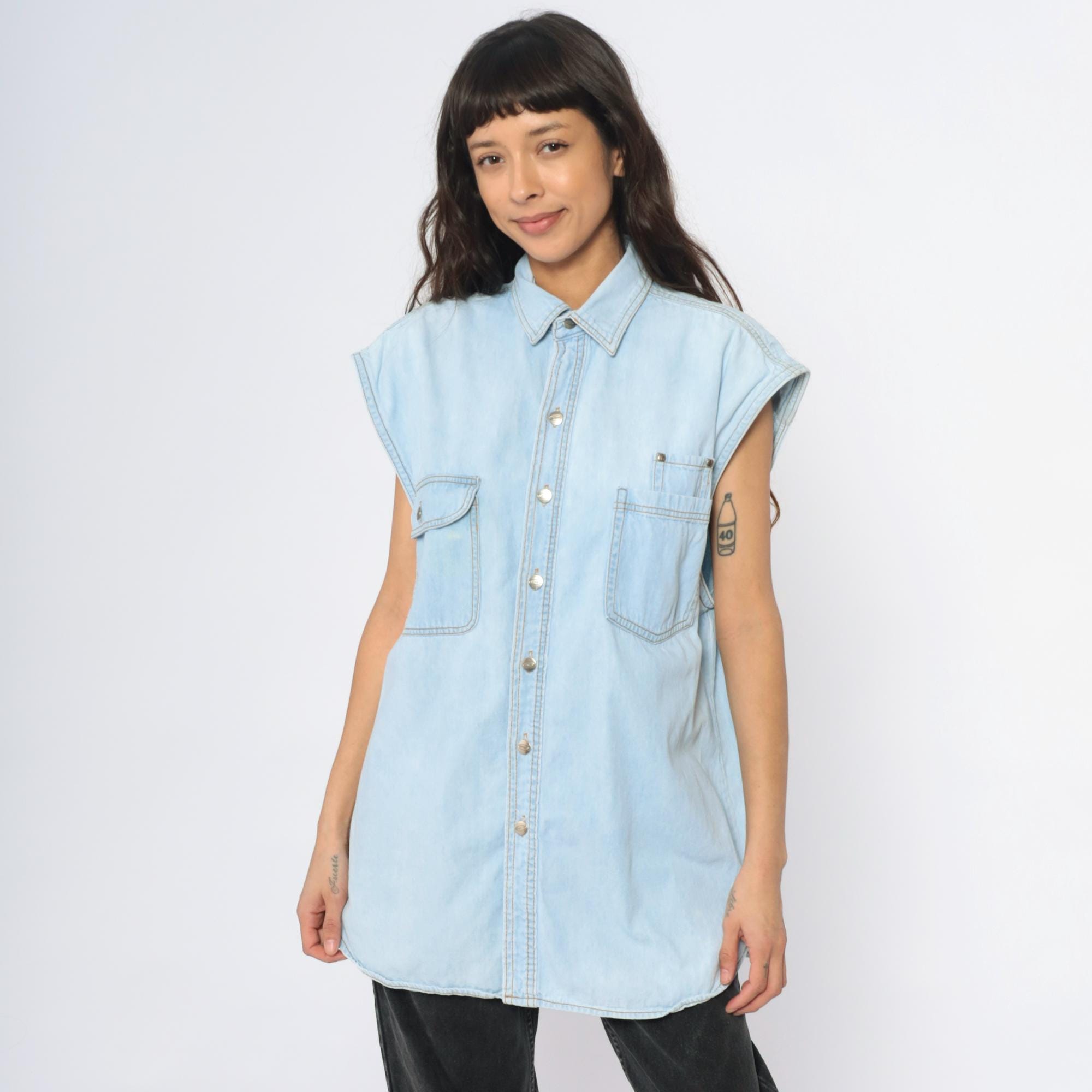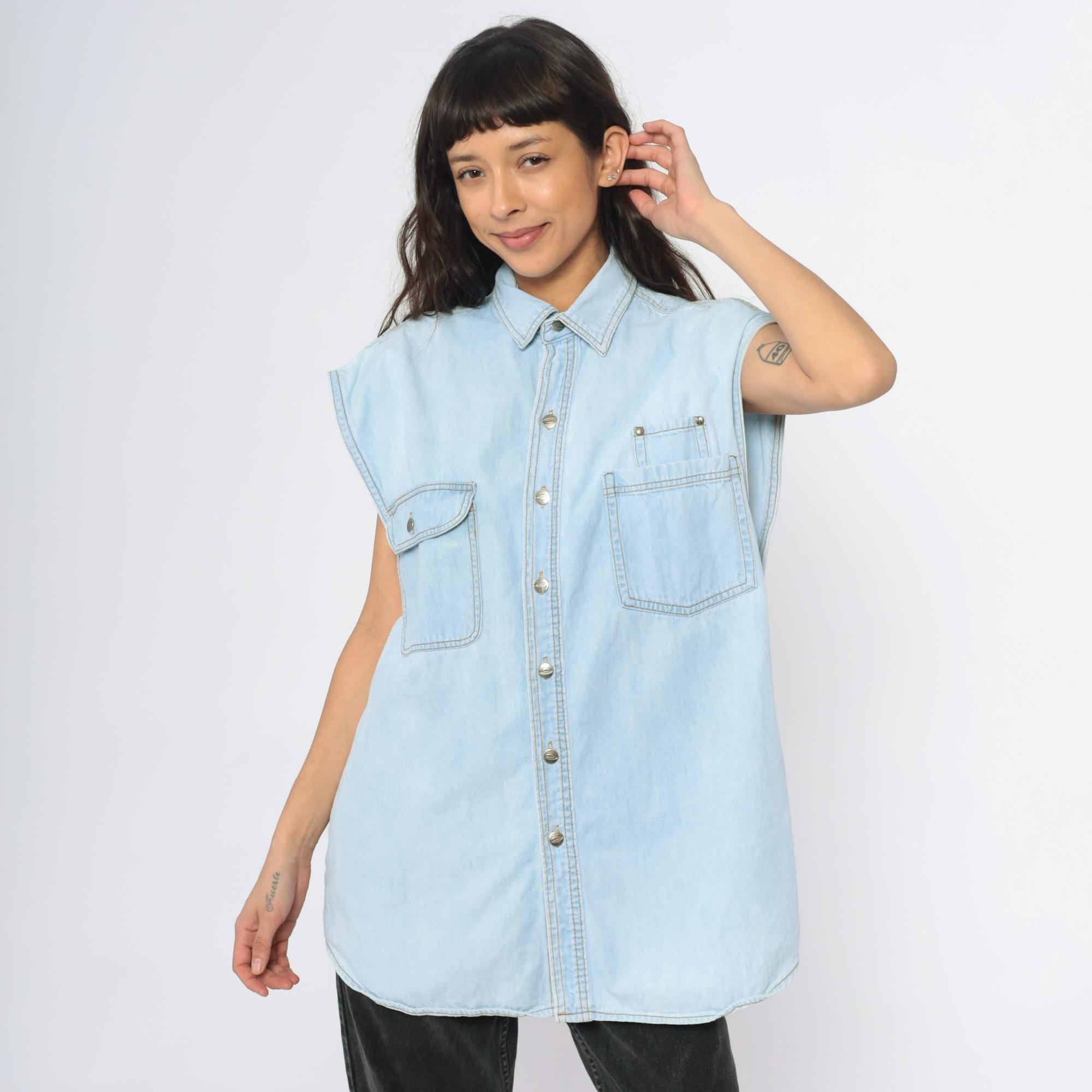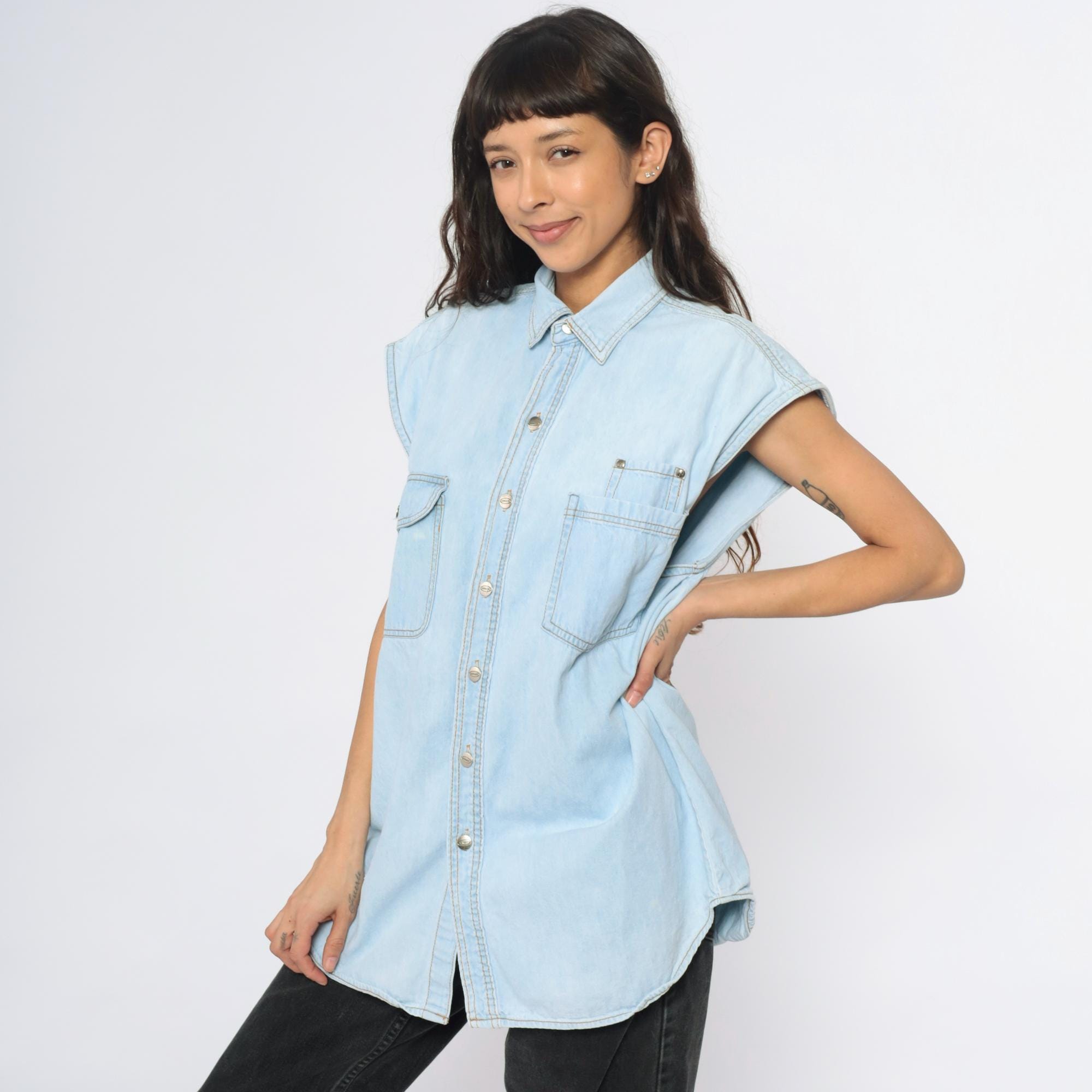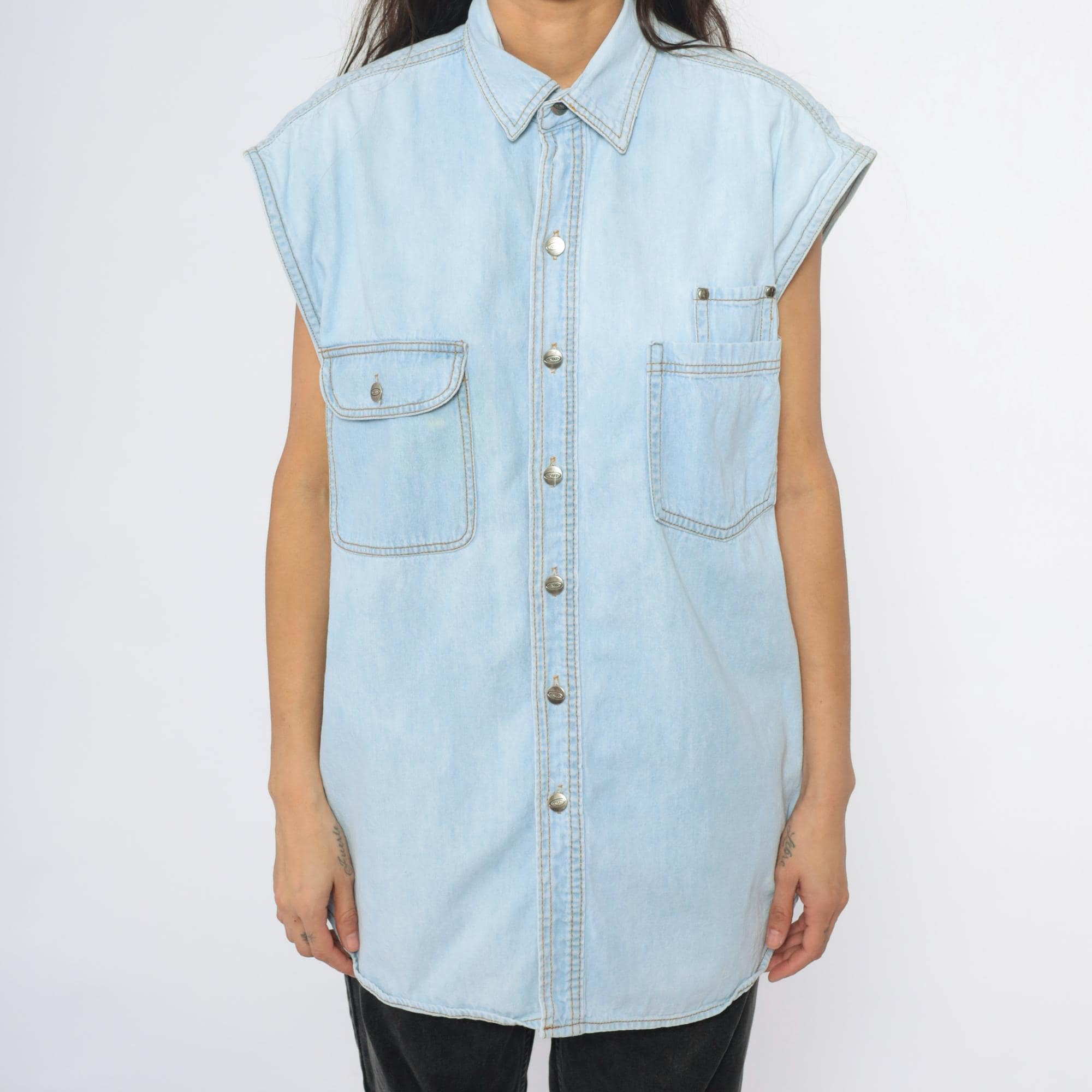90s light blue denim sleeveless shirt with pointed collar and button front closure. Two chest pockets, one with flap and snap closure, contrast topstitching throughout, rolled armhole edges.