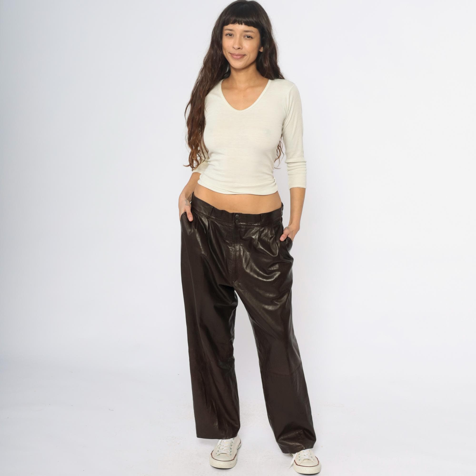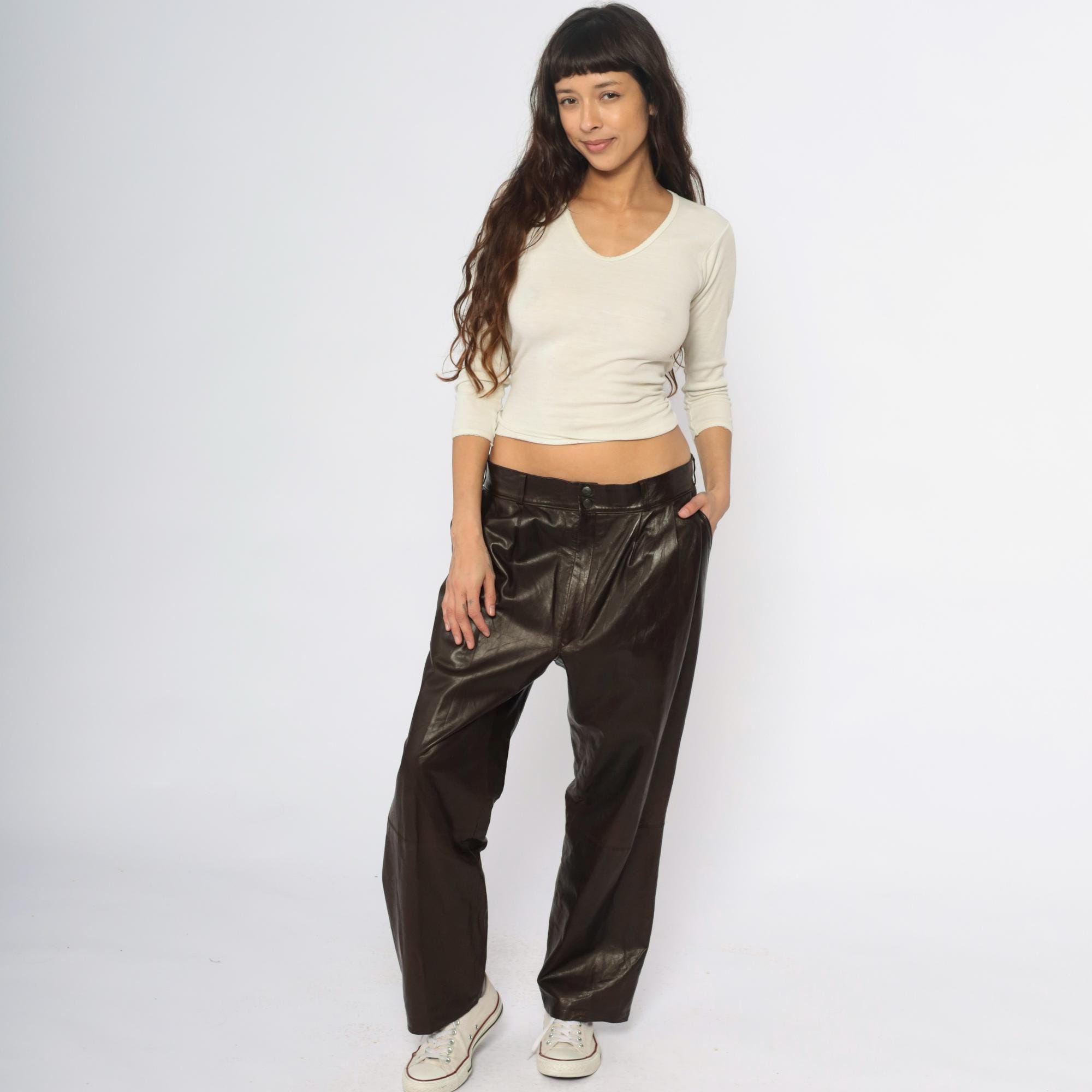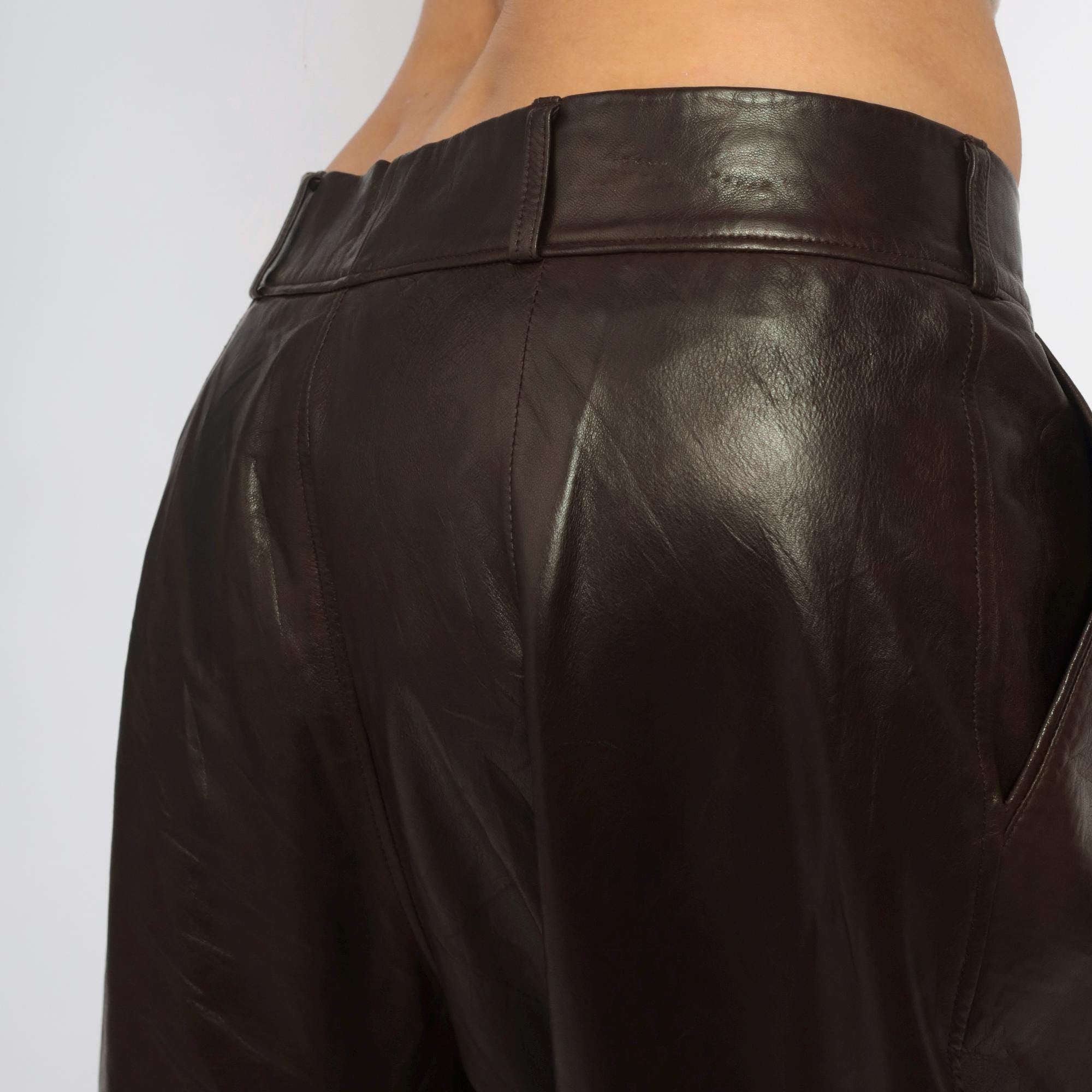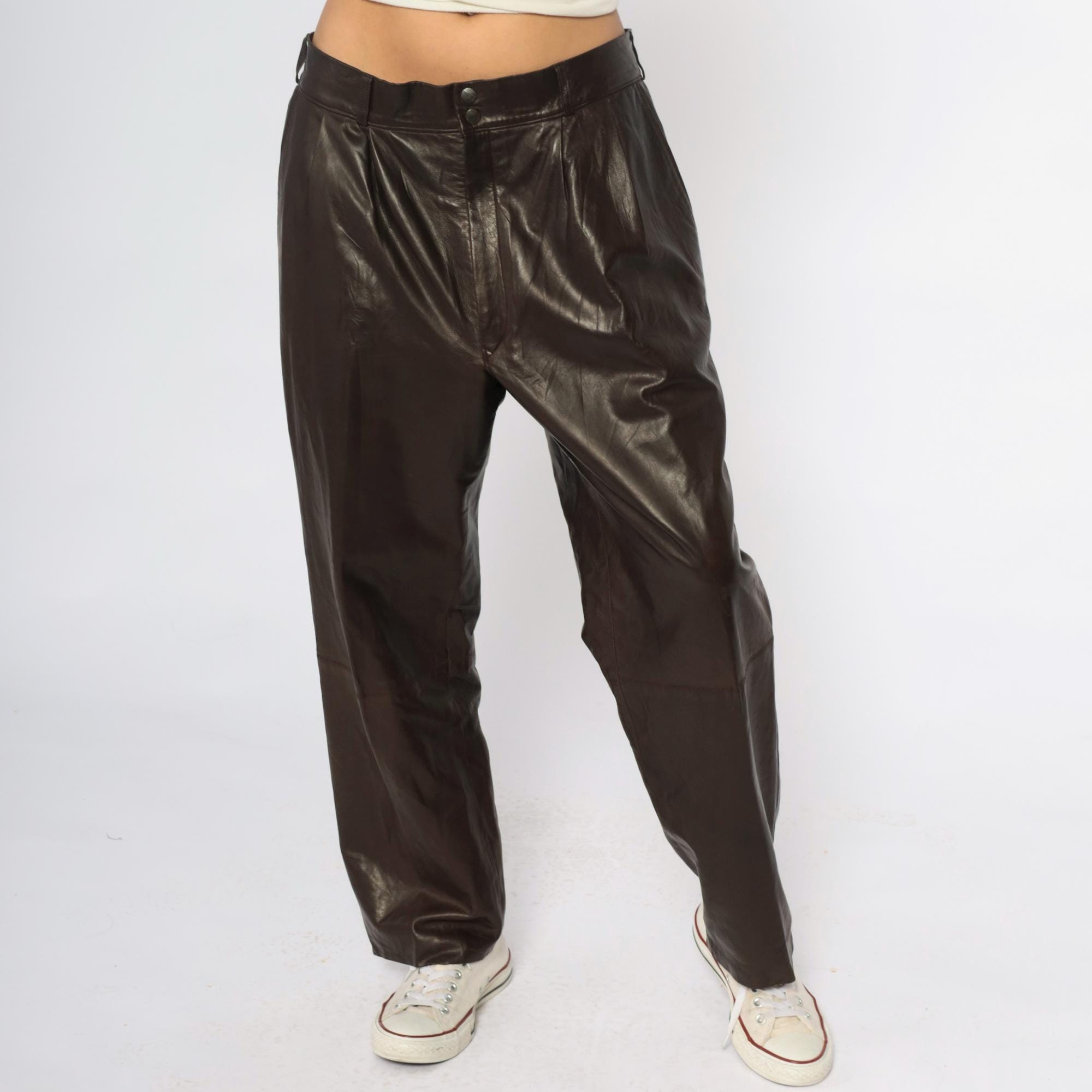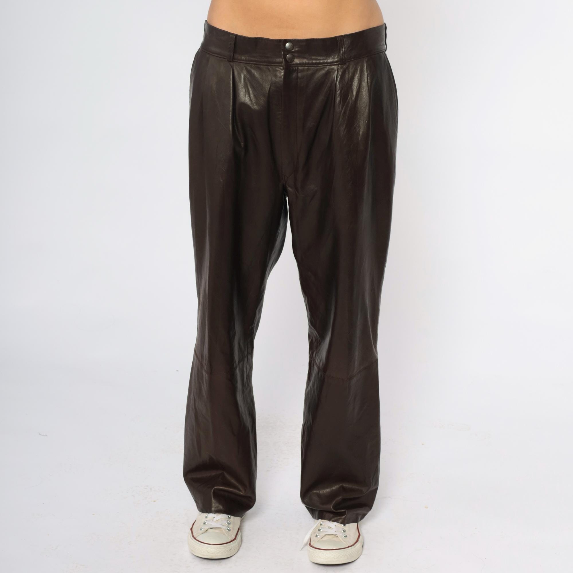 90s black leather pants from sara edan leather co with wide leg silhouette and pleated front detail. High waist with belt loops, two-button front closure.
