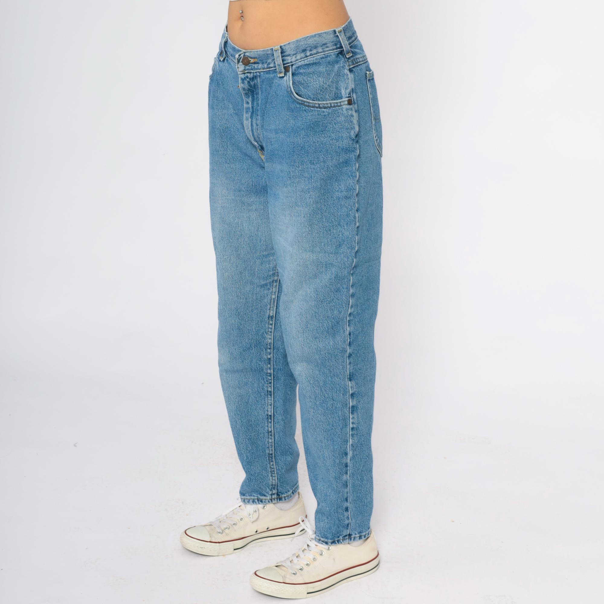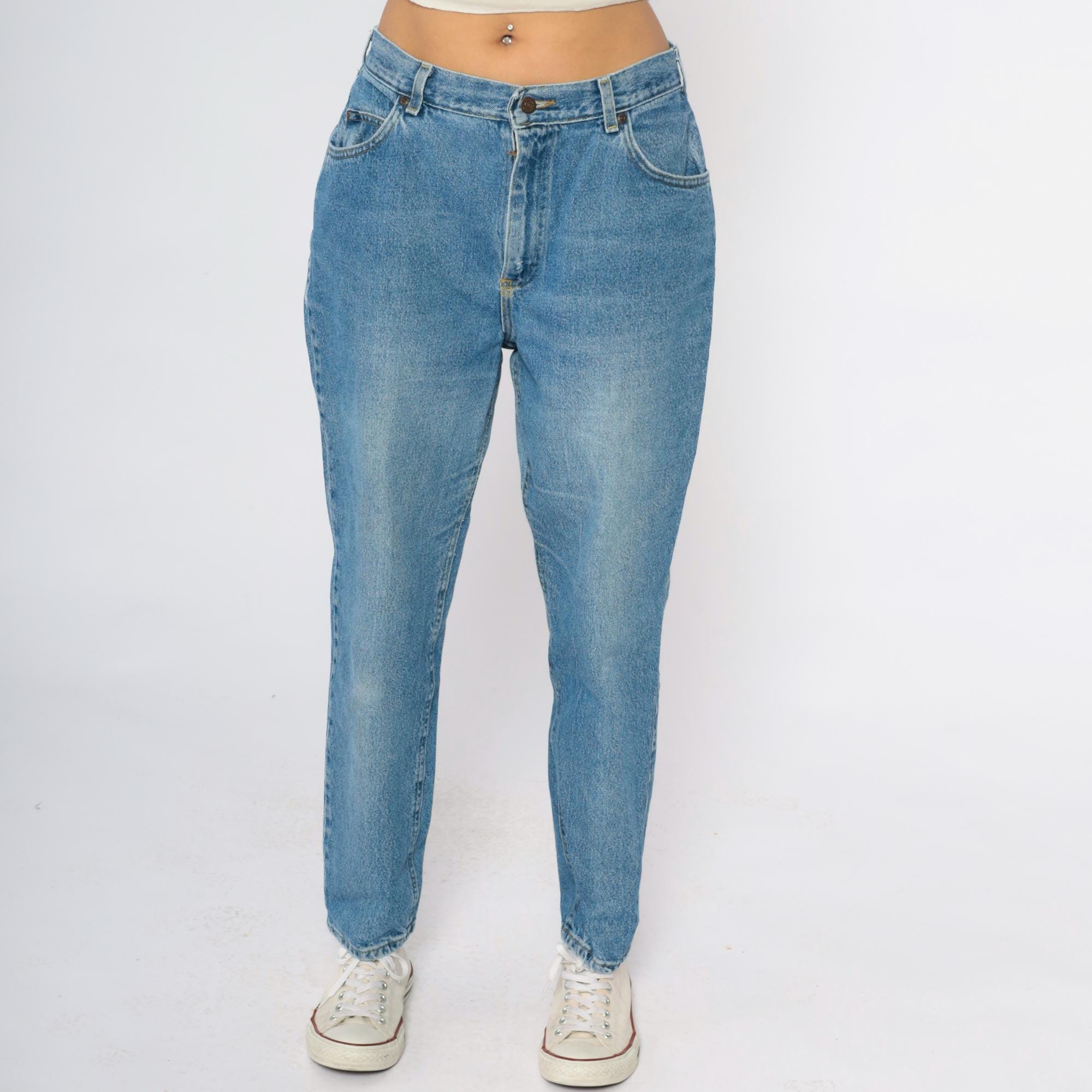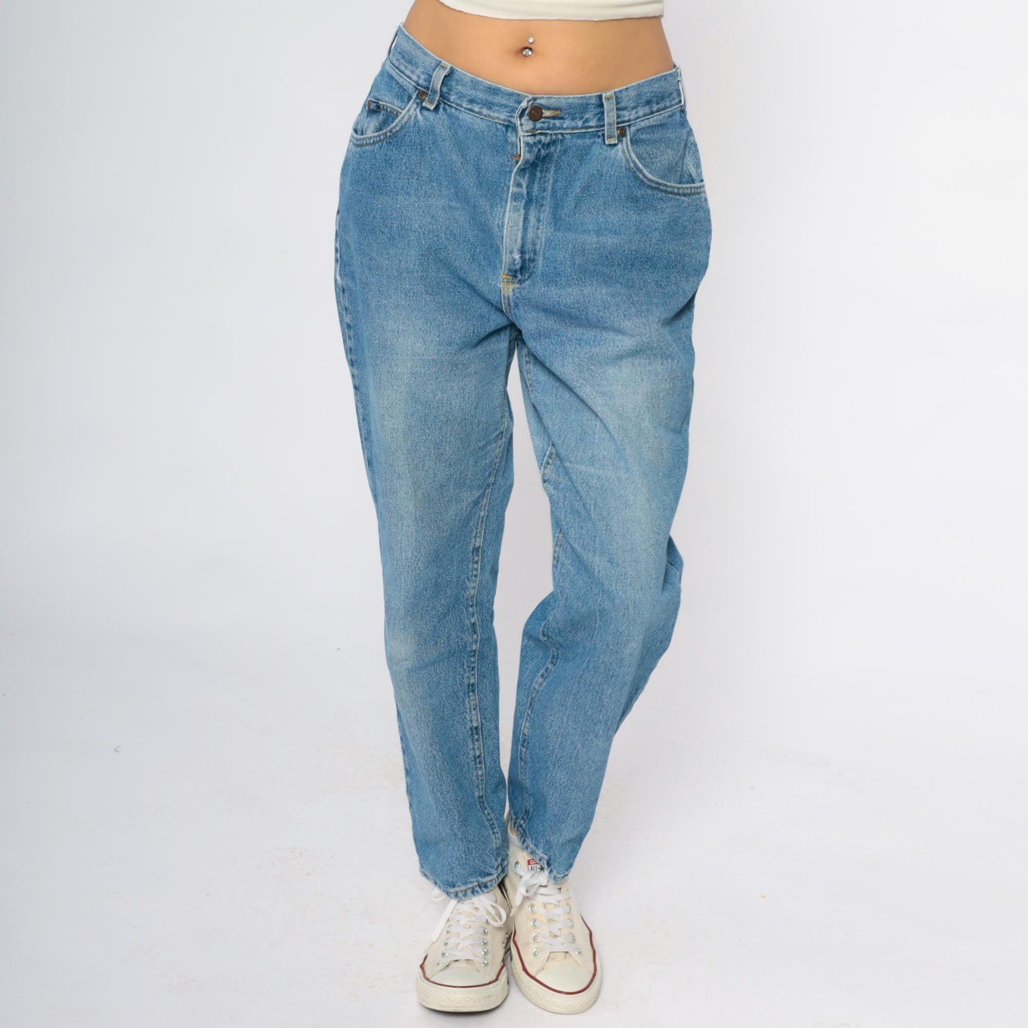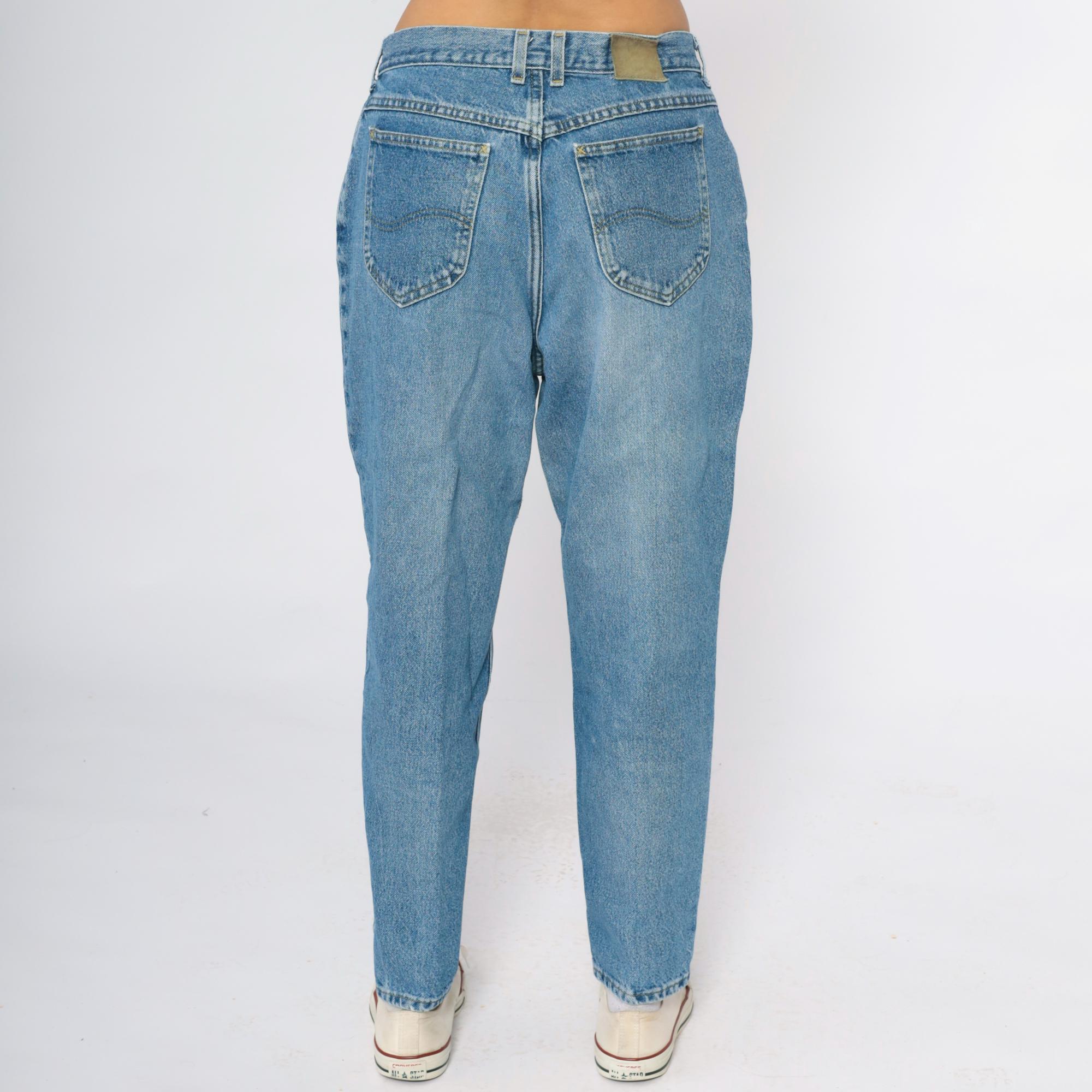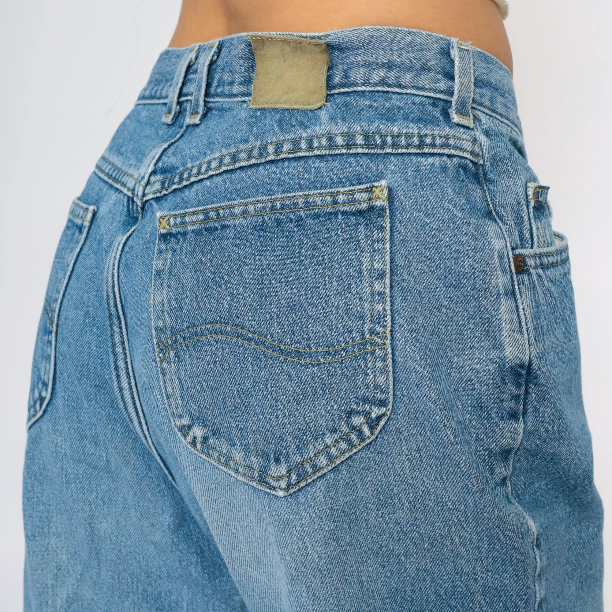 90s light blue straight leg jeans from Lee with classic five-pocket styling and medium blue wash showing natural fading throughout. Higher rise waist with zipper fly and button closure, straight through hip and thigh with slightly tapered leg.