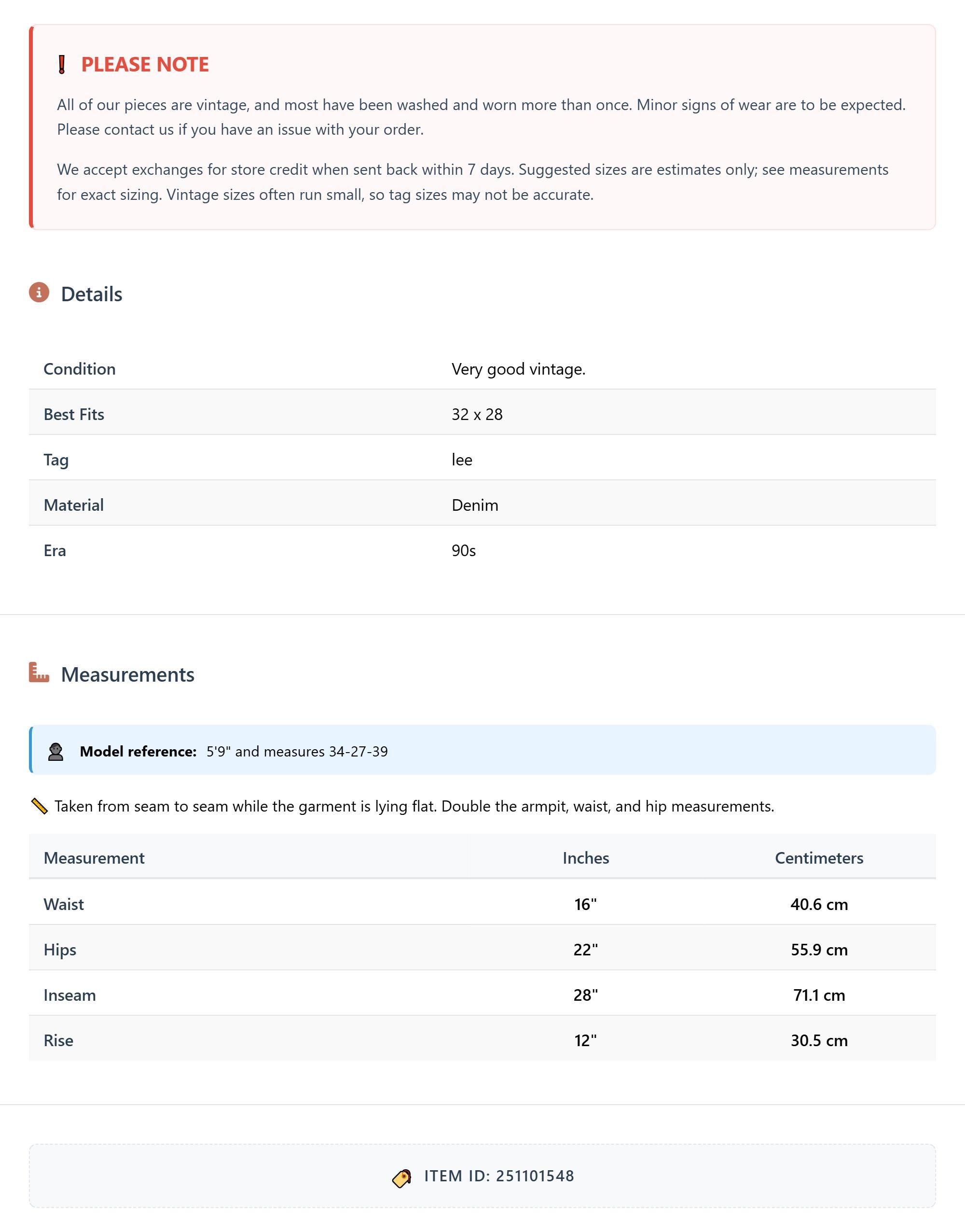 Vintage denim was usually made without any stretch, unlike modern jeans. Check the measurements to ensure proper fit, and remember to give yourself a little wiggle room in the waist and hips, depending on your preferred fit.