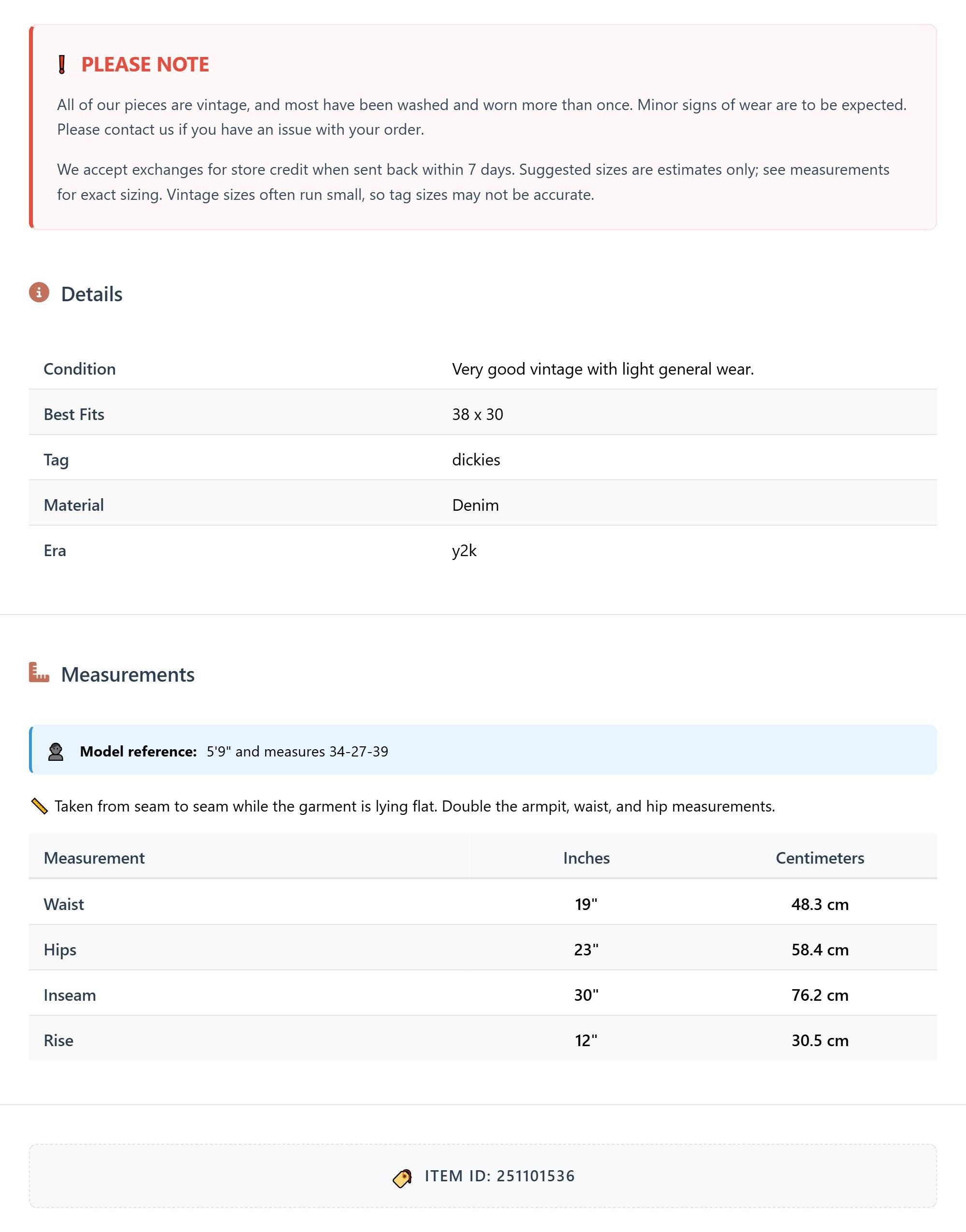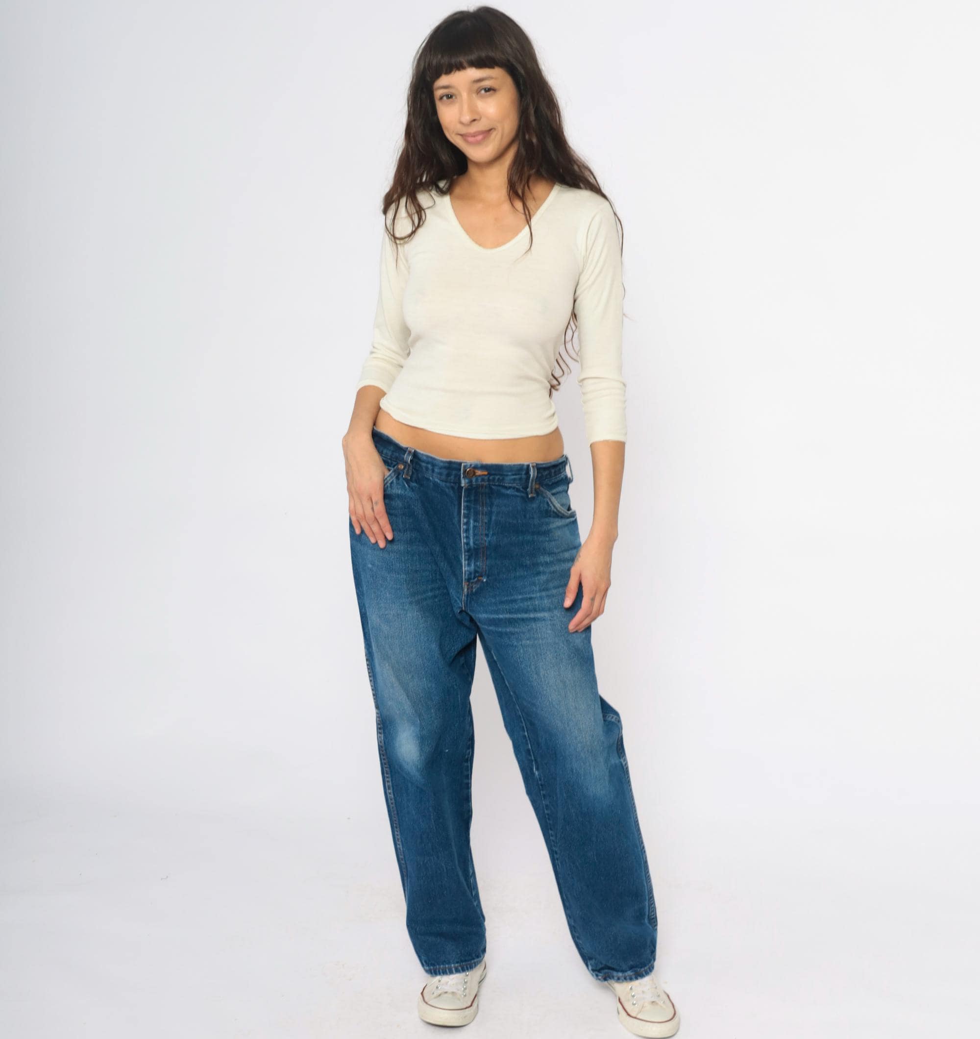 Vintage denim was usually made without any stretch, unlike modern jeans. Check the measurements to ensure proper fit, and remember to give yourself a little wiggle room in the waist and hips, depending on your preferred fit.