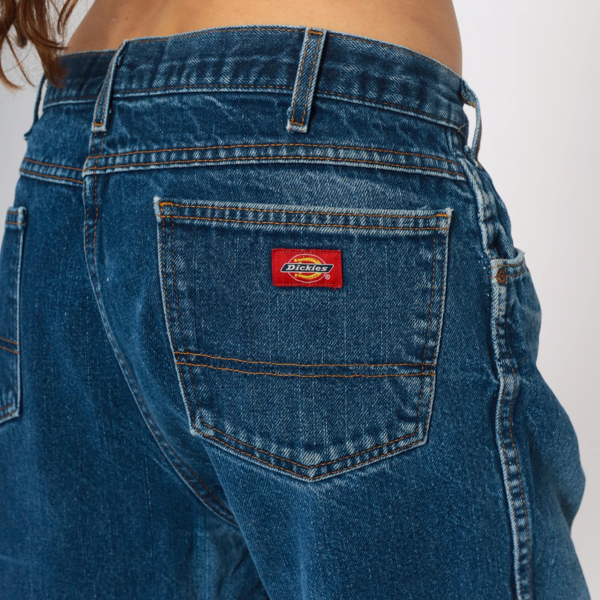 Y2K medium blue denim jeans from Dickies with straight leg silhouette and red logo patch on back right pocket. Five-pocket styling with belt loops and button fly closure.