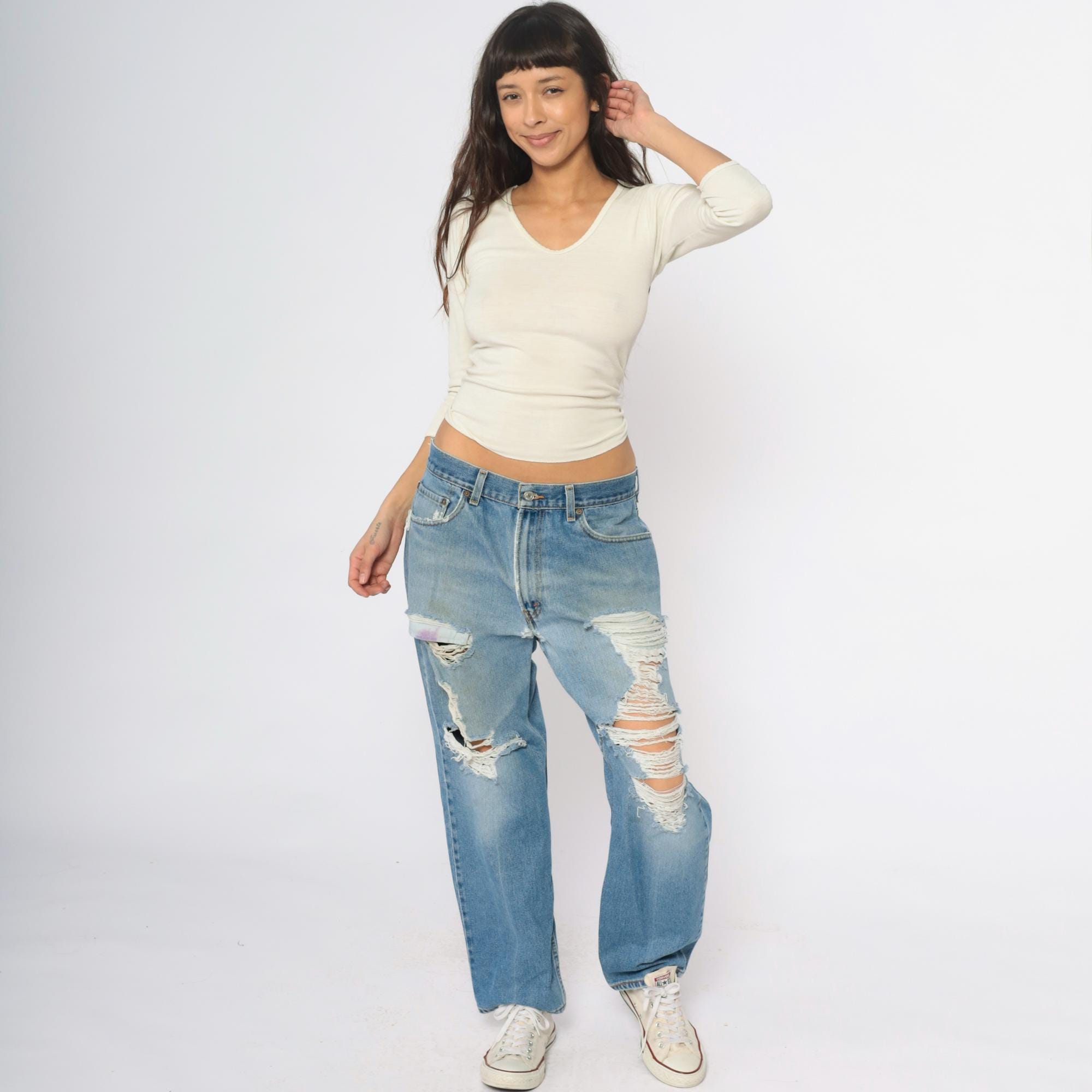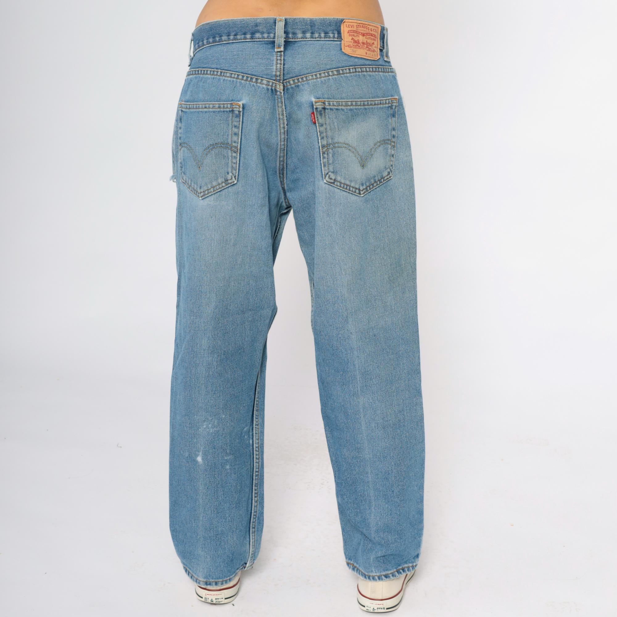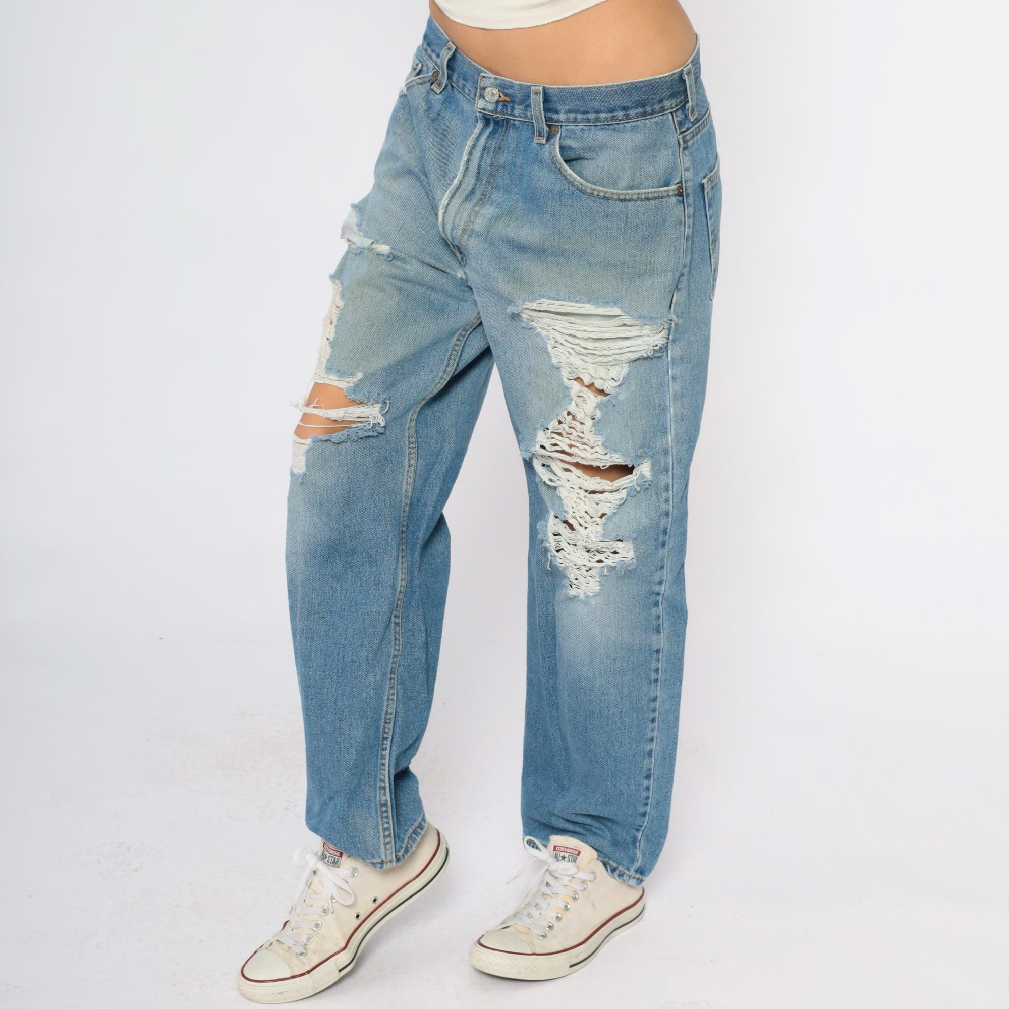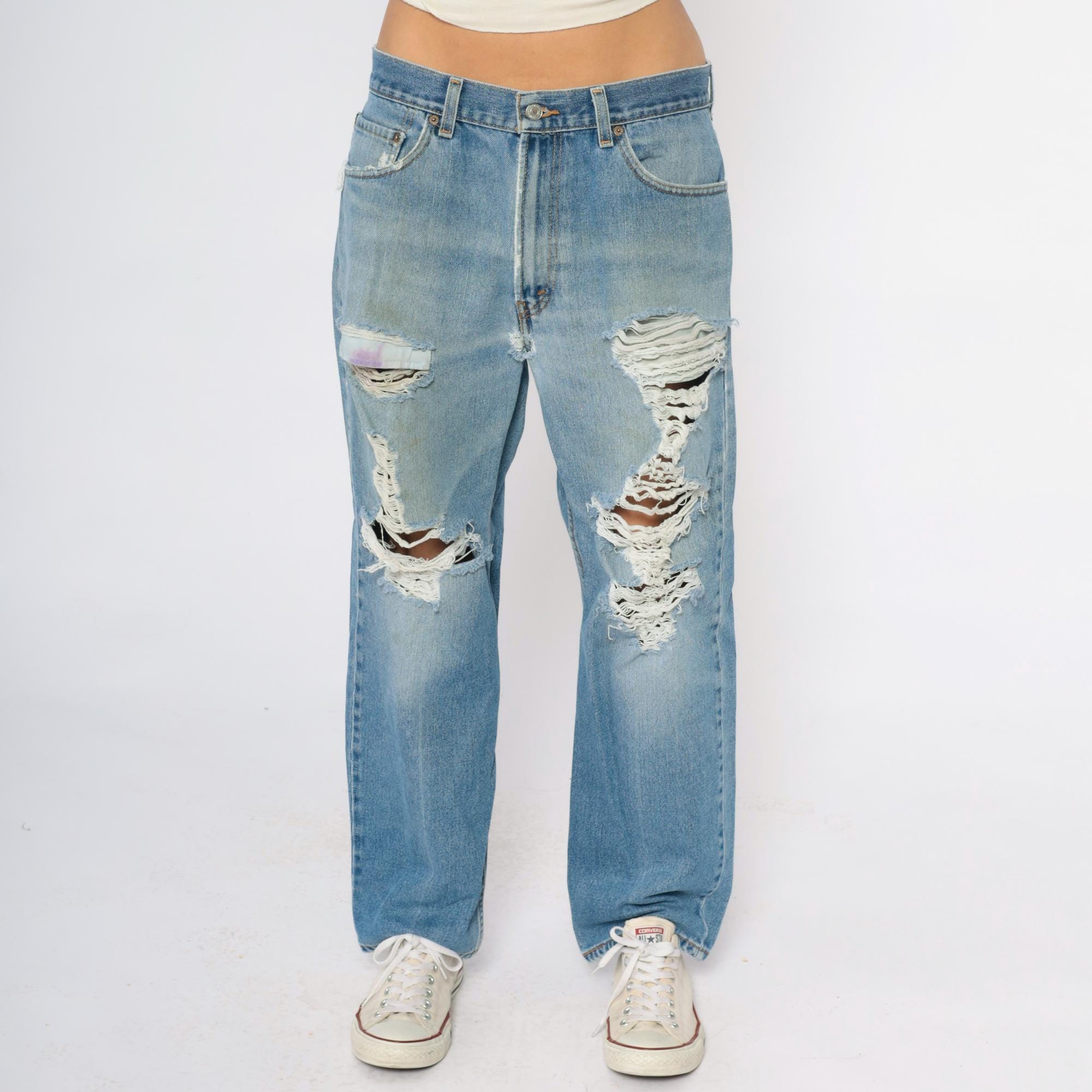 Y2K Levi's 550 jeans in light wash denim with heavy distressing. Large ripped holes across both thighs exposing white fabric underneath, fading and worn areas throughout. Relaxed fit with button fly closure, five pocket styling, and signature Levi's arcuate stitching on back pockets.