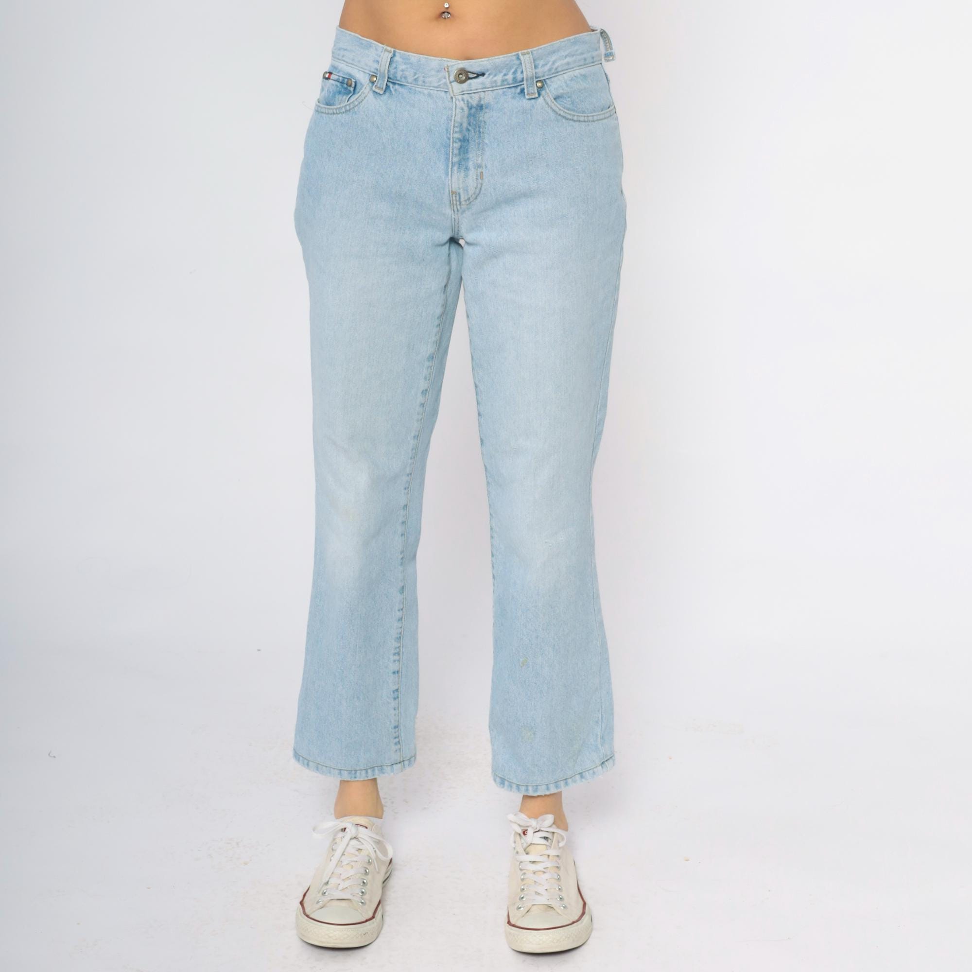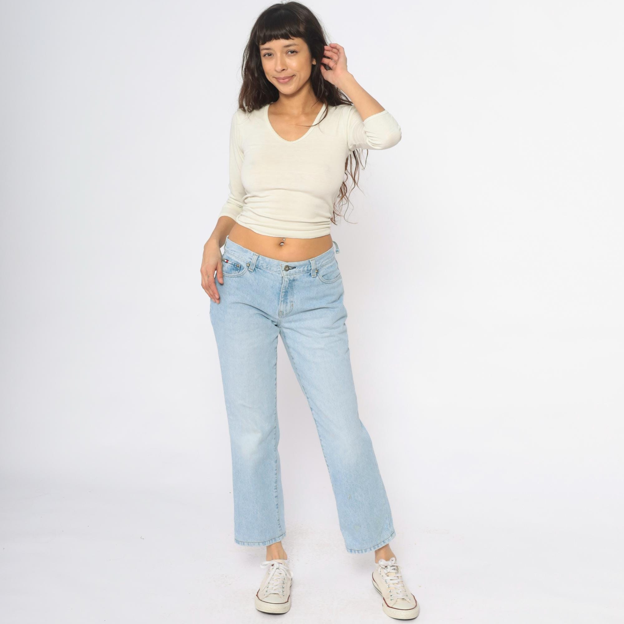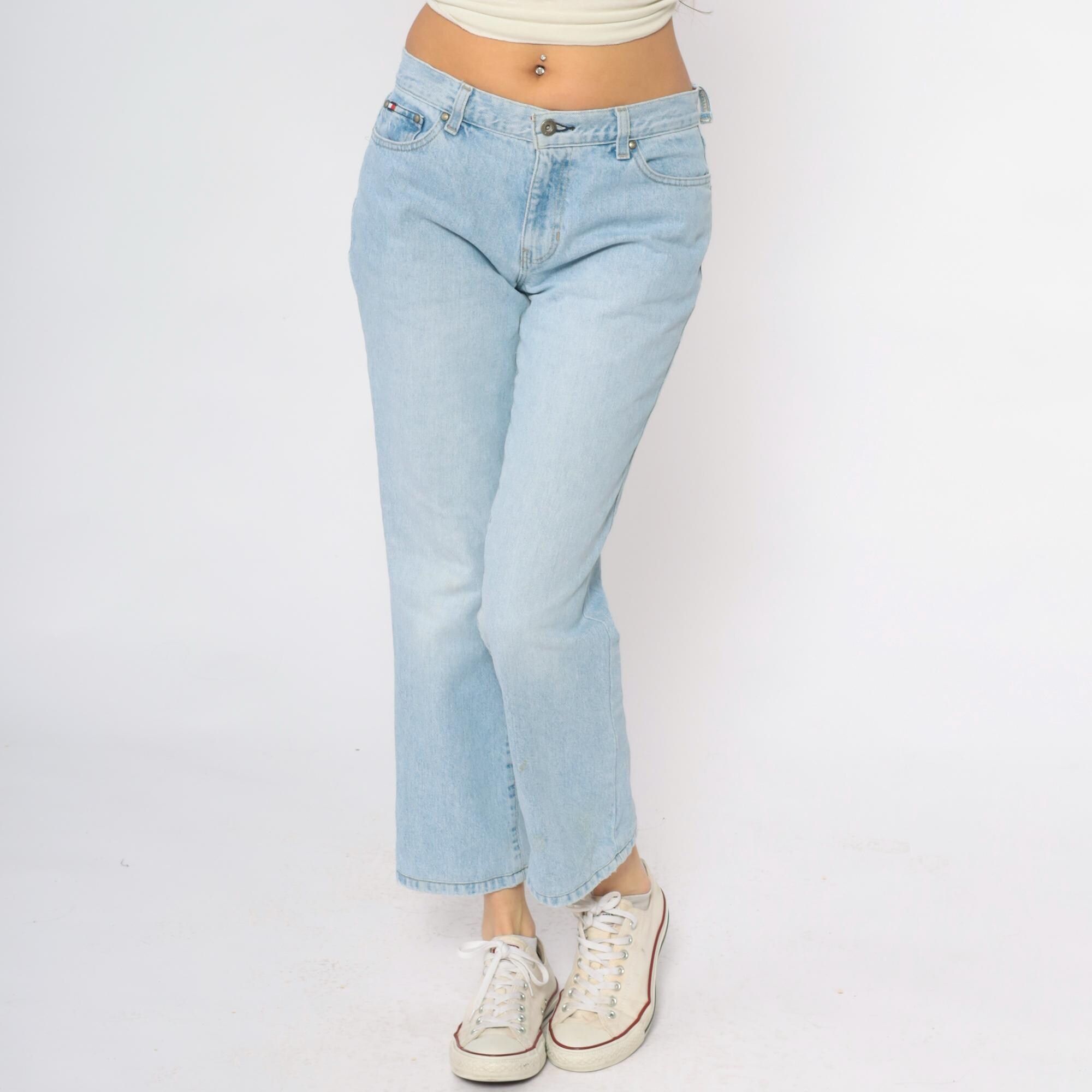 Y2K light blue denim jeans from Tommy Hilfiger with straight leg cut and cropped ankle length. High waist with belt loops and button fly closure, classic five-pocket styling with branded button and rivets.