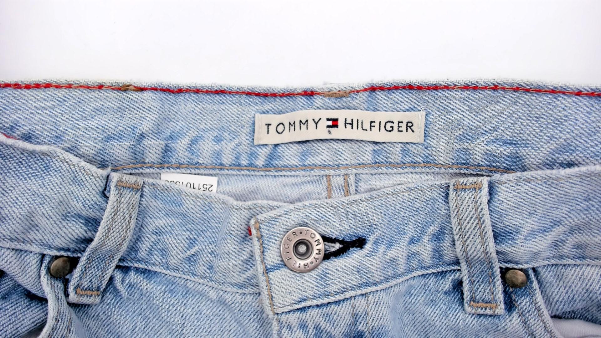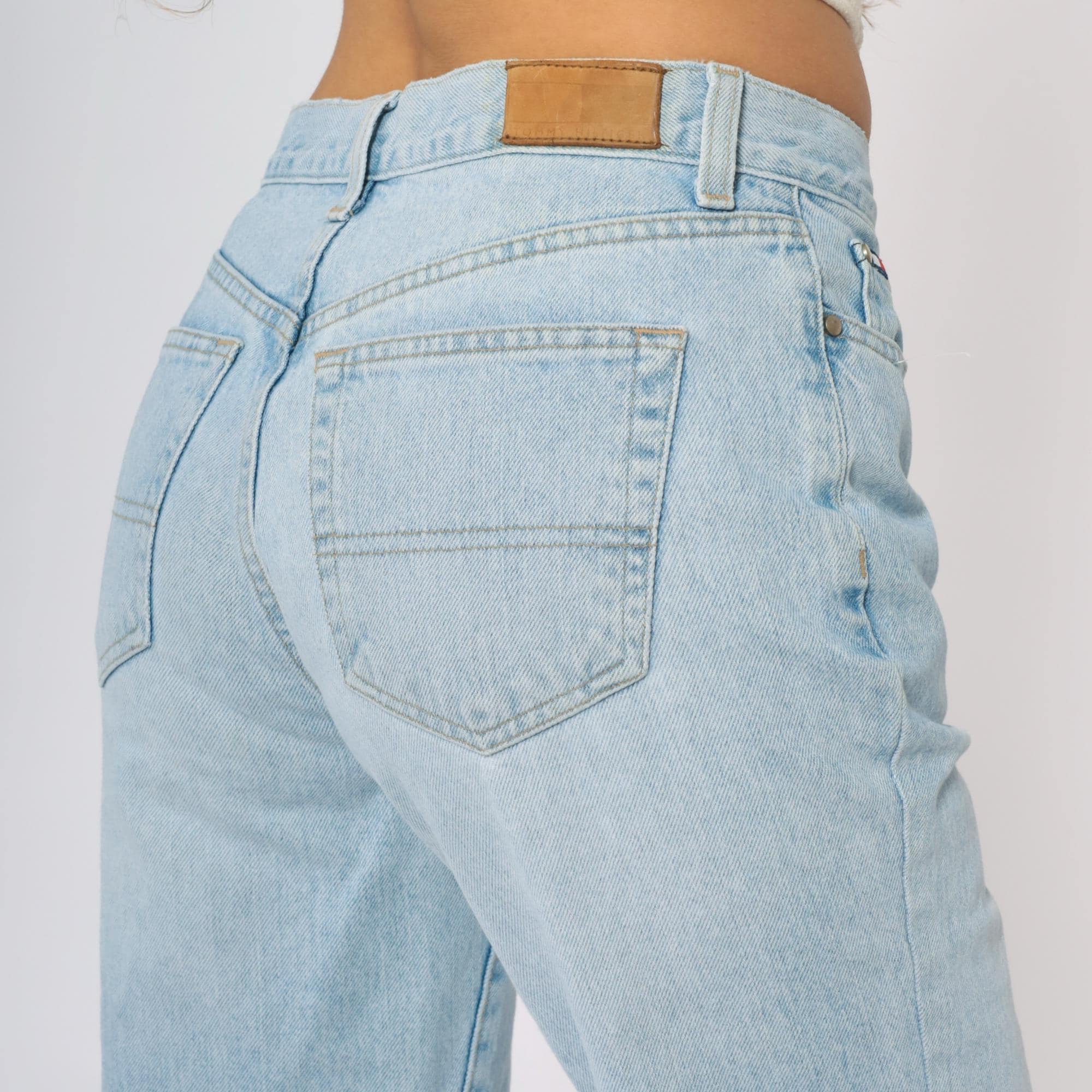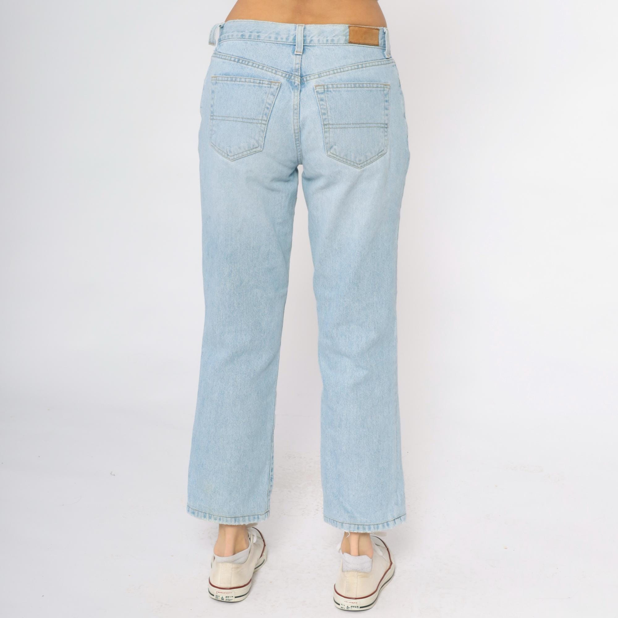 Y2K light blue denim jeans from Tommy Hilfiger with straight leg cut and cropped ankle length. High waist with belt loops and button fly closure, classic five-pocket styling with branded button and rivets.