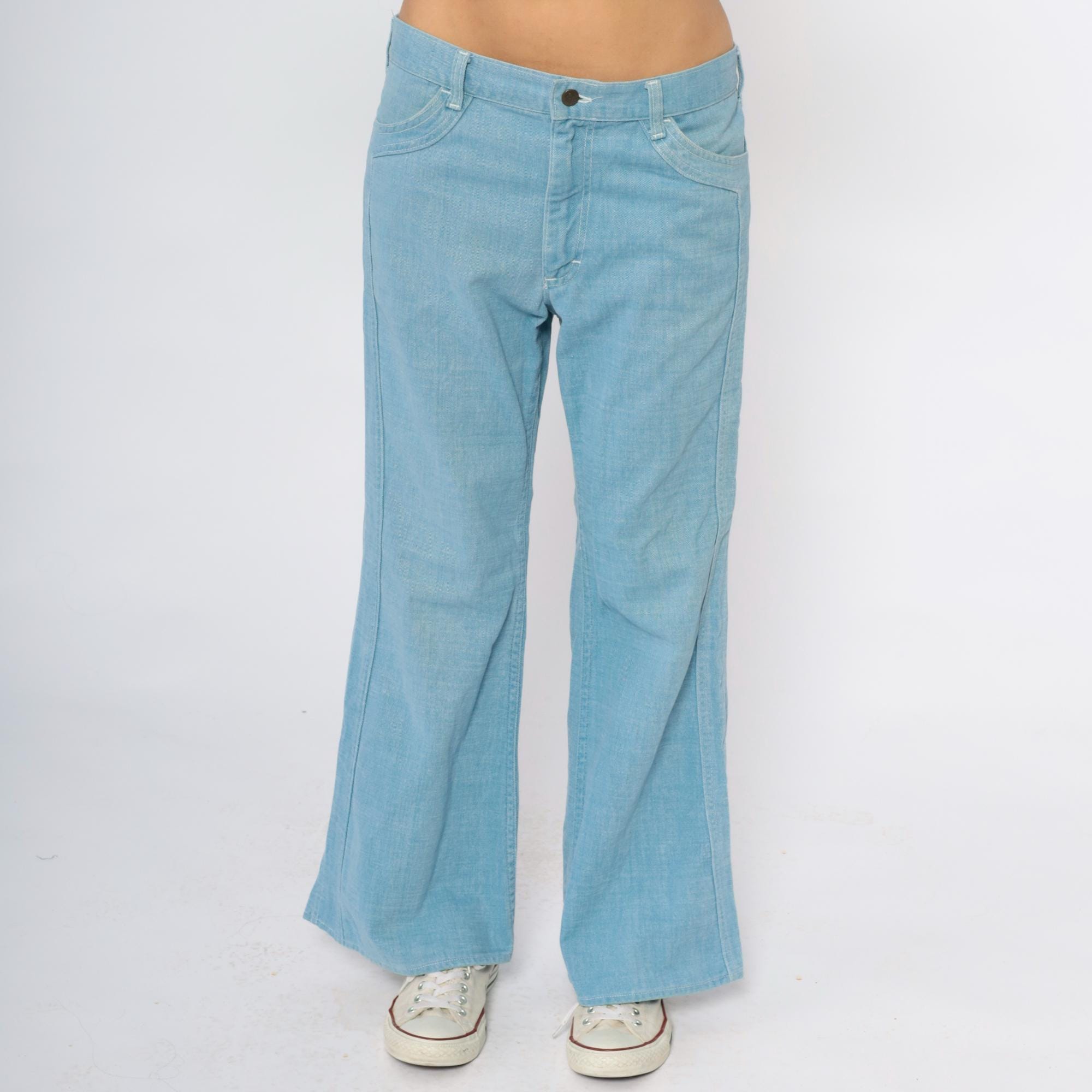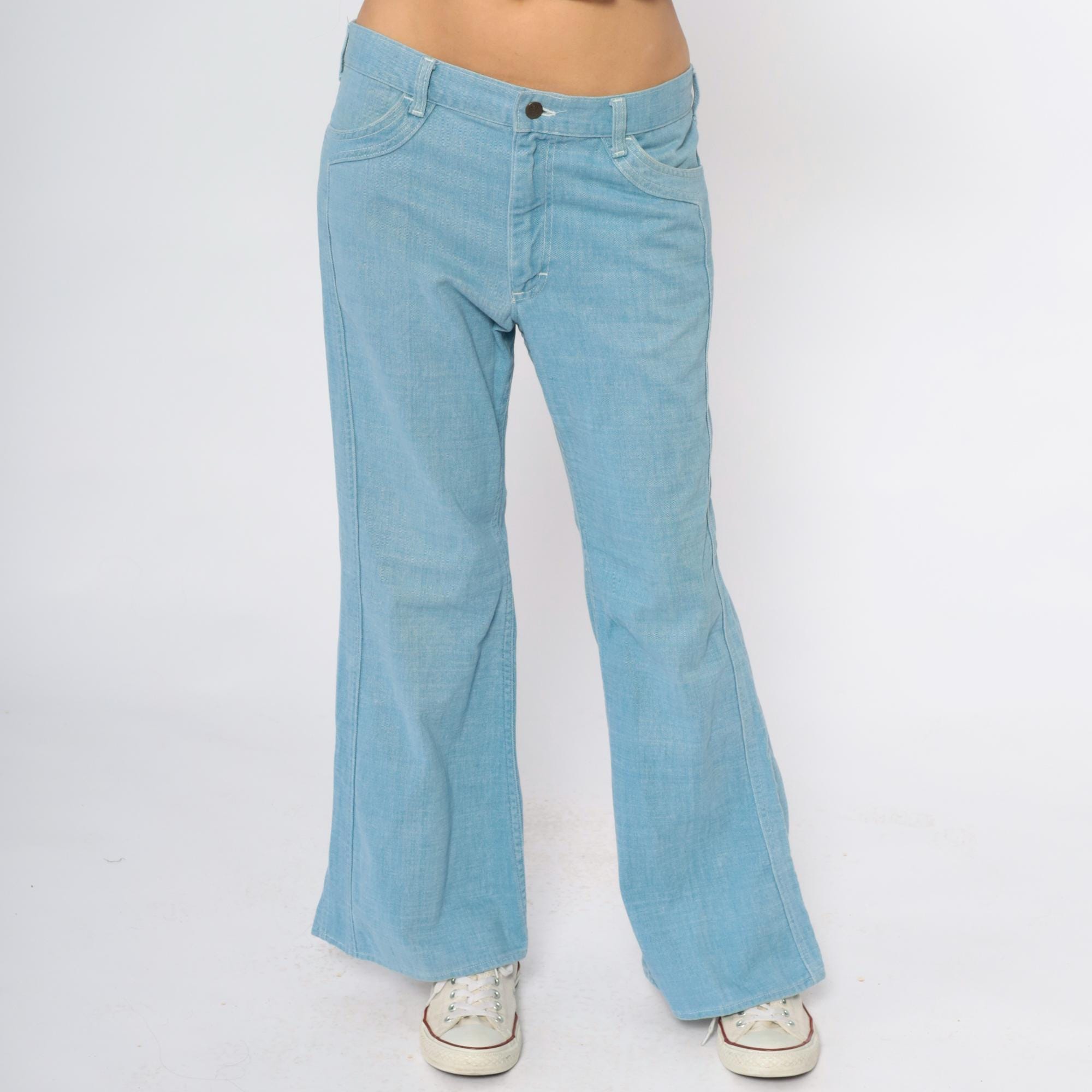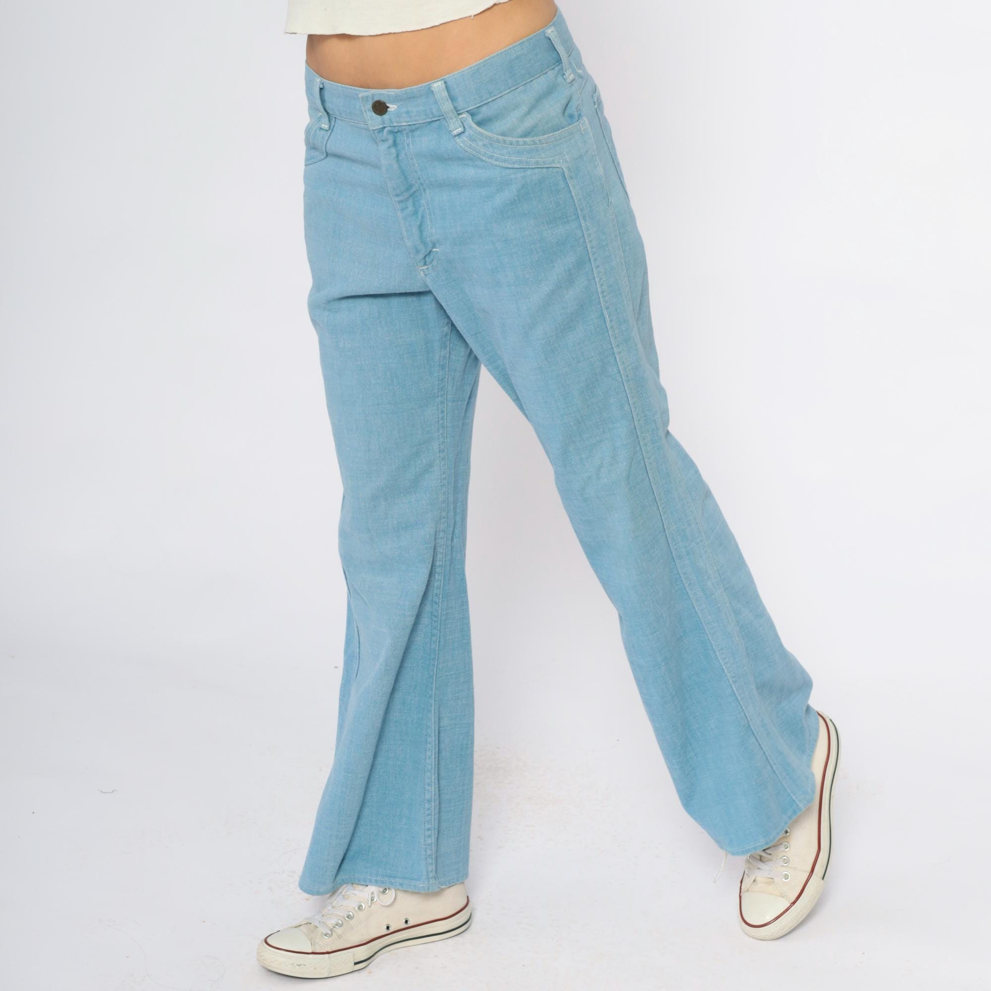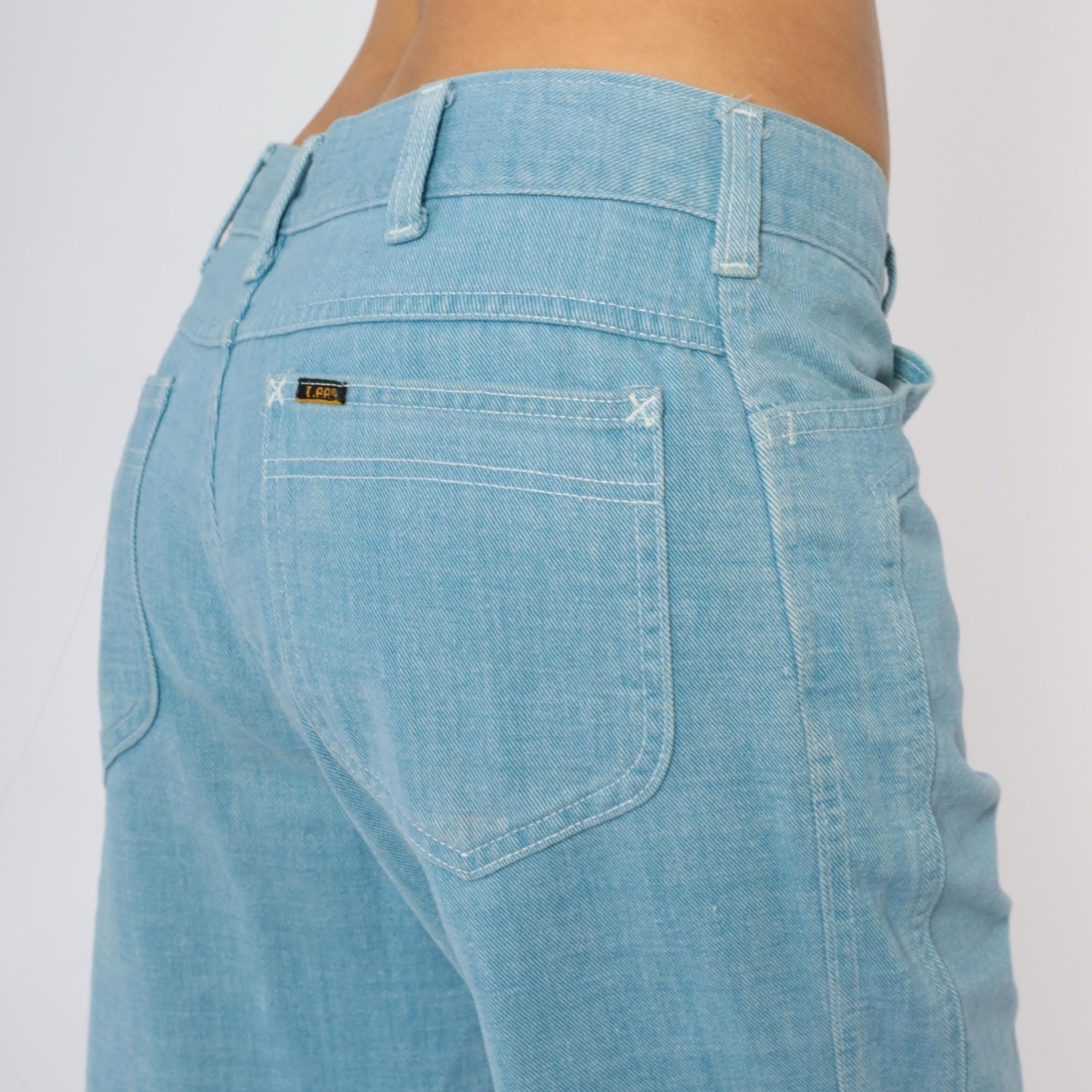 80s light blue flared jeans from Lee with wide leg silhouette and button fly front closure. Classic five-pocket styling with Lee brand tab on back right pocket. Pale wash denim throughout.
