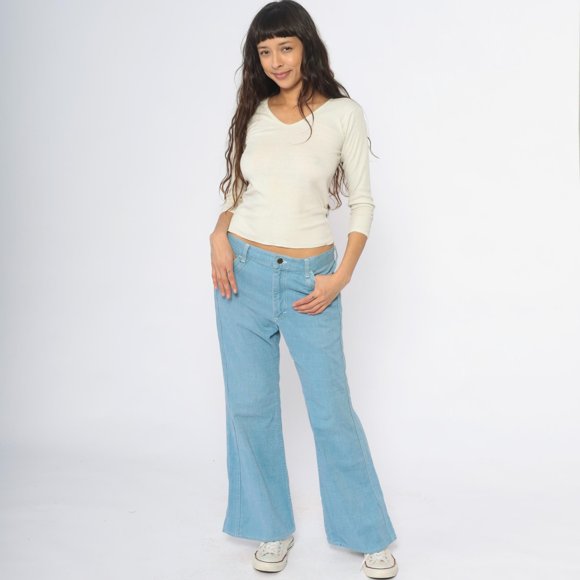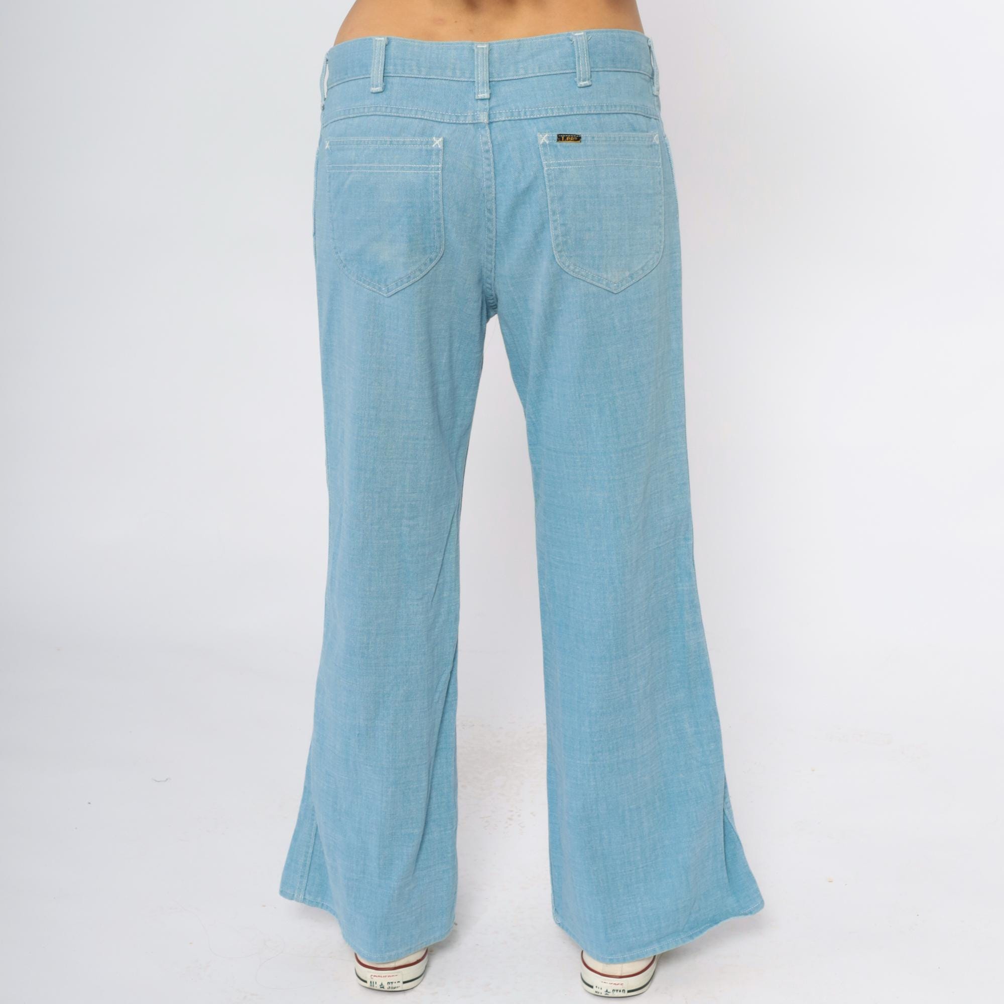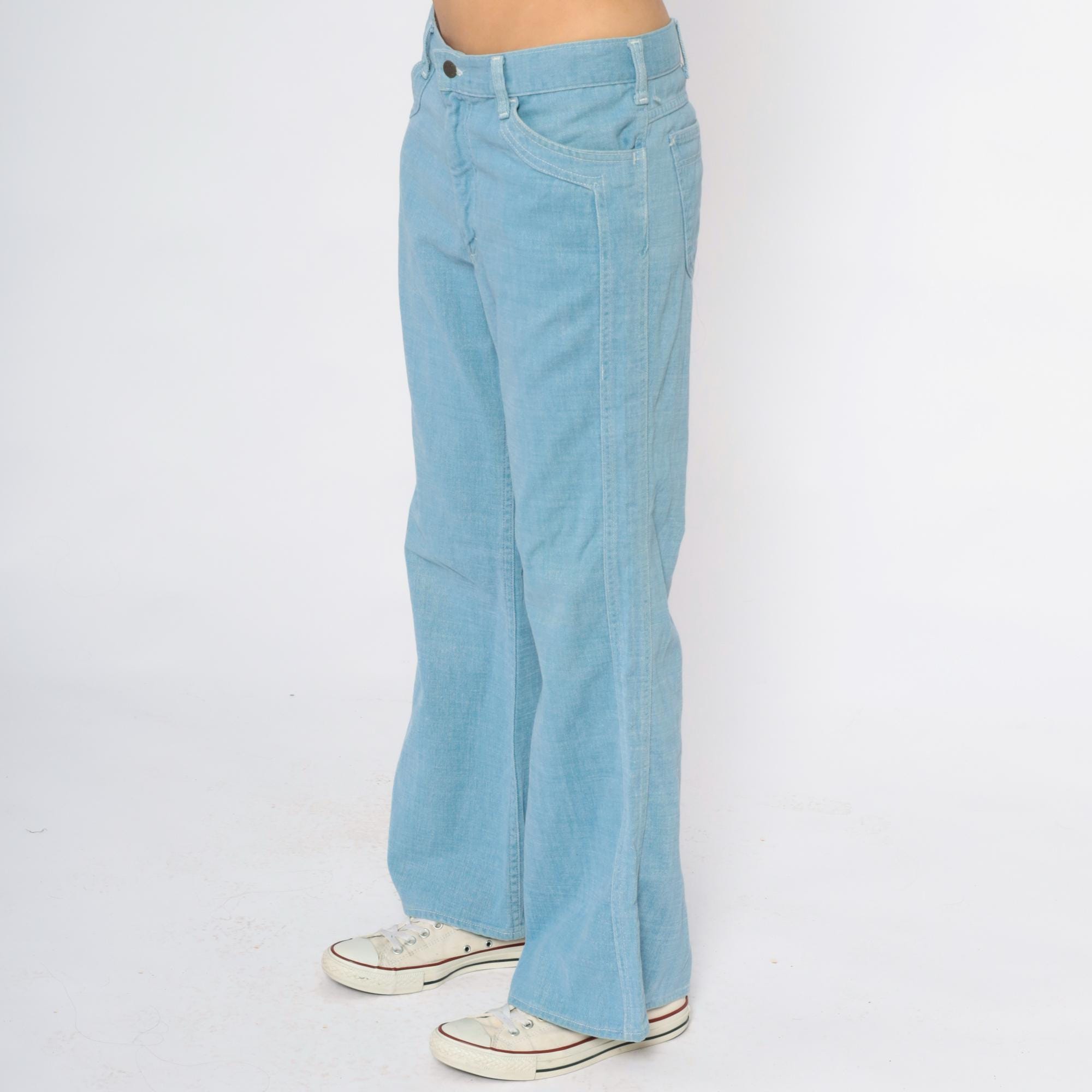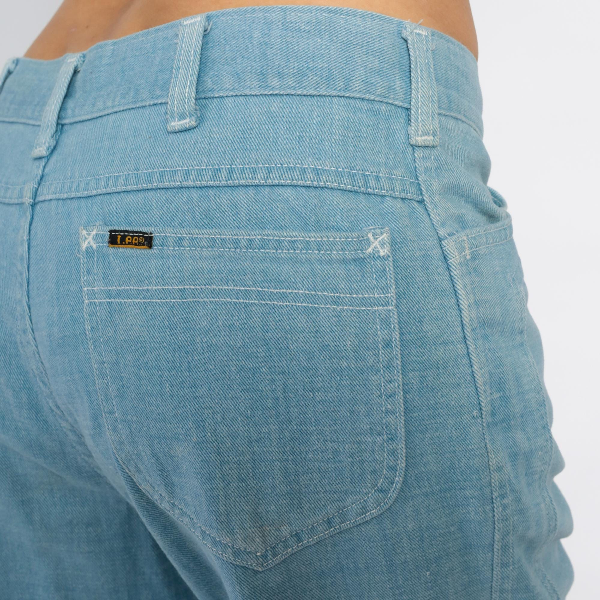80s light blue flared jeans from Lee with wide leg silhouette and button fly front closure. Classic five-pocket styling with Lee brand tab on back right pocket. Pale wash denim throughout.