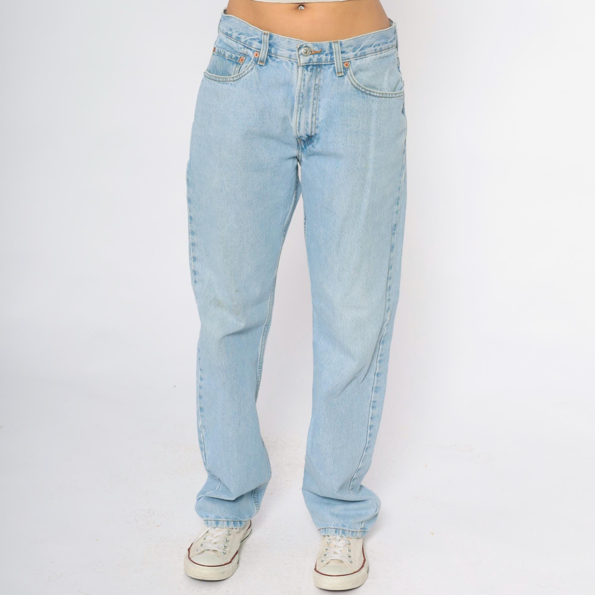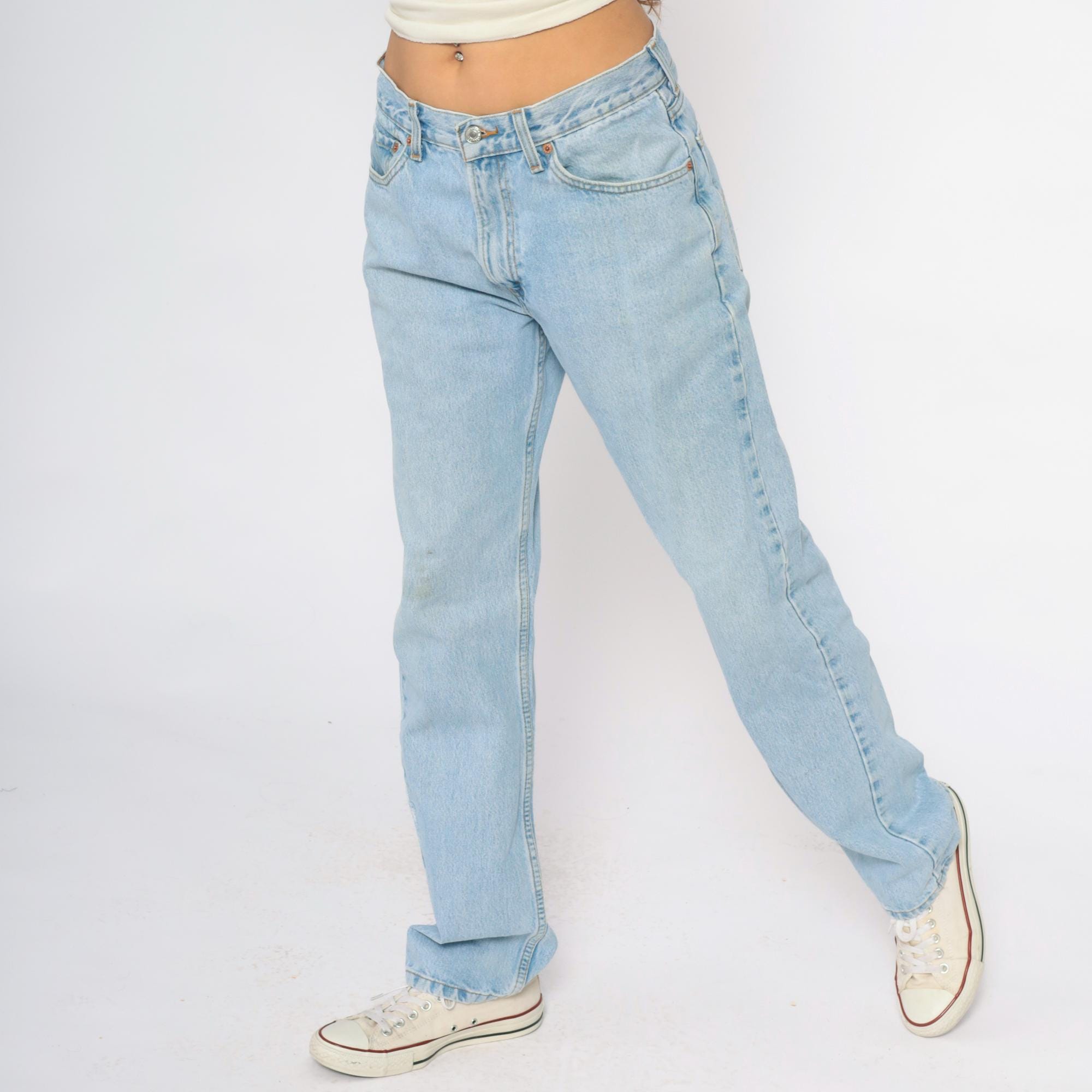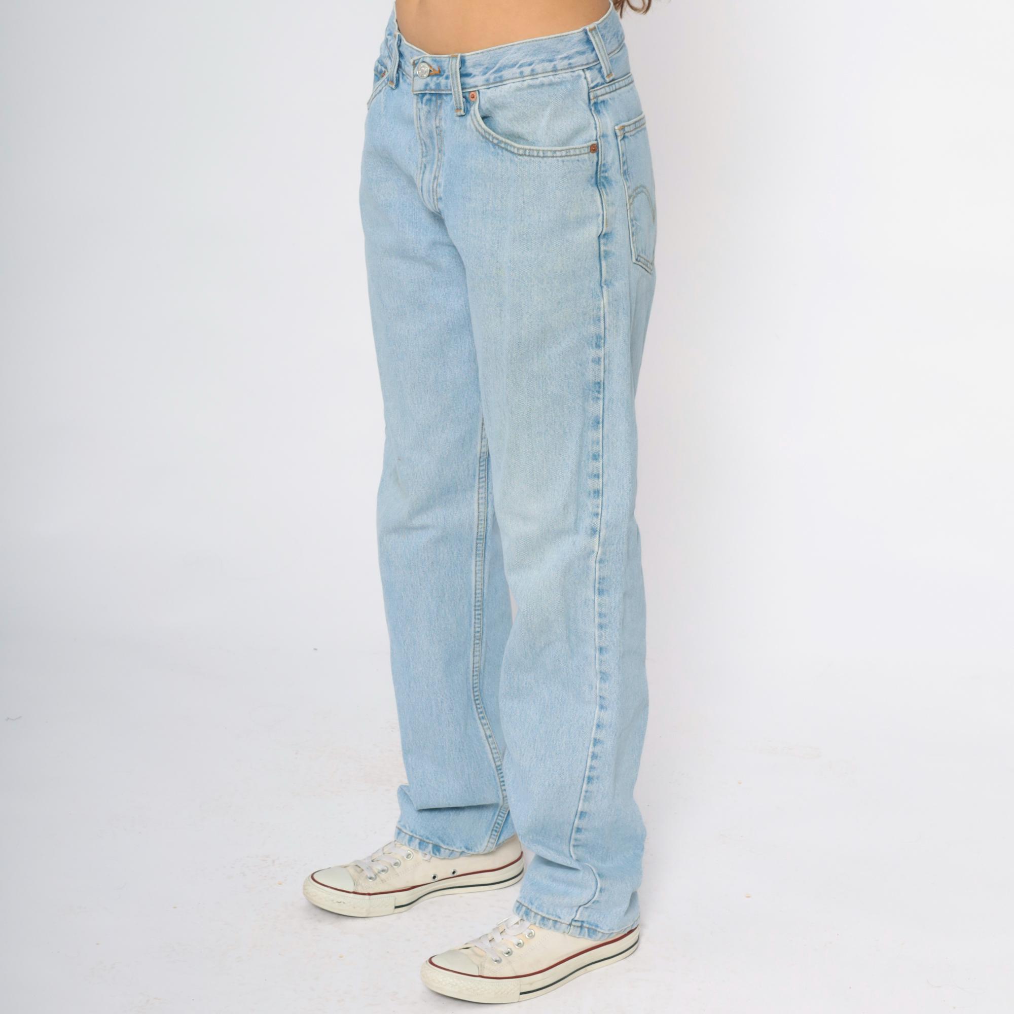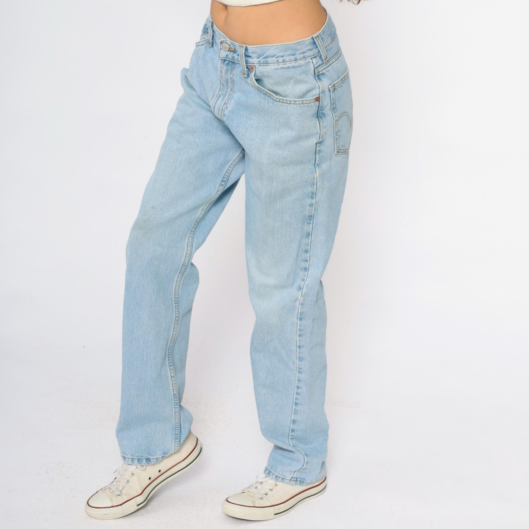 Y2k Levi's 505 jeans in light blue denim with straight leg cut and button fly closure. Five-pocket construction with signature arcuate stitching on back pockets and leather Levi's patch at waistband.