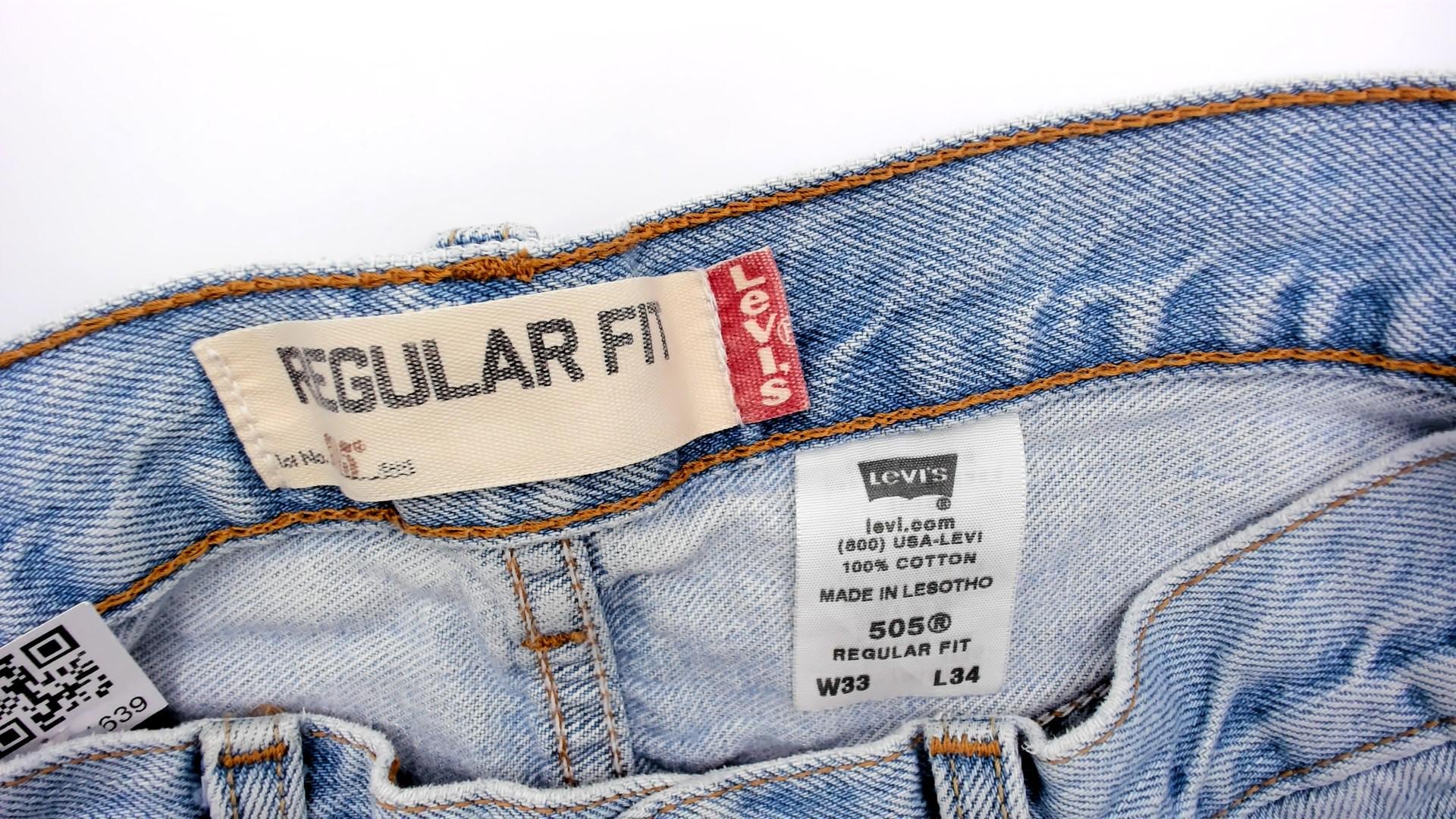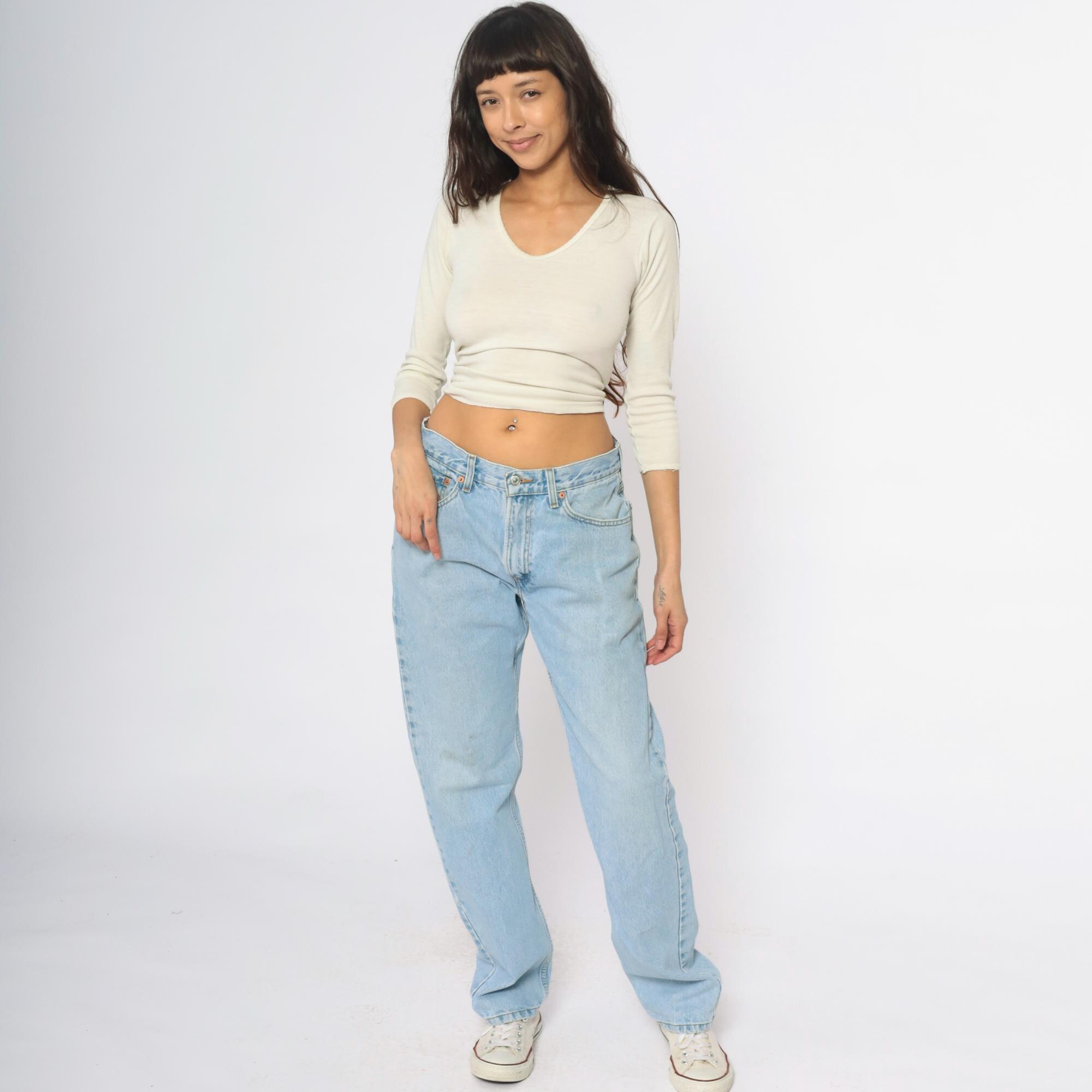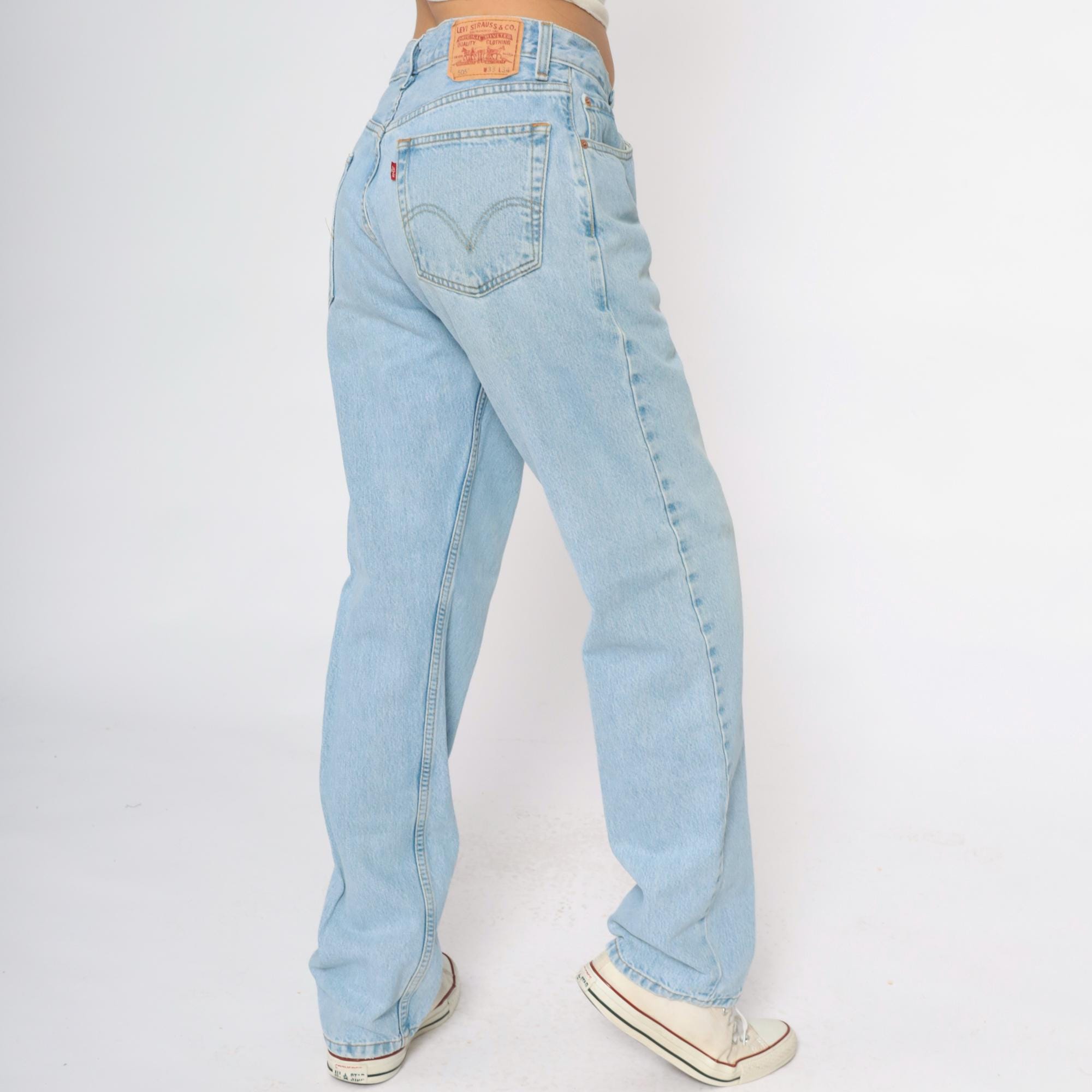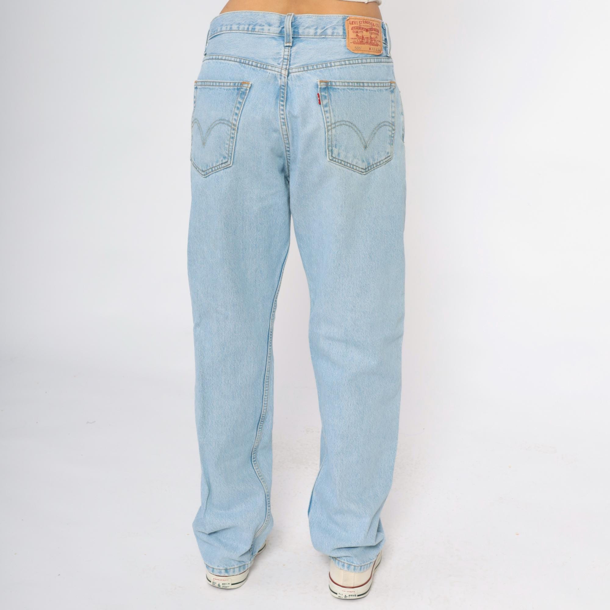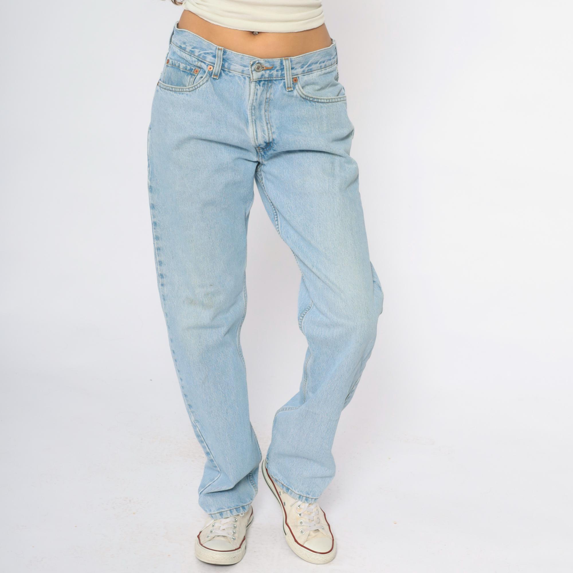 Y2k Levi's 505 jeans in light blue denim with straight leg cut and button fly closure. Five-pocket construction with signature arcuate stitching on back pockets and leather Levi's patch at waistband.