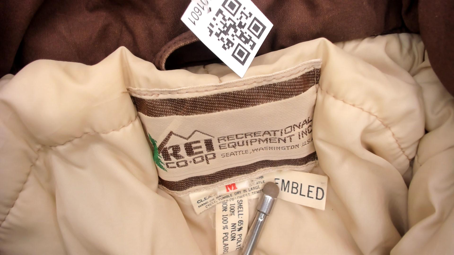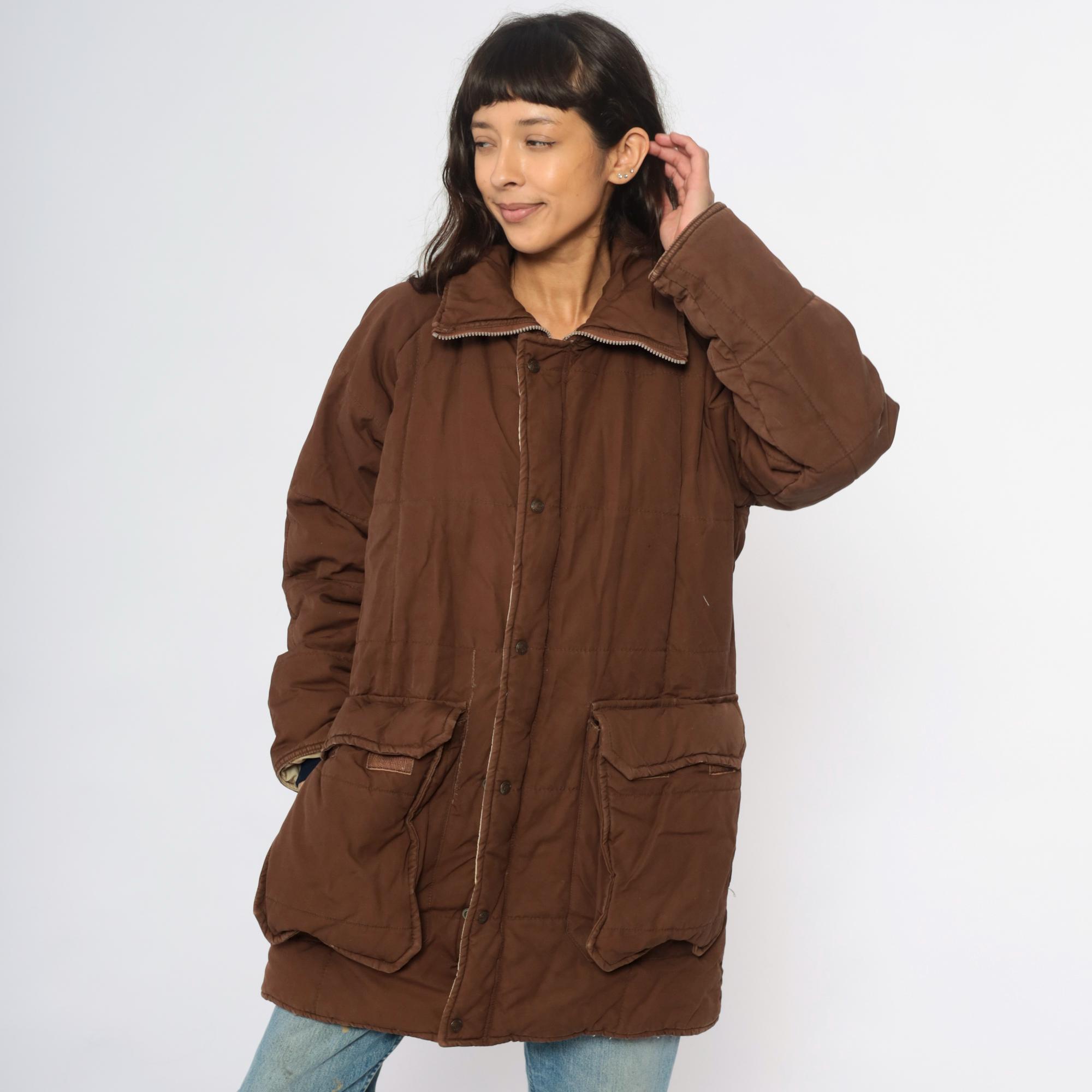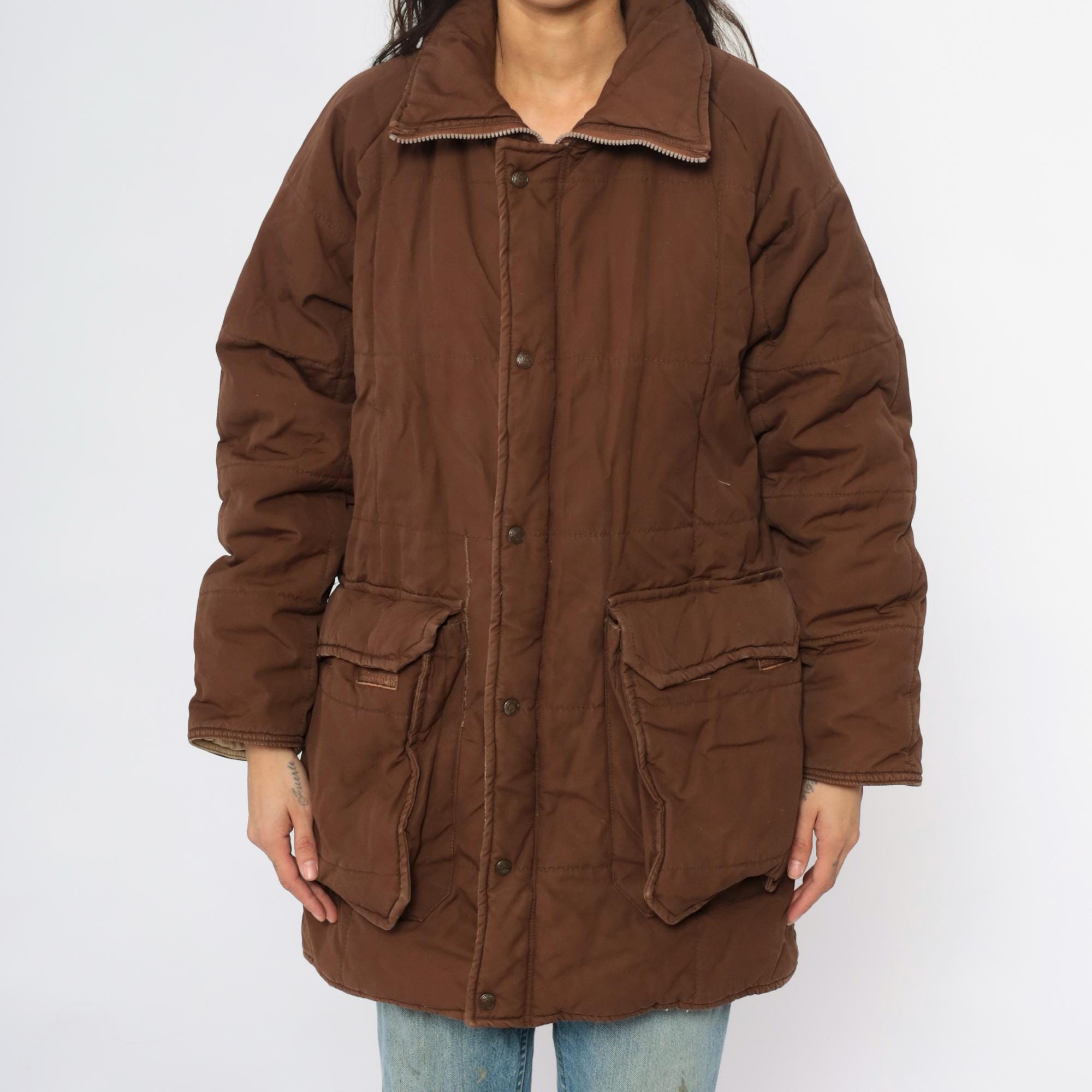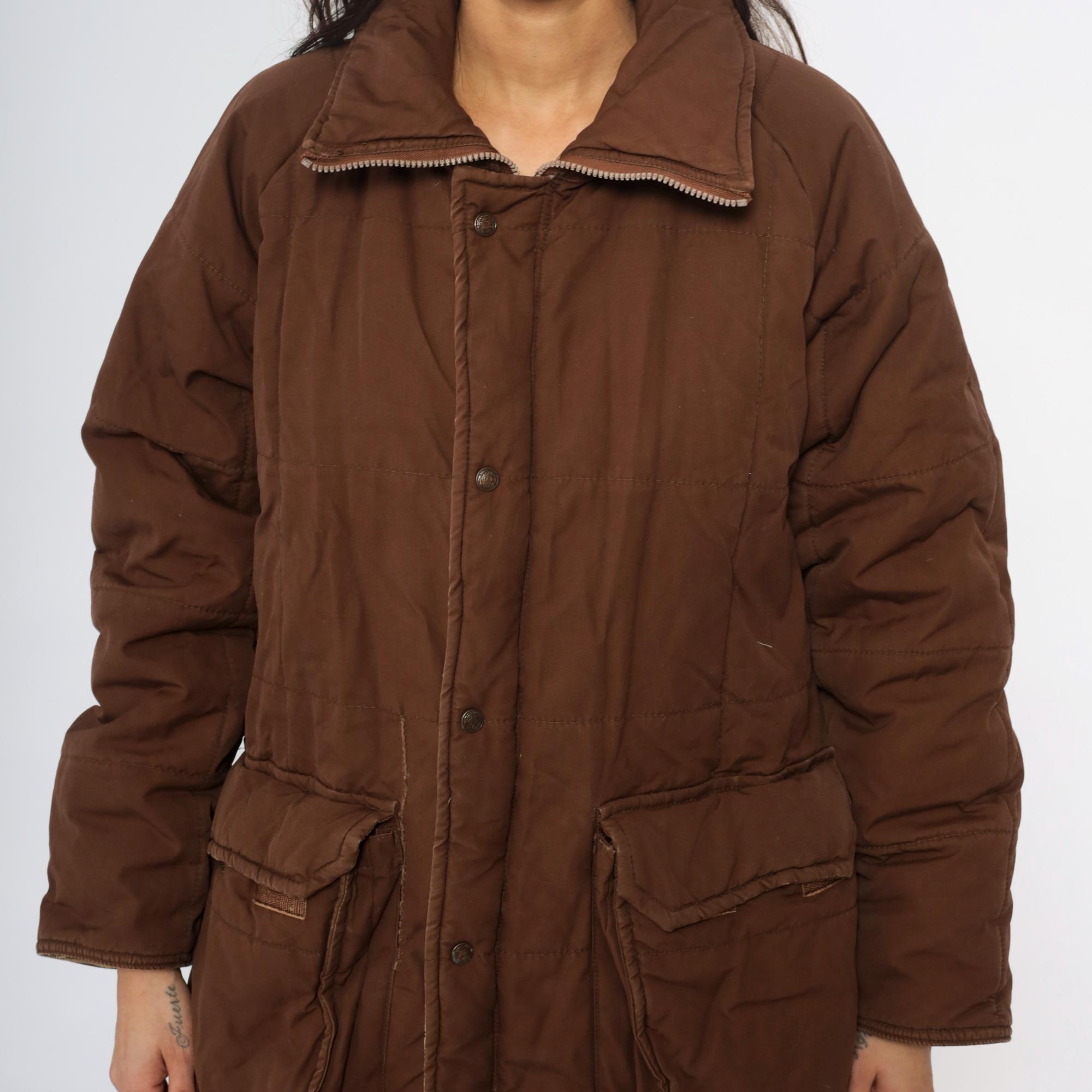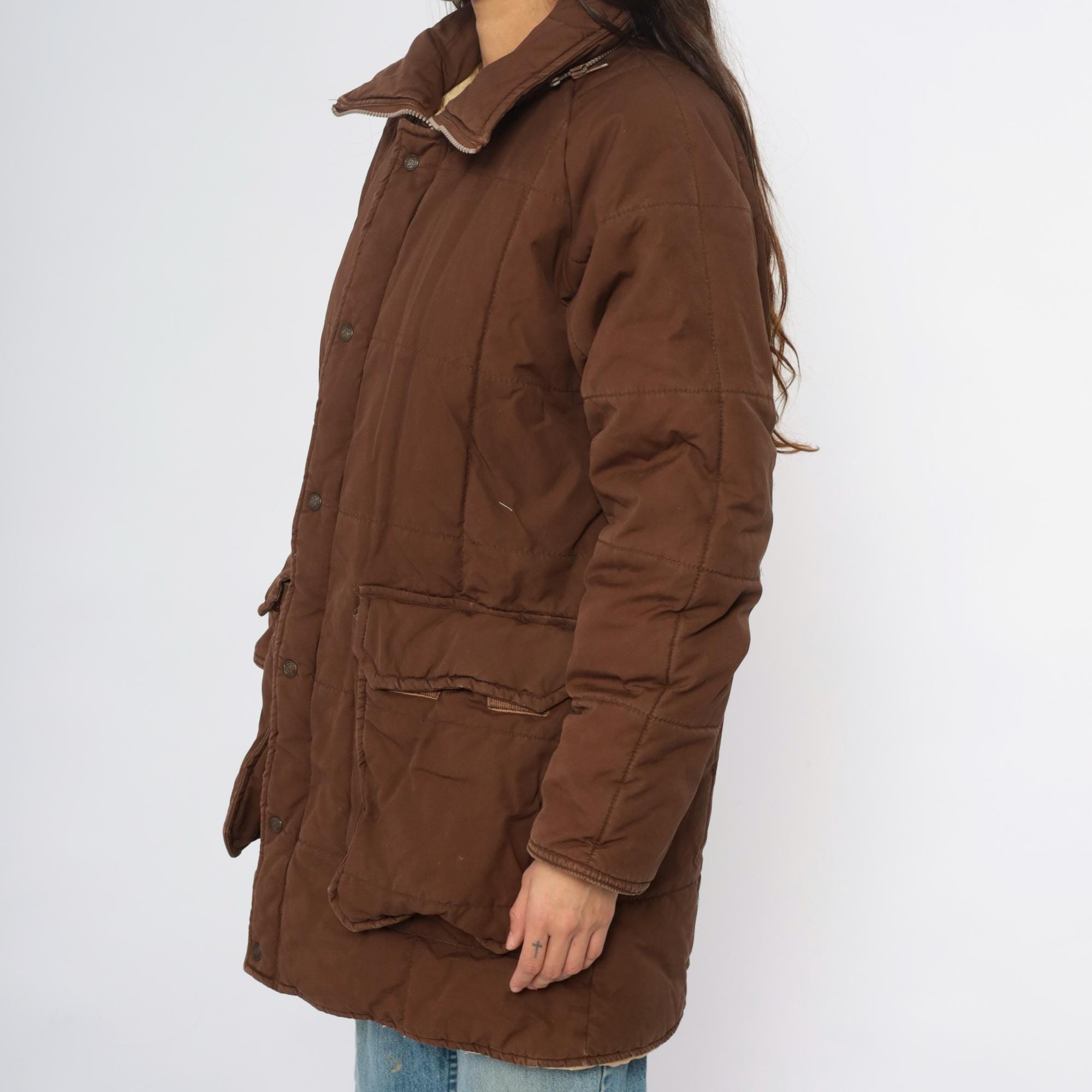 80s brown quilted jacket from REI with button front closure, two large patch pockets, and corduroy collar. Snug ribbed cuffs at wrists, cream quilted lining visible at interior.