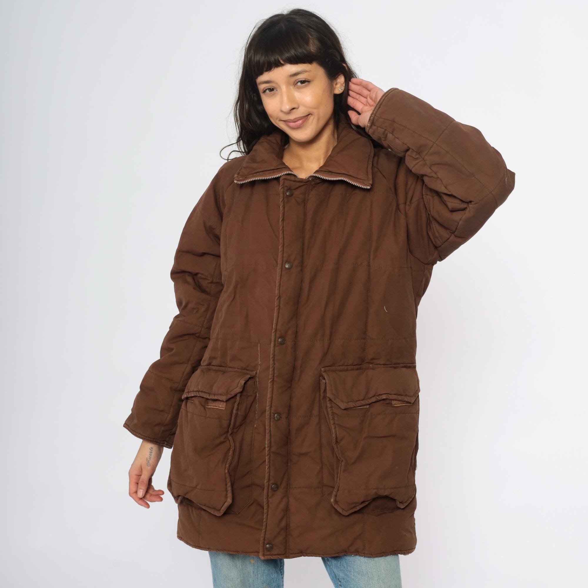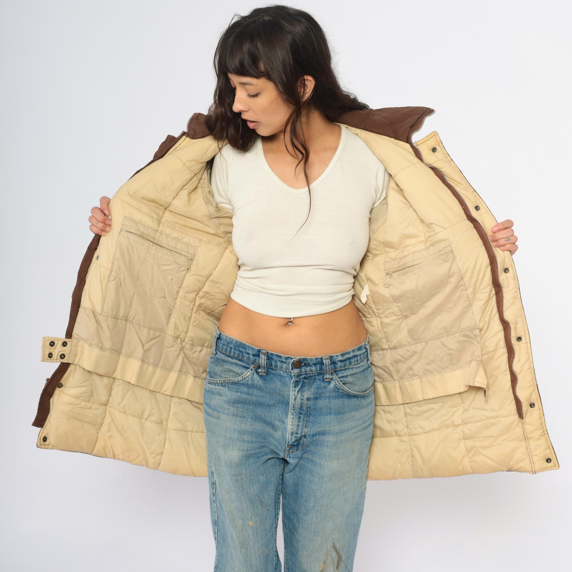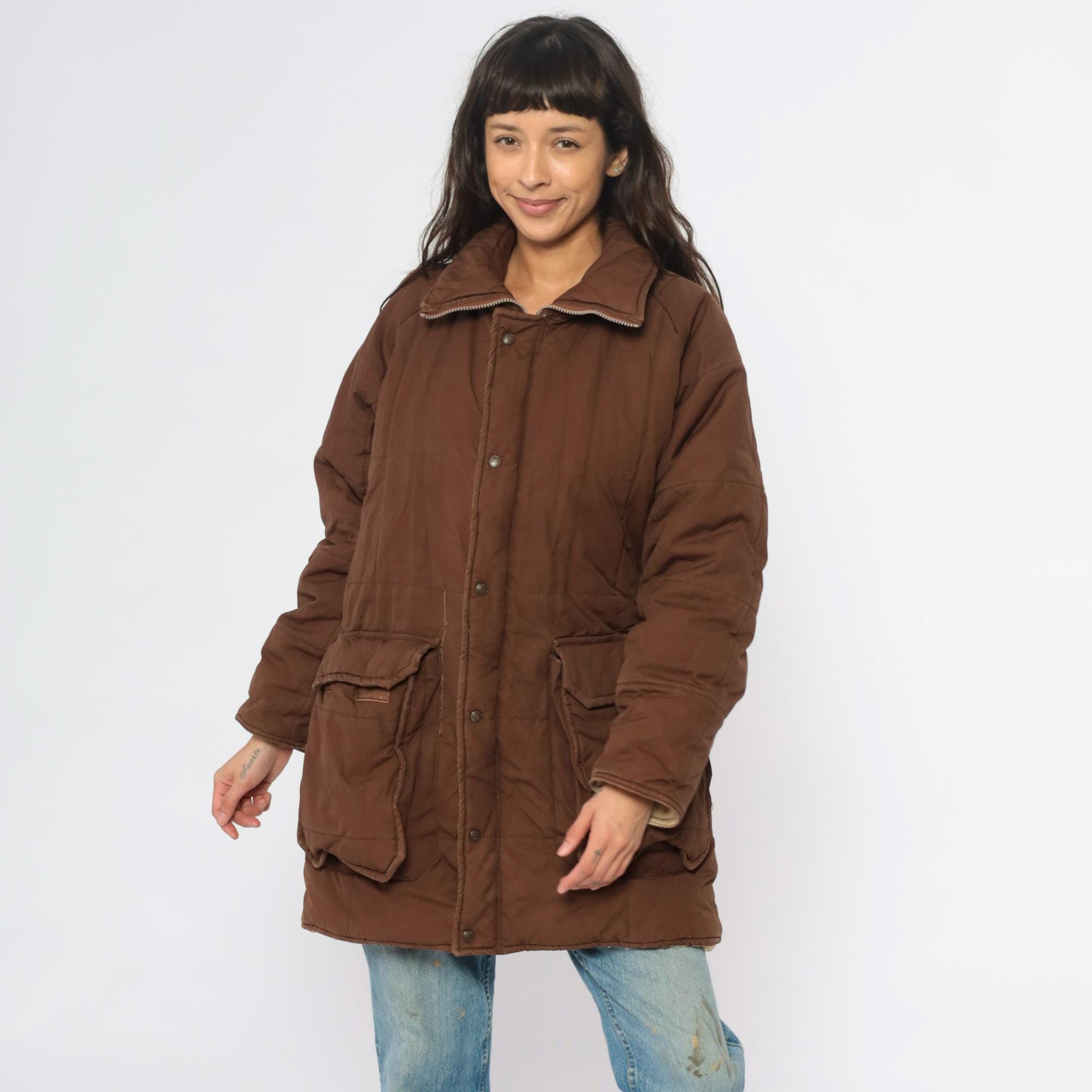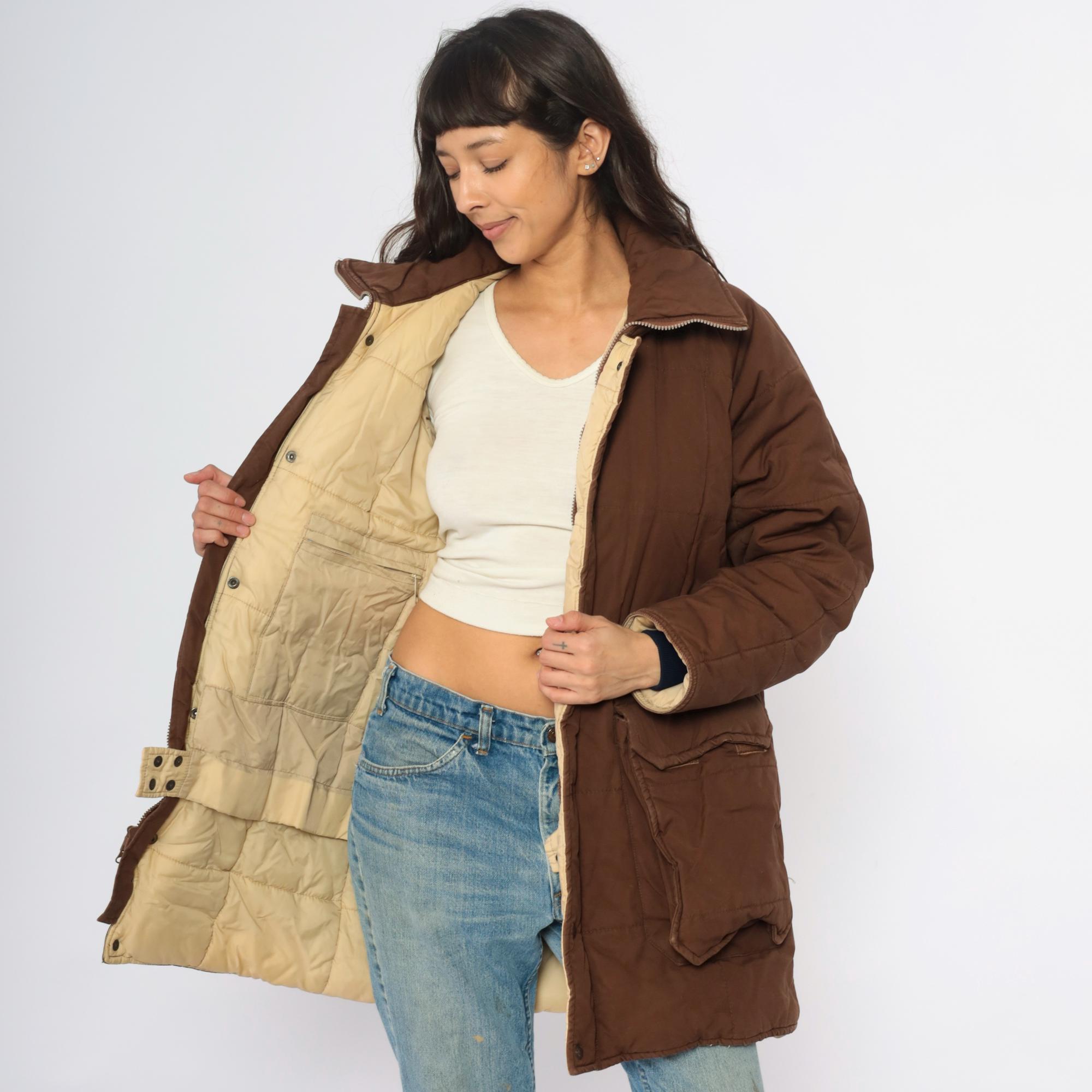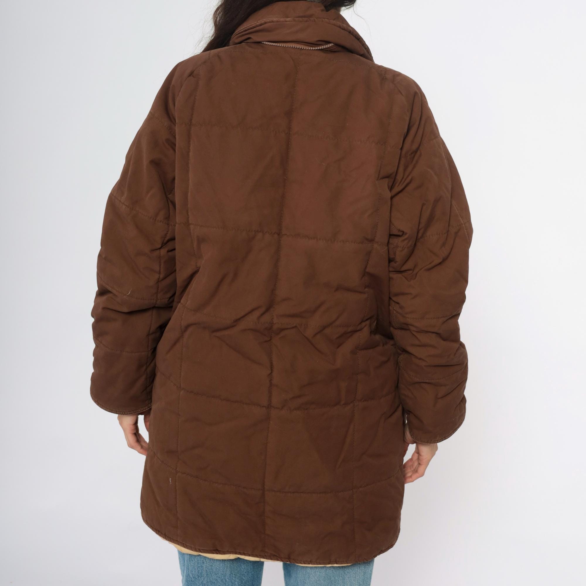 80s brown quilted jacket from REI with button front closure, two large patch pockets, and corduroy collar. Snug ribbed cuffs at wrists, cream quilted lining visible at interior.