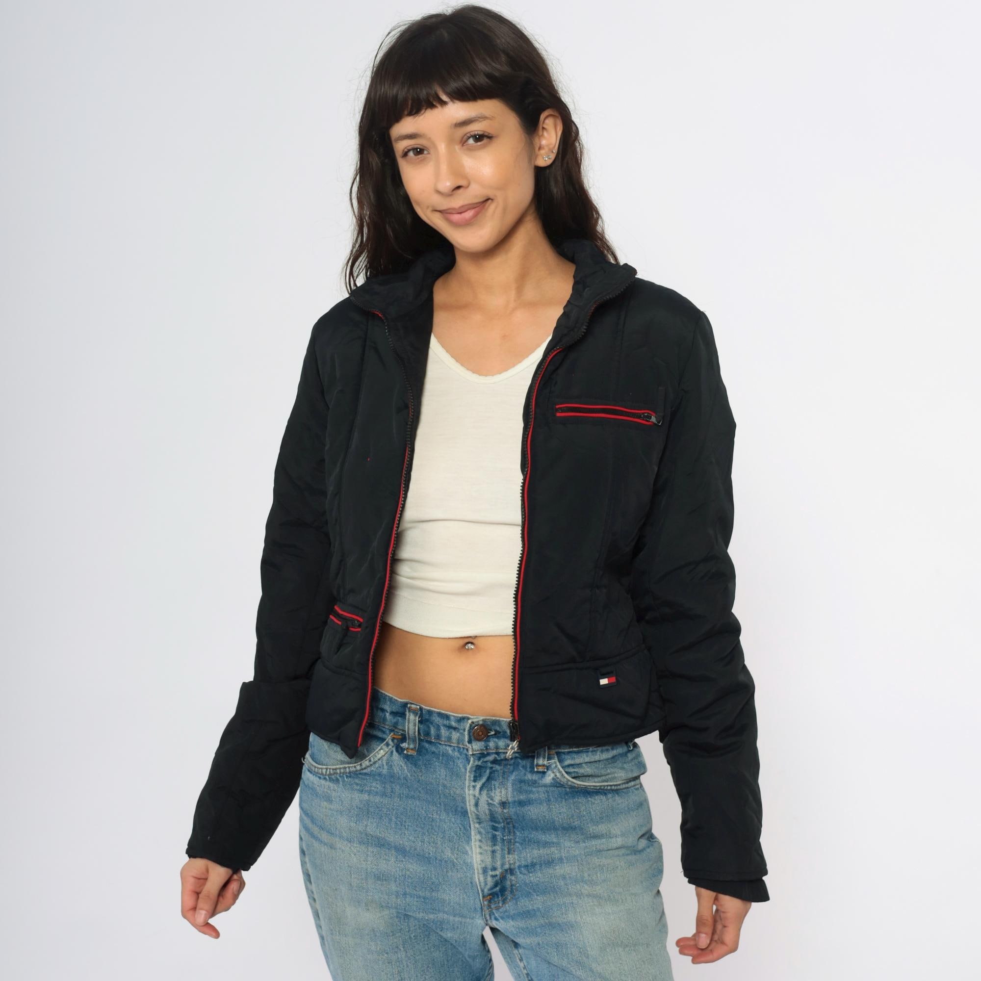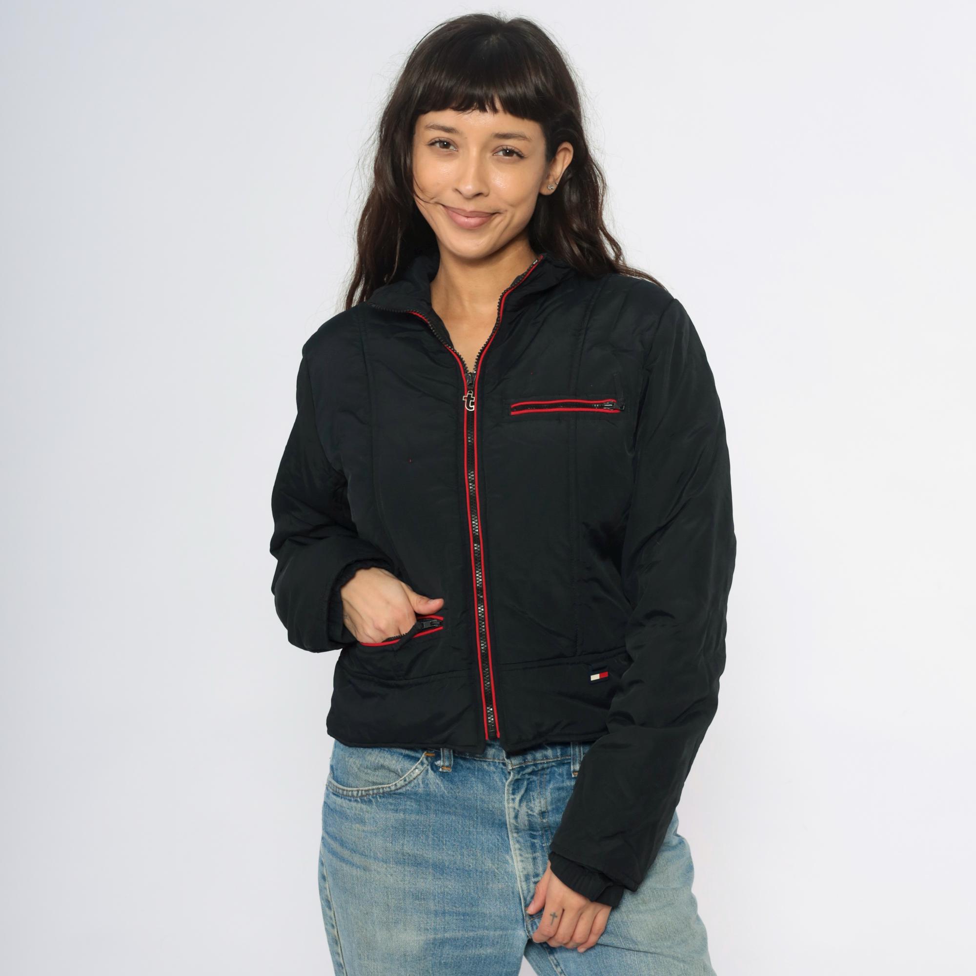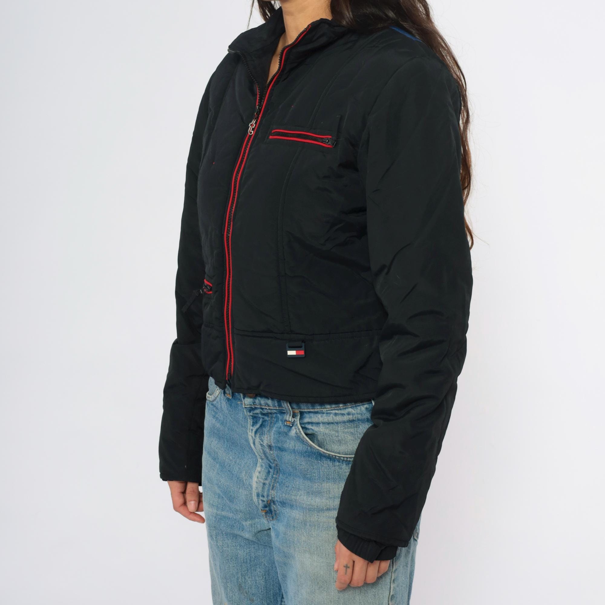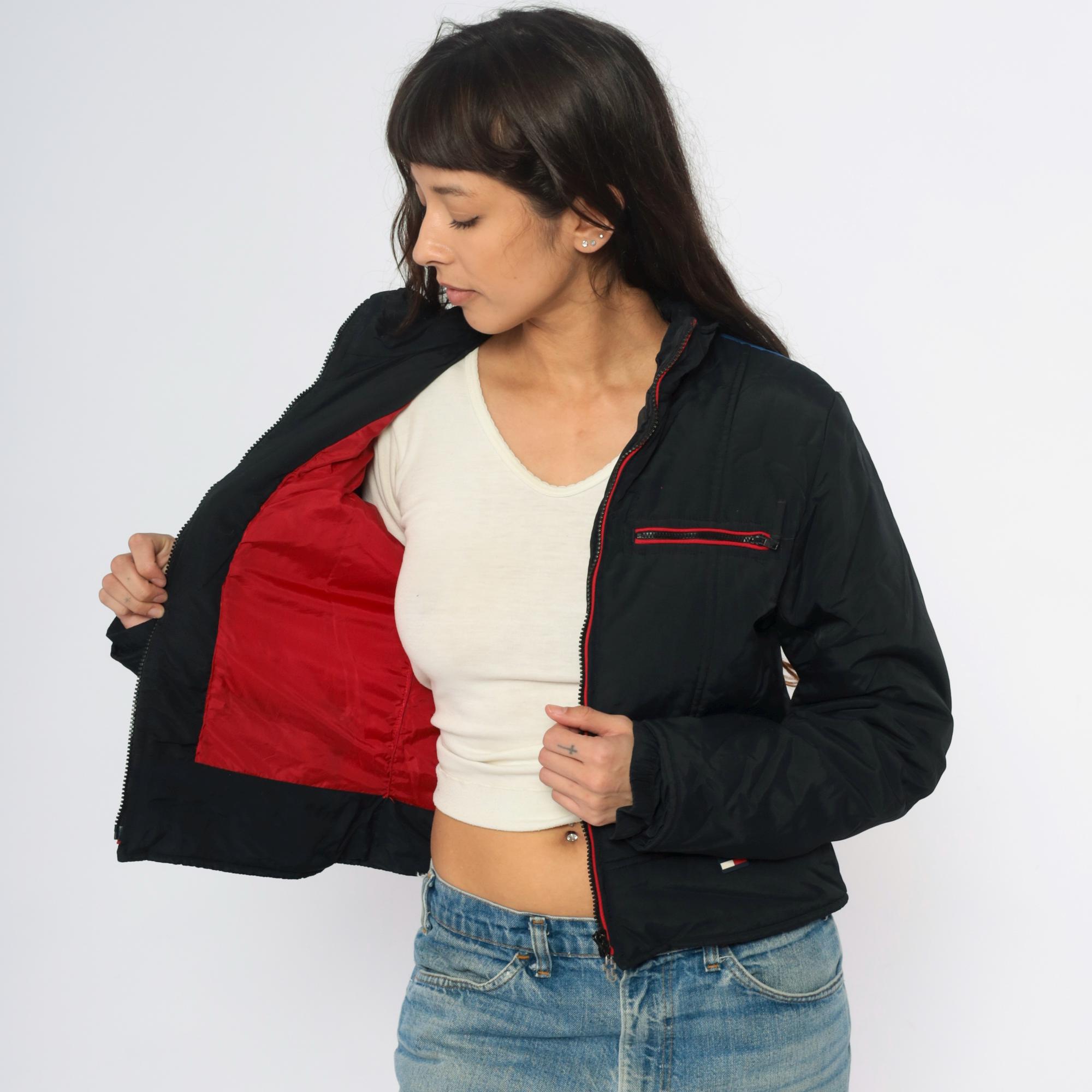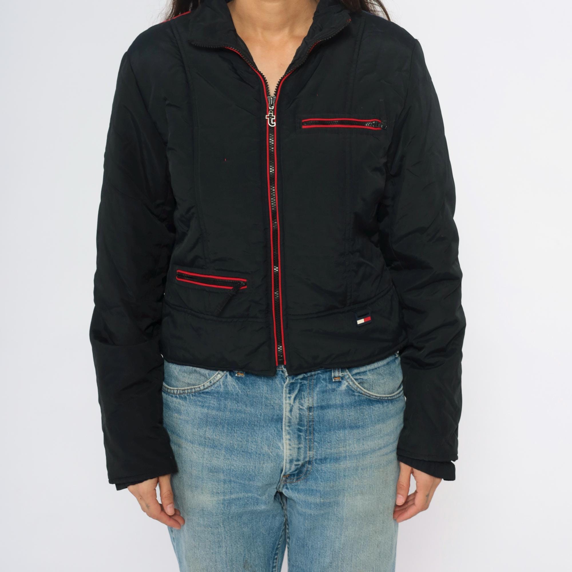 Y2K black jacket from Tommy Jeans with vertical rainbow stripes down the back in blue, green, yellow, orange, and red. Red zipper trim along front closure, chest pocket, and lower pockets, with red interior lining visible at collar. Cropped length with ribbed hem and cuffs.