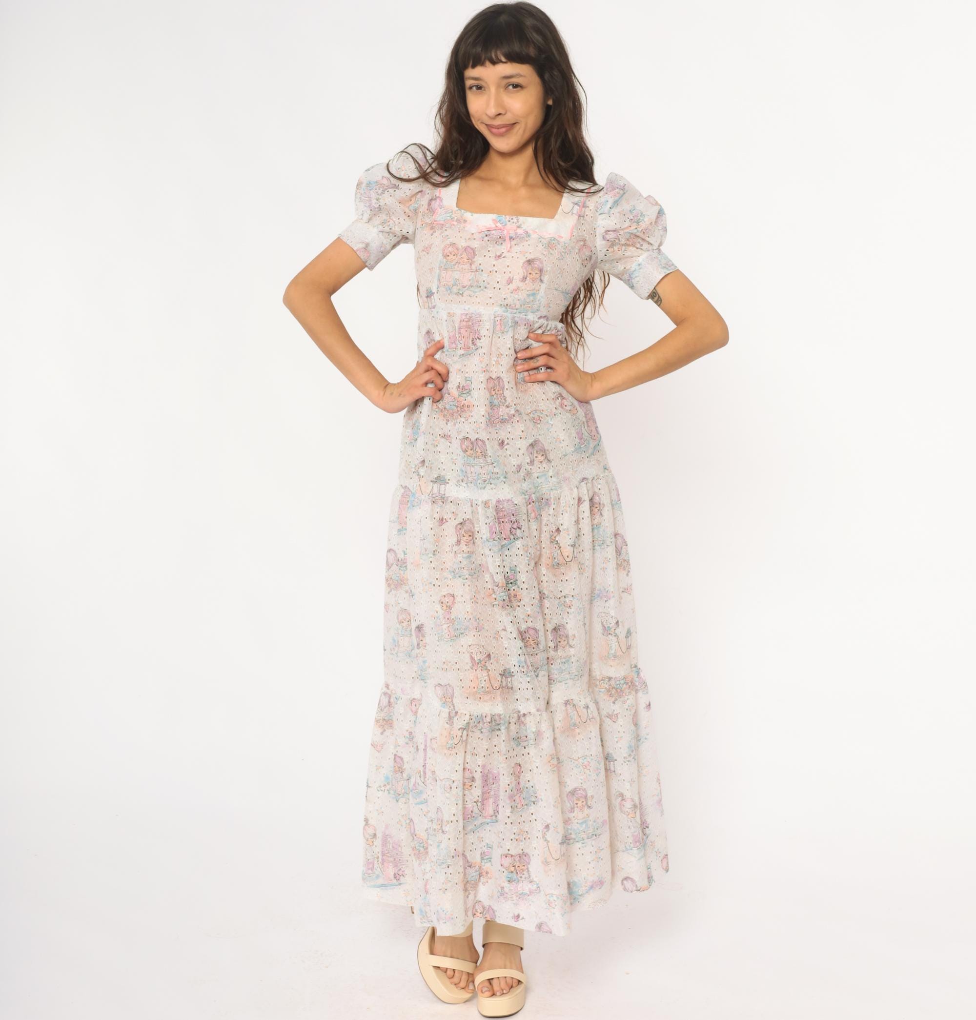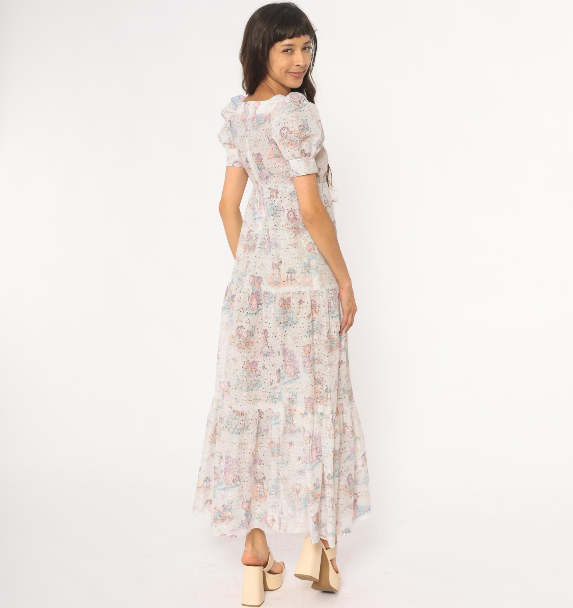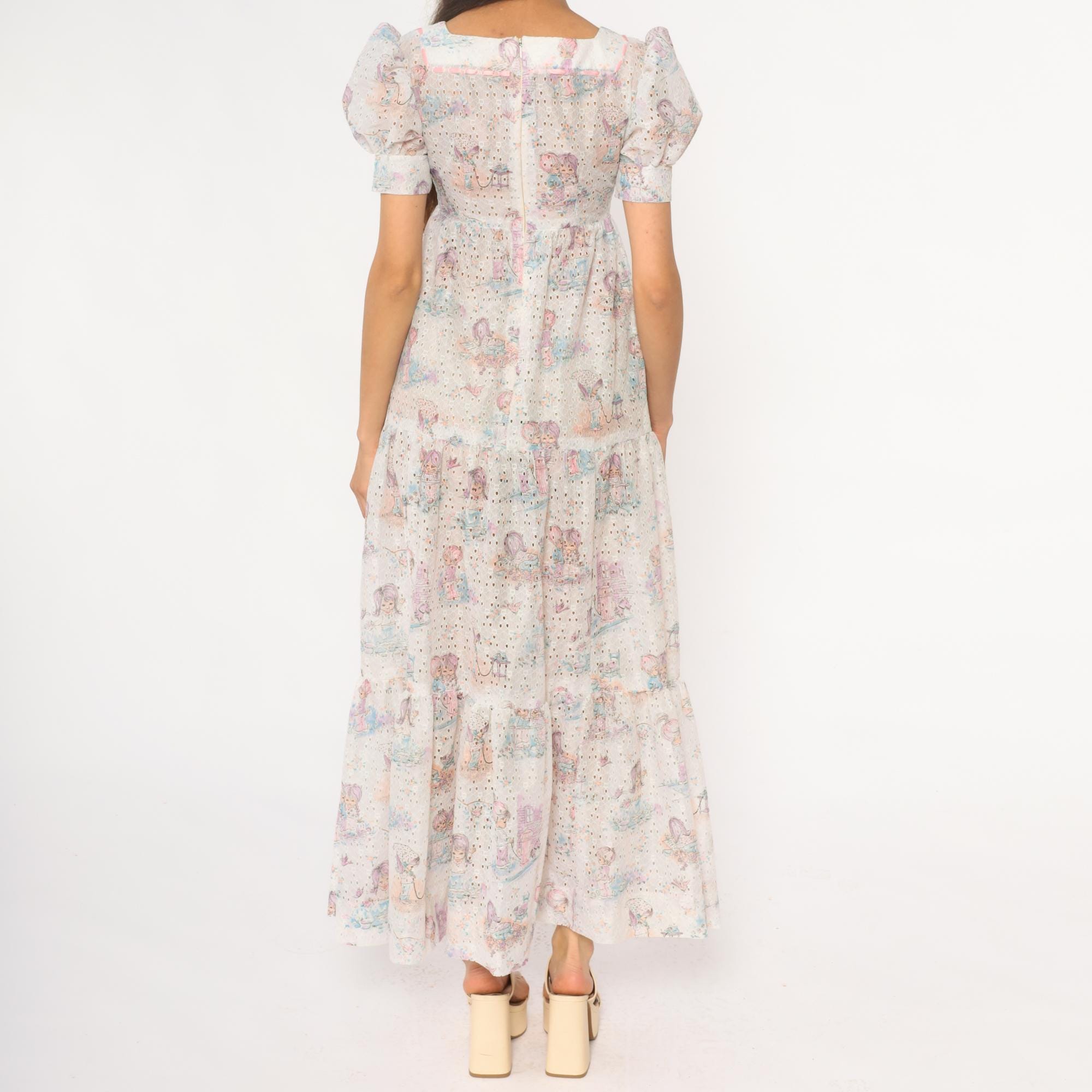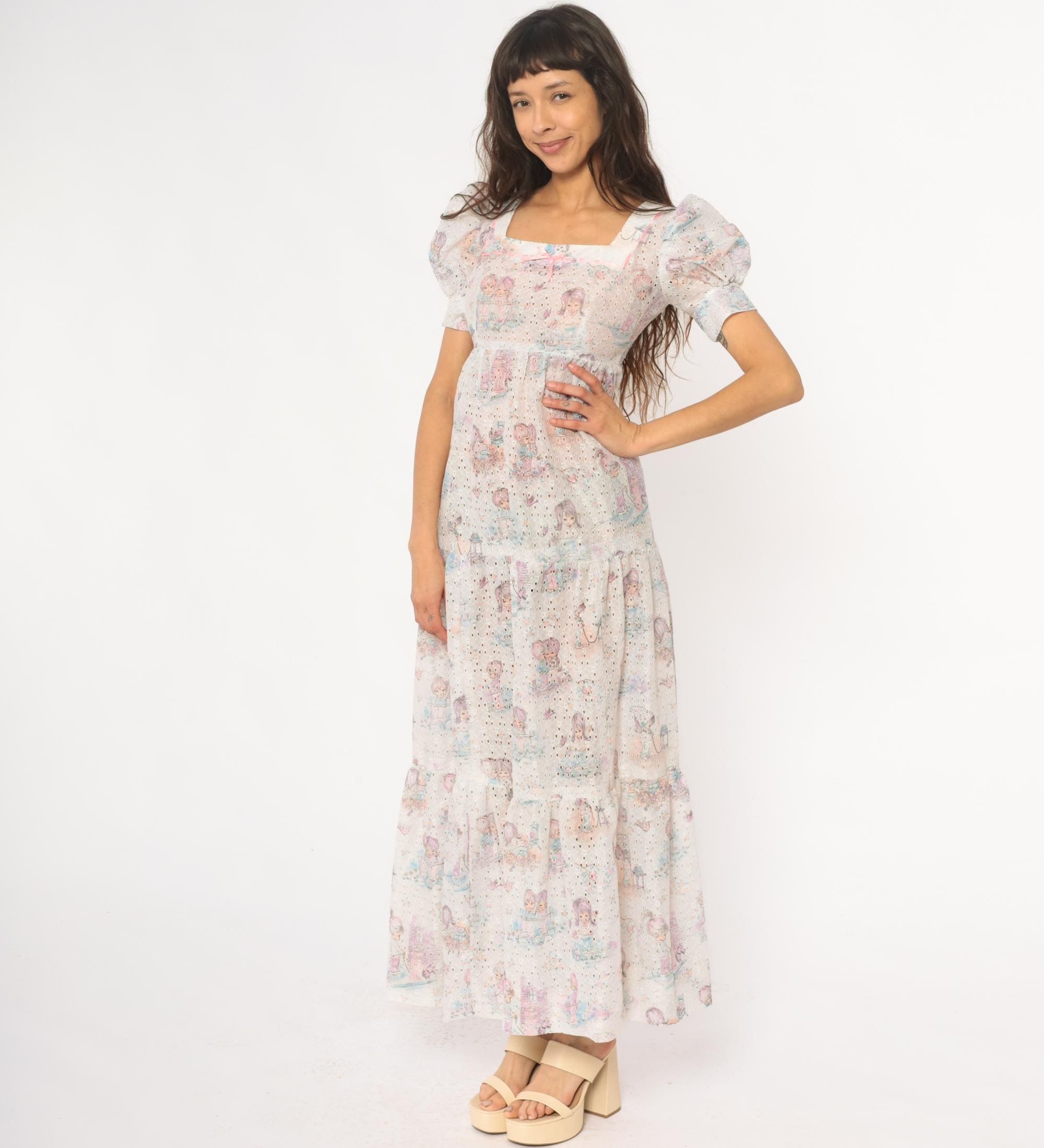 70s white eyelet maxi dress with pastel kawaii children print throughout the fabric, all-over eyelet perforations, and pink satin ribbon bow at the square neckline. Puffed short sleeves with gathered cuffs, empire waist with three-tiered gathered skirt, ruffled hem. Characters in soft pink, purple, and blue tones scattered across the print.