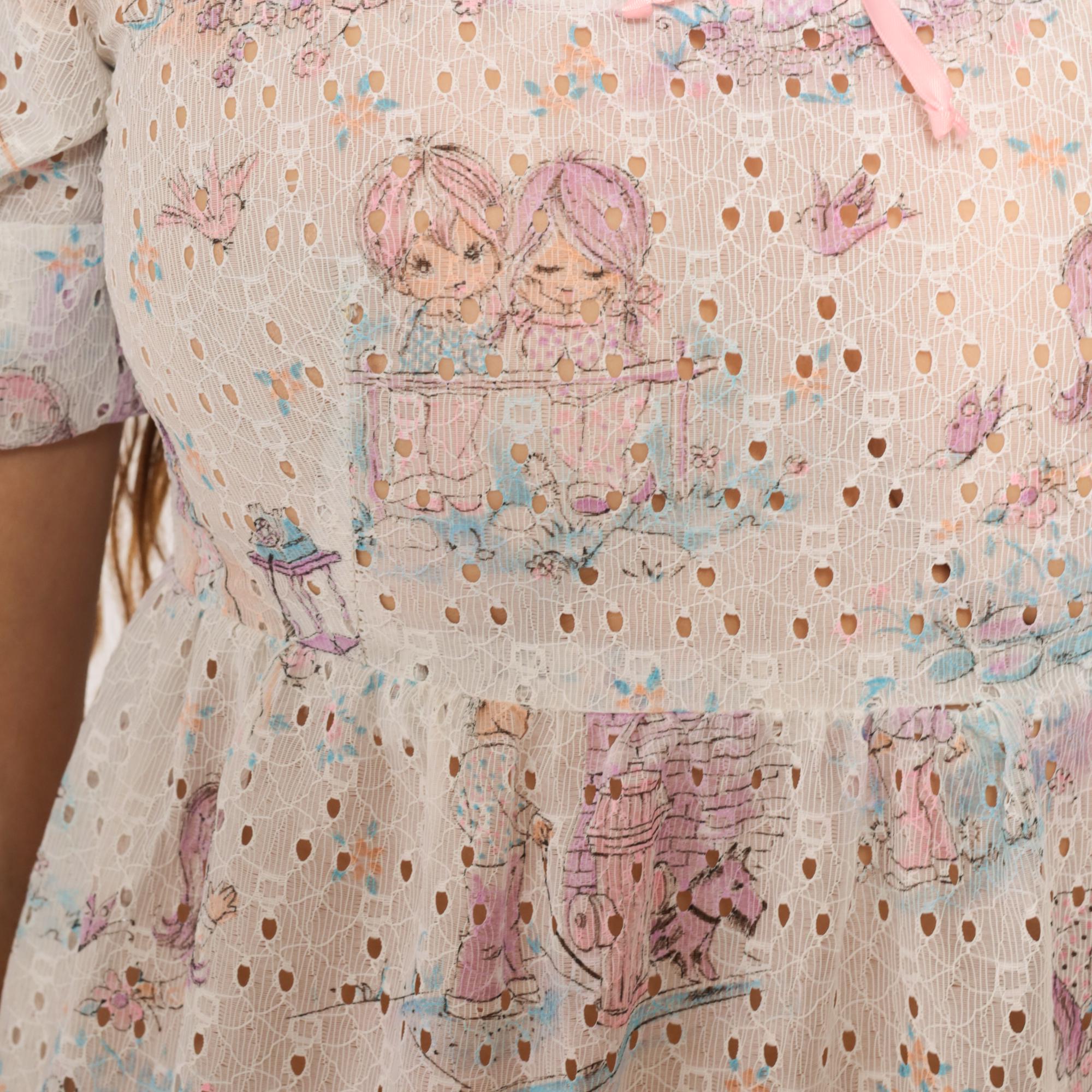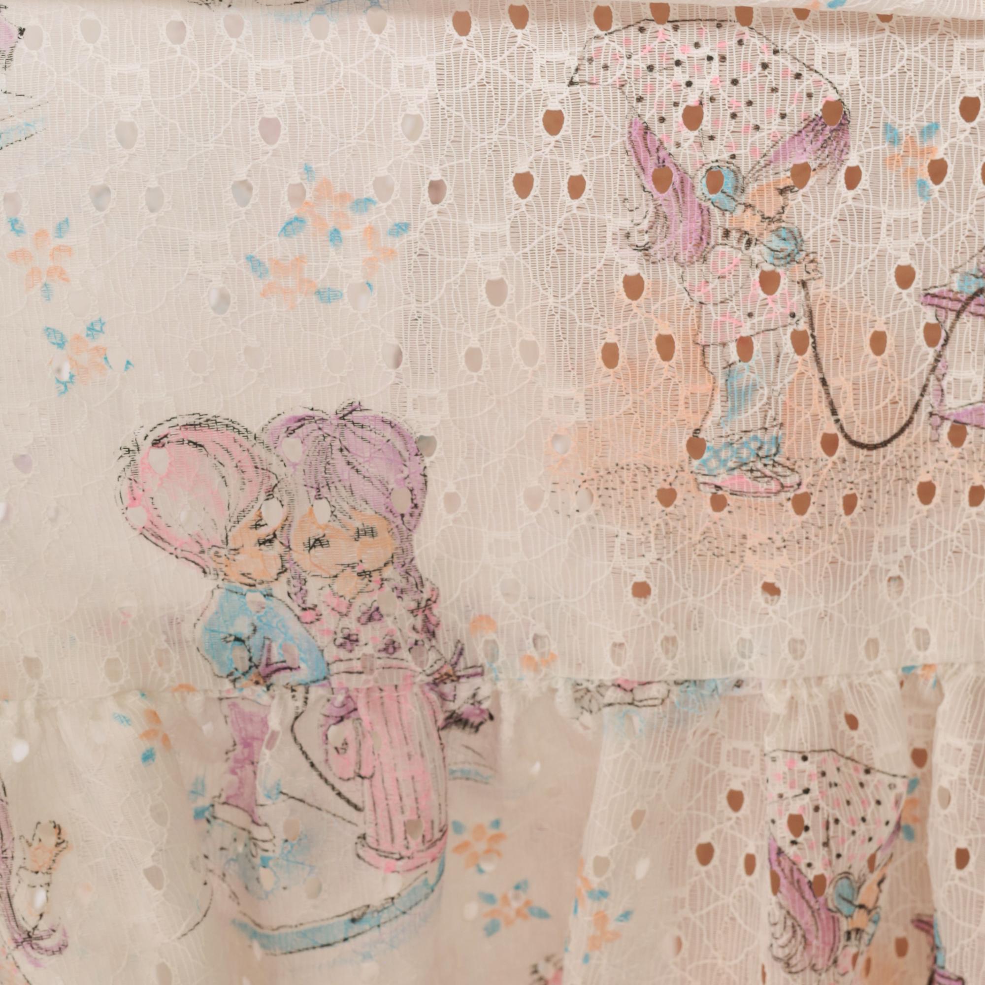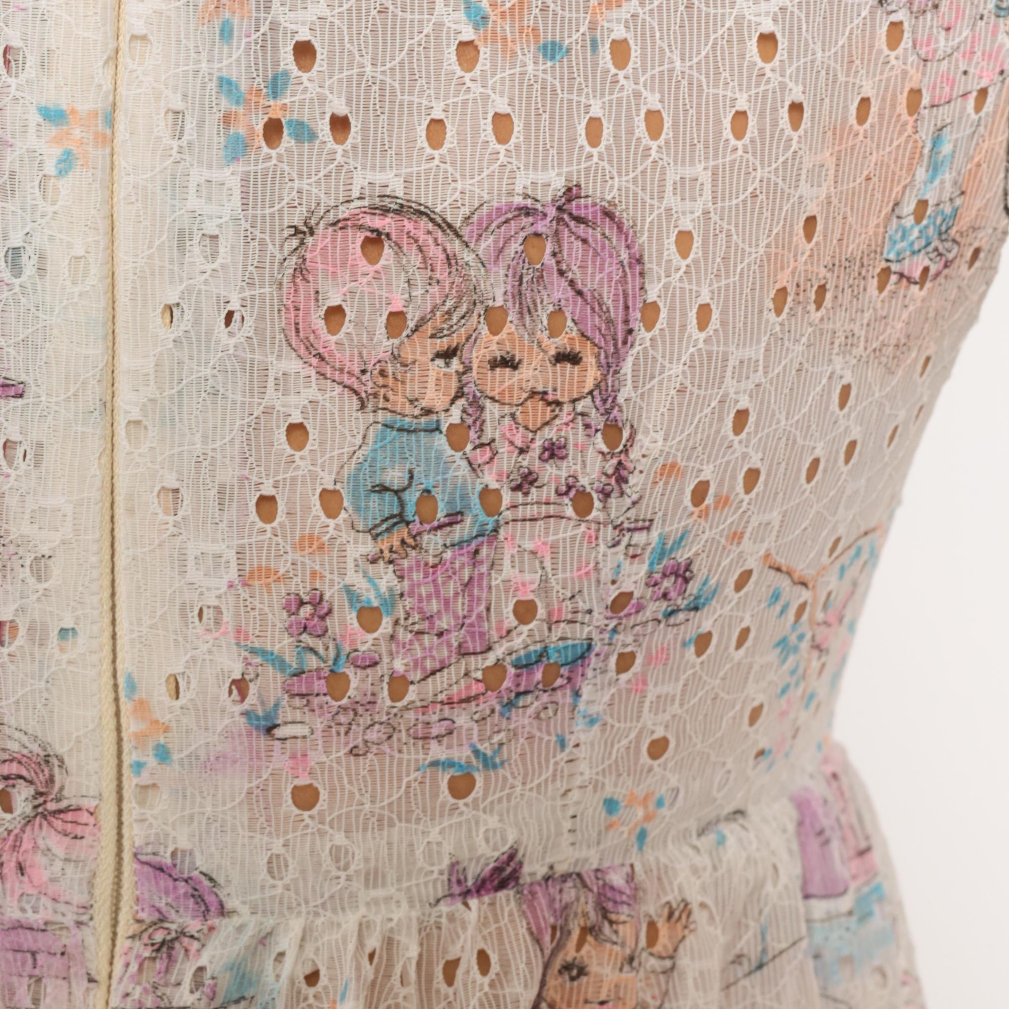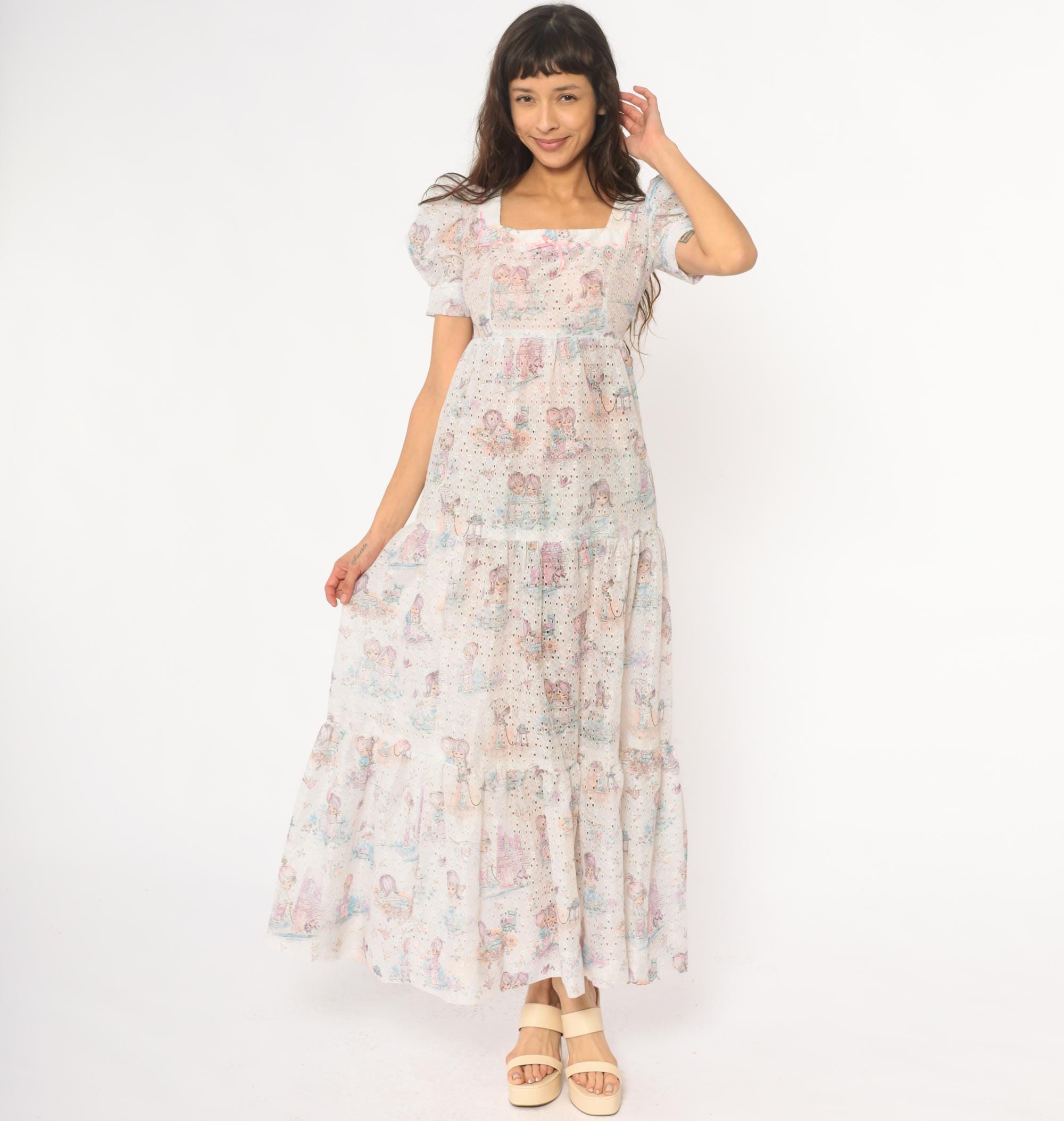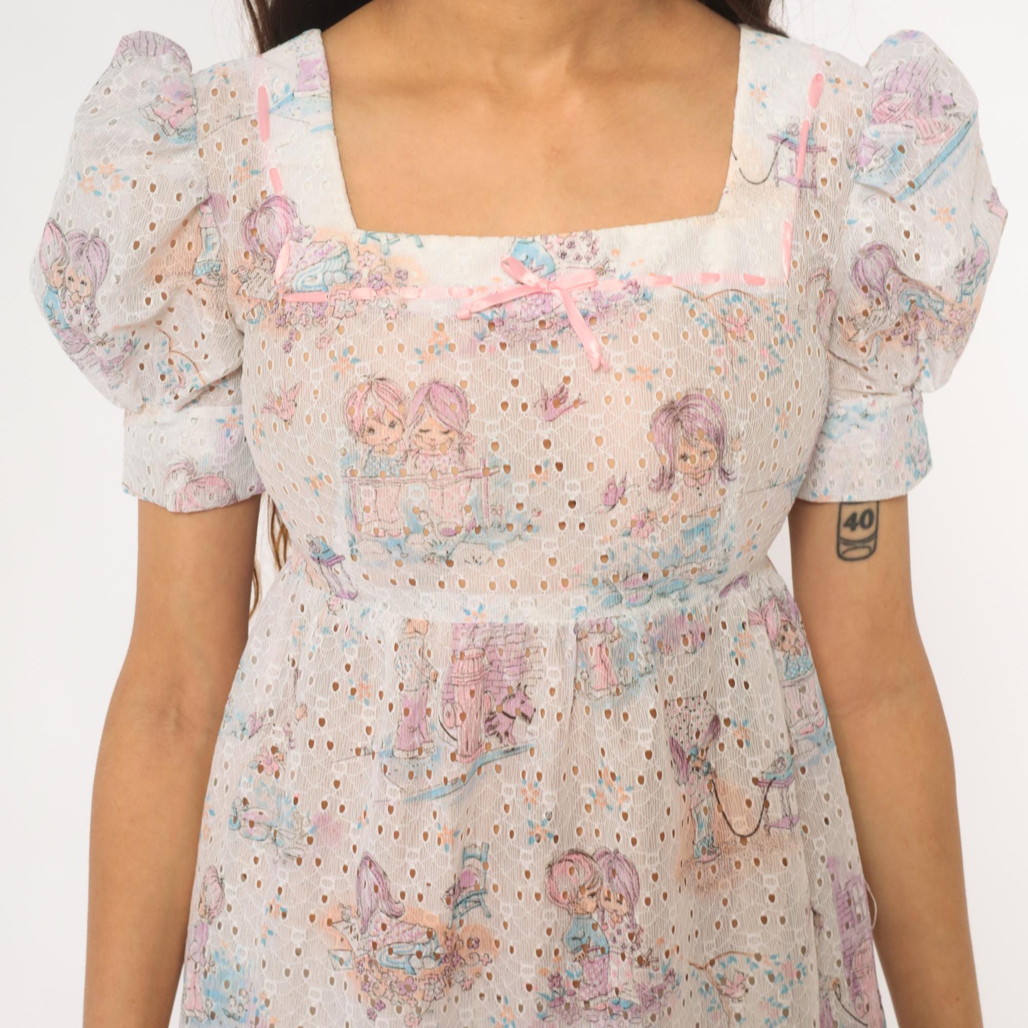 70s white eyelet maxi dress with pastel kawaii children print throughout the fabric, all-over eyelet perforations, and pink satin ribbon bow at the square neckline. Puffed short sleeves with gathered cuffs, empire waist with three-tiered gathered skirt, ruffled hem. Characters in soft pink, purple, and blue tones scattered across the print.