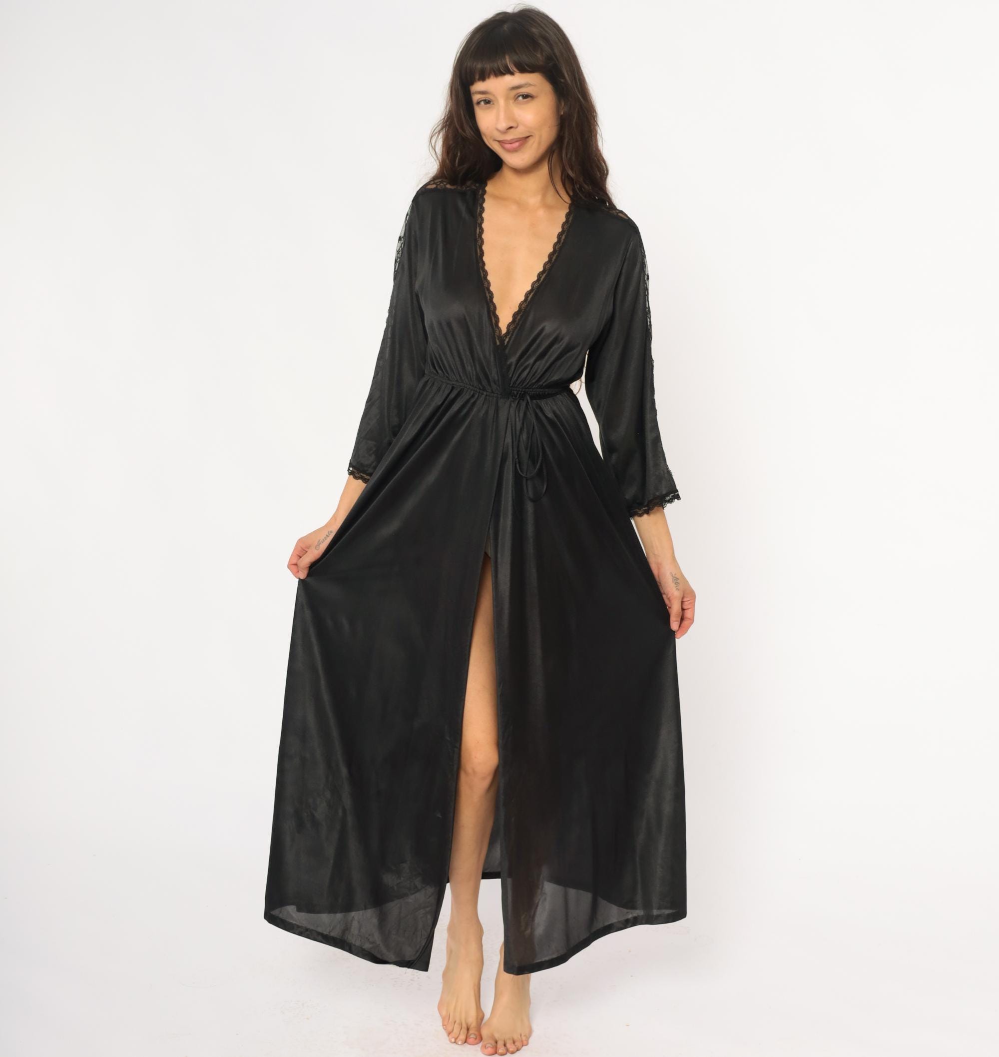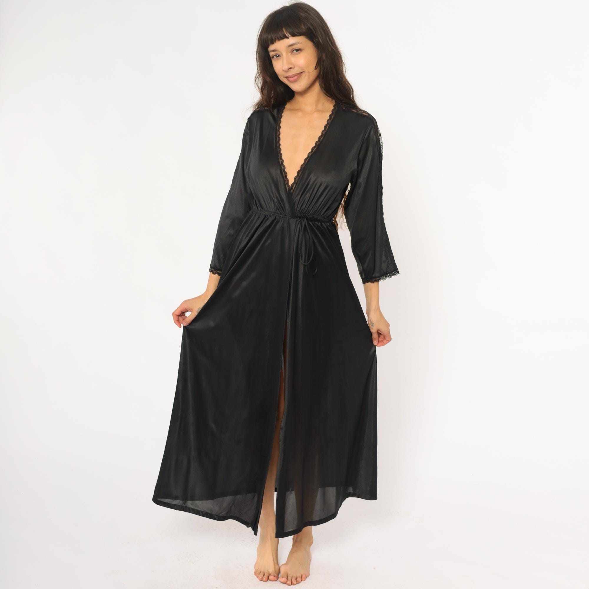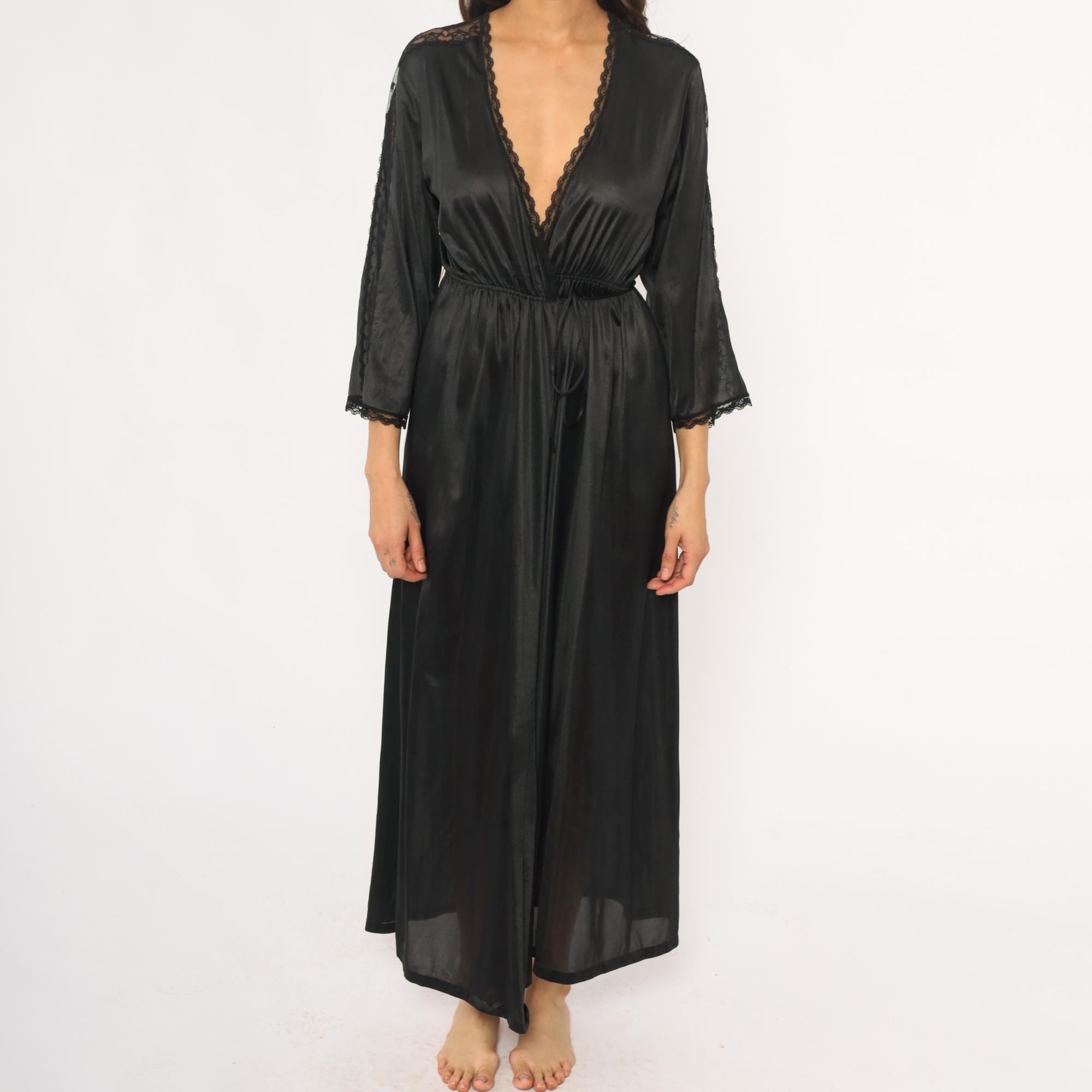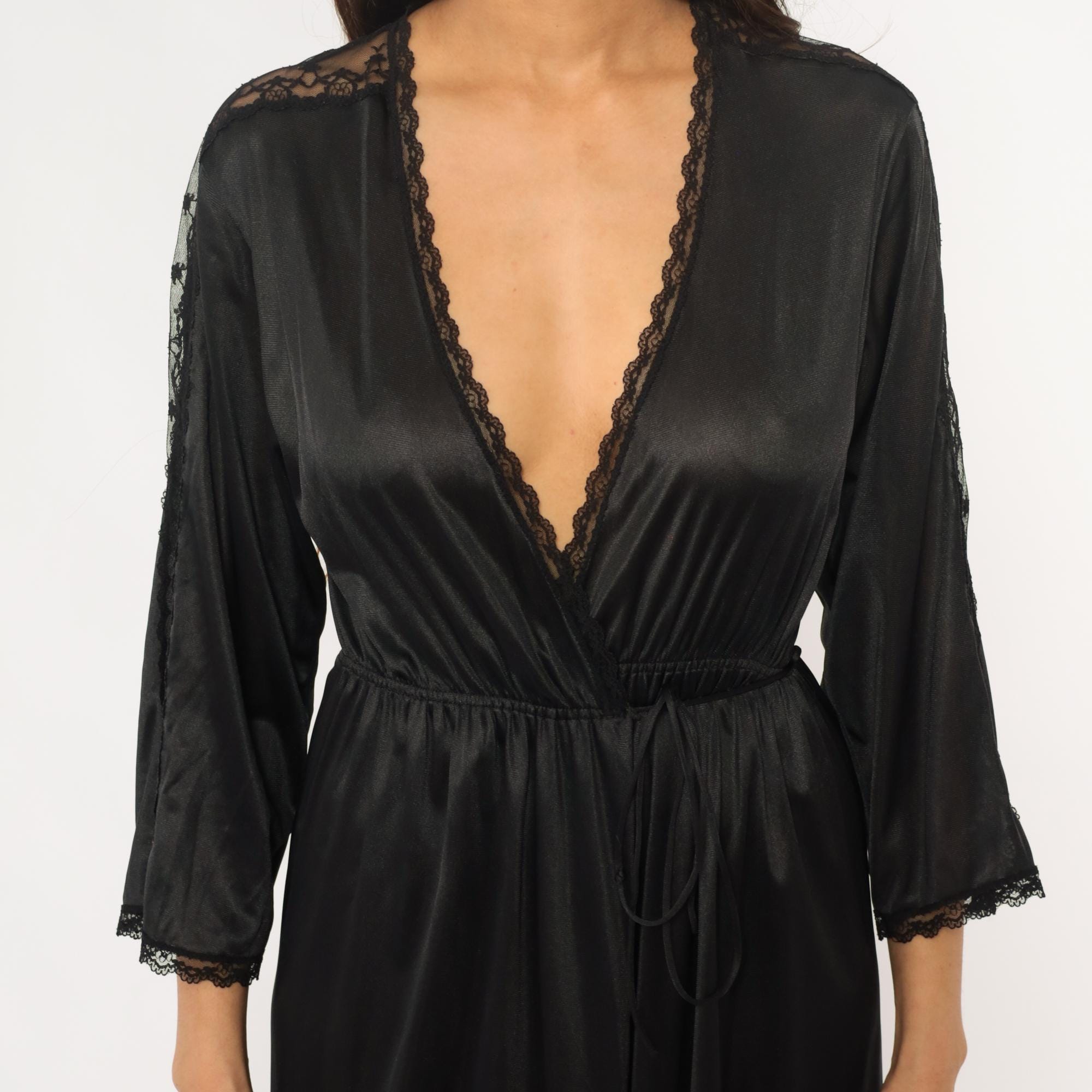 70s black nylon robe with deep V-neck wrap front and delicate lace trim along the neckline, sleeve cuffs, and center back seam. Three-quarter sleeves, elastic waist with matching tie belt, floor-length with front slit opening.