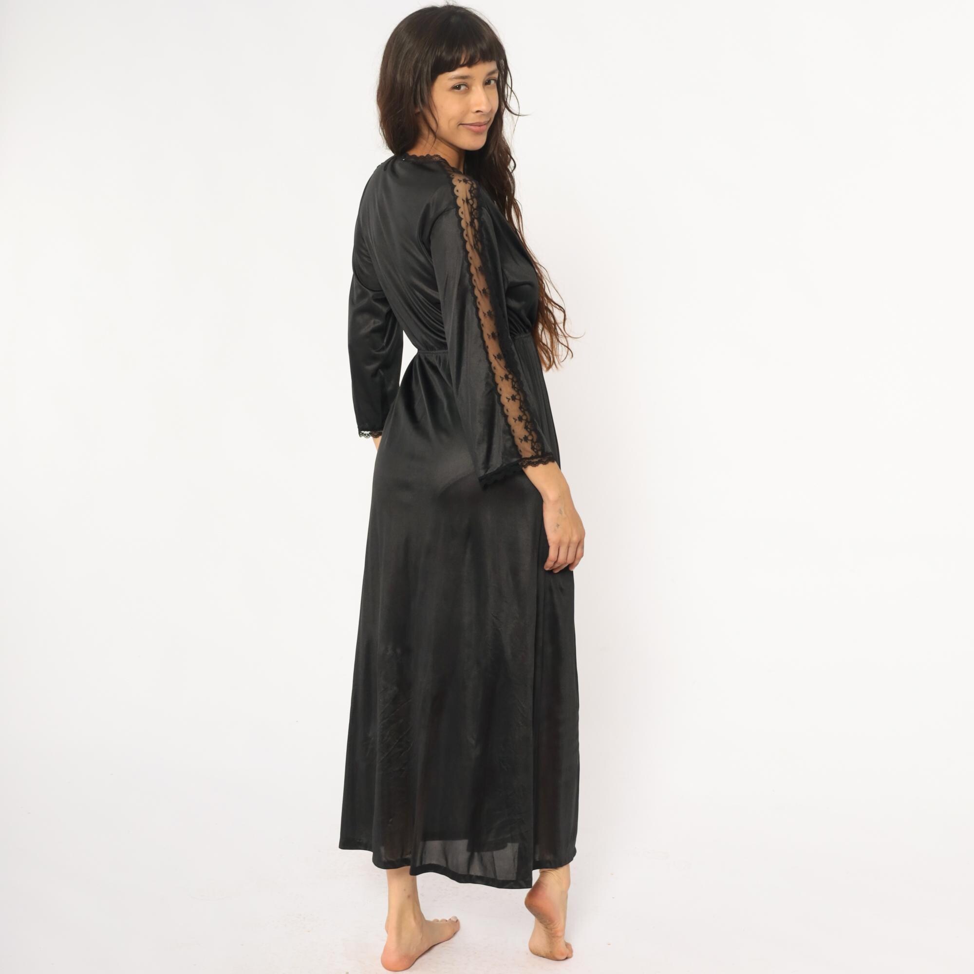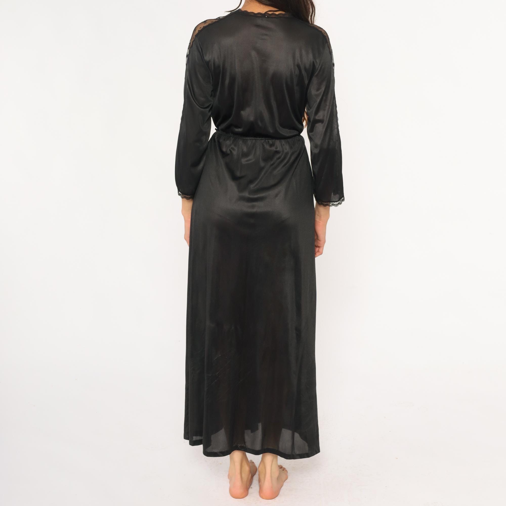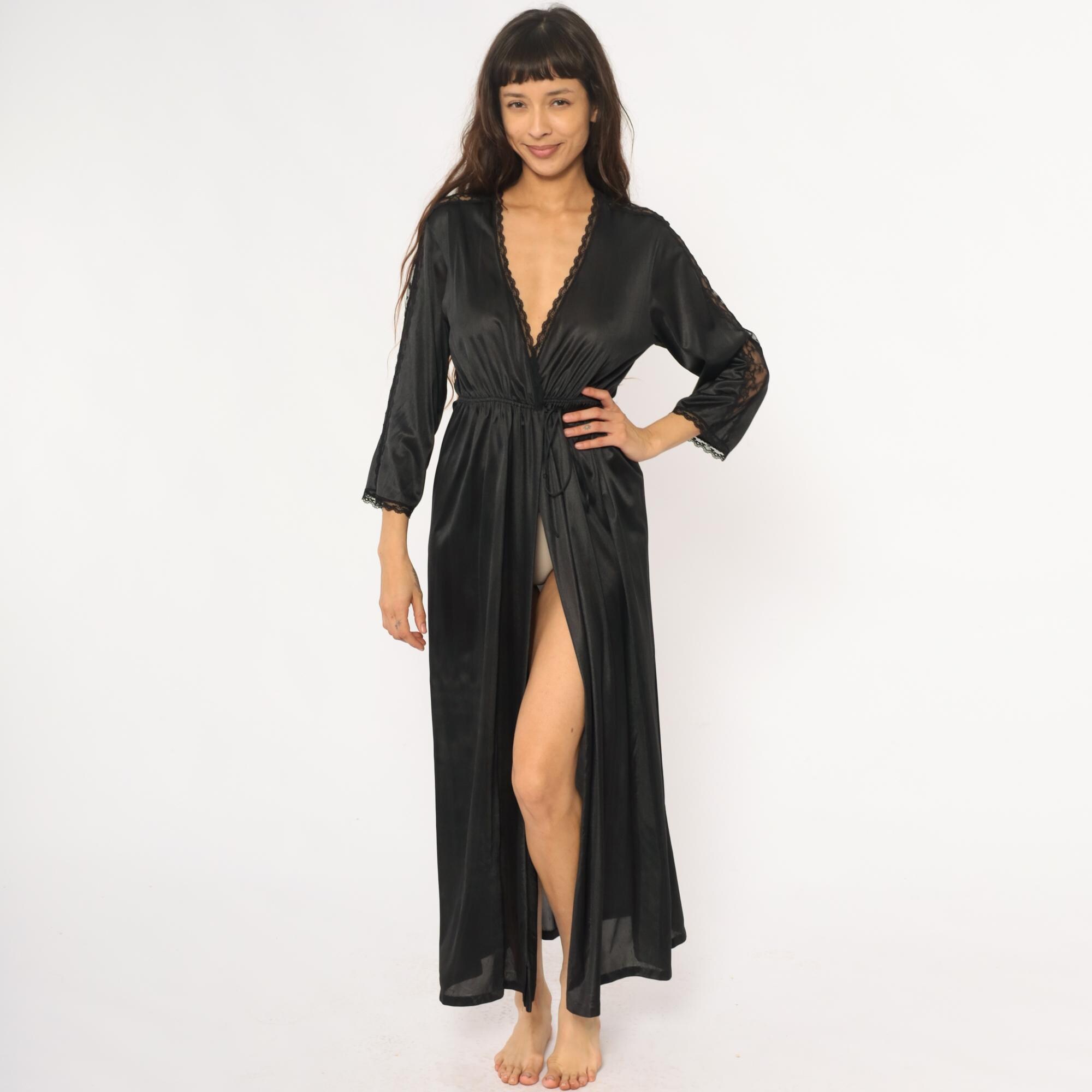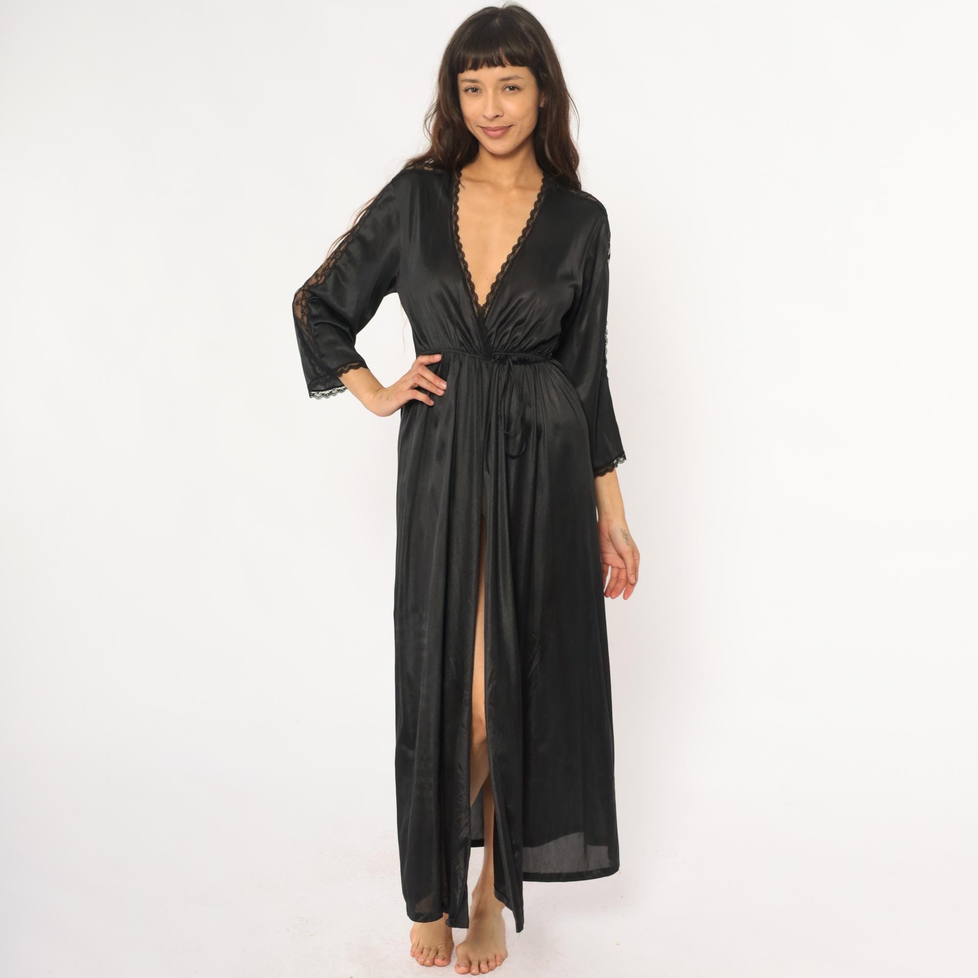 70s black nylon robe with deep V-neck wrap front and delicate lace trim along the neckline, sleeve cuffs, and center back seam. Three-quarter sleeves, elastic waist with matching tie belt, floor-length with front slit opening.