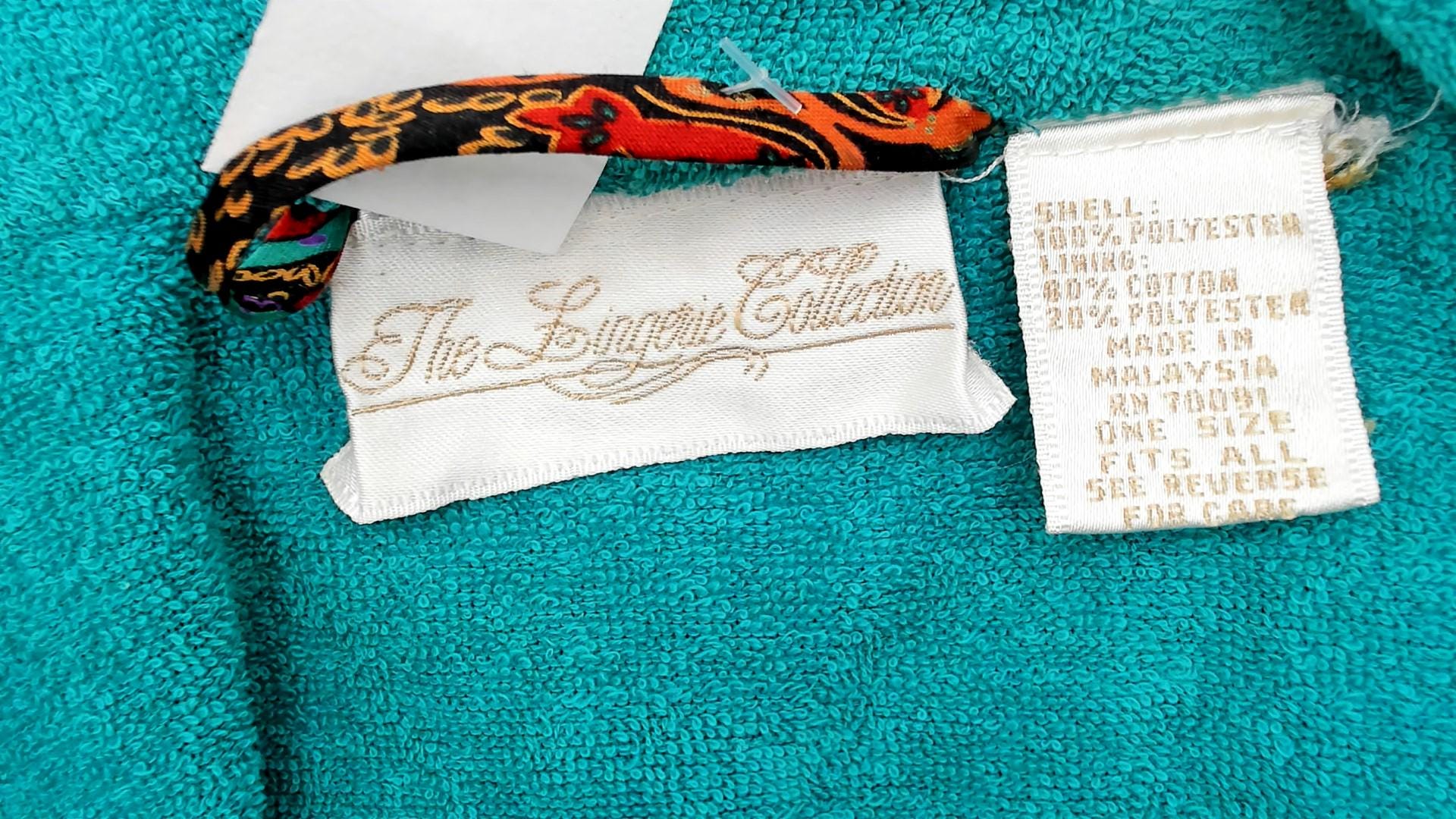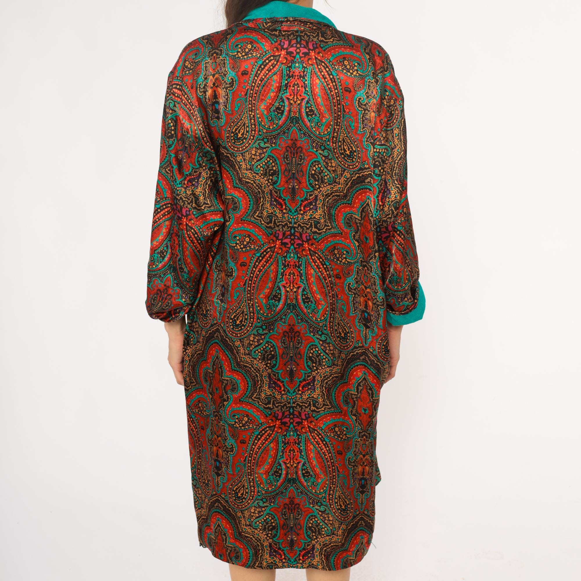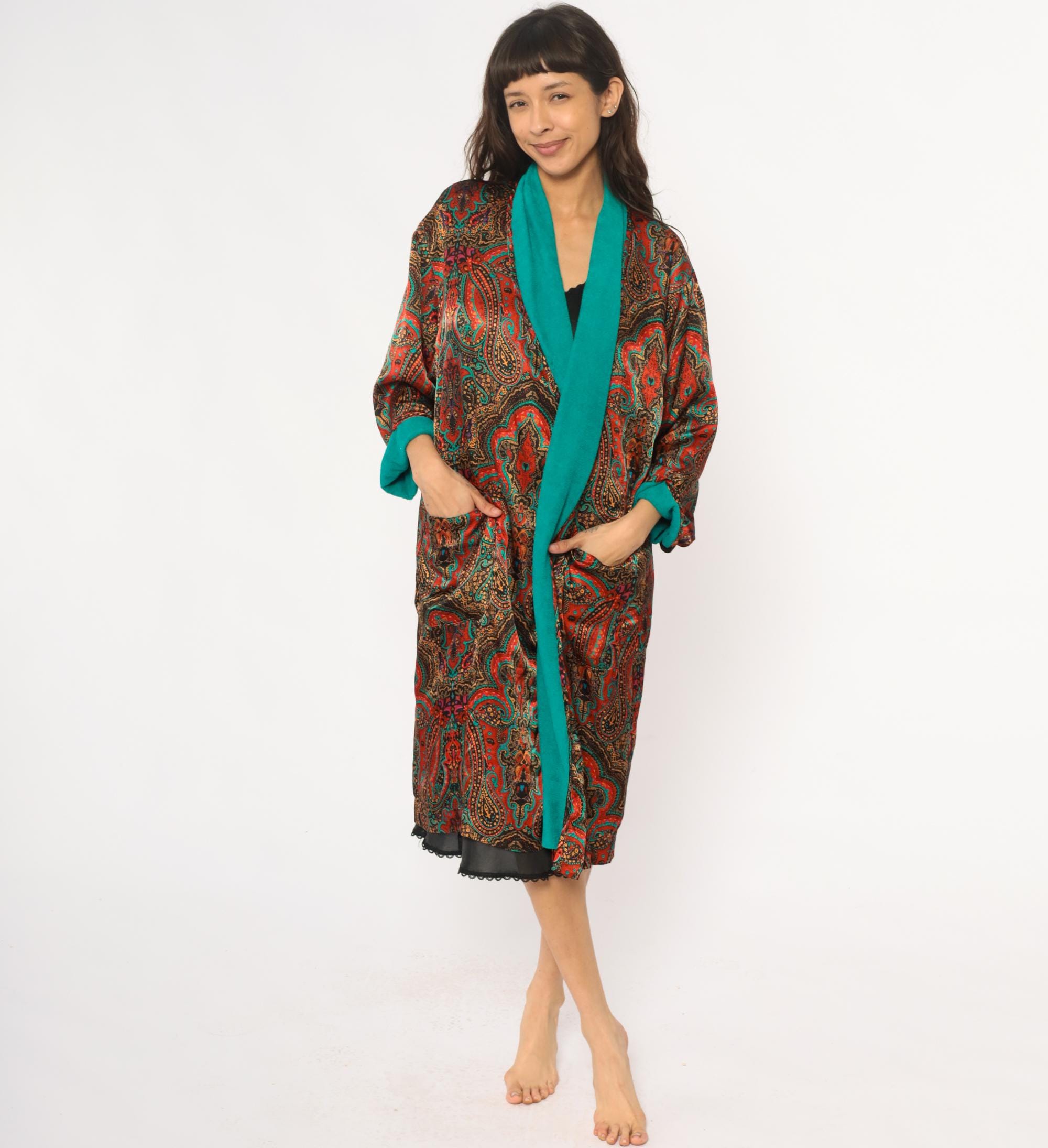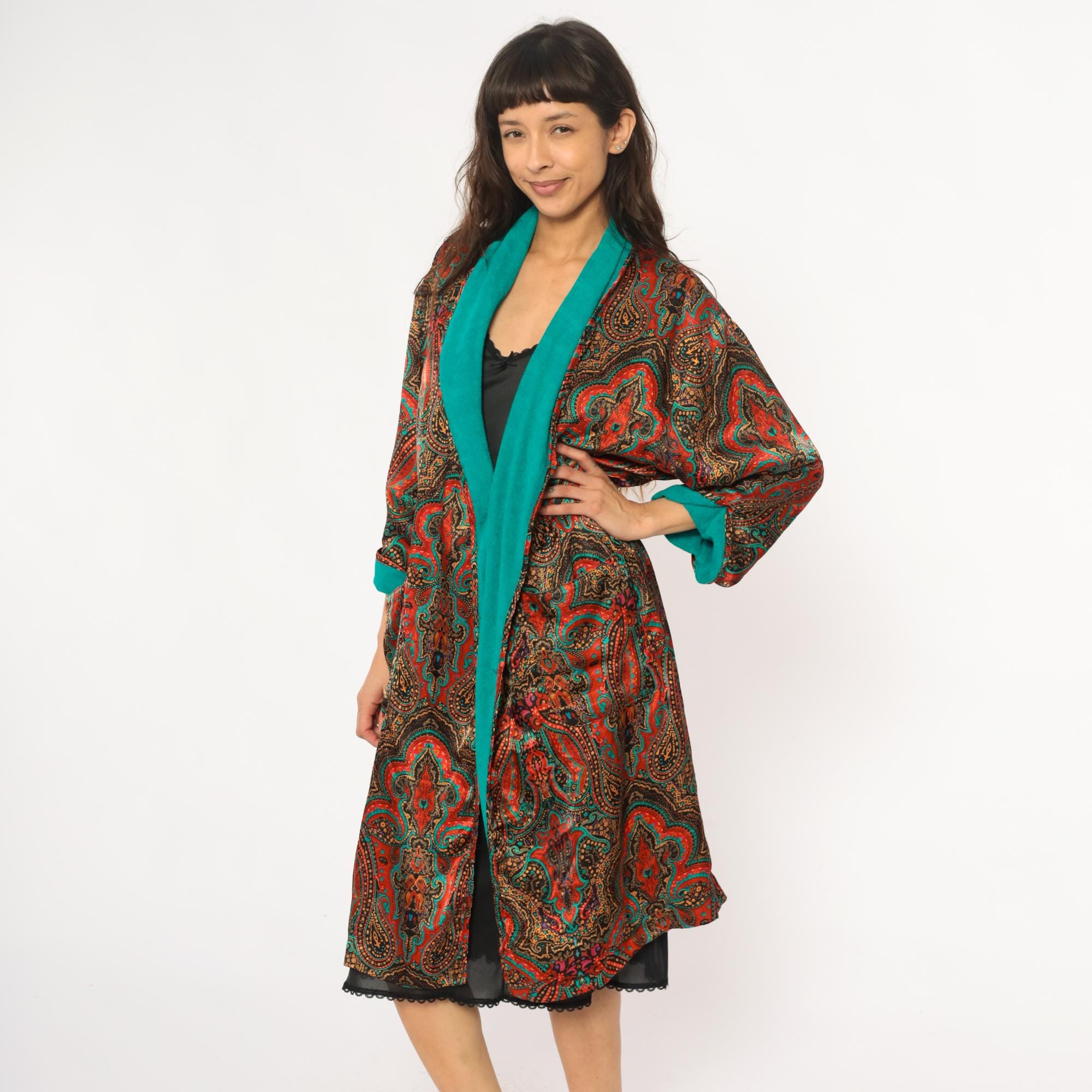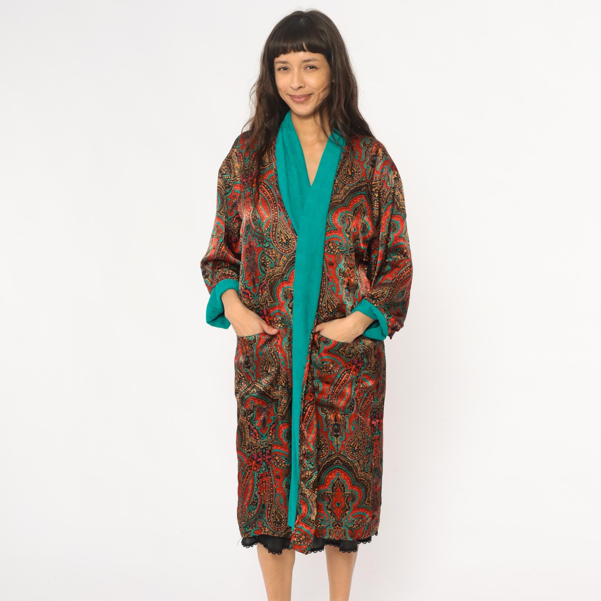 80s paisley robe from the lingerie collections with red, orange, turquoise, gold, and black paisley print across the fabric. Turquoise collar and cuffs, open front style with two patch pockets, black lace trim at hem. Polyester with terrycloth lining. Labelled one size fits most.