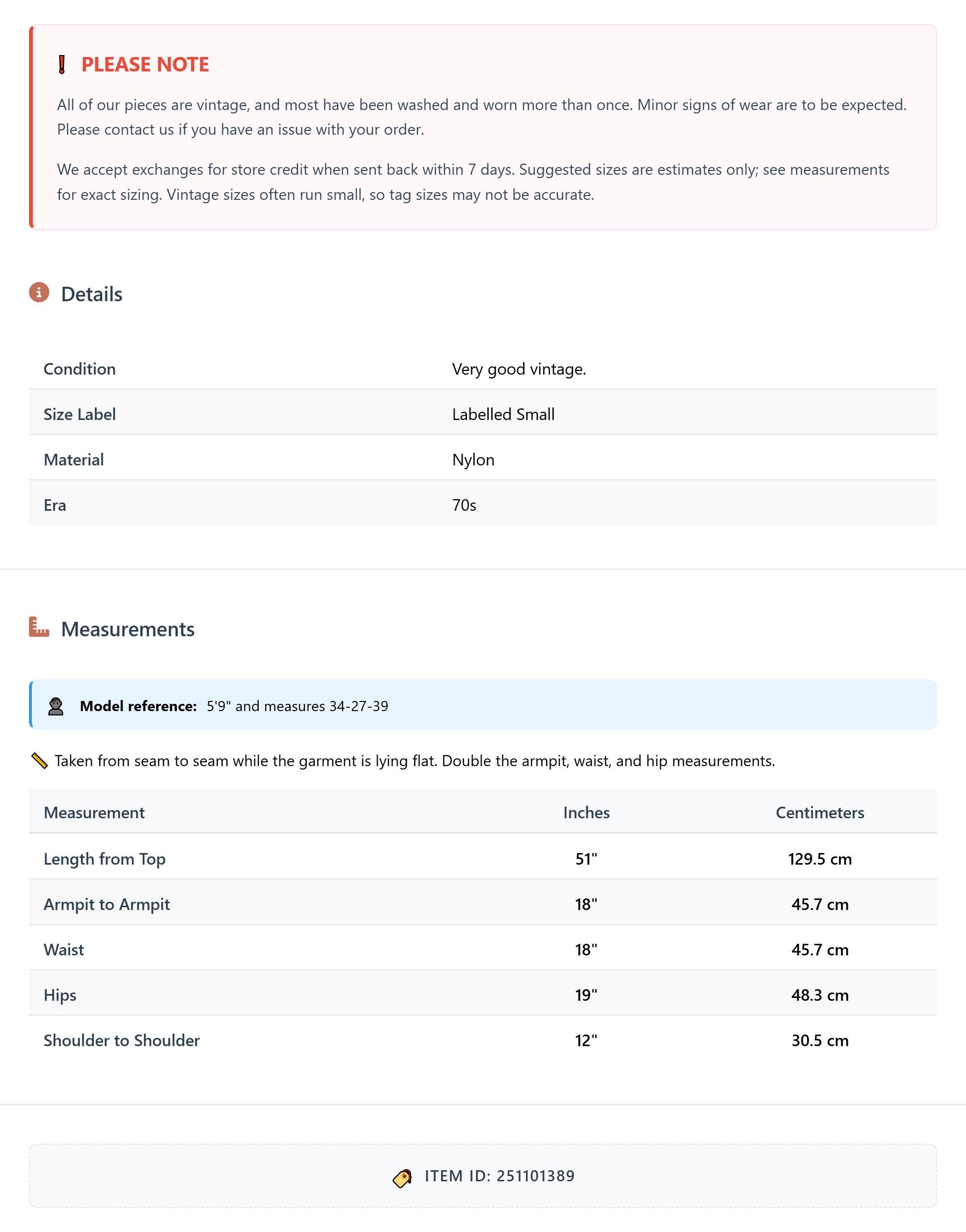 All of our pieces are vintage, and most have been washed and worn more than once. Minor signs of wear are to be expected. Please contact us if you have an issue with your order. We accept exchanges for store credit when sent back within 7 days.