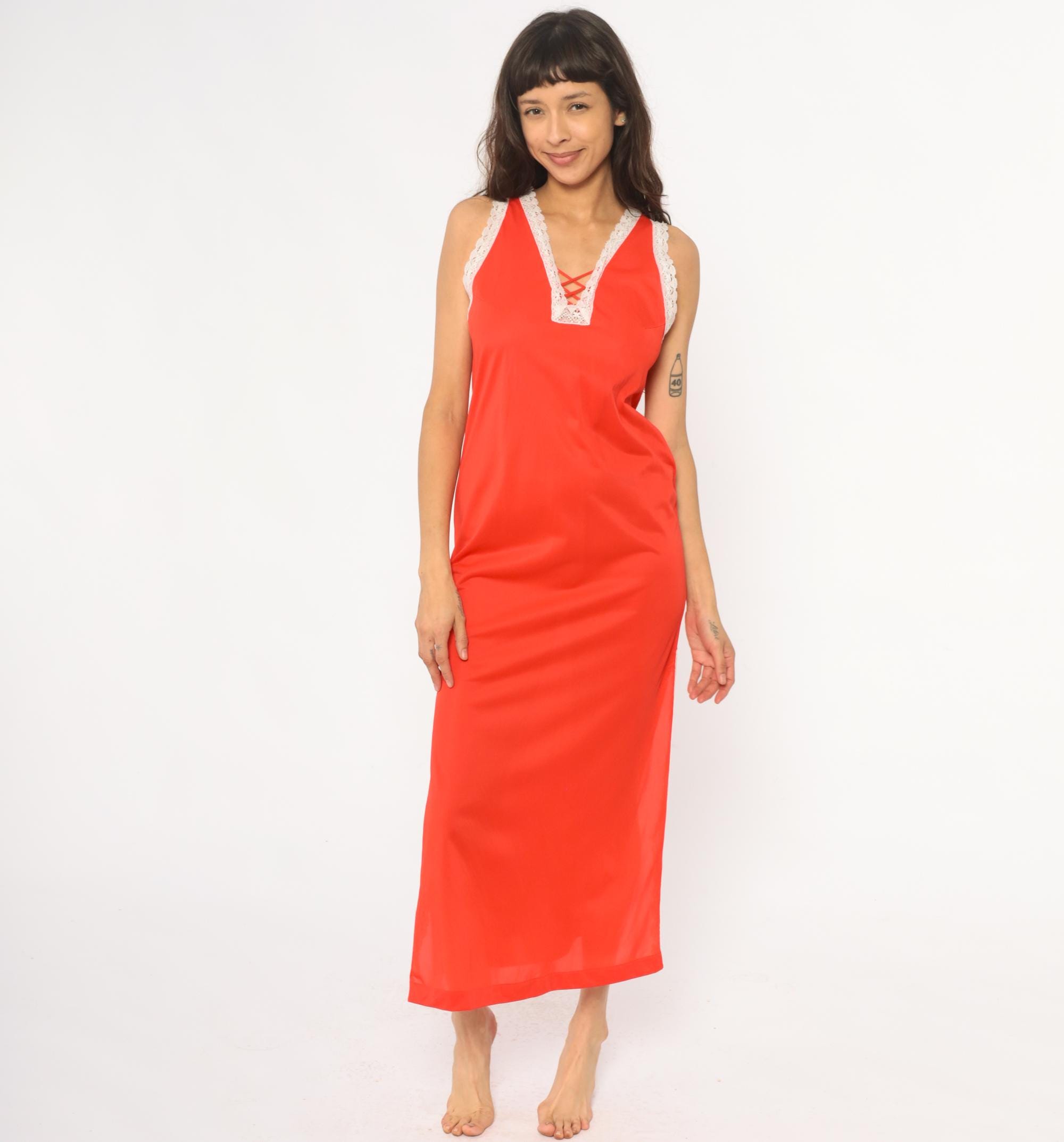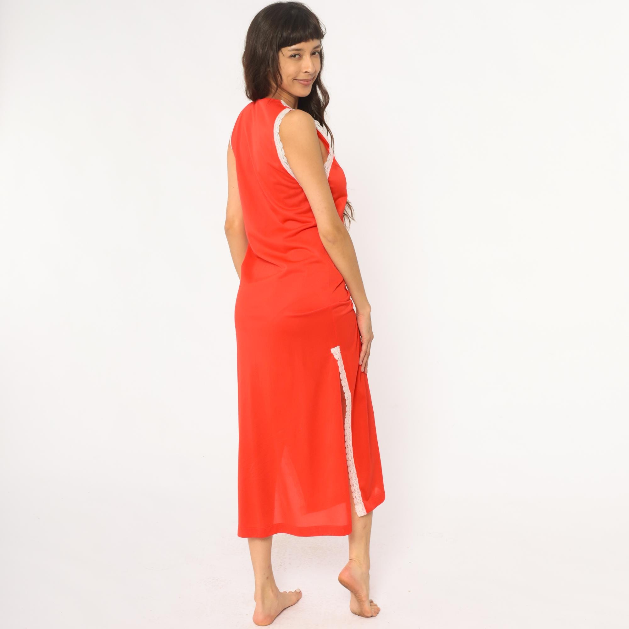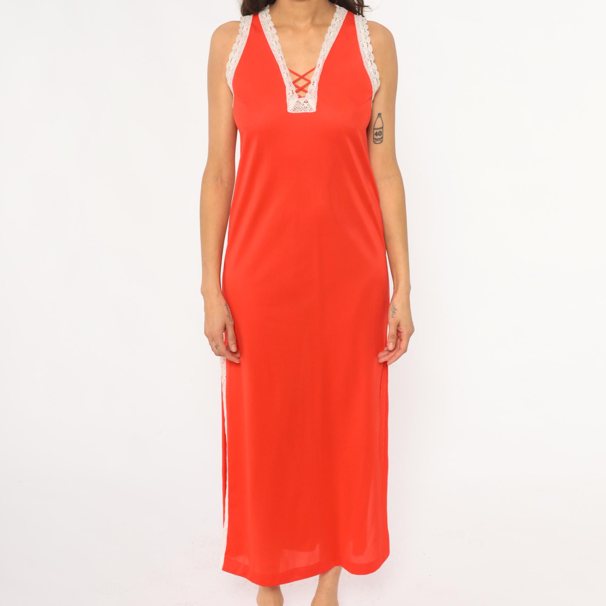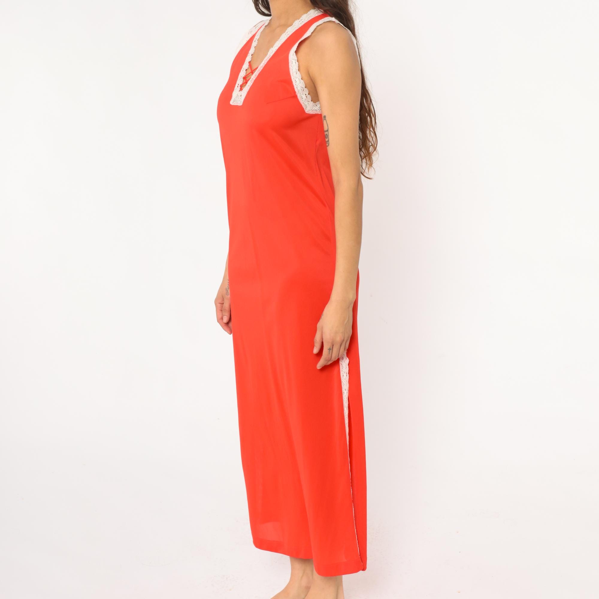 70s coral maxi dress with white lace trim at neckline, shoulder straps, and side slits. Deep V-neckline with lace-up detail at center front, sleeveless with wide lace-trimmed straps. Floor-length with high side slits trimmed in matching white lace. Nylon. Tagged size Small.