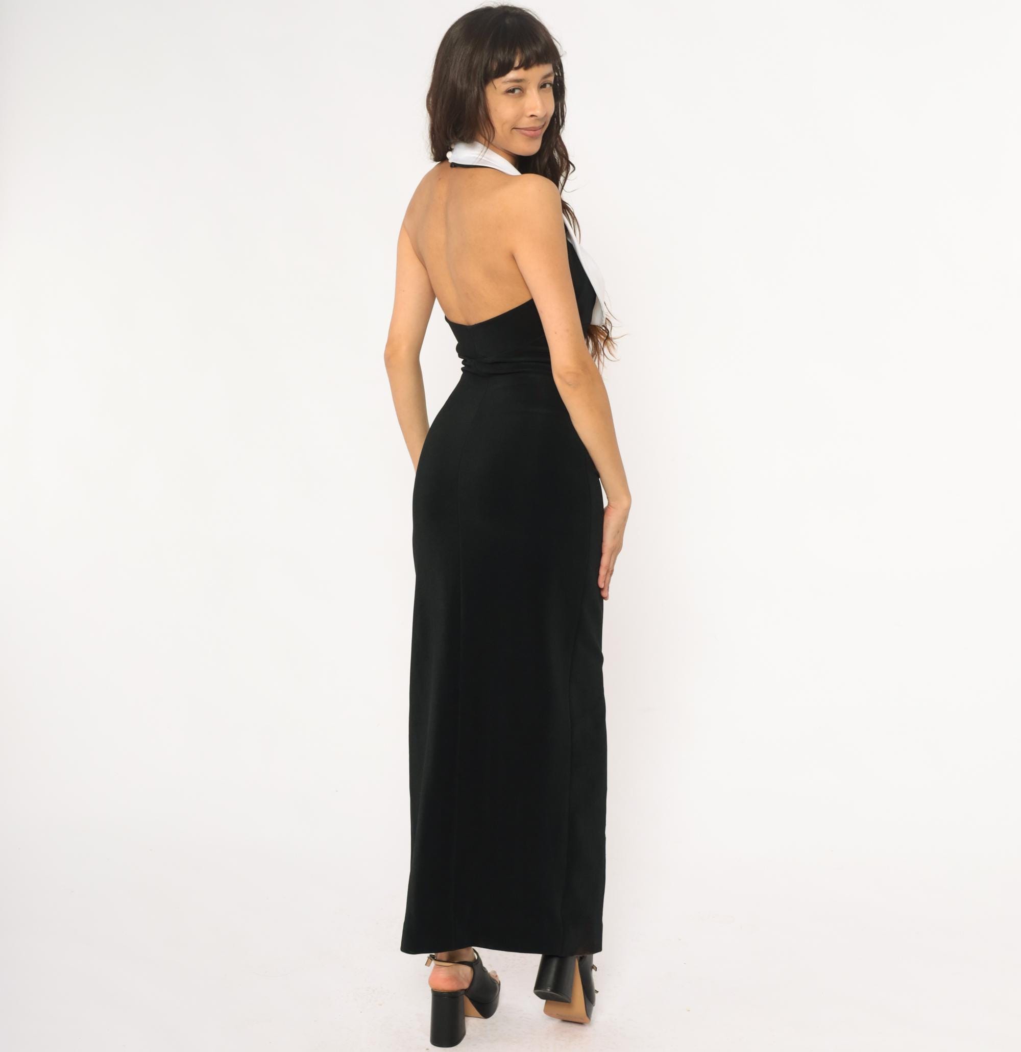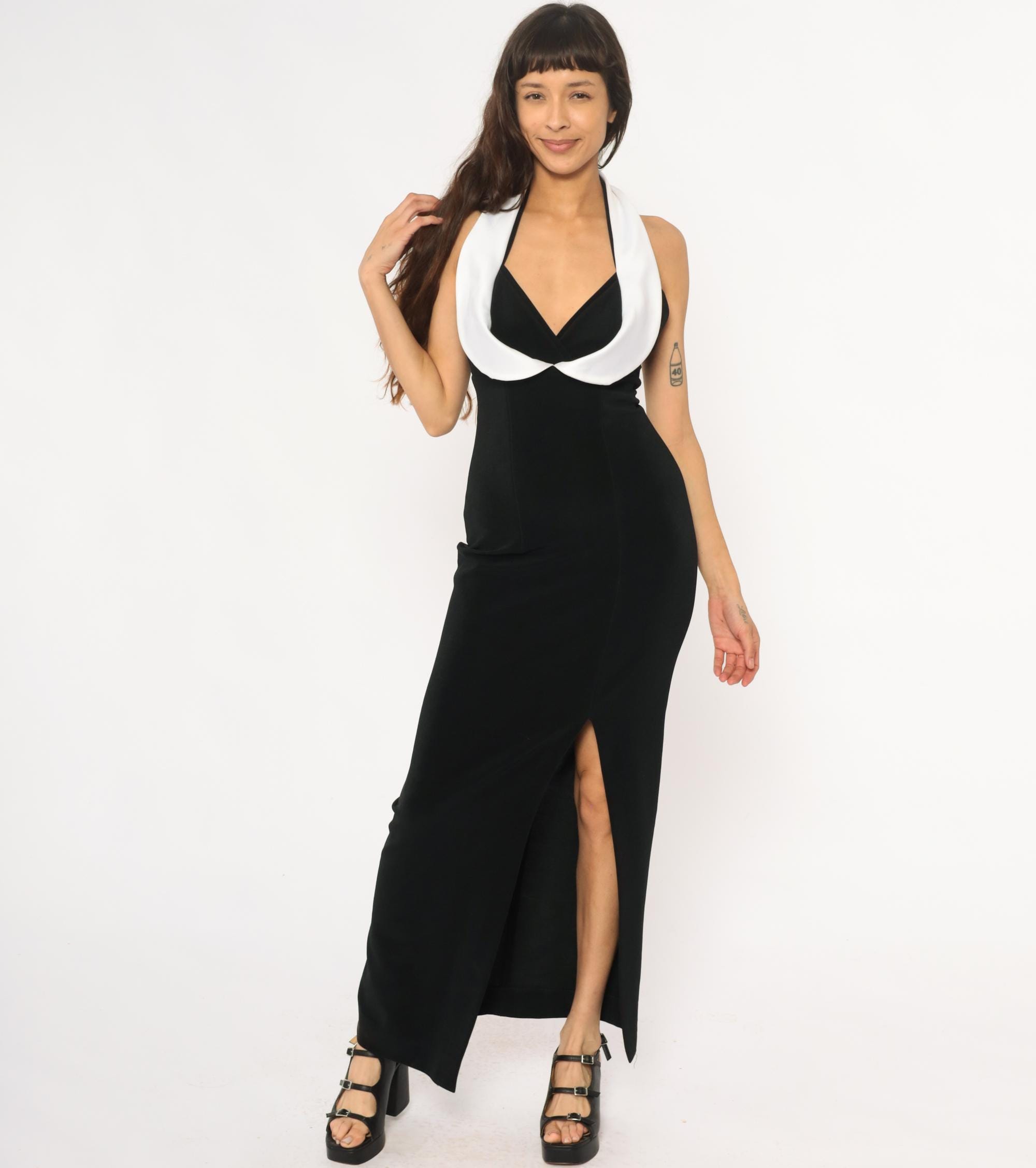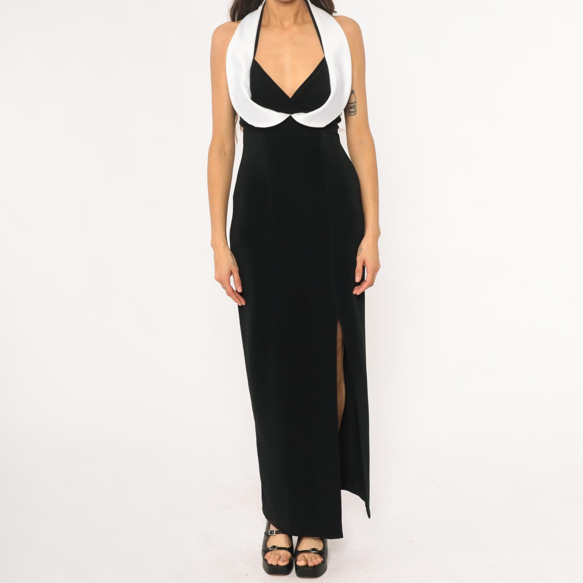 90s black maxi dress from cache with white contrast collar detail framing the halter neckline. Backless design with halter tie at neck, fitted silhouette through body, side slit at hem.