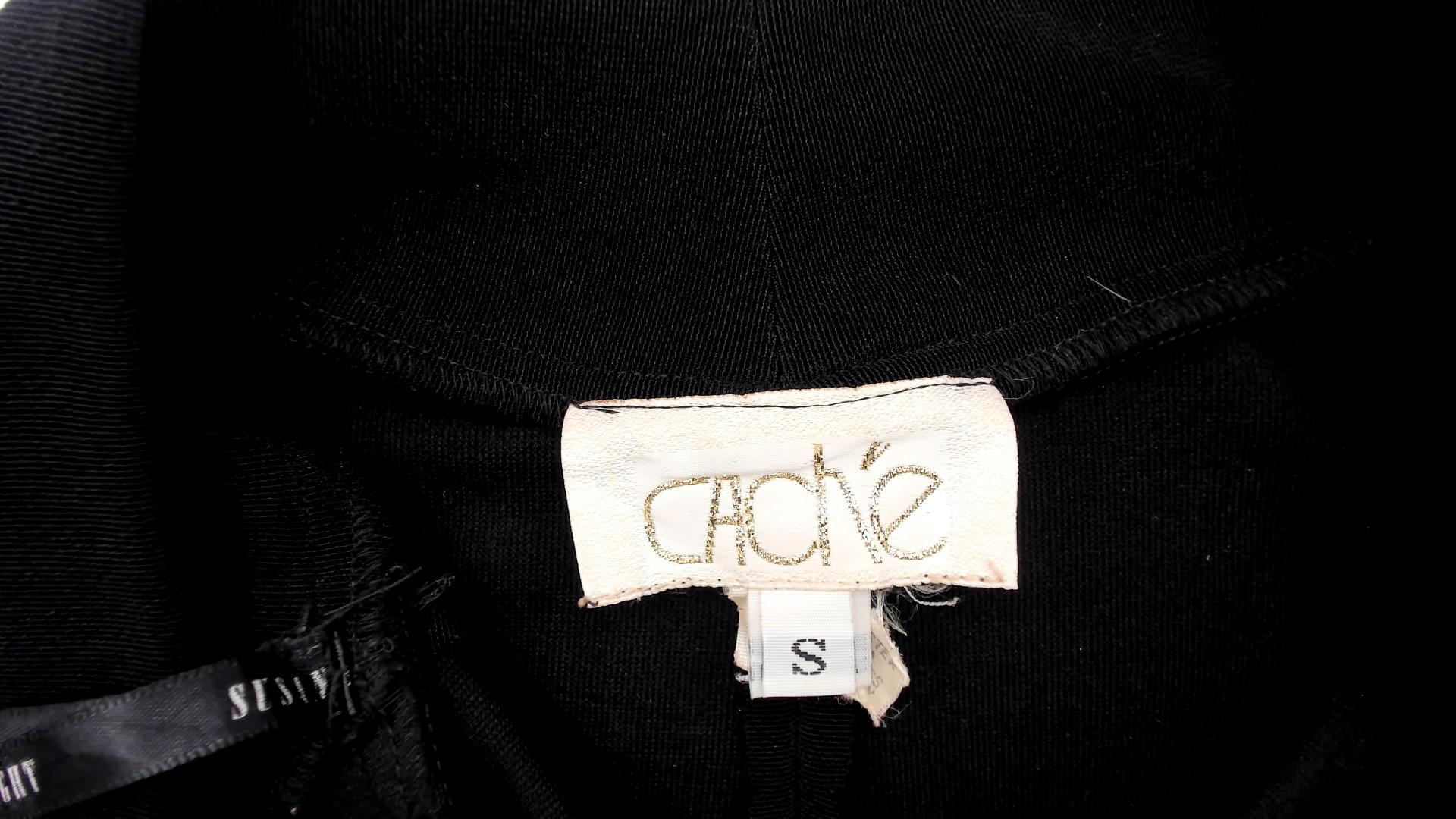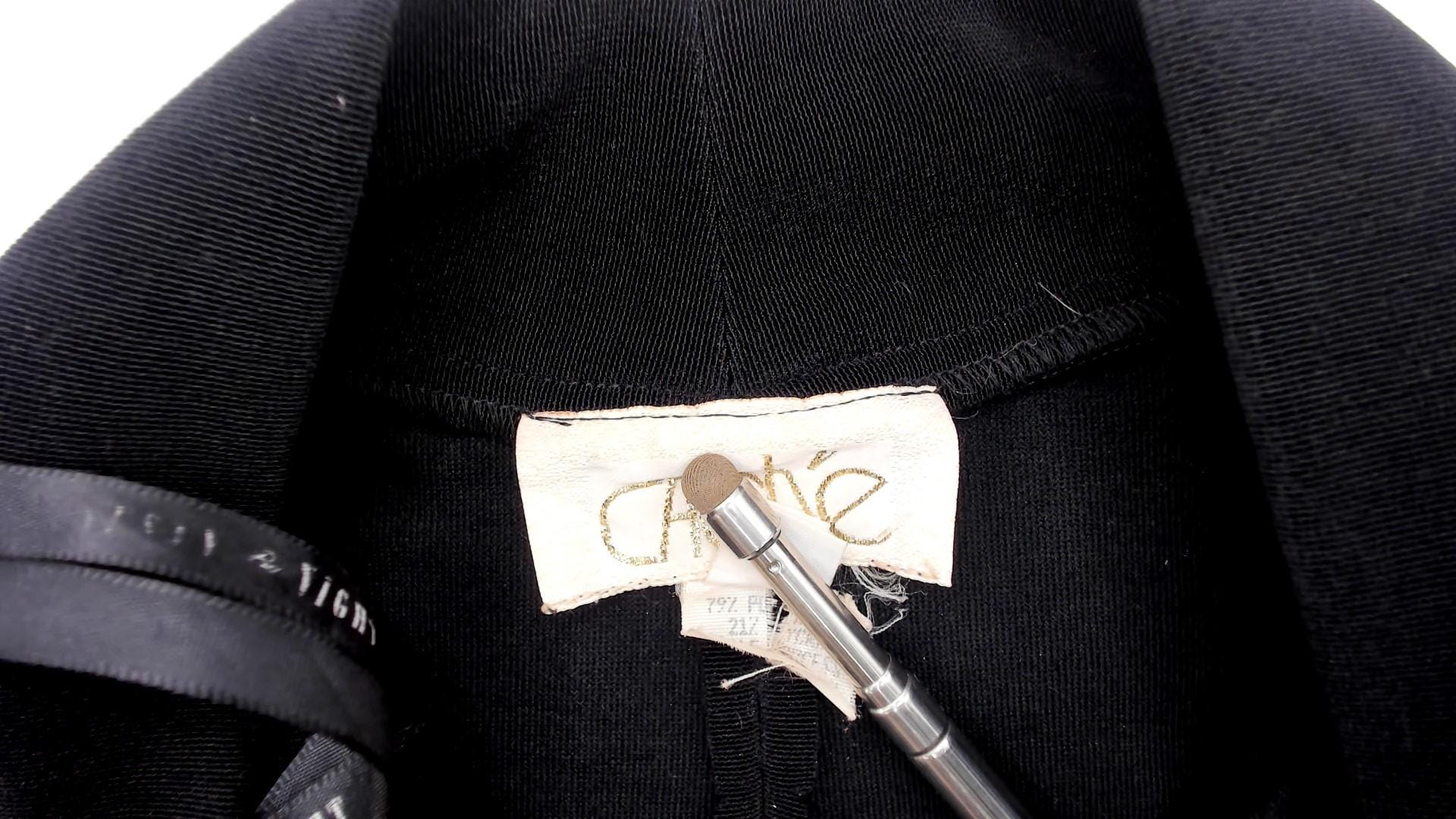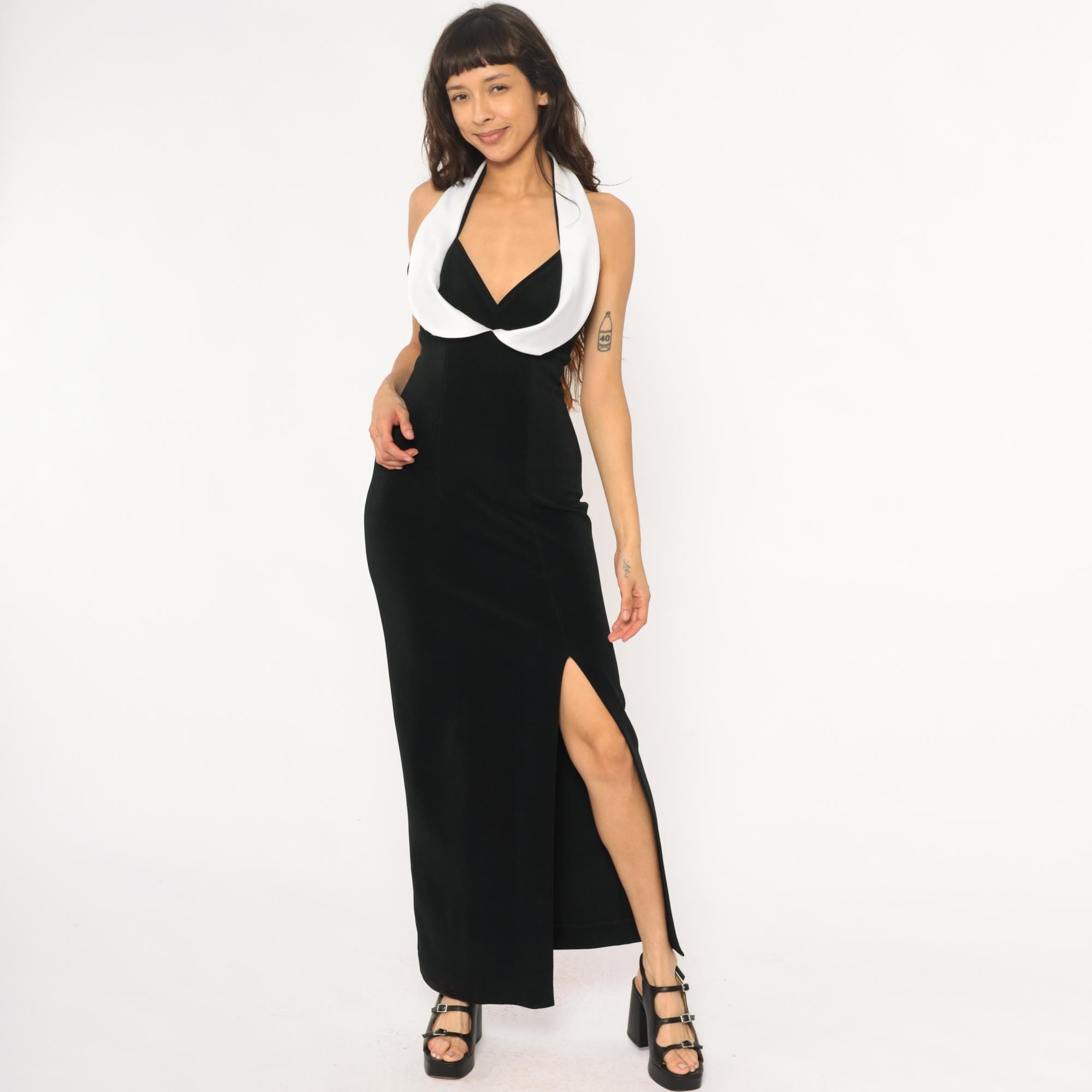 90s black maxi dress from cache with white contrast collar detail framing the halter neckline. Backless design with halter tie at neck, fitted silhouette through body, side slit at hem.