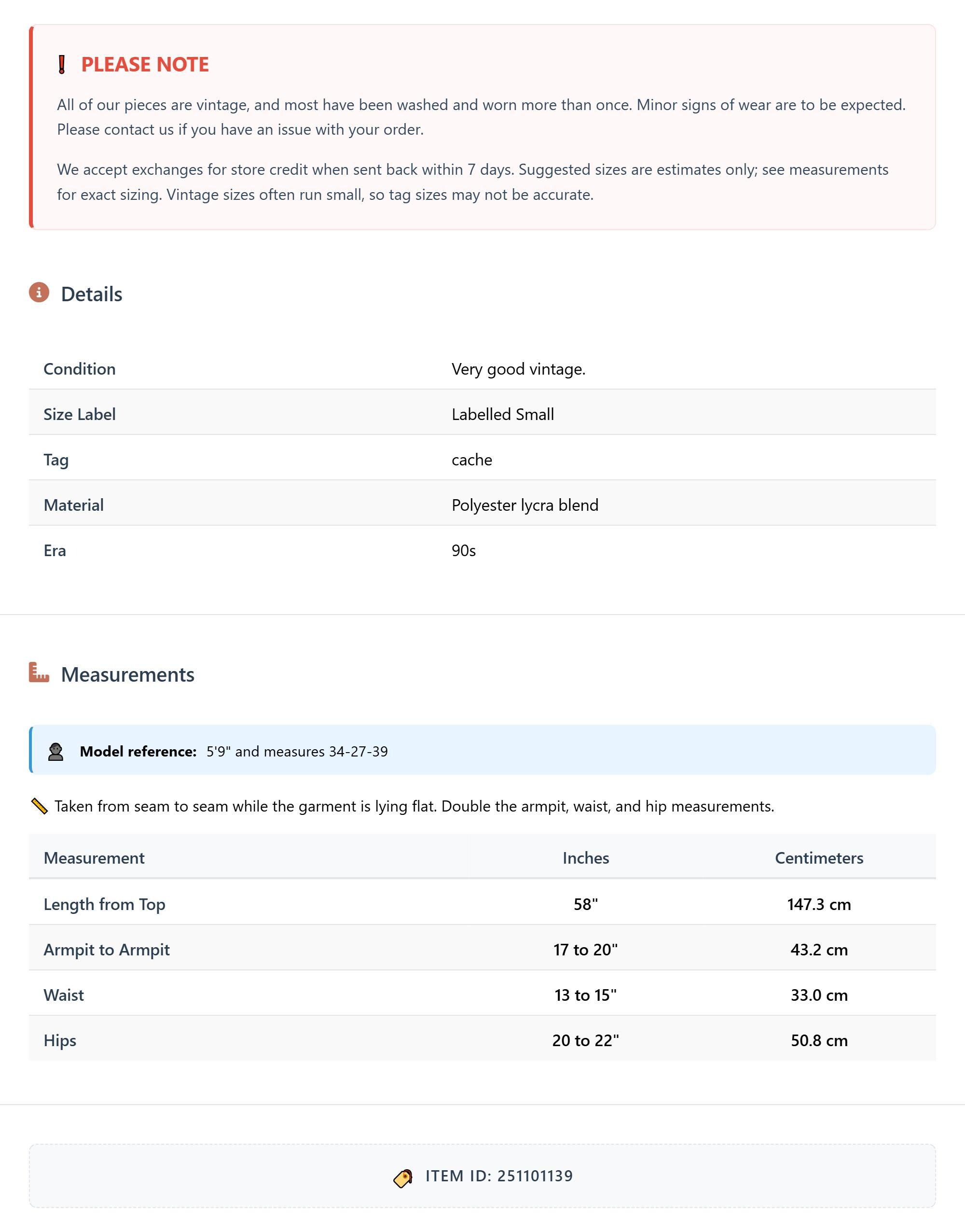 All of our pieces are vintage, and most have been washed and worn more than once. Minor signs of wear are to be expected. Please contact us if you have an issue with your order. We accept exchanges for store credit when sent back within 7 days.