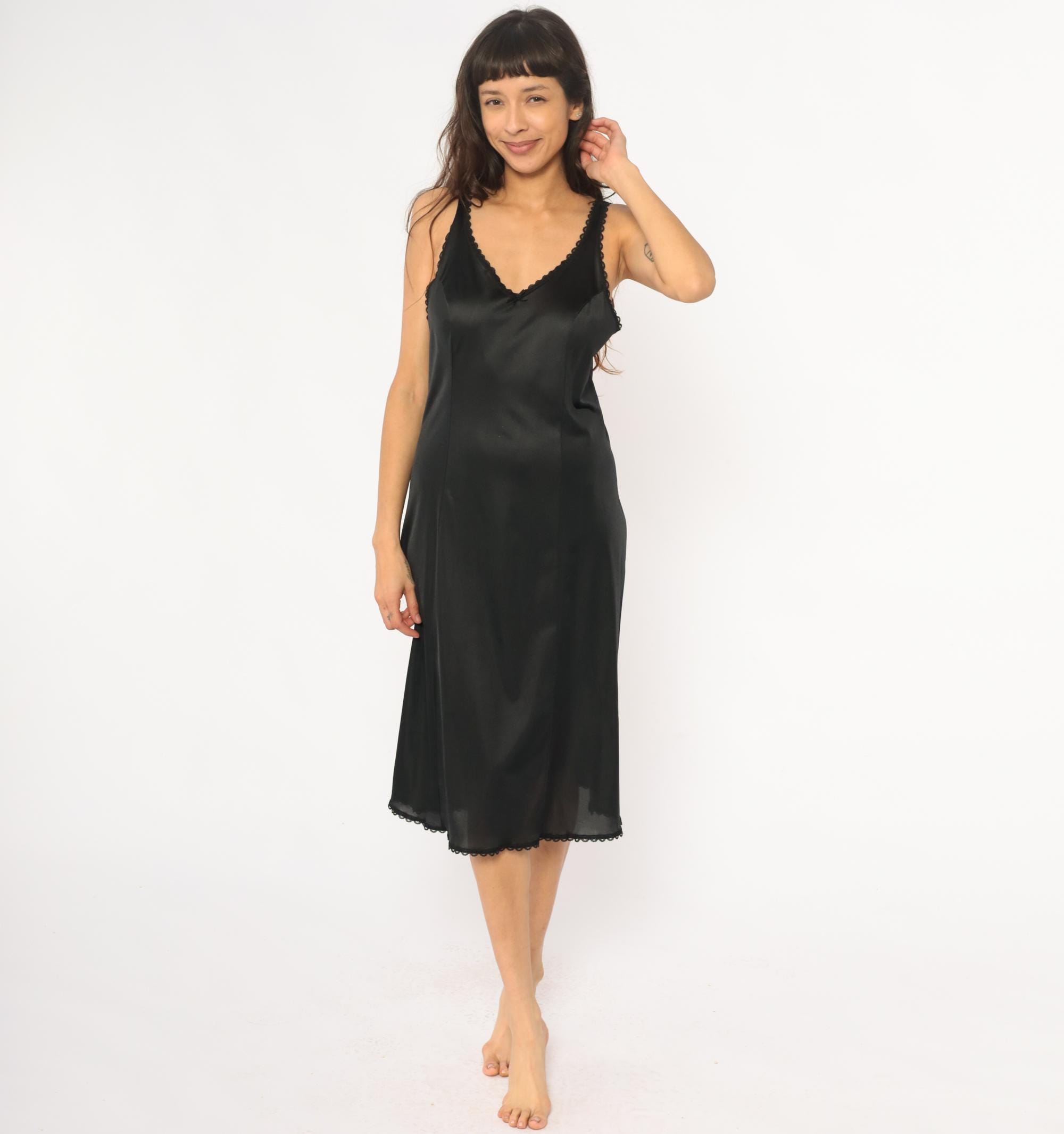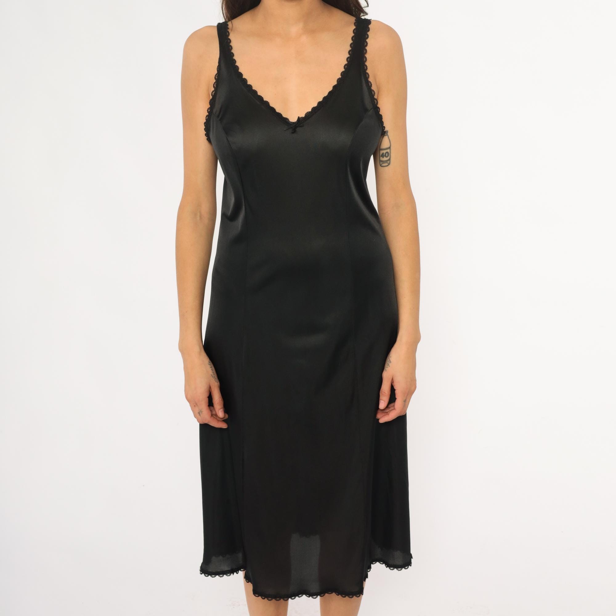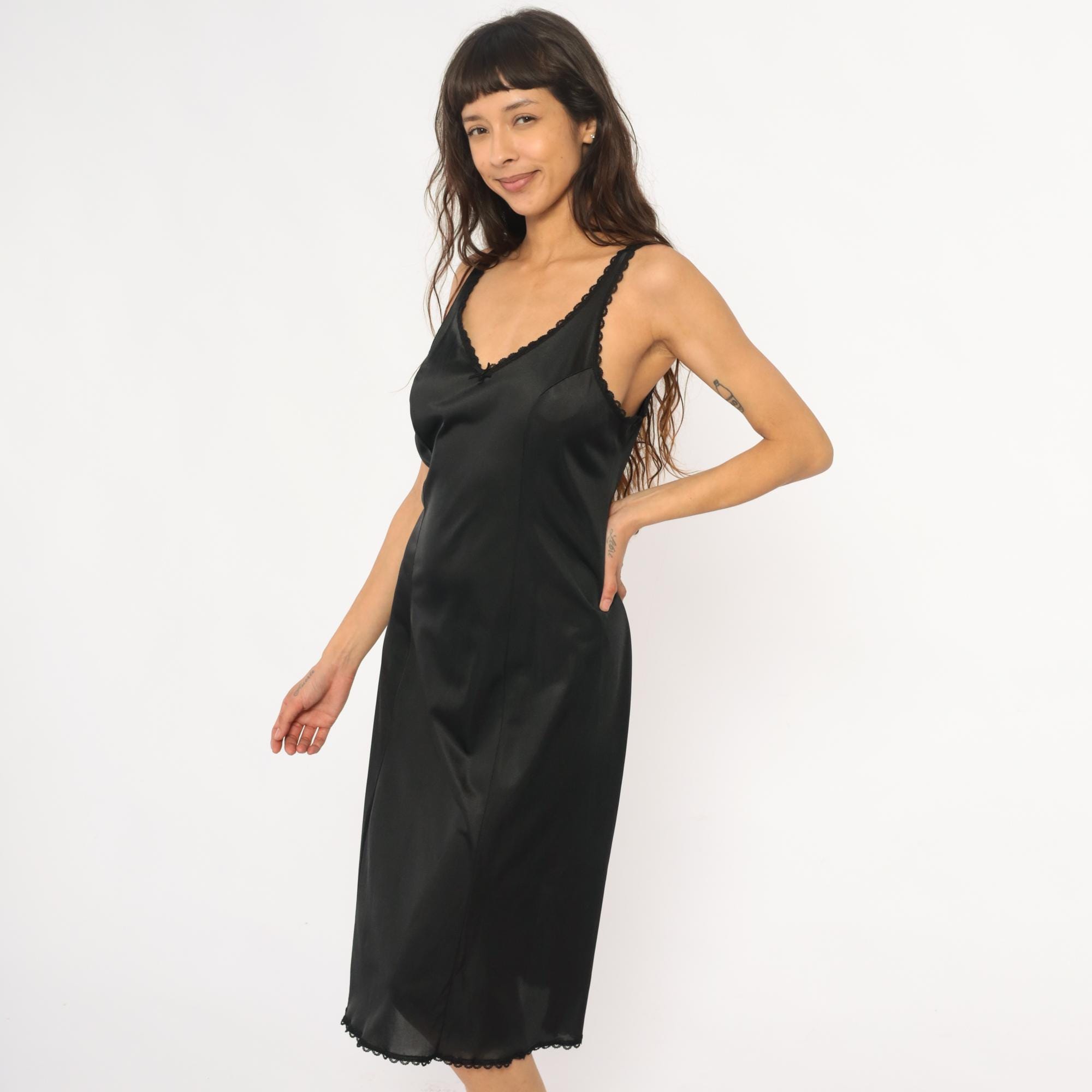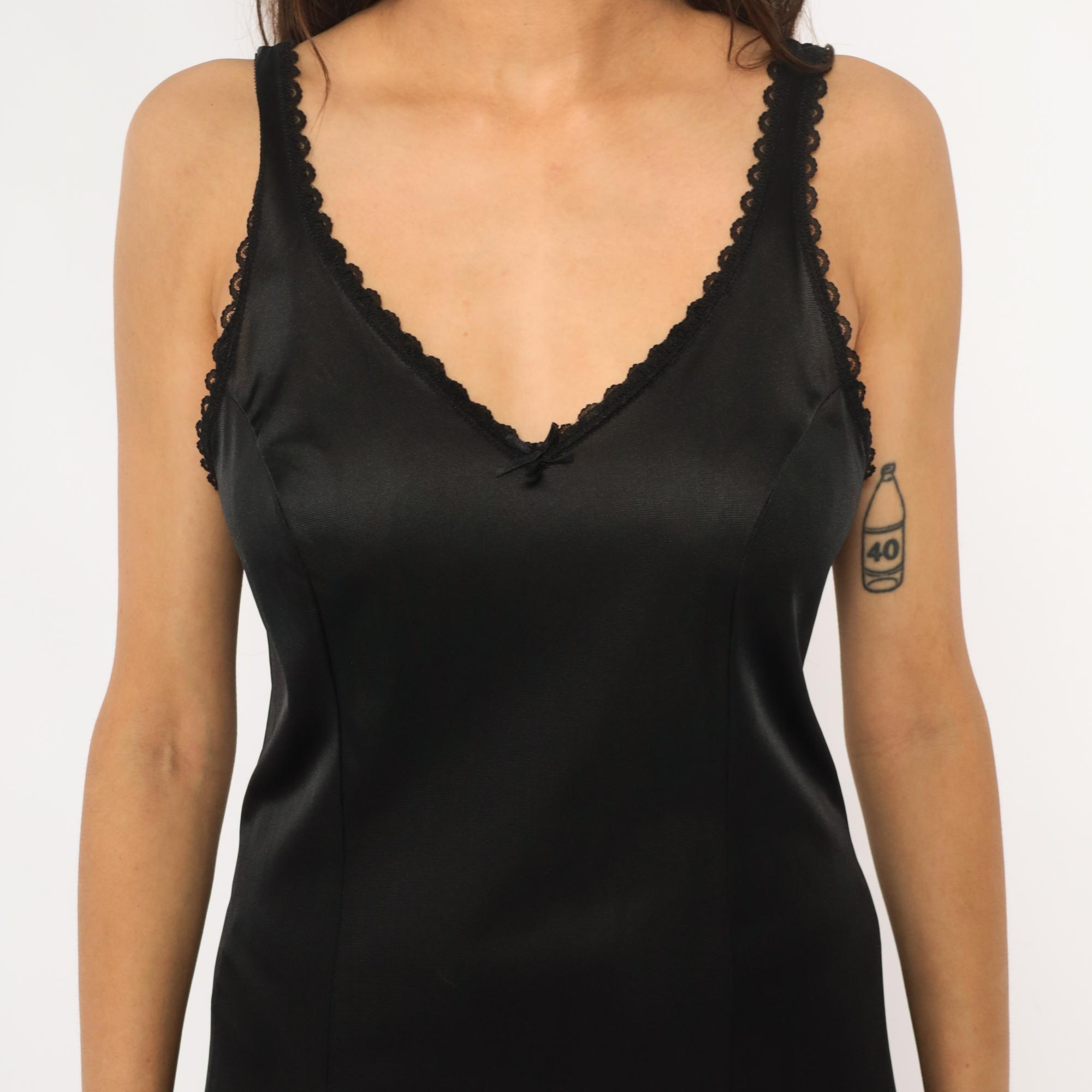80s black slip dress from Warners with scalloped lace trim at V-neckline, straps, and hem. Fitted silhouette, midi length. Nylon.