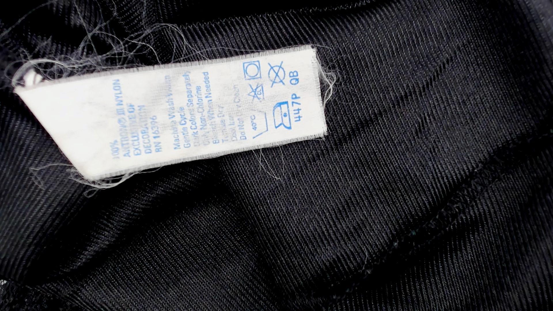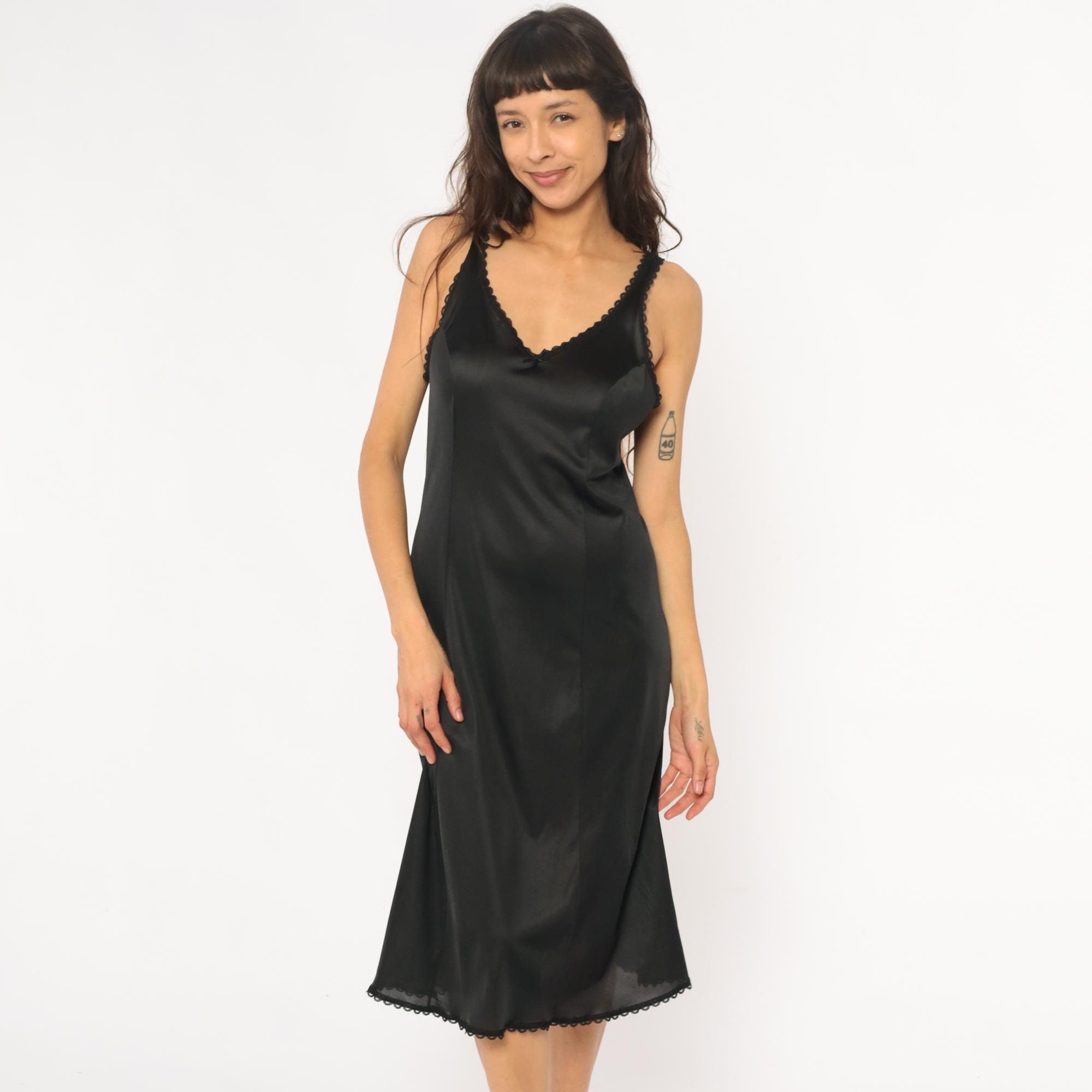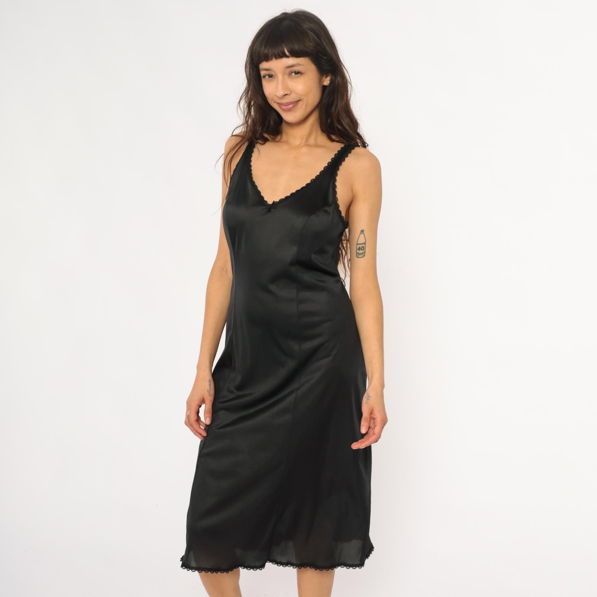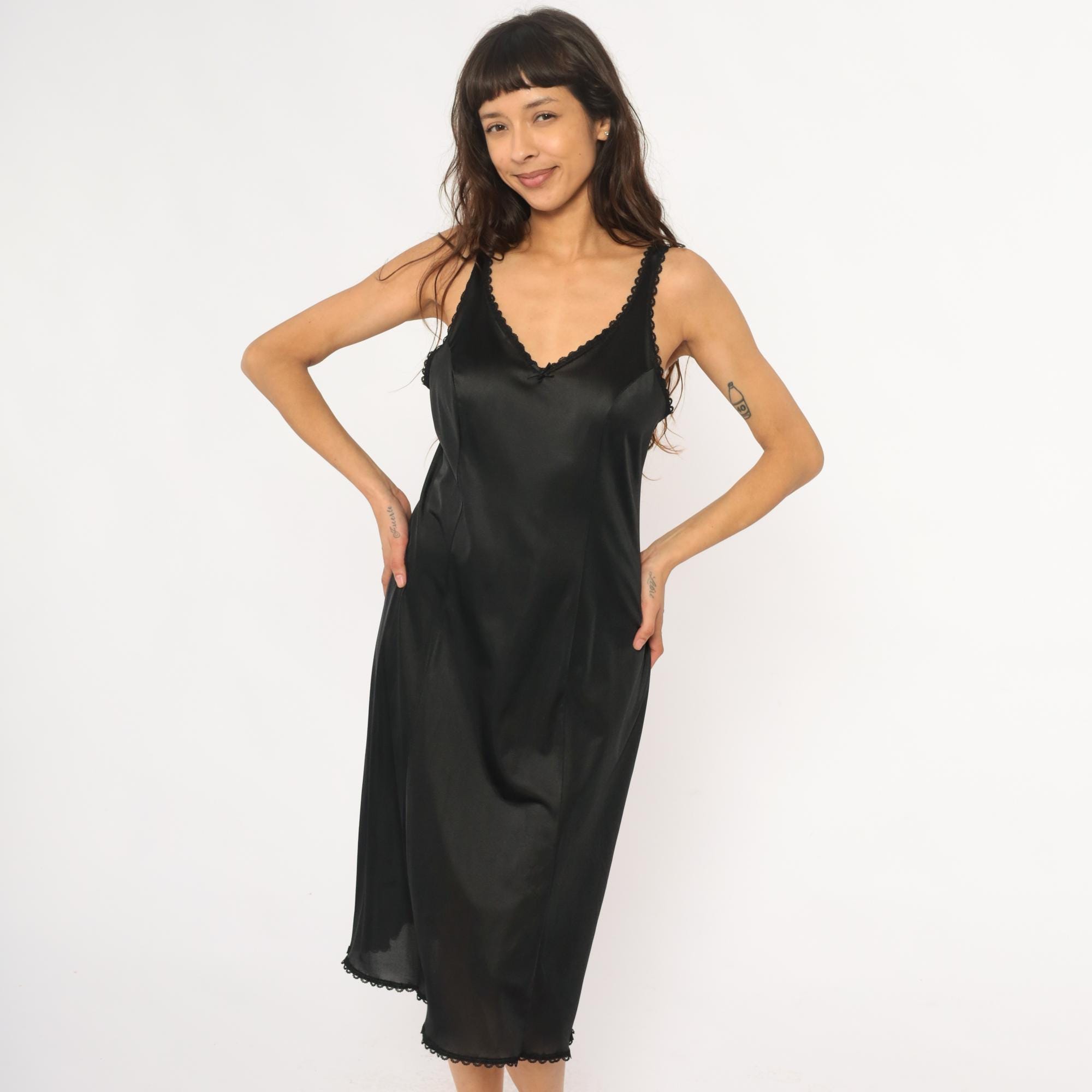 80s black slip dress from Warners with scalloped lace trim at V-neckline, straps, and hem. Fitted silhouette, midi length. Nylon.