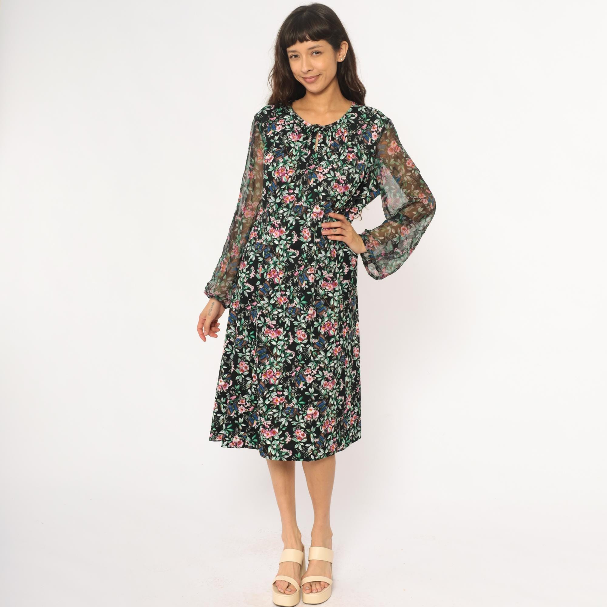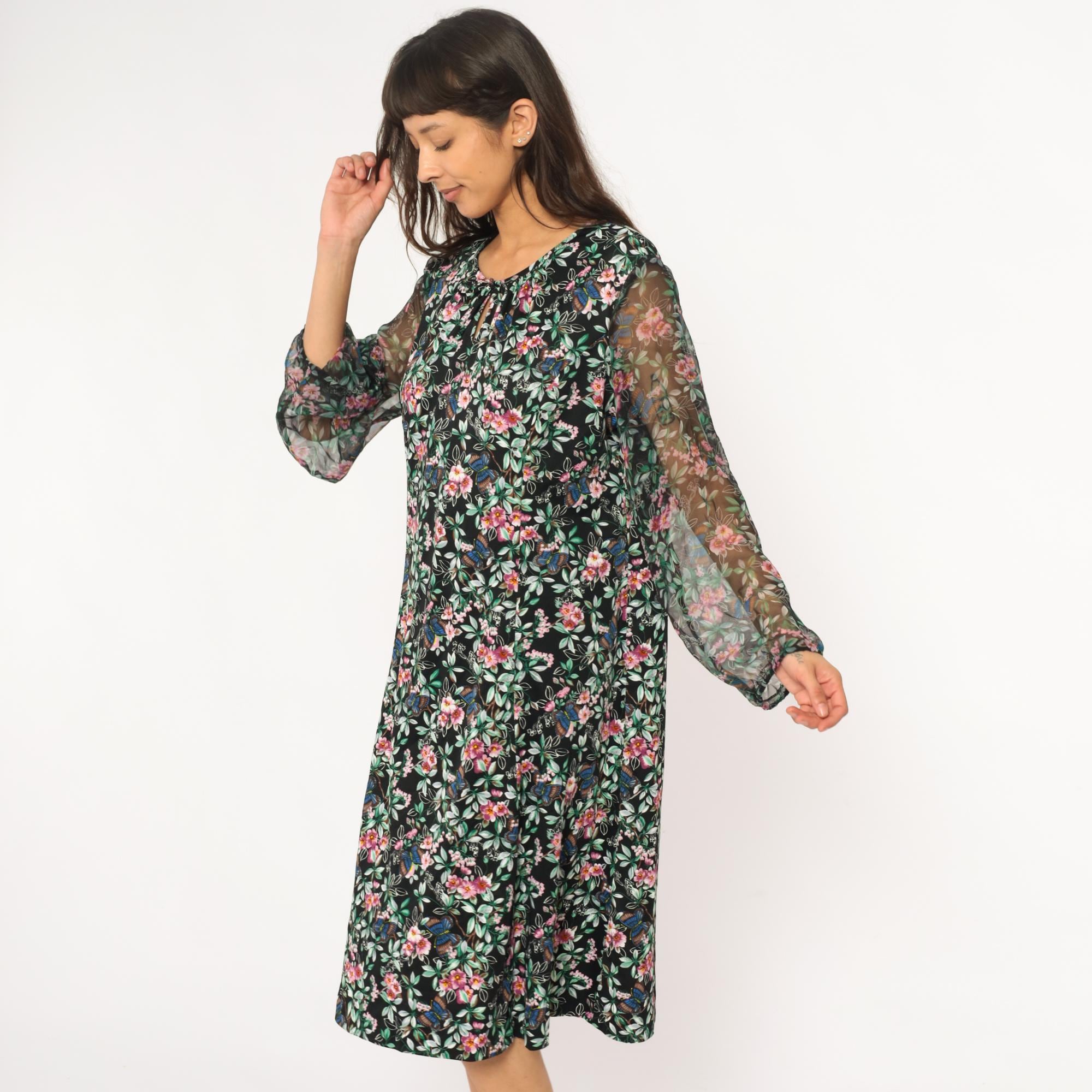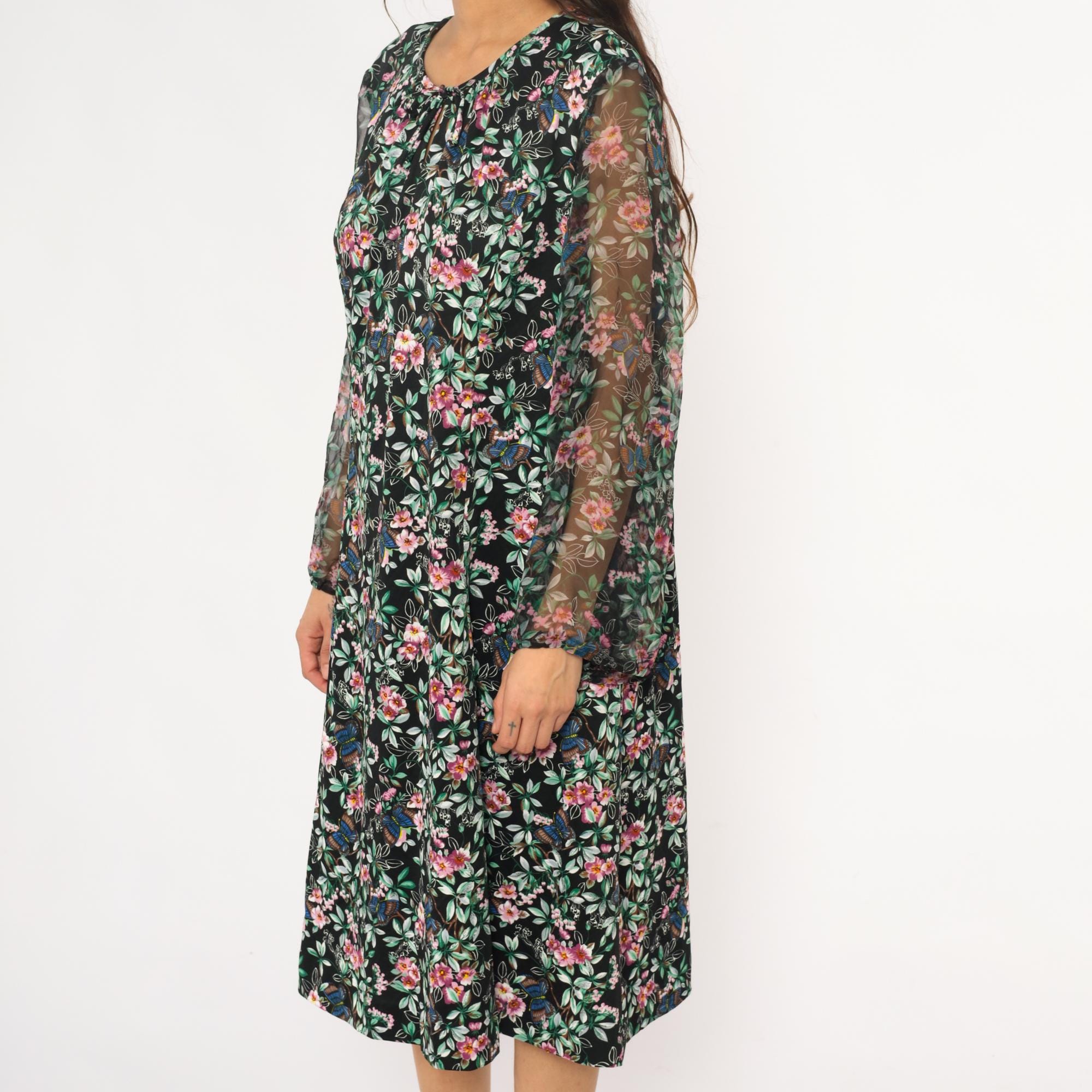 70s black floral midi dress with butterfly and flower print in pink, green, white, and blue. V-neckline with gathered pintuck detail at front, long sheer sleeves with elastic cuffs.