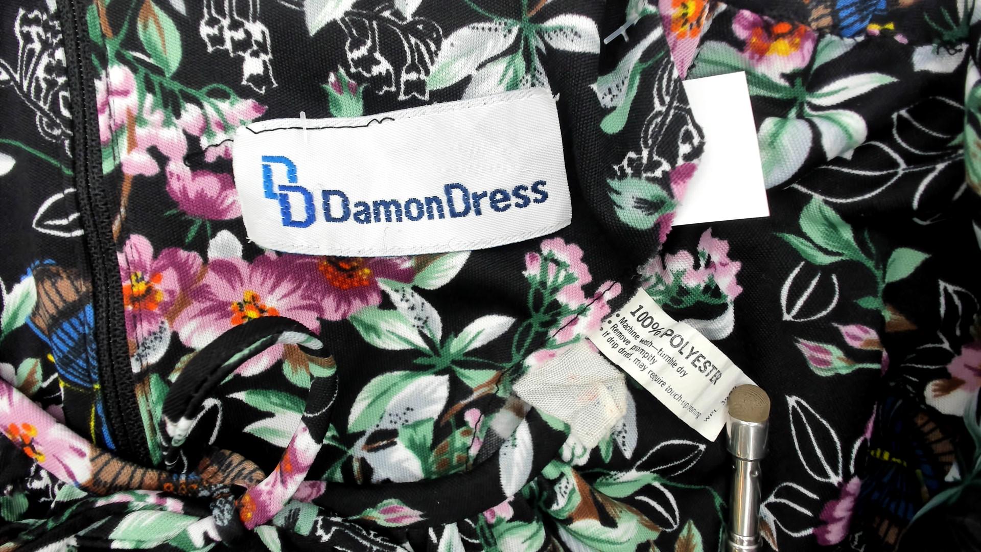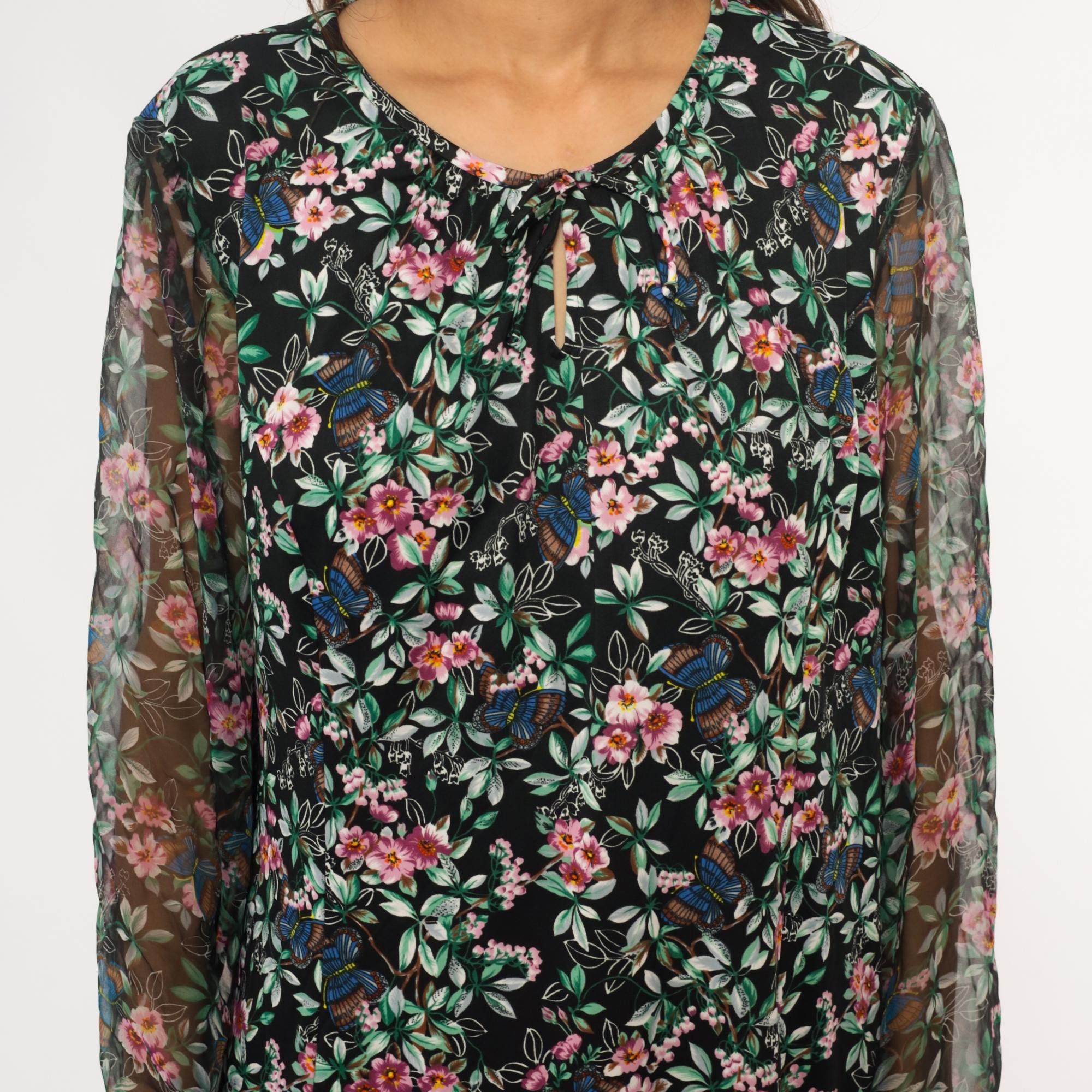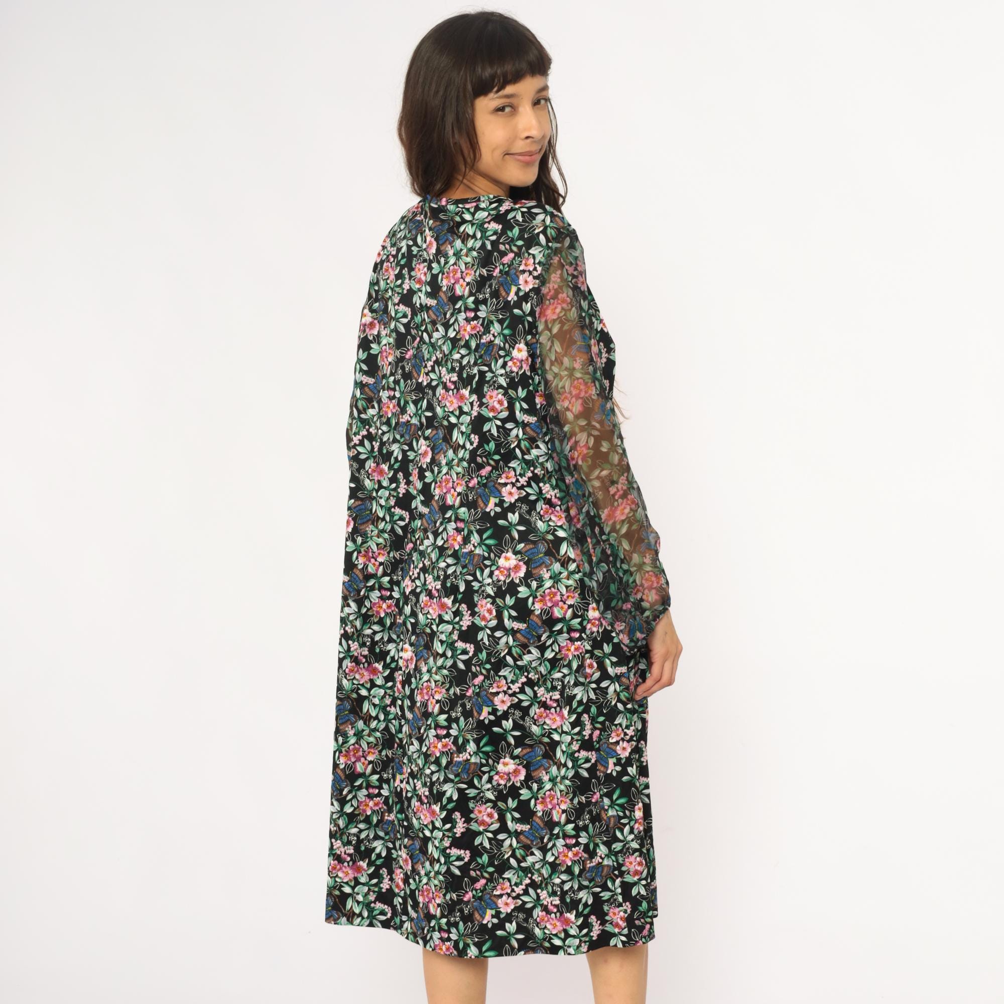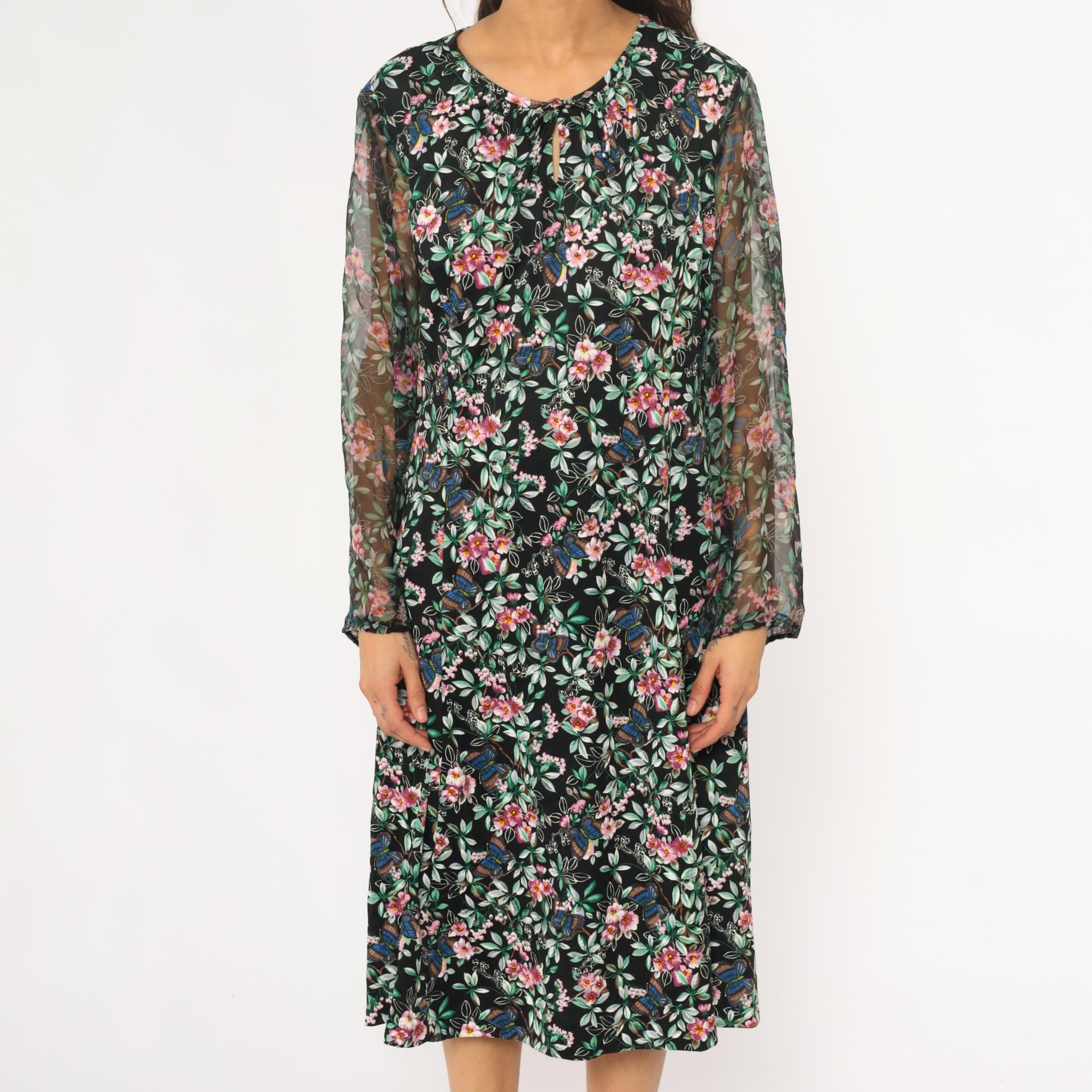 70s black floral midi dress with butterfly and flower print in pink, green, white, and blue. V-neckline with gathered pintuck detail at front, long sheer sleeves with elastic cuffs.