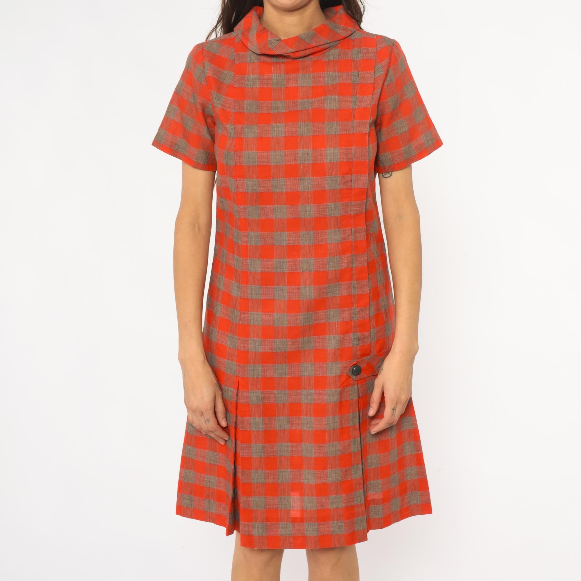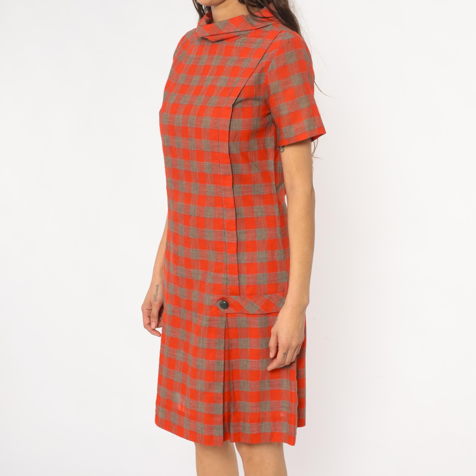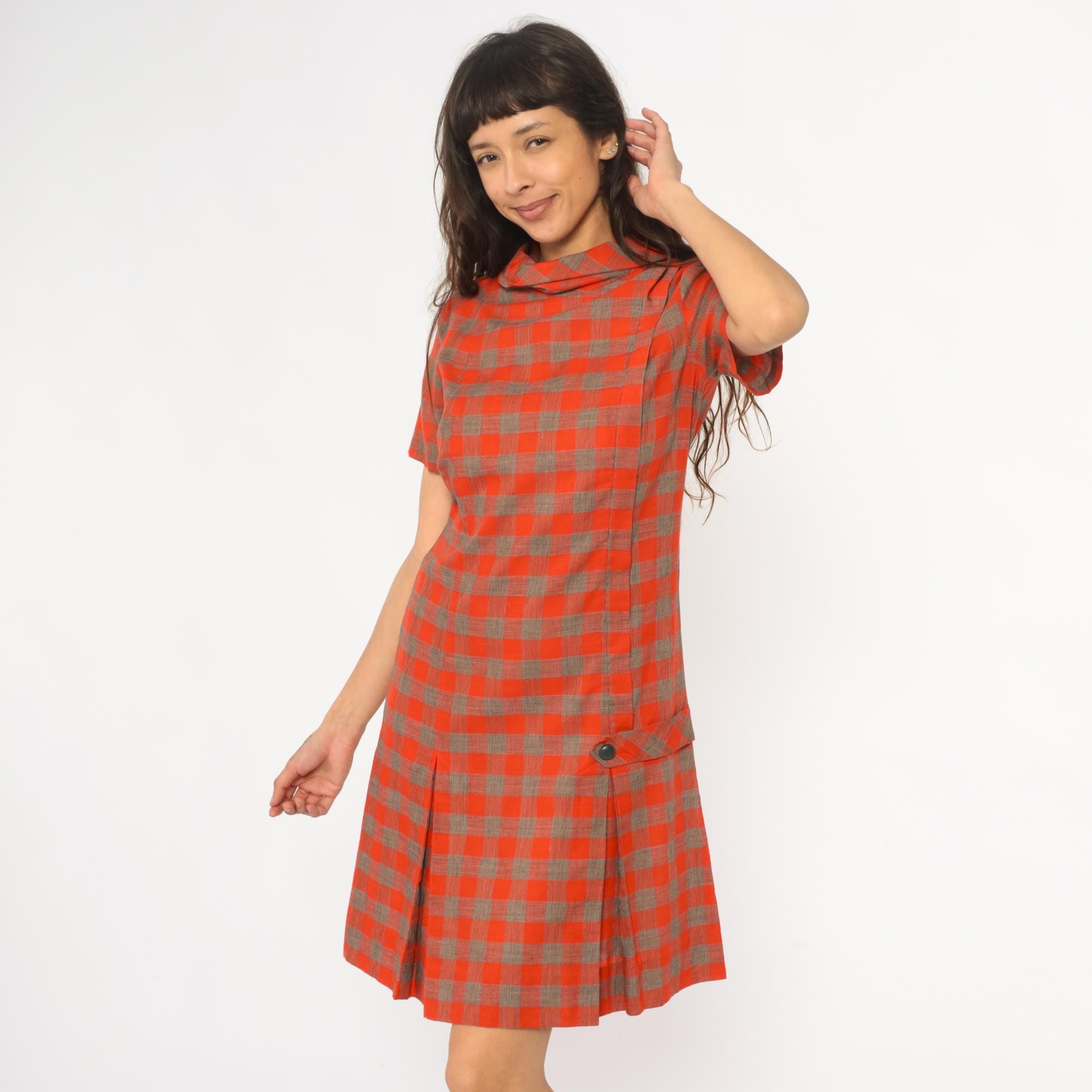 60s orange and brown plaid shift dress with drop waist construction and pointed collar. Short sleeves, button closure detail at hip, pleated skirt section.