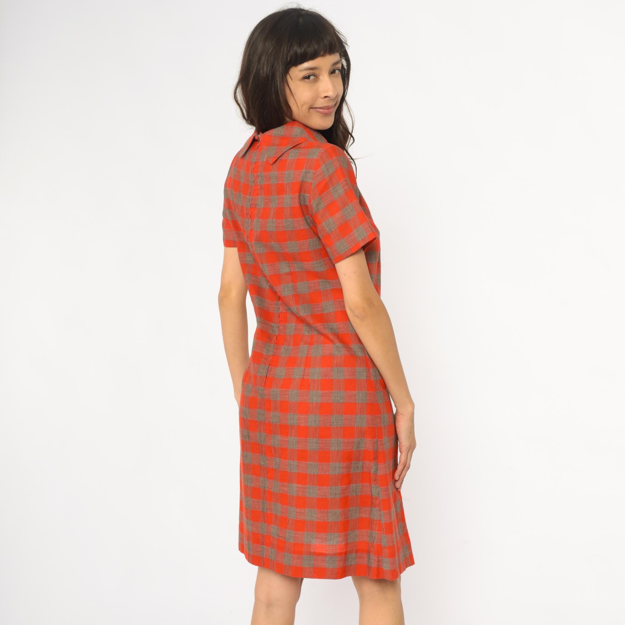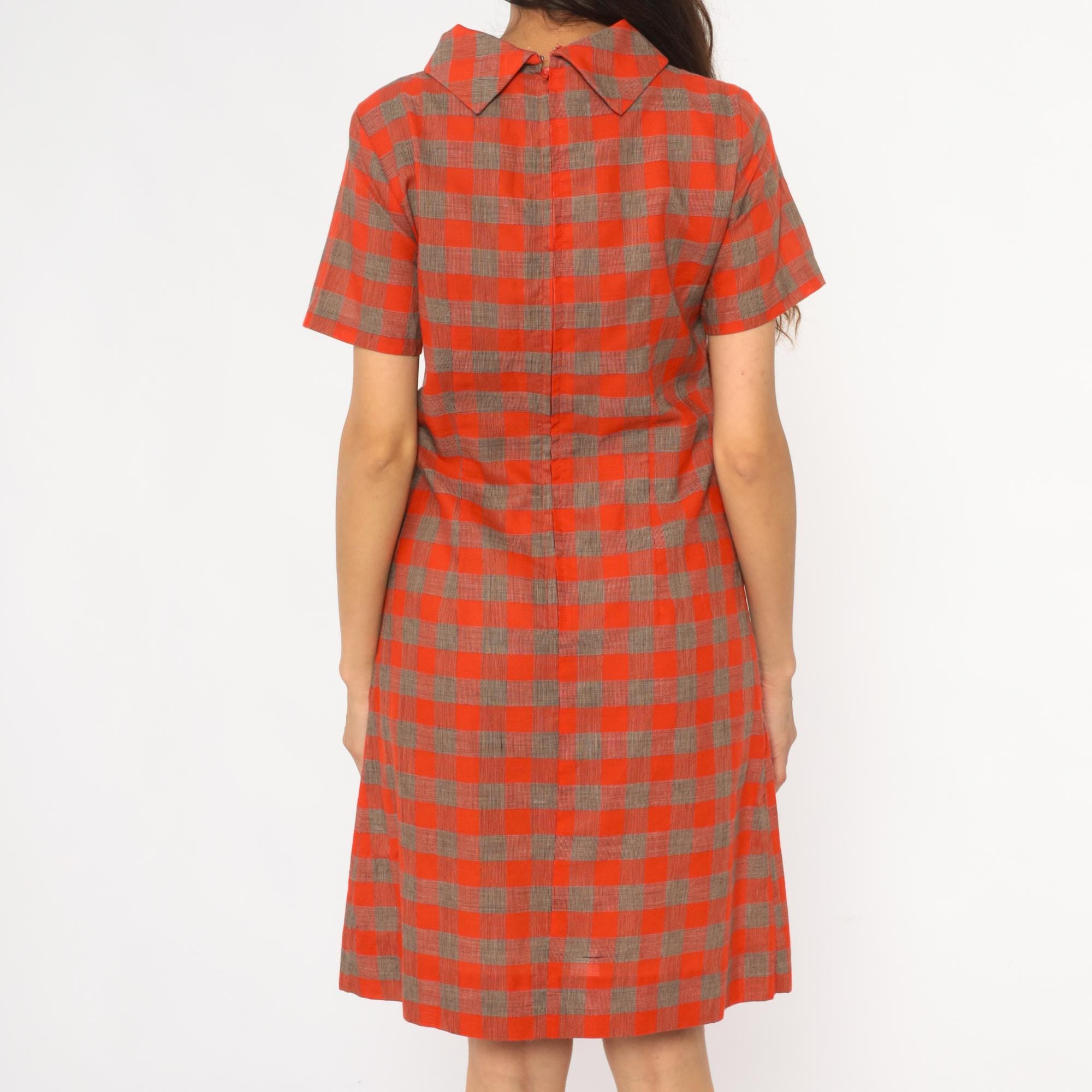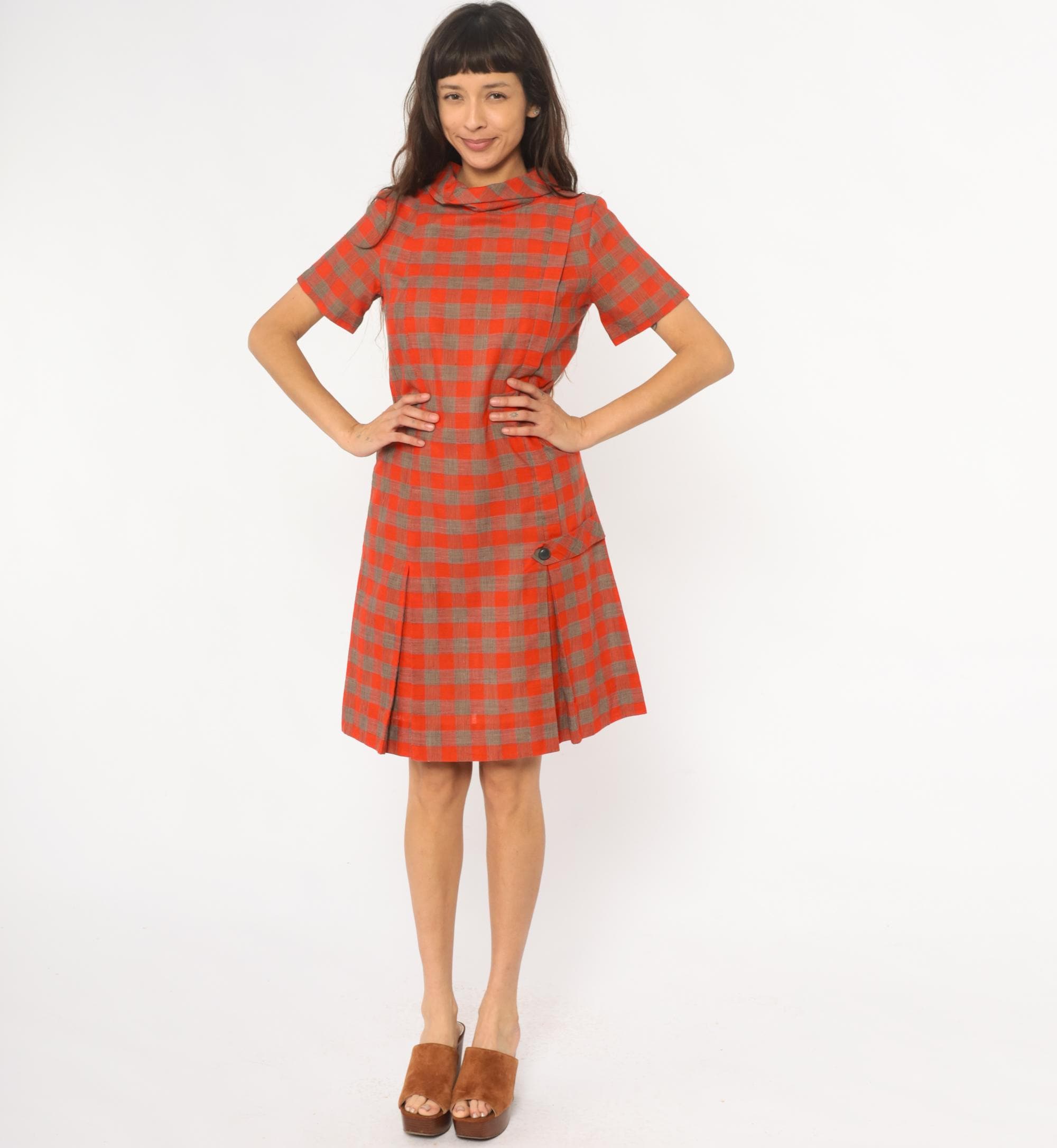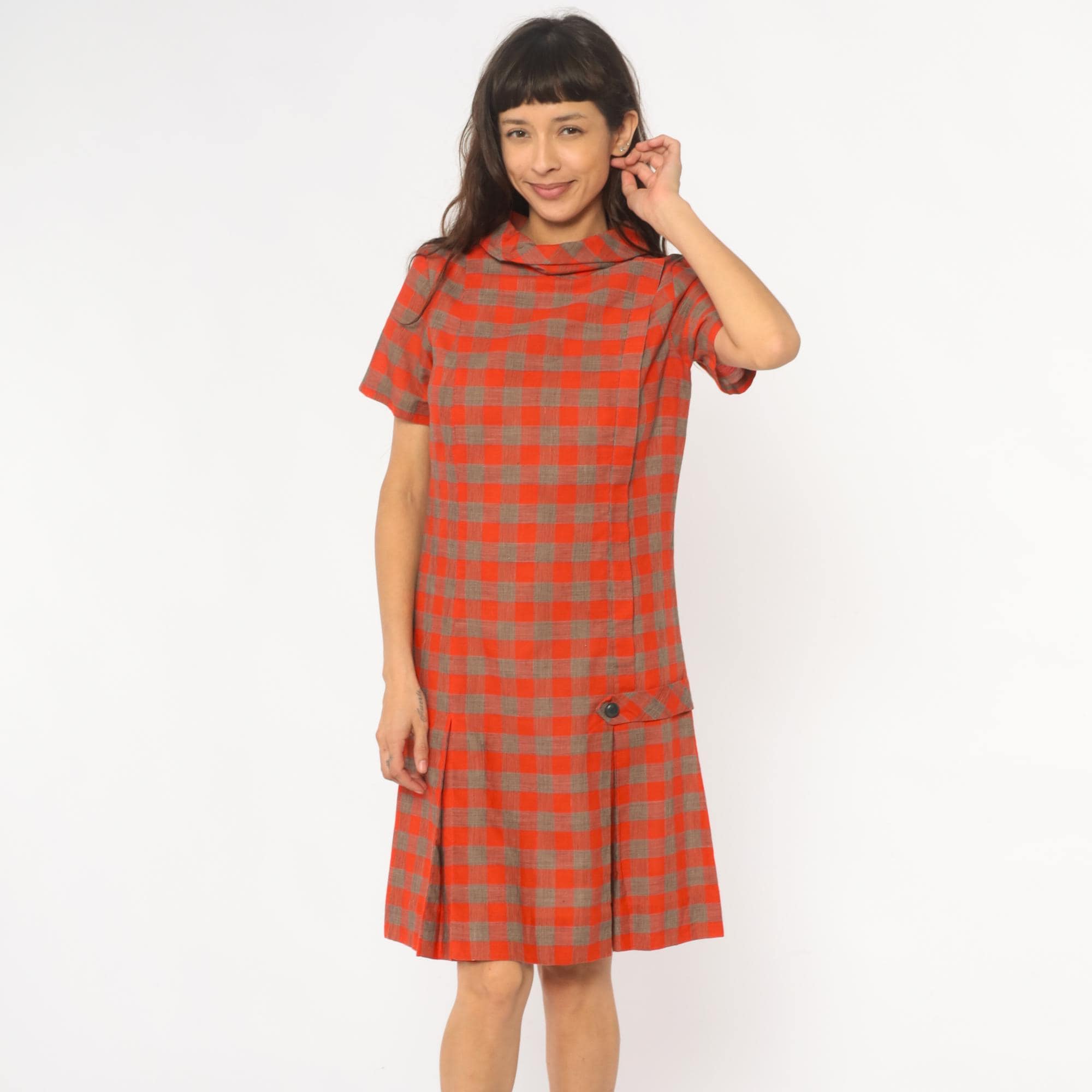 60s orange and brown plaid shift dress with drop waist construction and pointed collar. Short sleeves, button closure detail at hip, pleated skirt section.