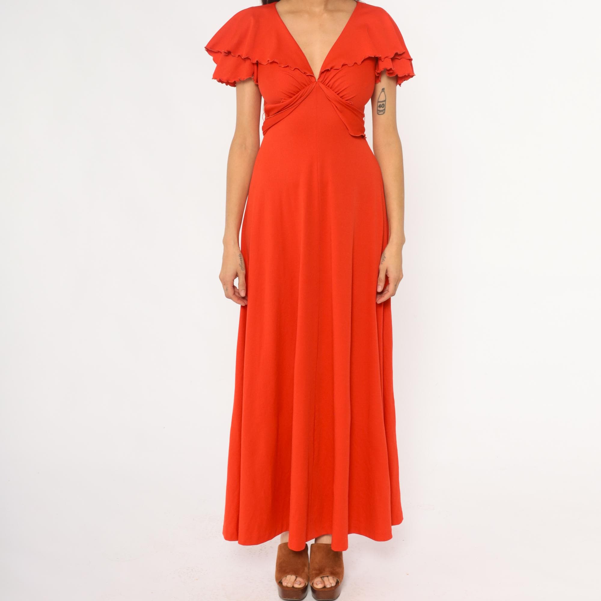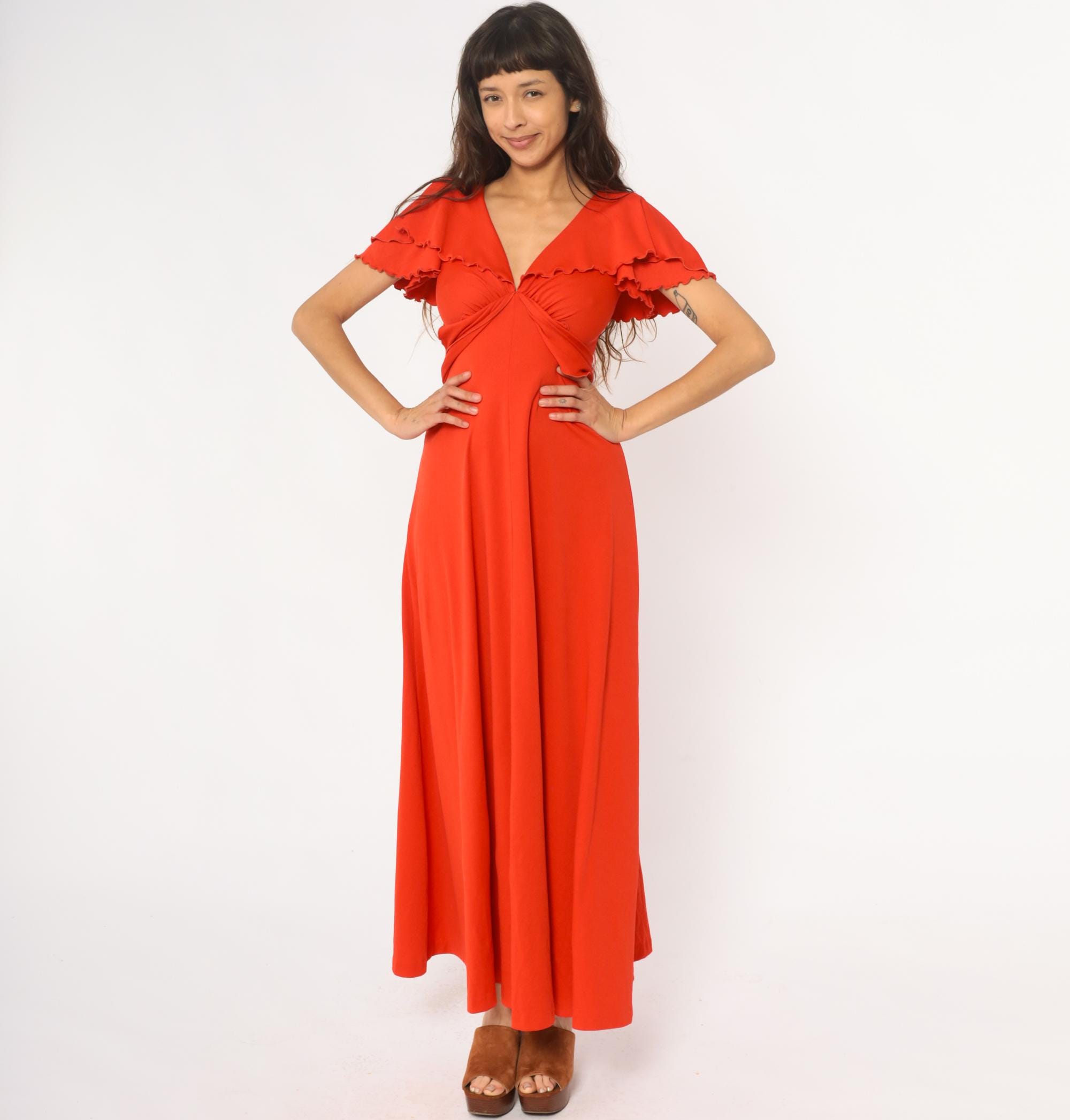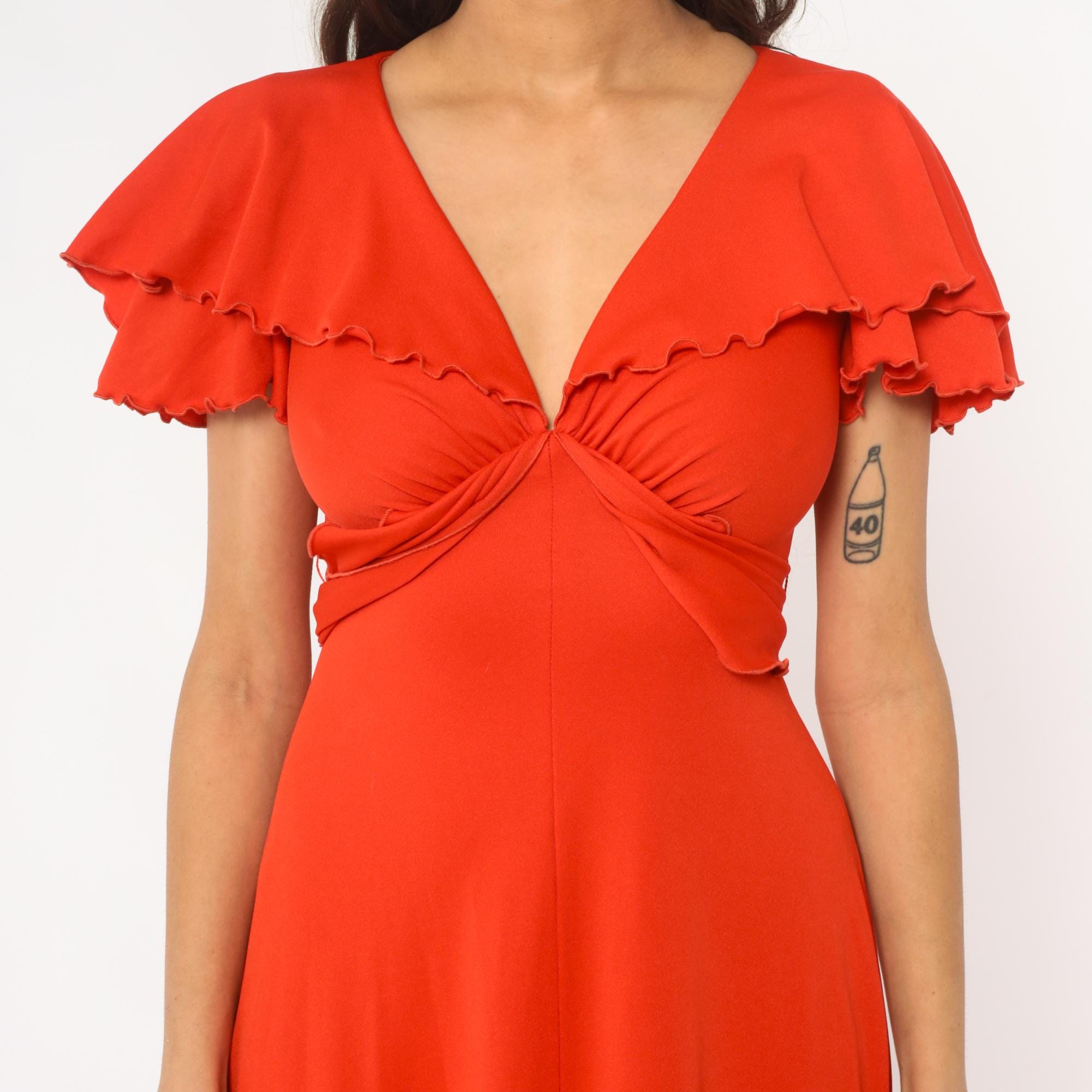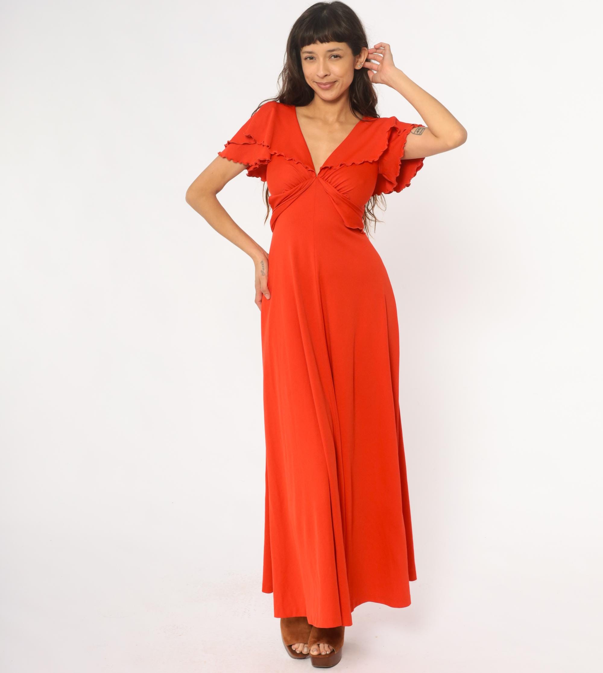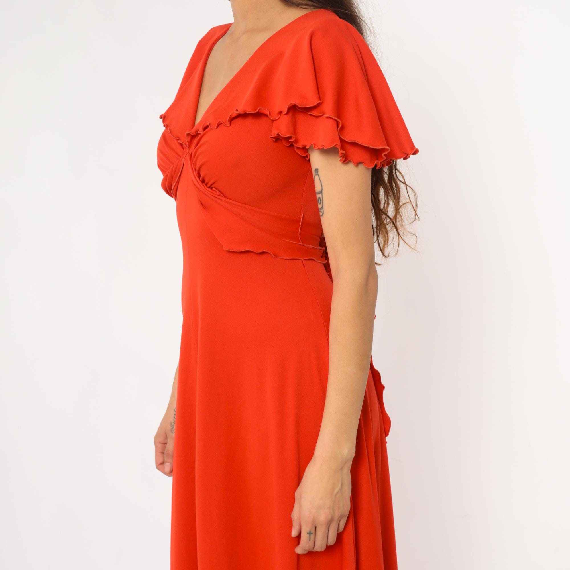 70s red-orange maxi dress with V-neckline and gathered bodice detail. Short flutter sleeves with scalloped ruffle trim, empire waist with tie closure at back. Long A-line skirt. Polyester.