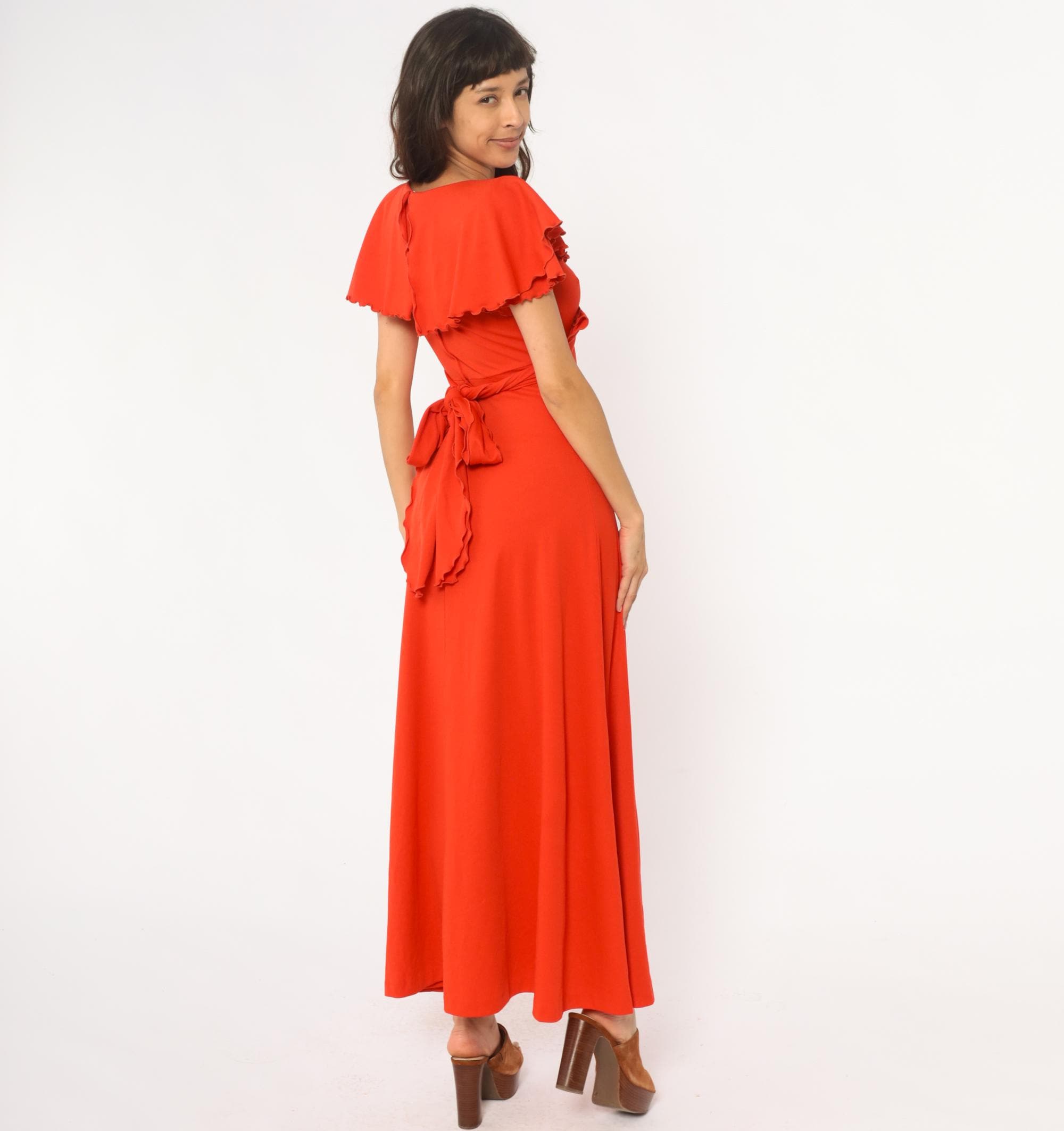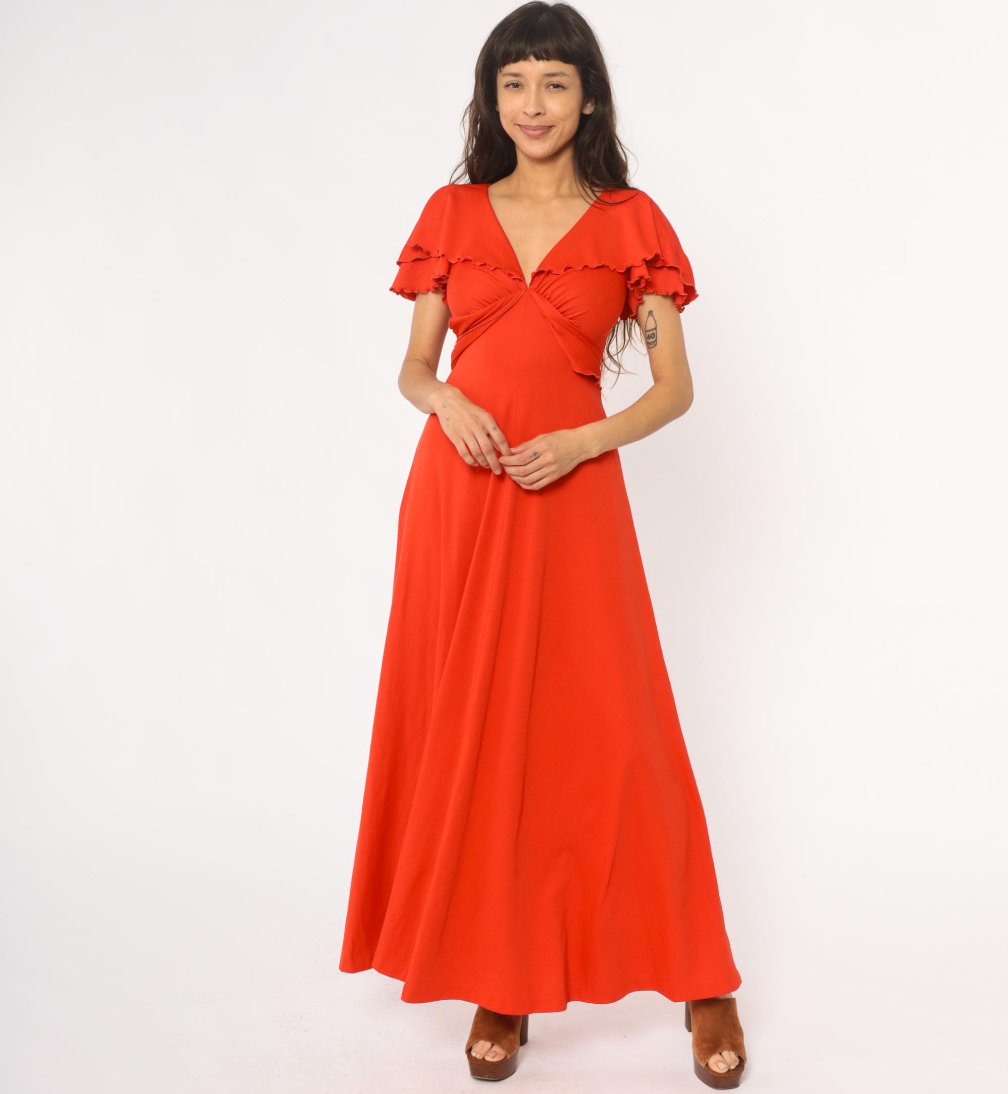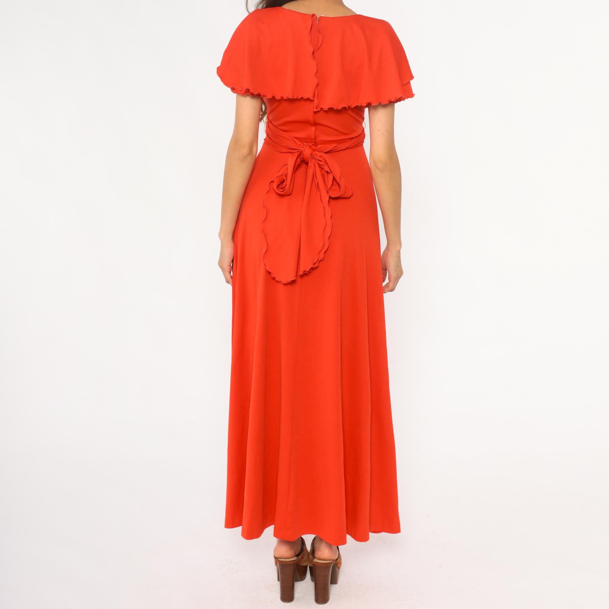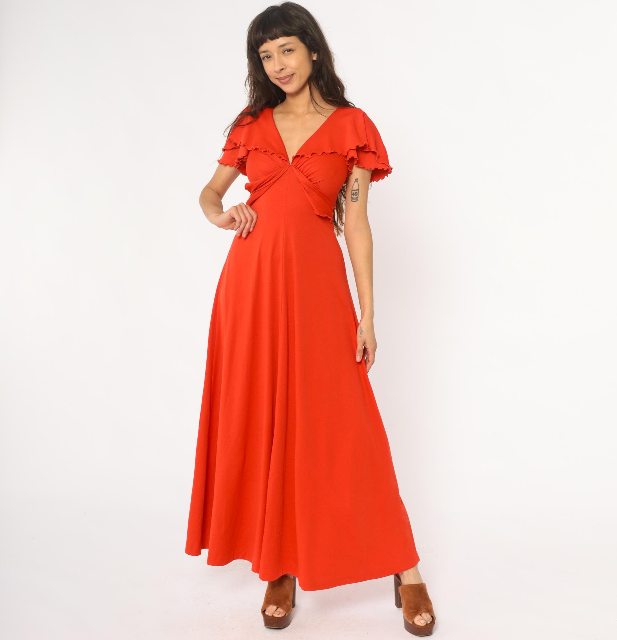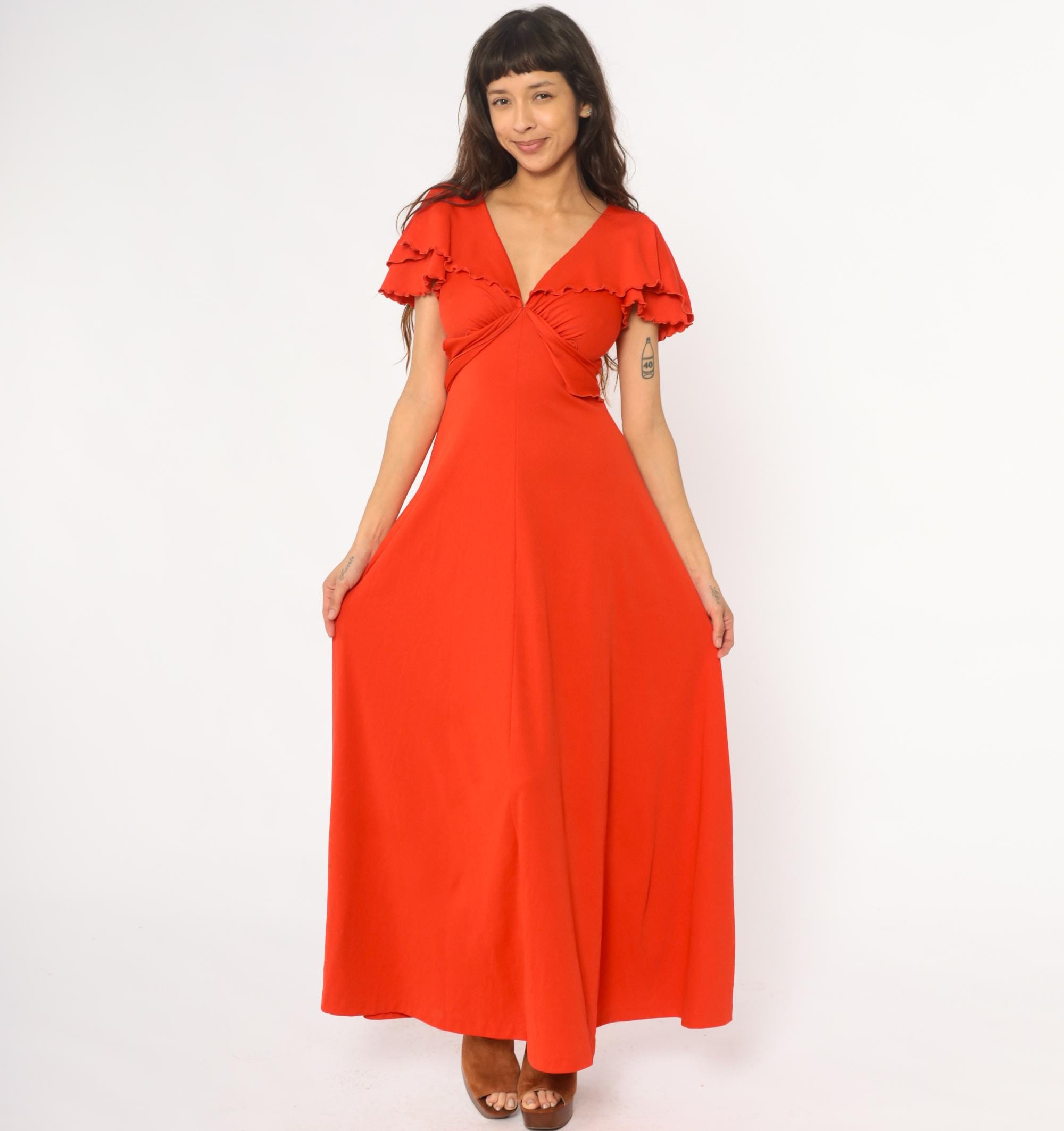 70s red-orange maxi dress with V-neckline and gathered bodice detail. Short flutter sleeves with scalloped ruffle trim, empire waist with tie closure at back. Long A-line skirt. Polyester.