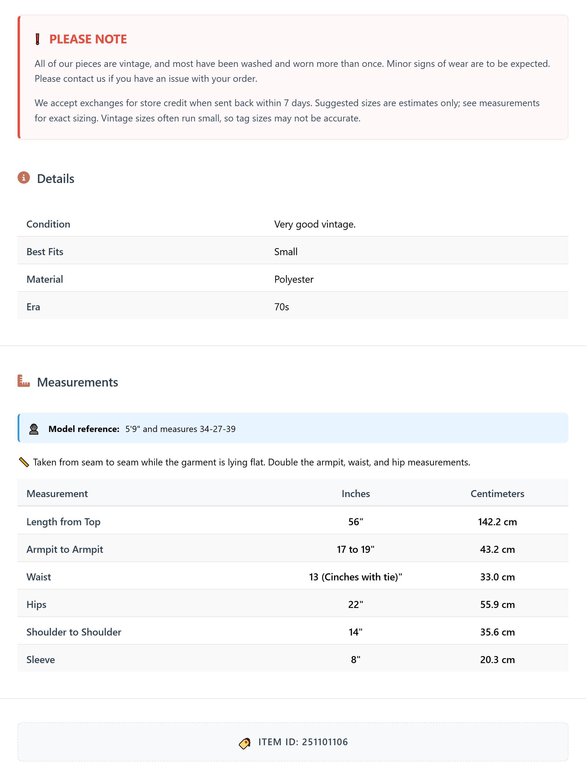 All of our pieces are vintage, and most have been washed and worn more than once. Minor signs of wear are to be expected. Please contact us if you have an issue with your order. We accept exchanges for store credit when sent back within 7 days.