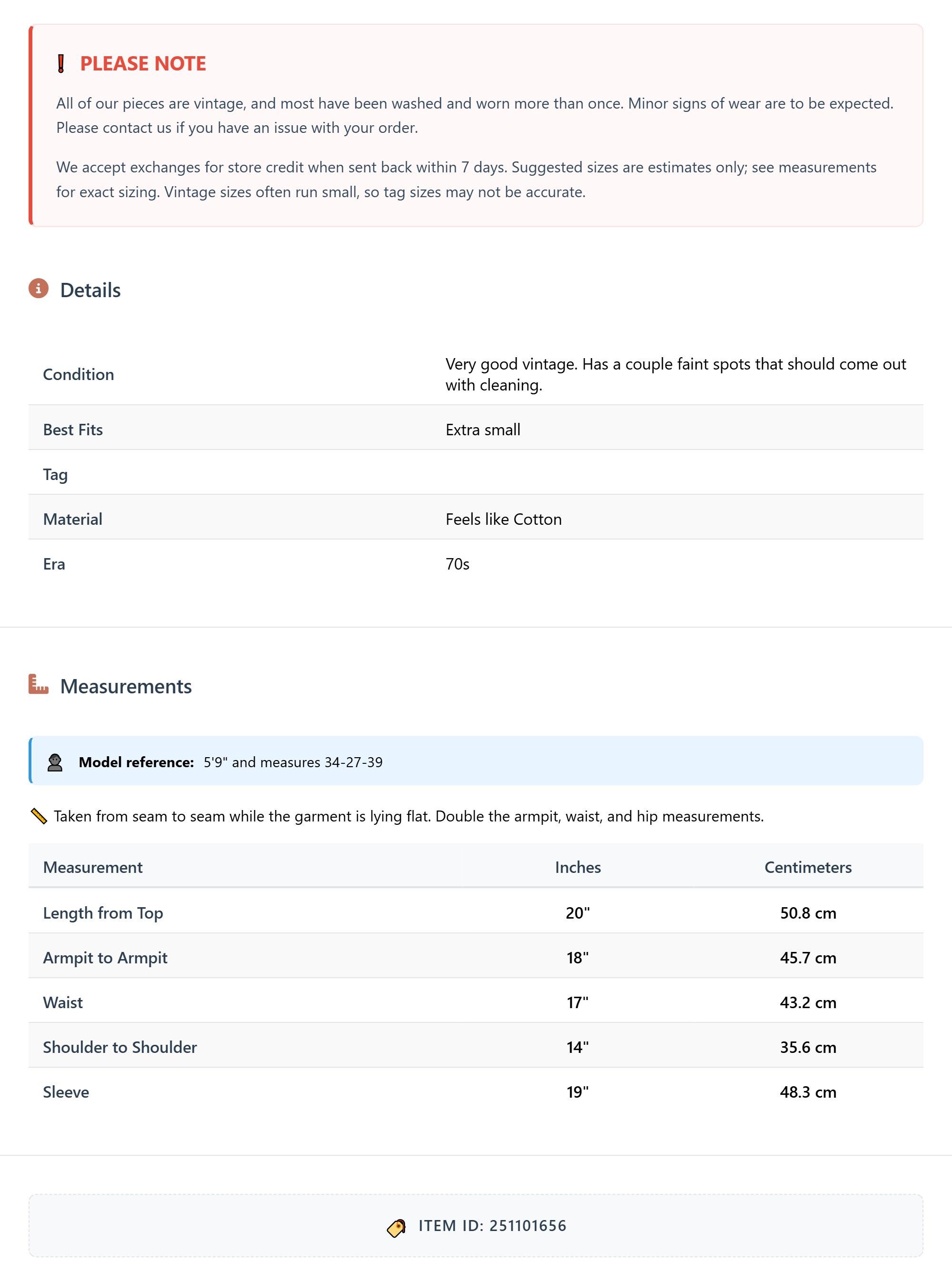 All of our pieces are vintage, and most have been washed and worn more than once. Minor signs of wear are to be expected. Please contact us if you have an issue with your order. We accept exchanges for store credit when sent back within 7 days.