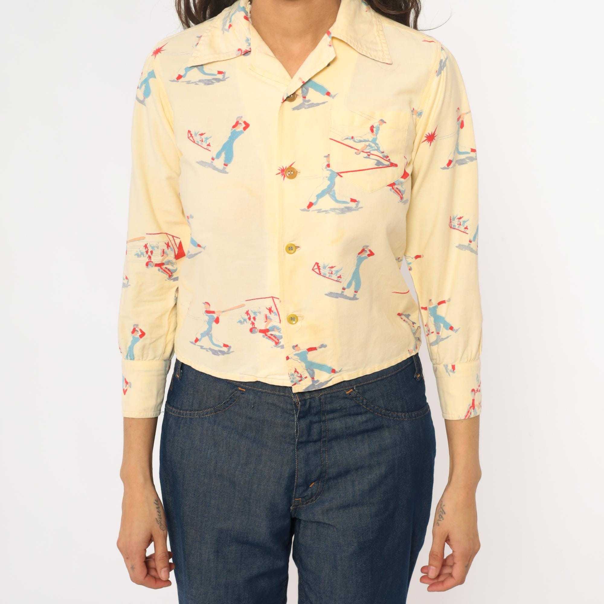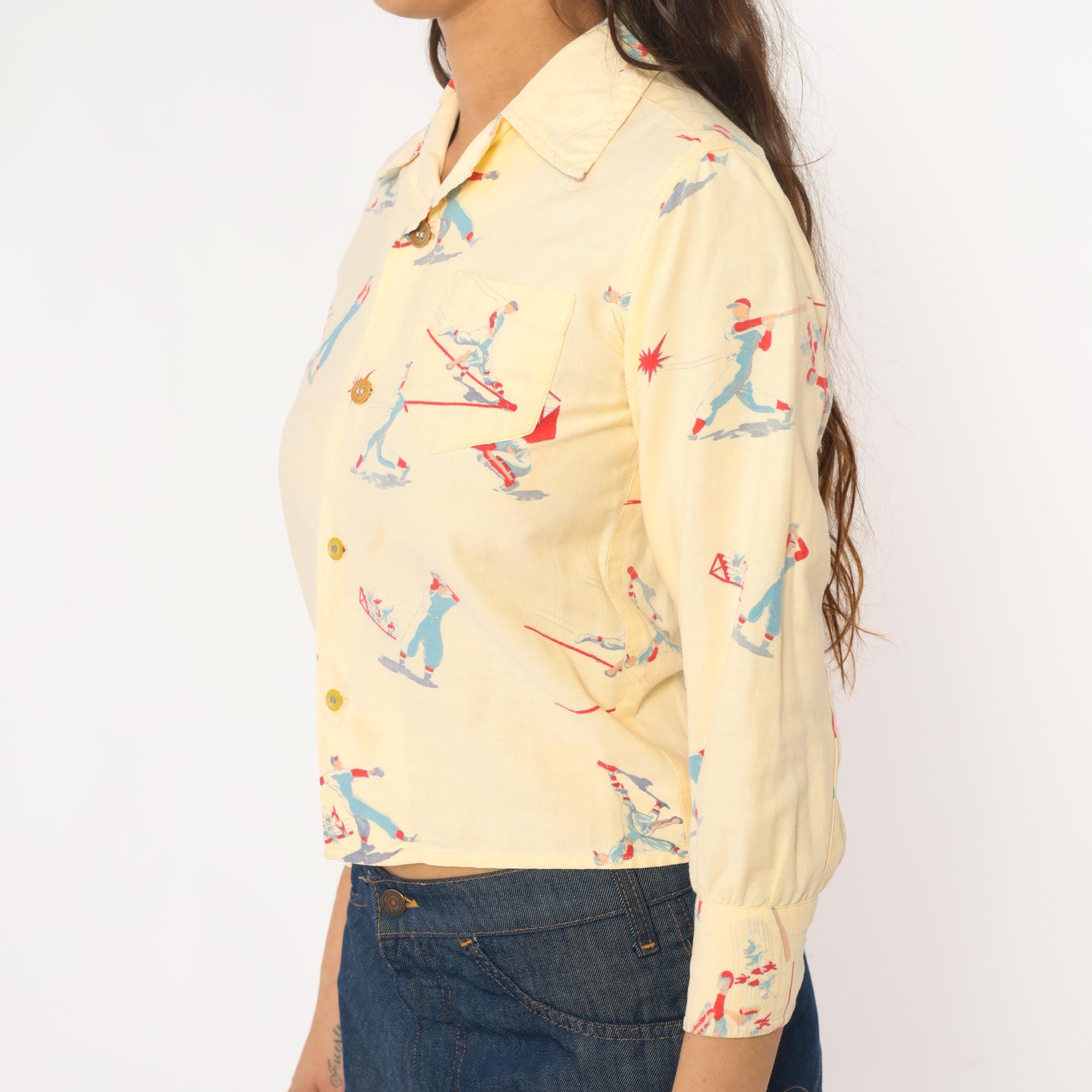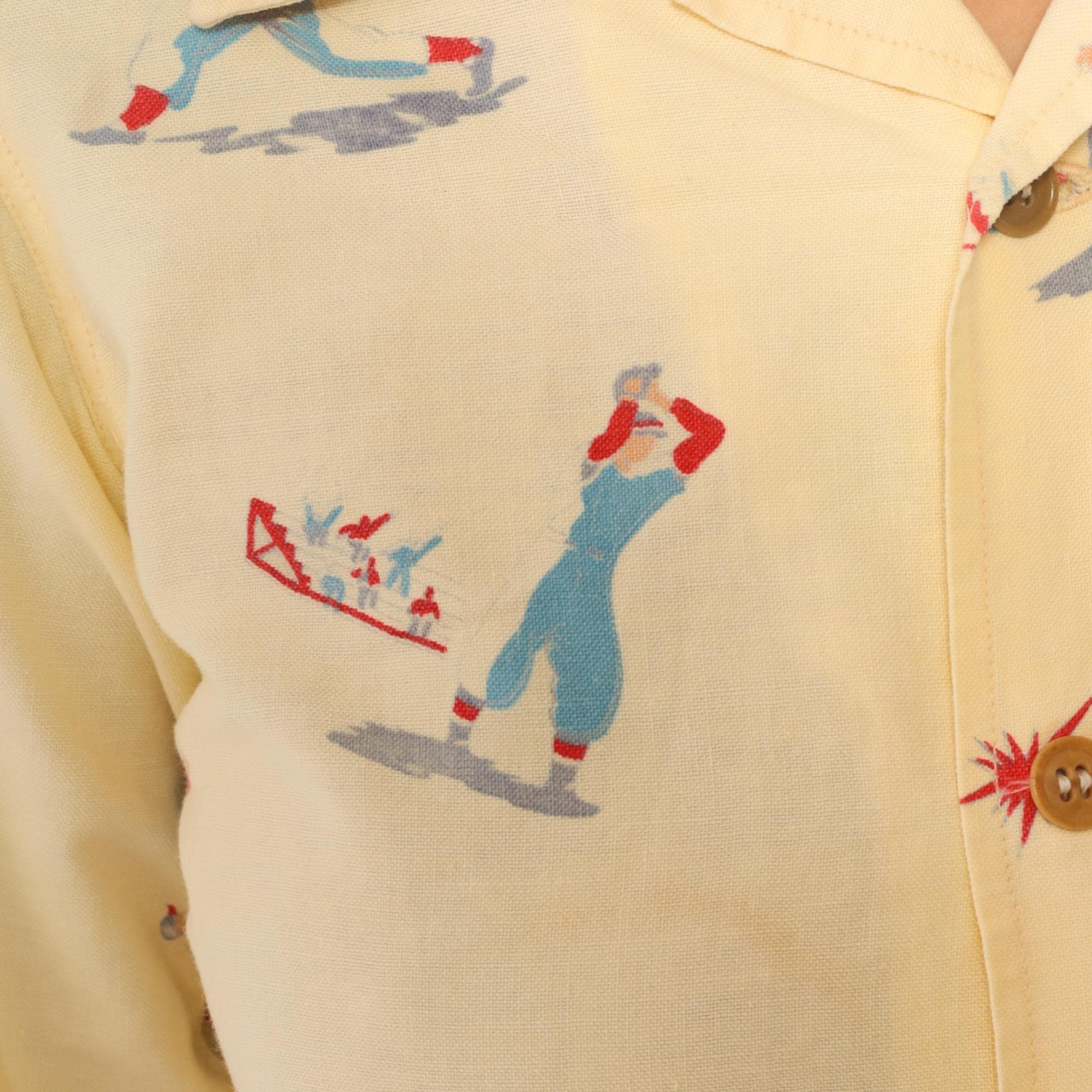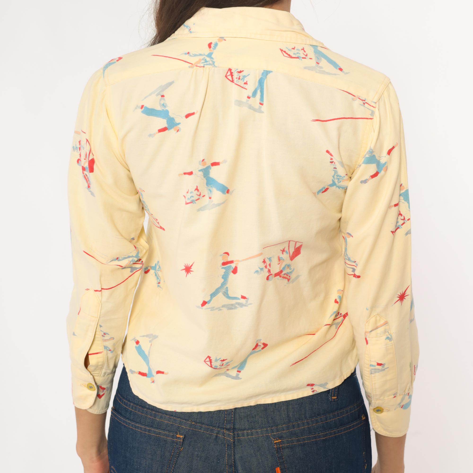70s pale yellow button front shirt with baseball novelty print throughout, figures in blue and red catching and throwing across the fabric. Pointed collar, long sleeves with button cuffs, front button closure with matching yellow buttons.