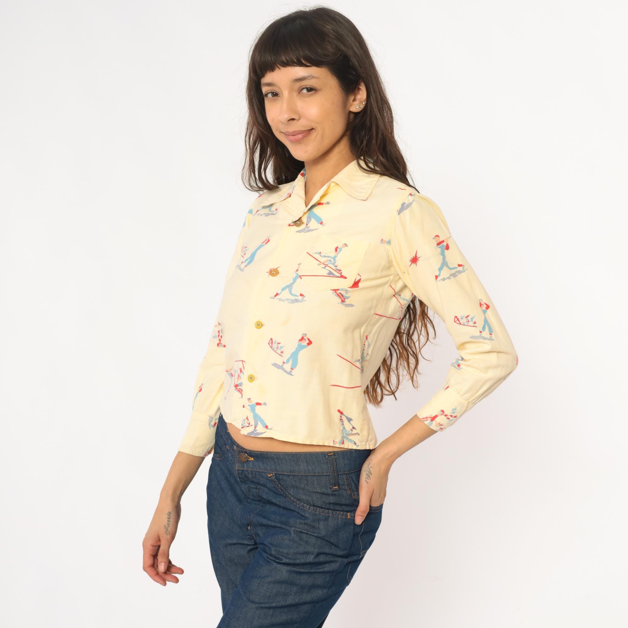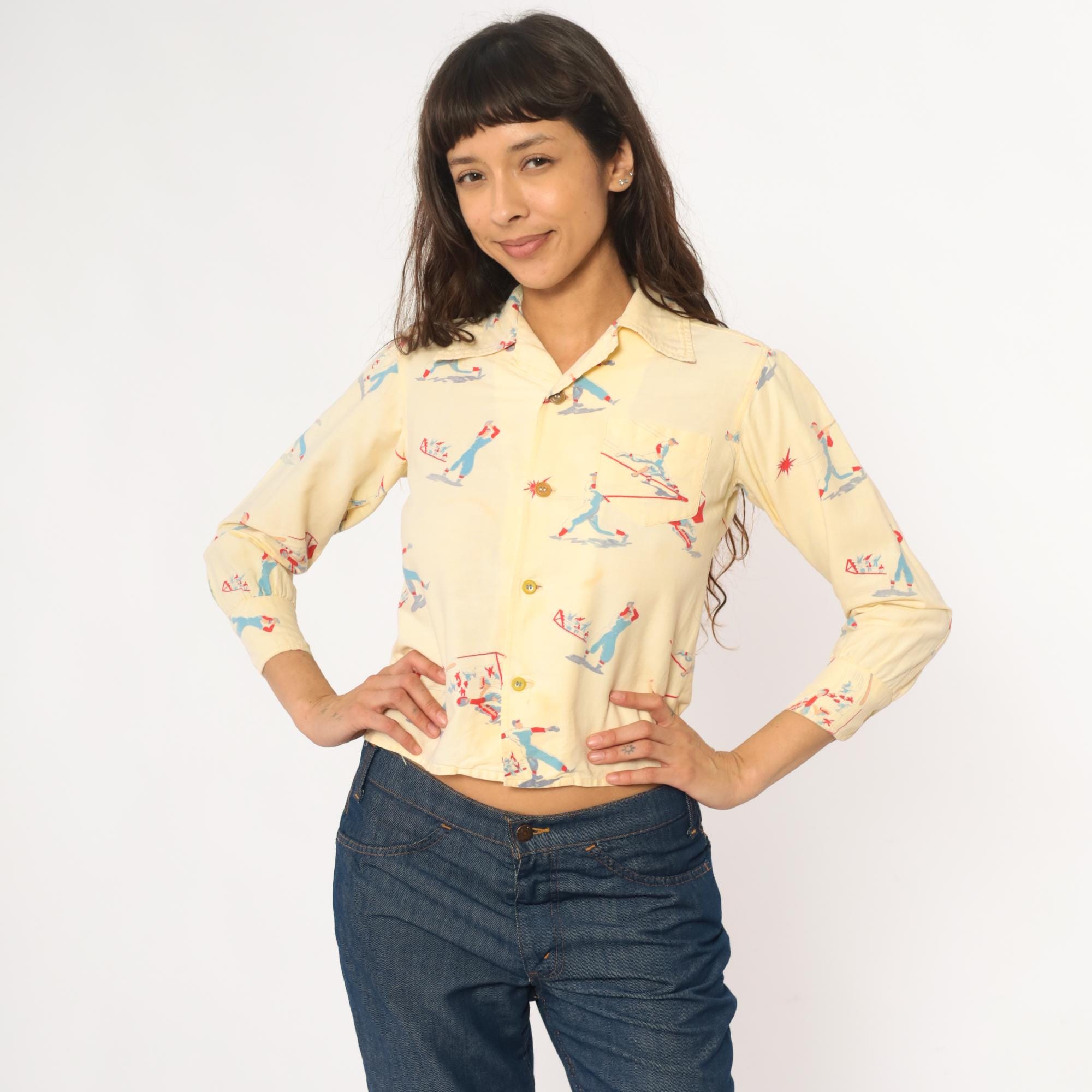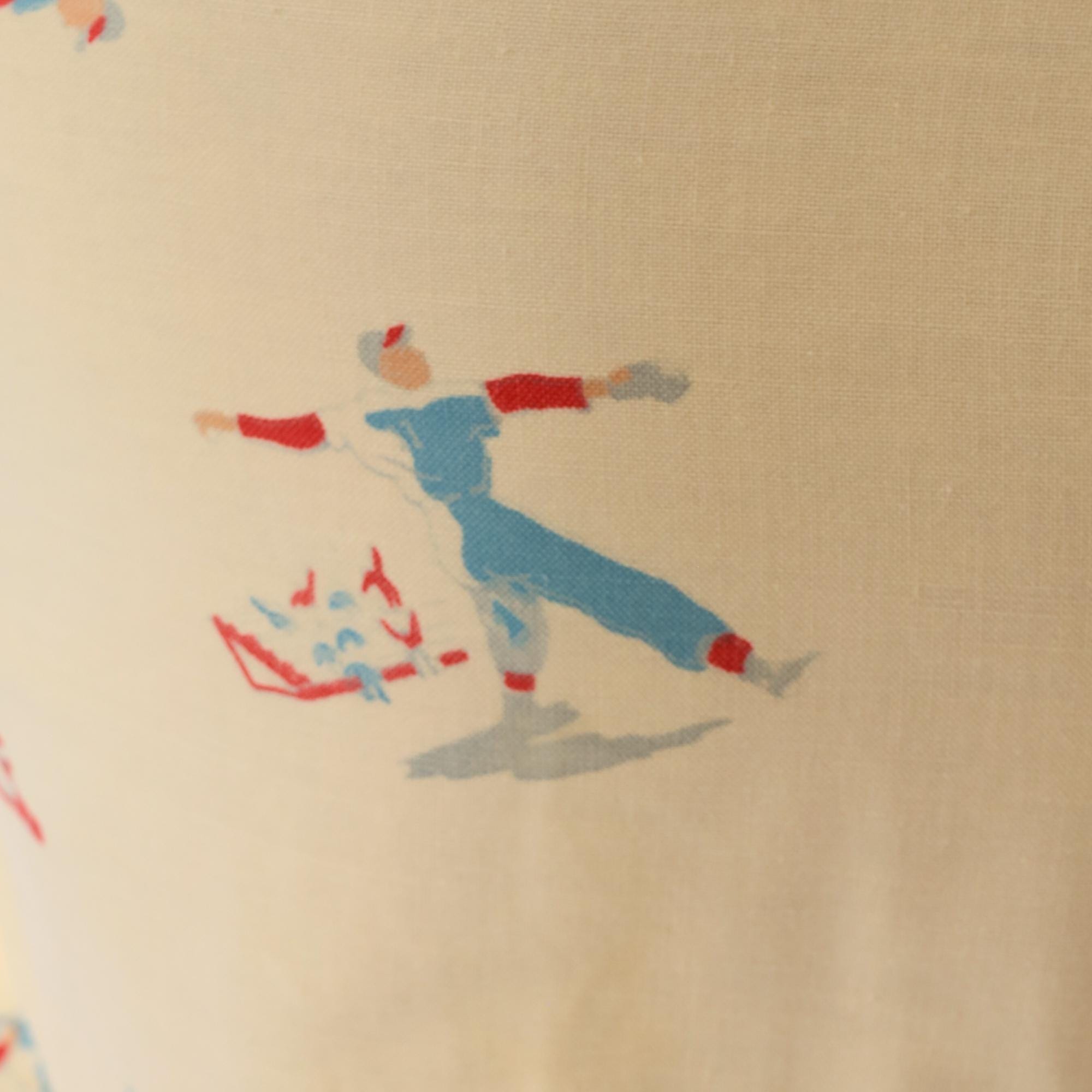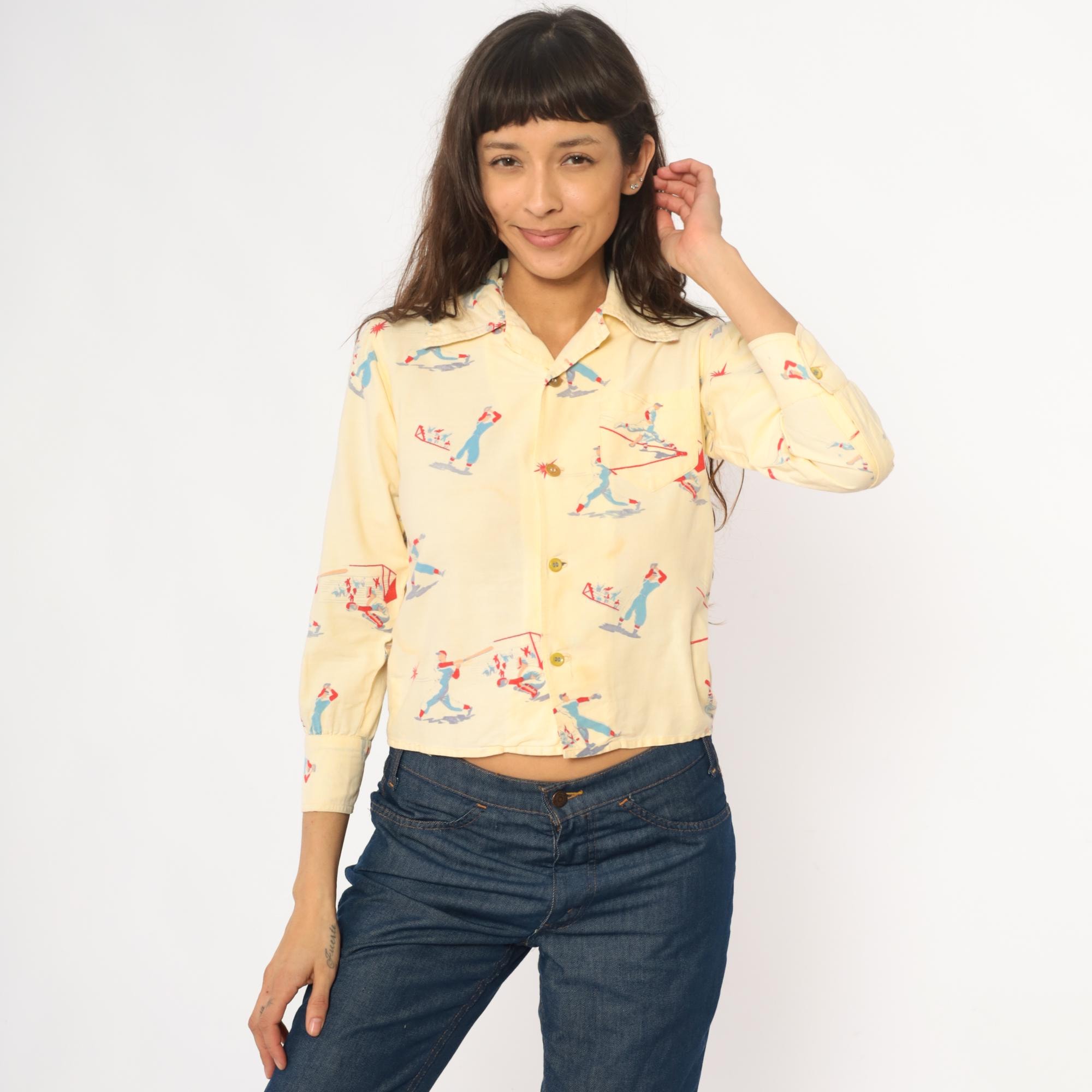 70s pale yellow button front shirt with baseball novelty print throughout, figures in blue and red catching and throwing across the fabric. Pointed collar, long sleeves with button cuffs, front button closure with matching yellow buttons.