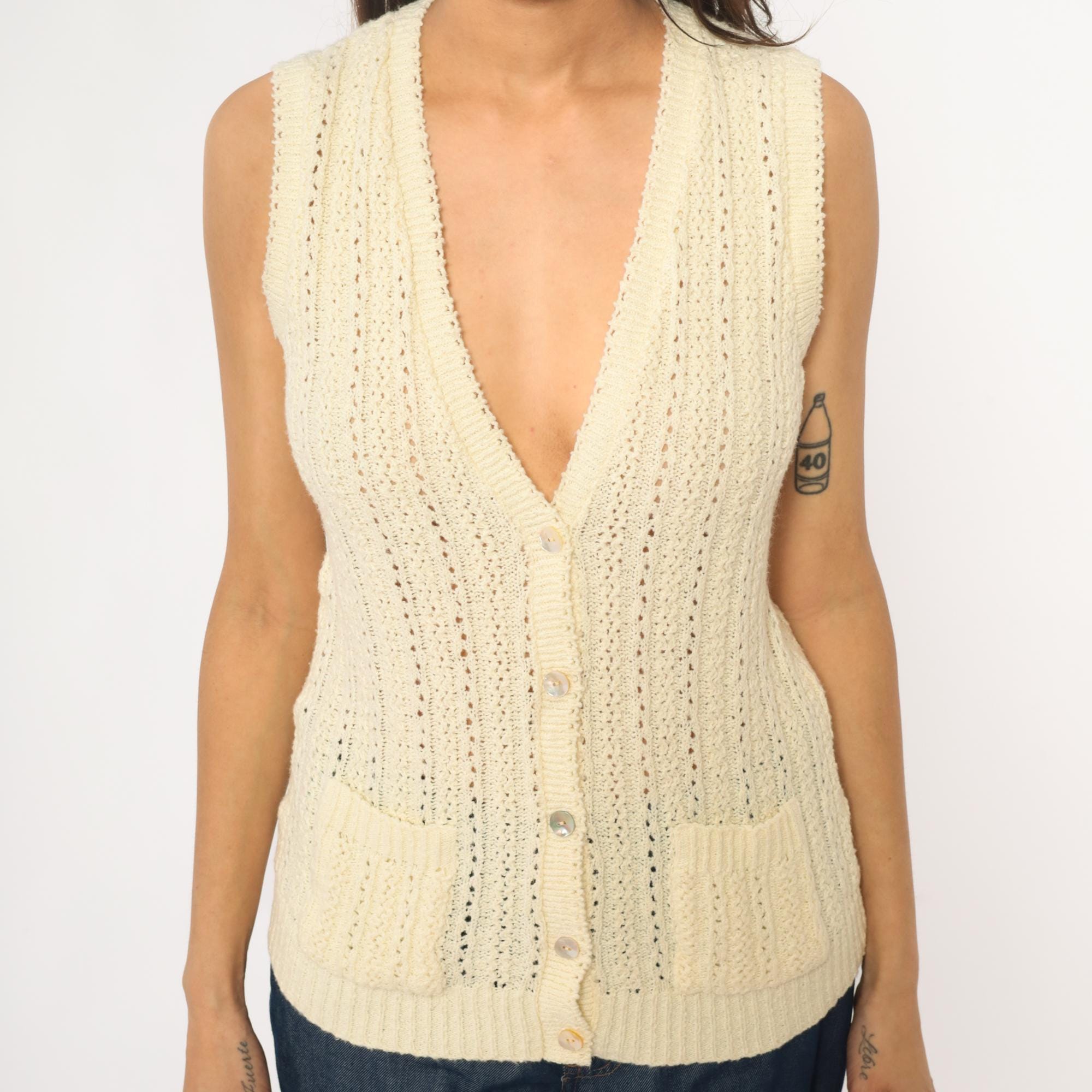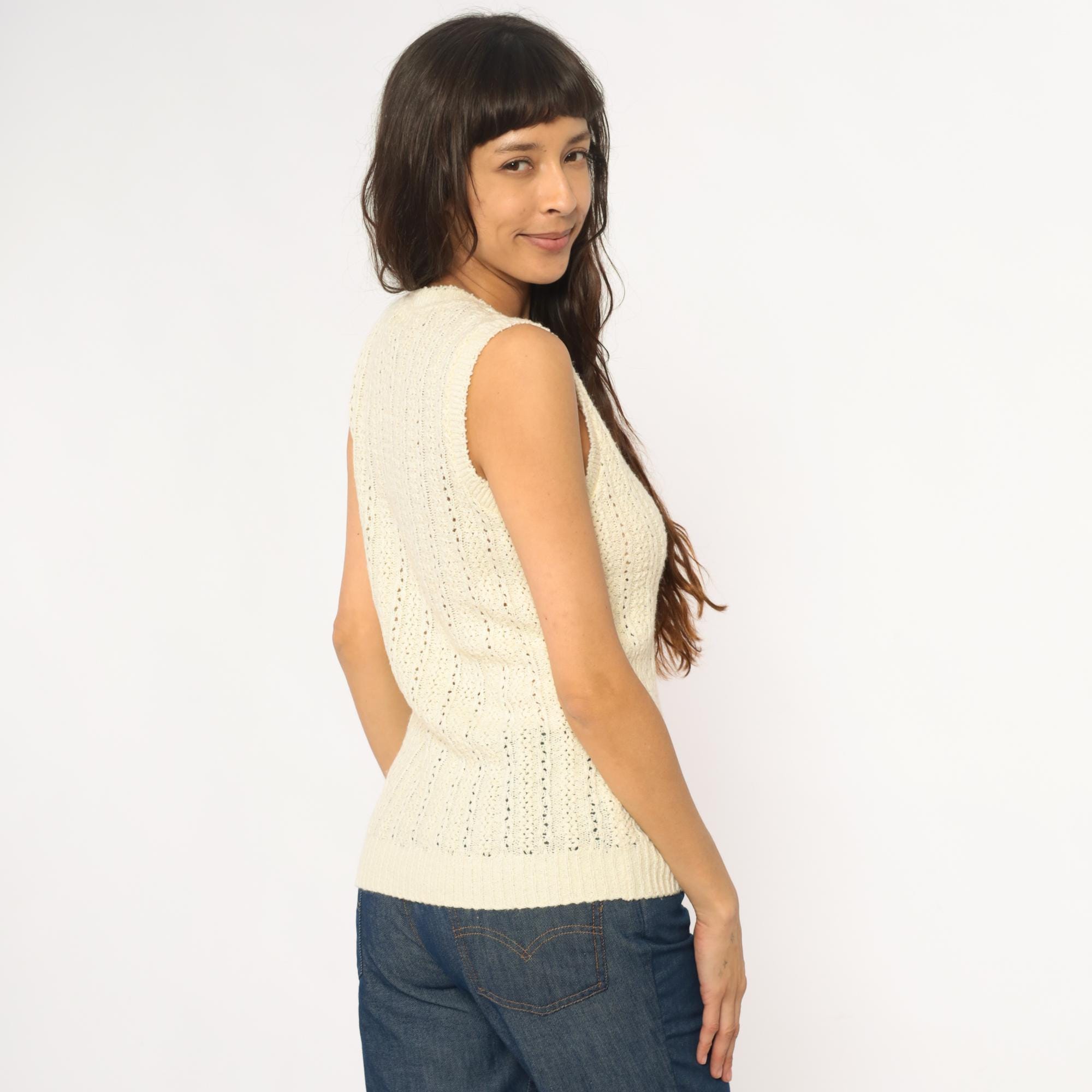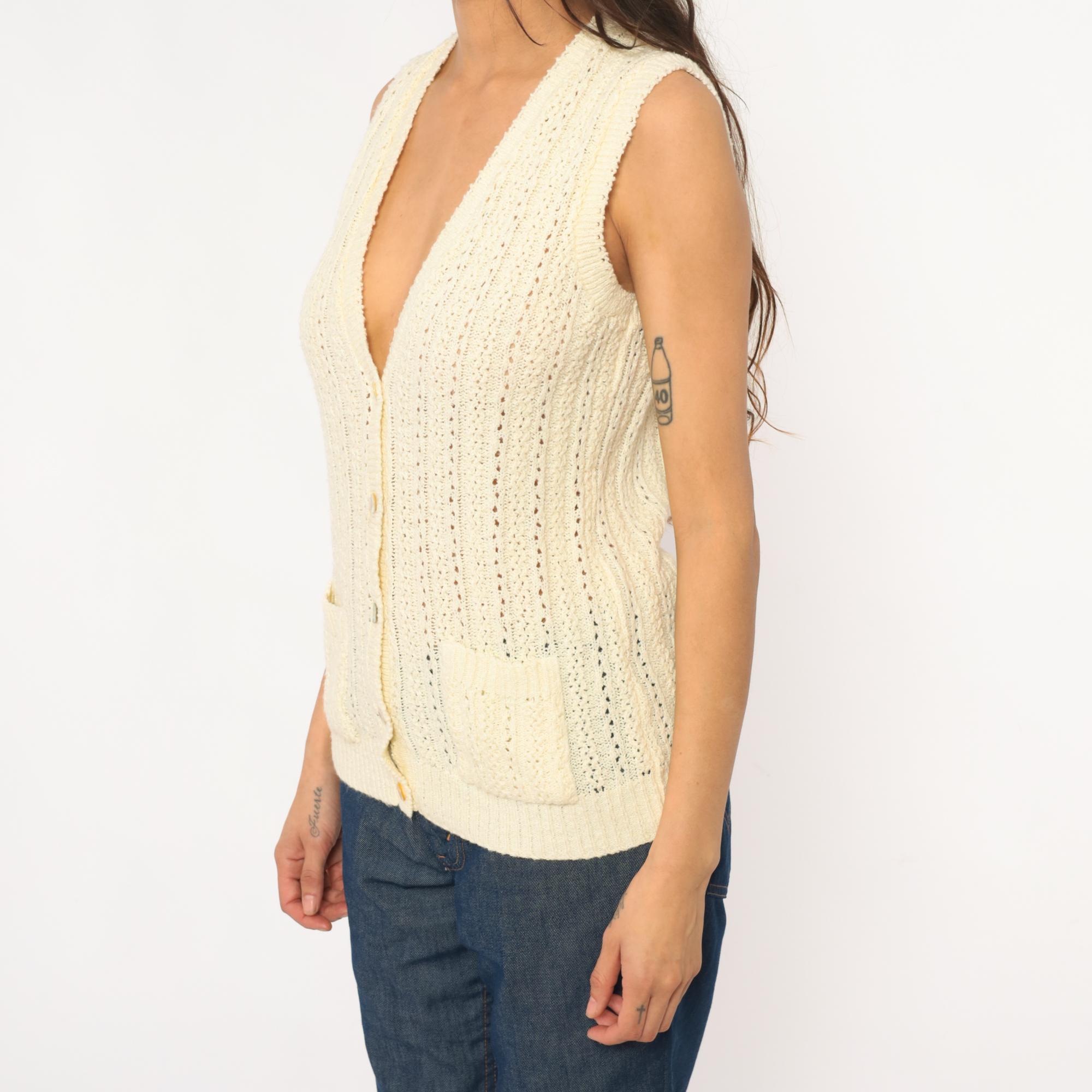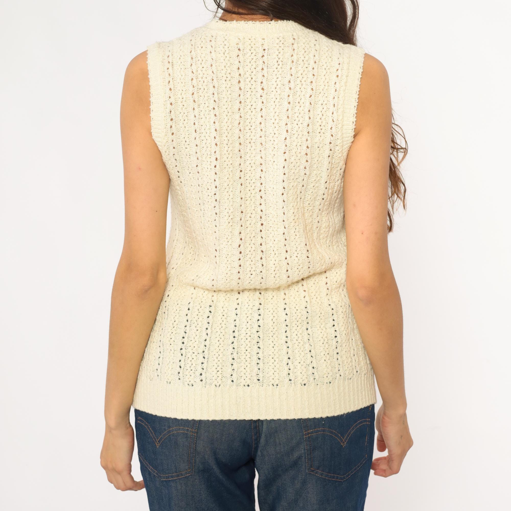 70s cream sleeveless knit vest with button front closure and open crochet pattern throughout. V-neckline with ribbed trim at neck, armholes, and hem. Four button closure down the front.