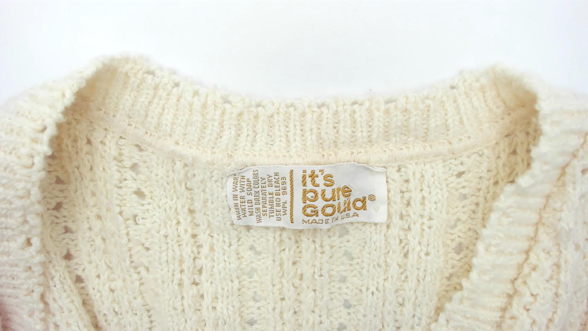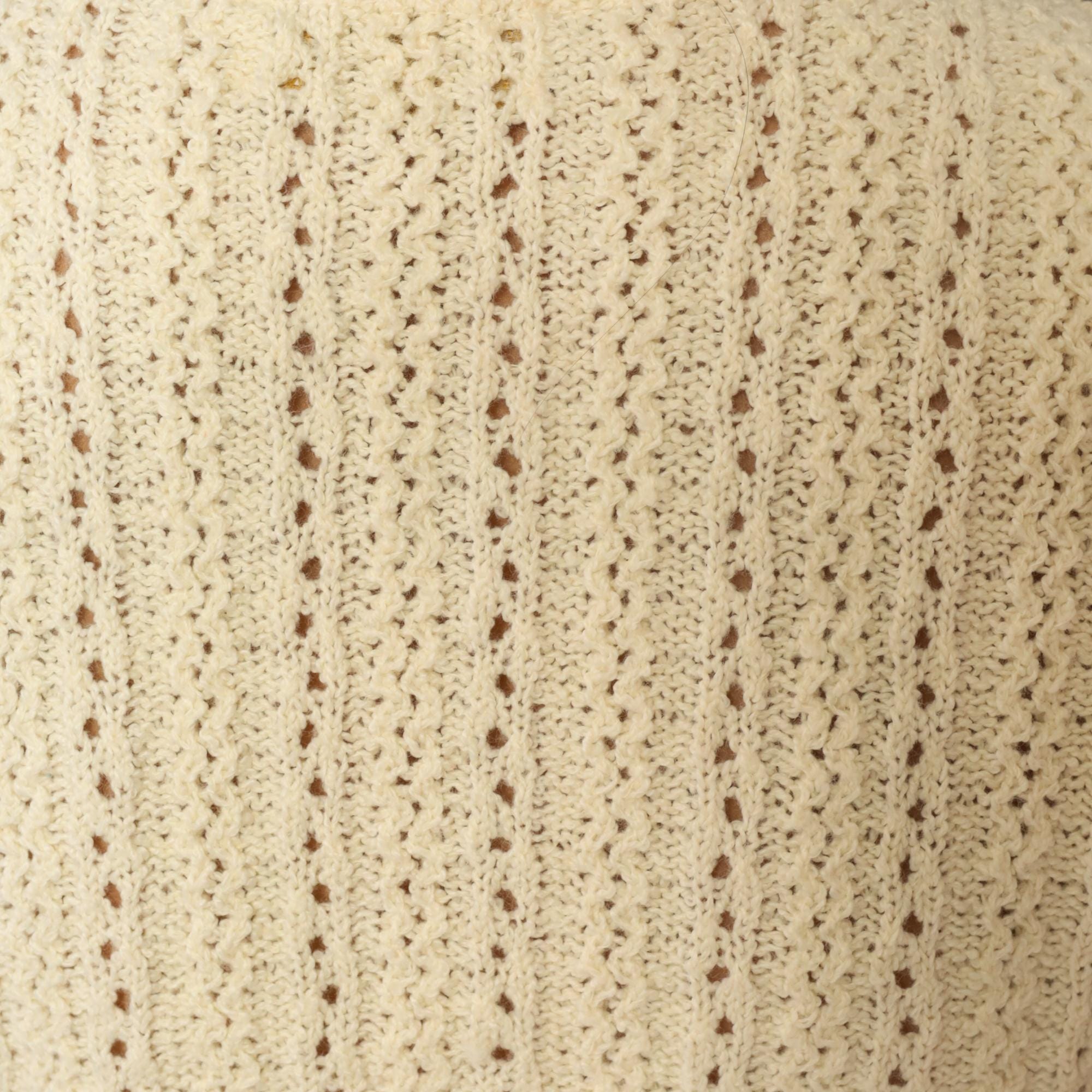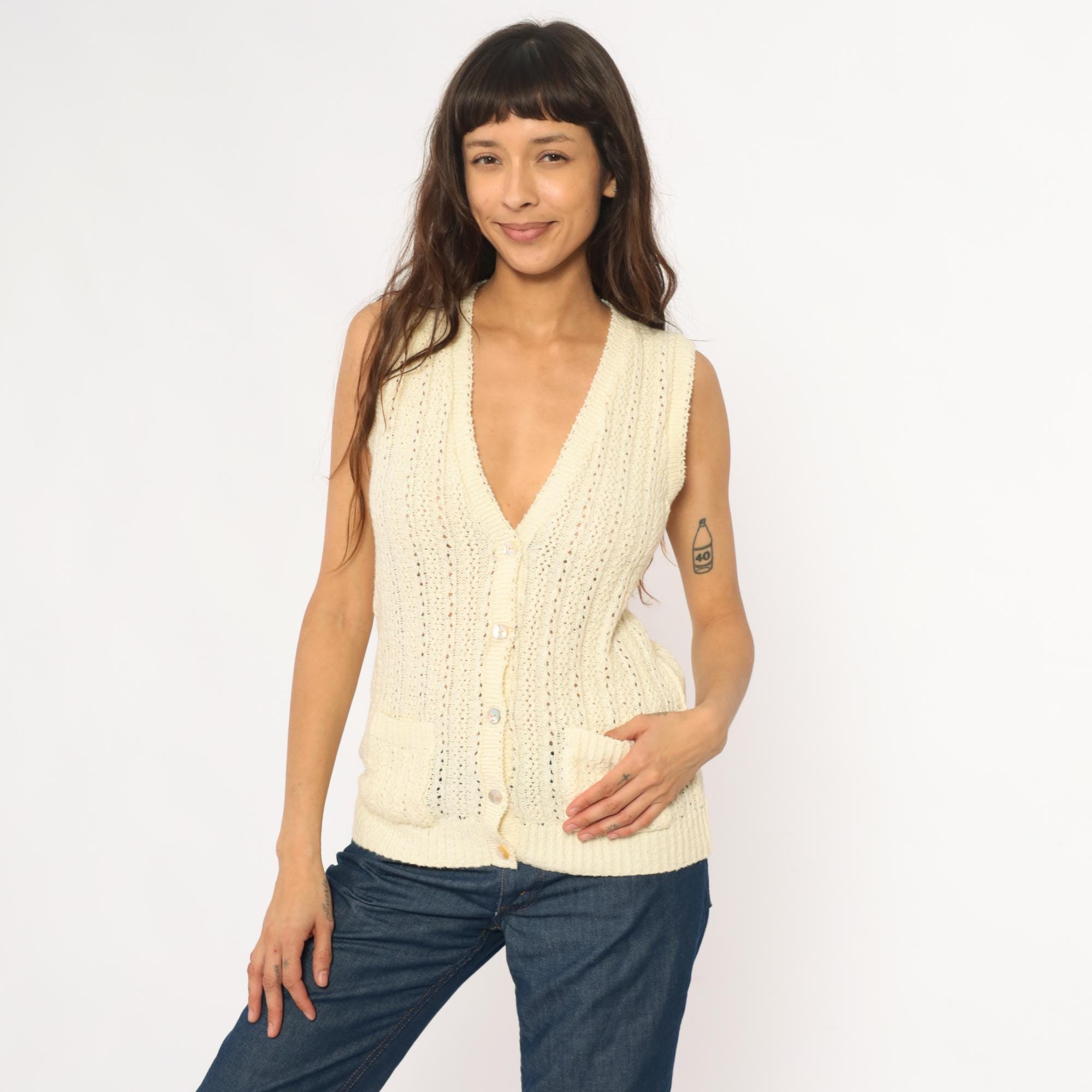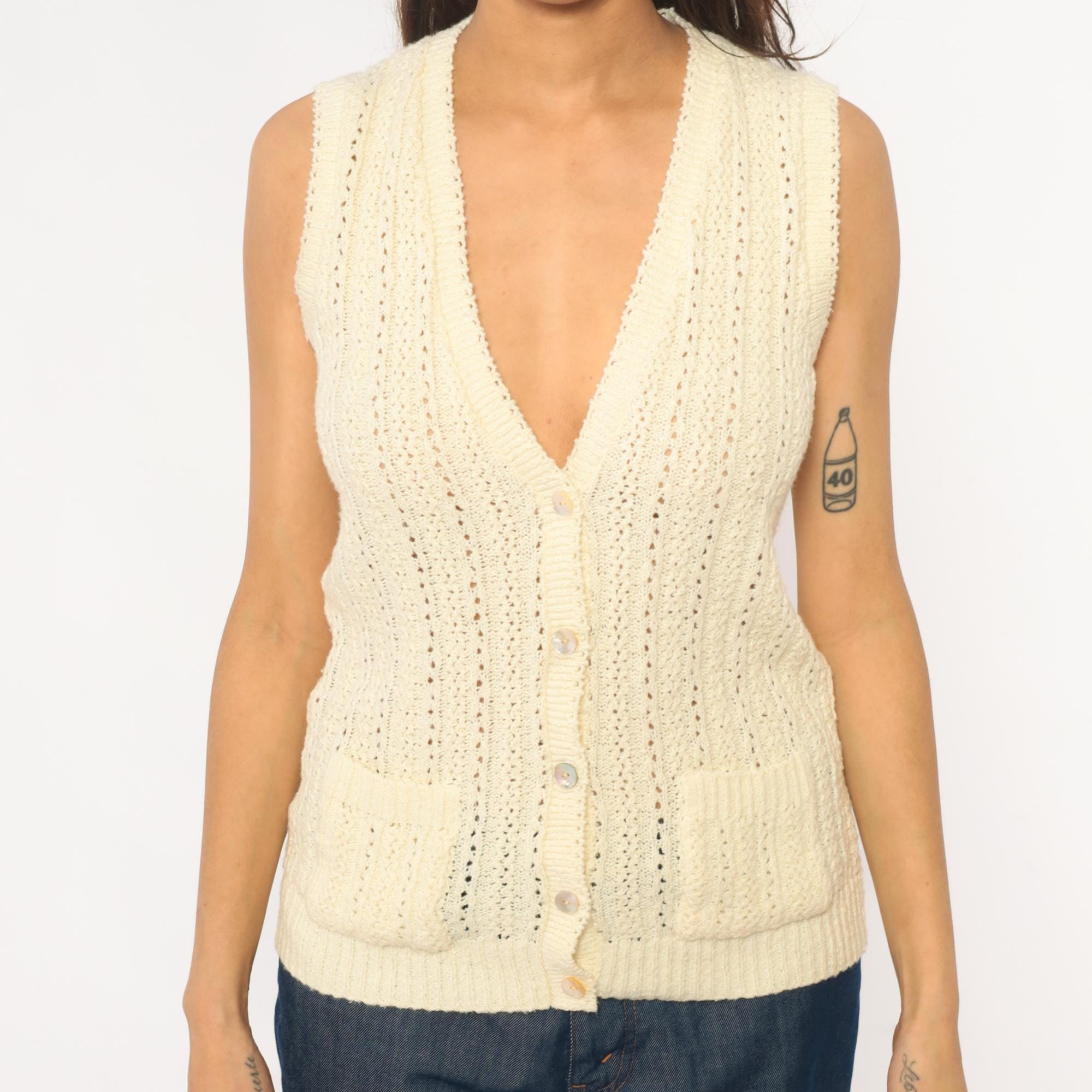70s cream sleeveless knit vest with button front closure and open crochet pattern throughout. V-neckline with ribbed trim at neck, armholes, and hem. Four button closure down the front.