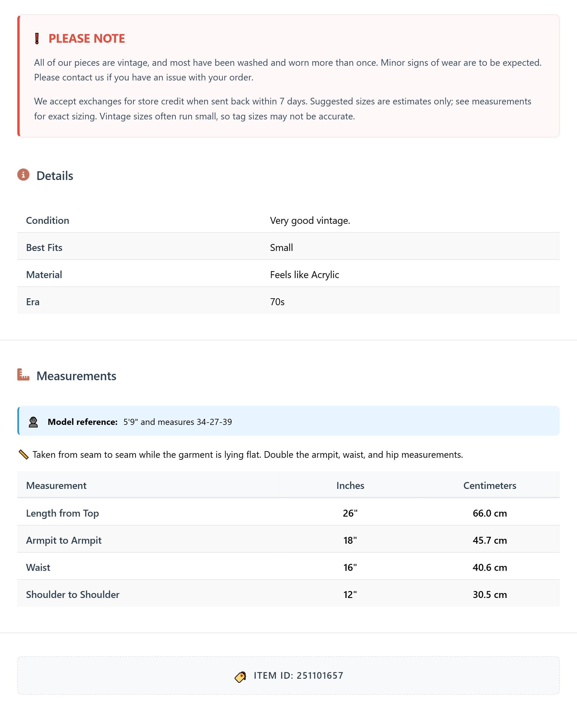 Measurements are taken laying flat and should be doubled where applicable. The "best fits" size is just an estimate, and vintage sizing can vary from modern sizing. Please use measurements to ensure proper fit. The best thing to do is measure a similar item of your own, and compare. When an item has stretch, we will list the unstretched dimensions with the stretched measurement afterwards.