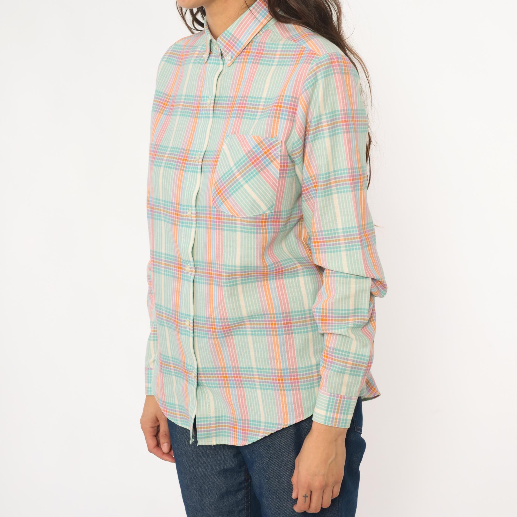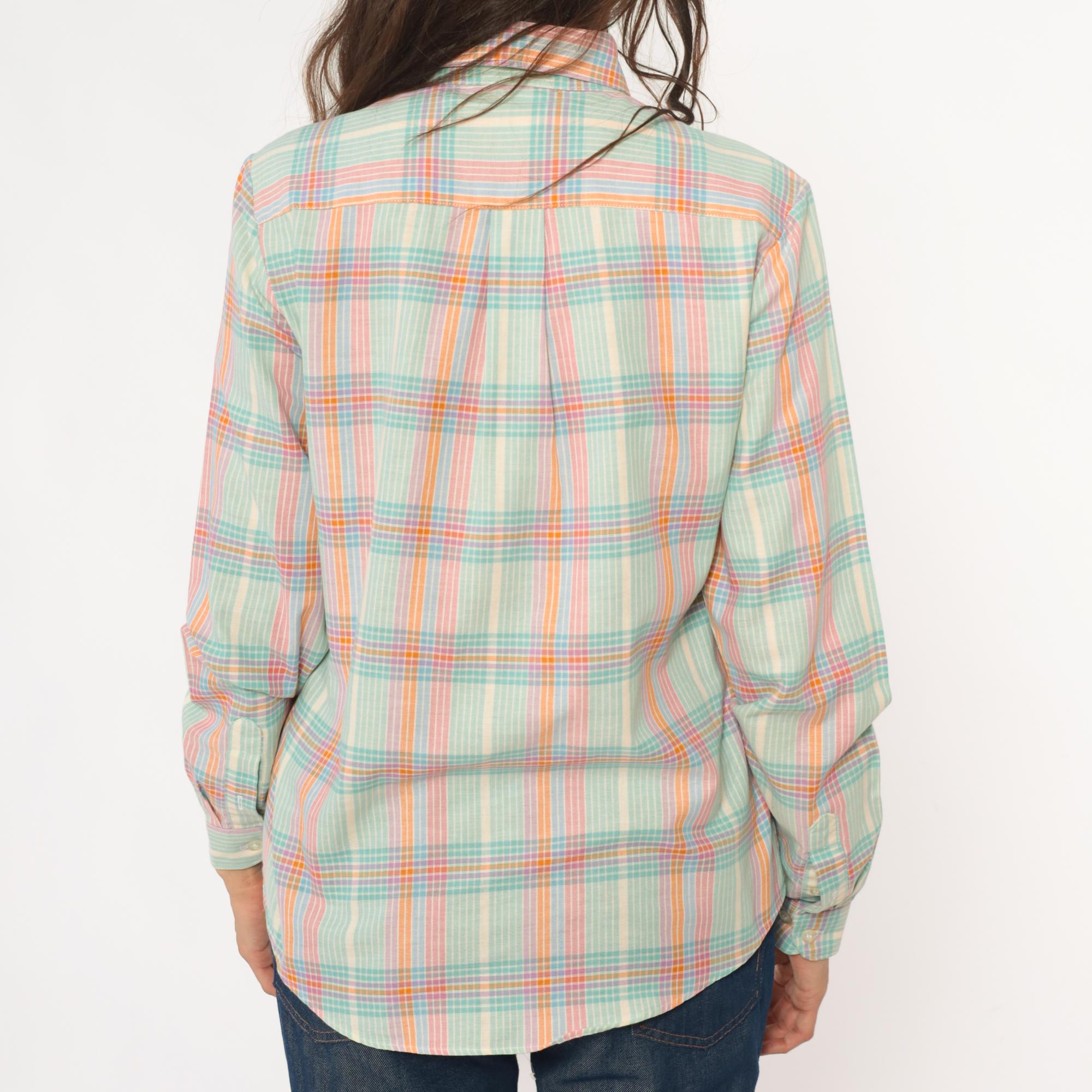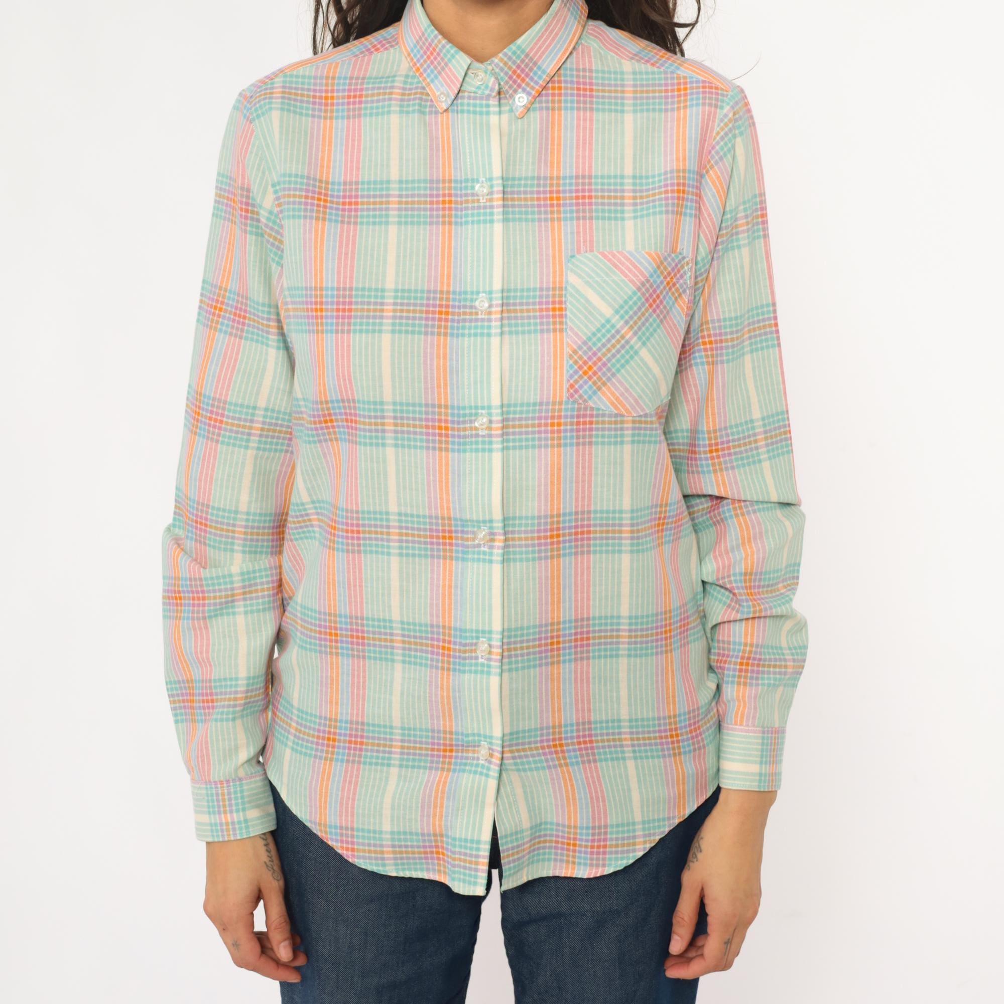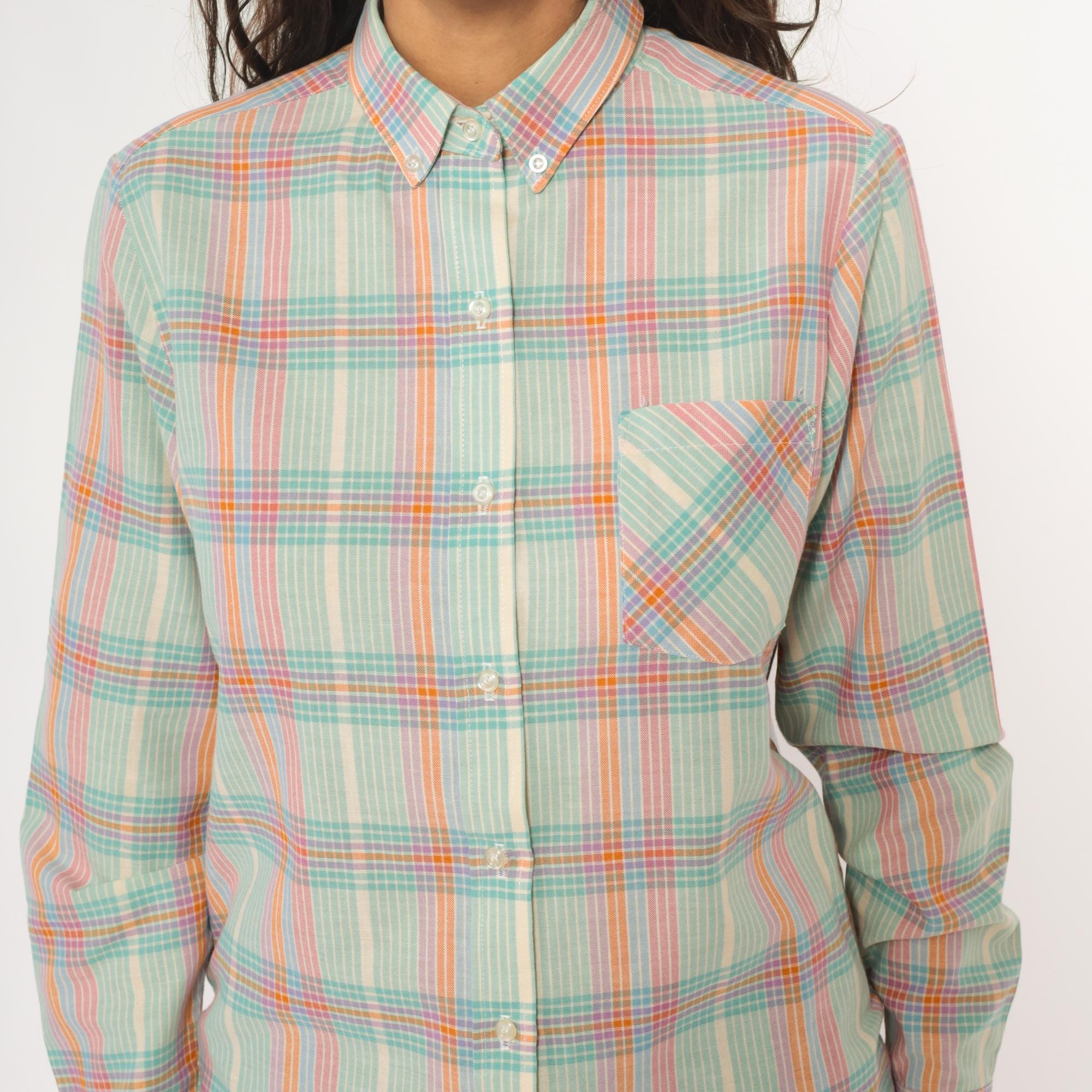 90s pastel plaid button-down shirt in mint green, coral pink, orange, blue, and yellow. Collared with button-down collar points, long sleeves, single chest pocket cut on the bias.